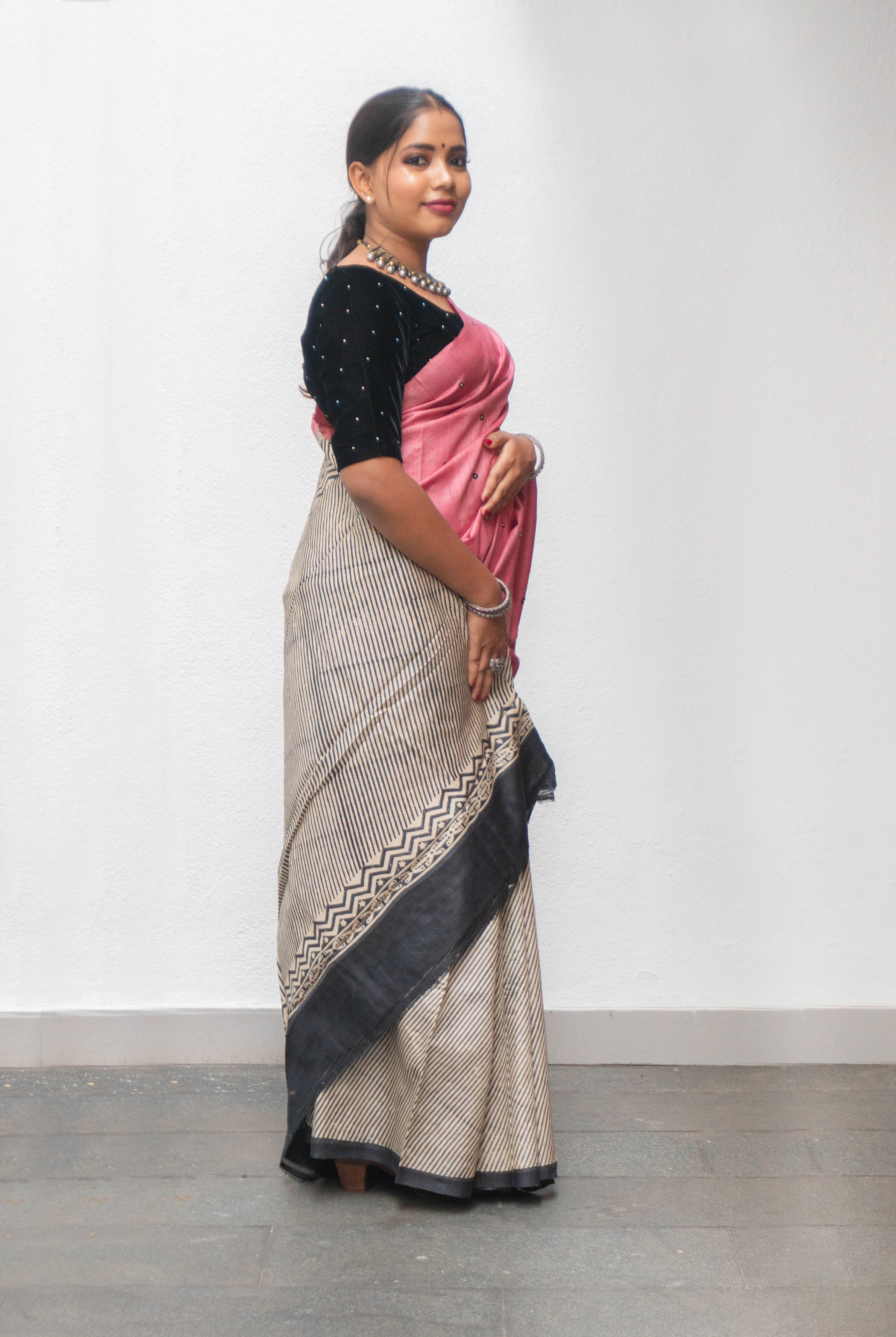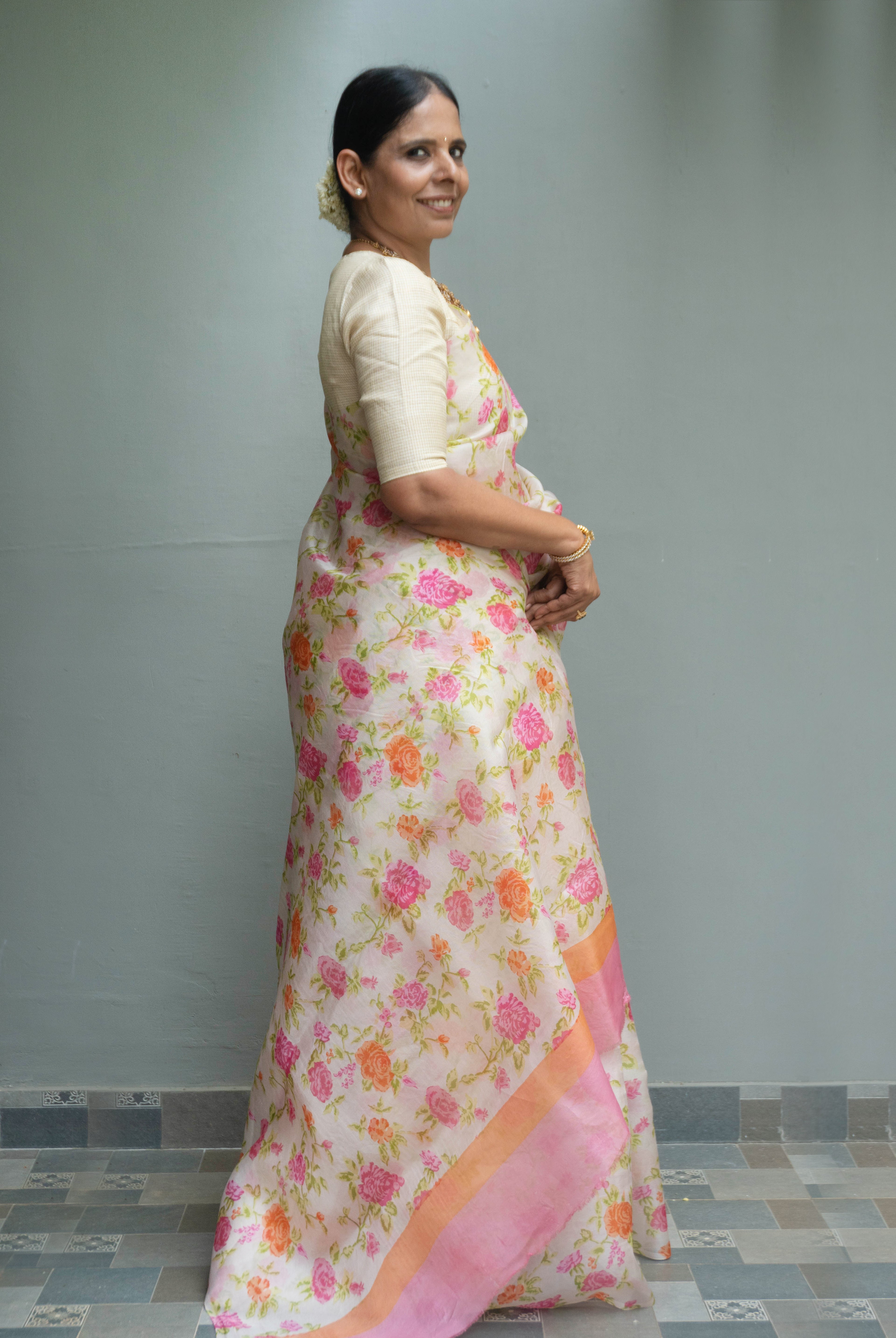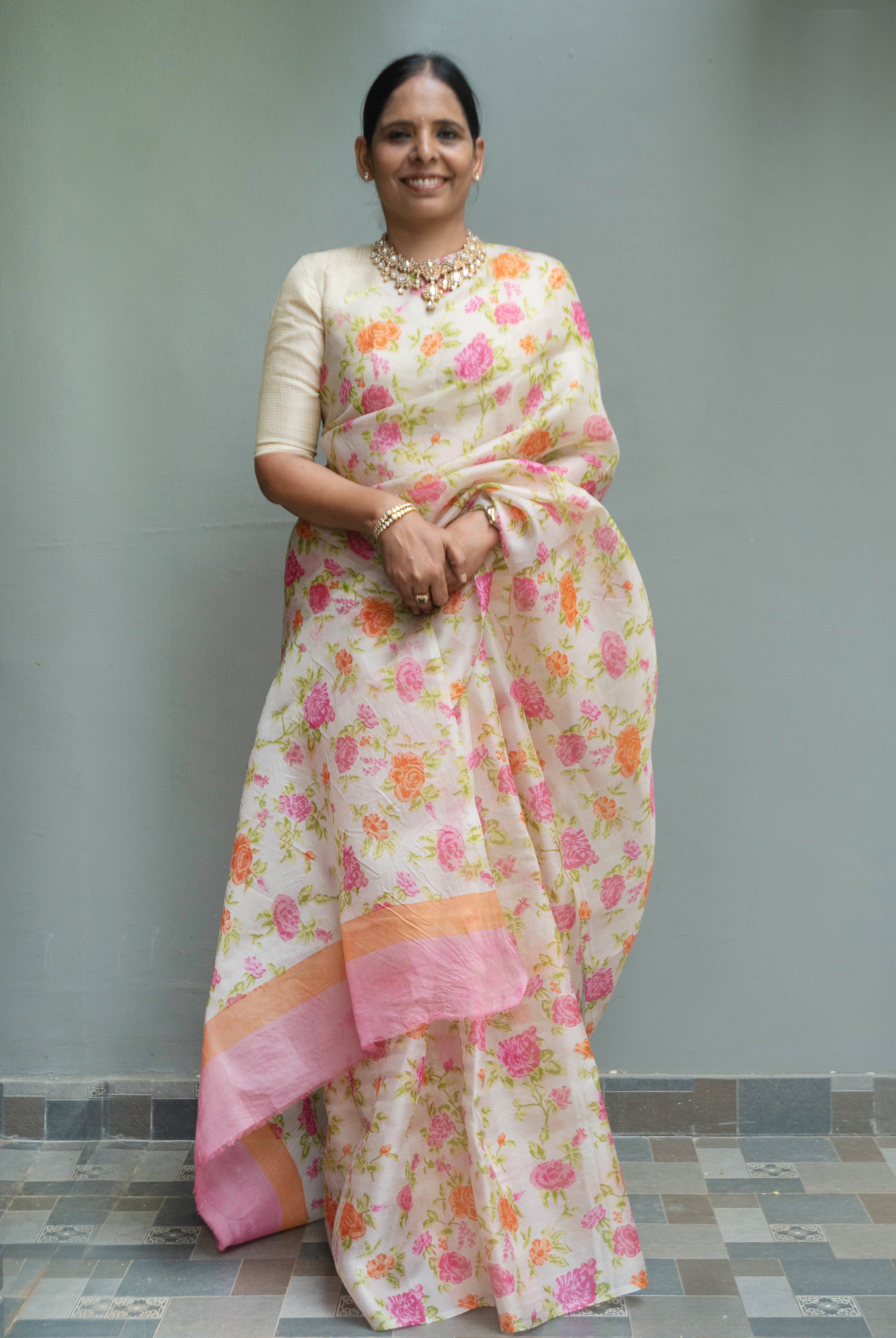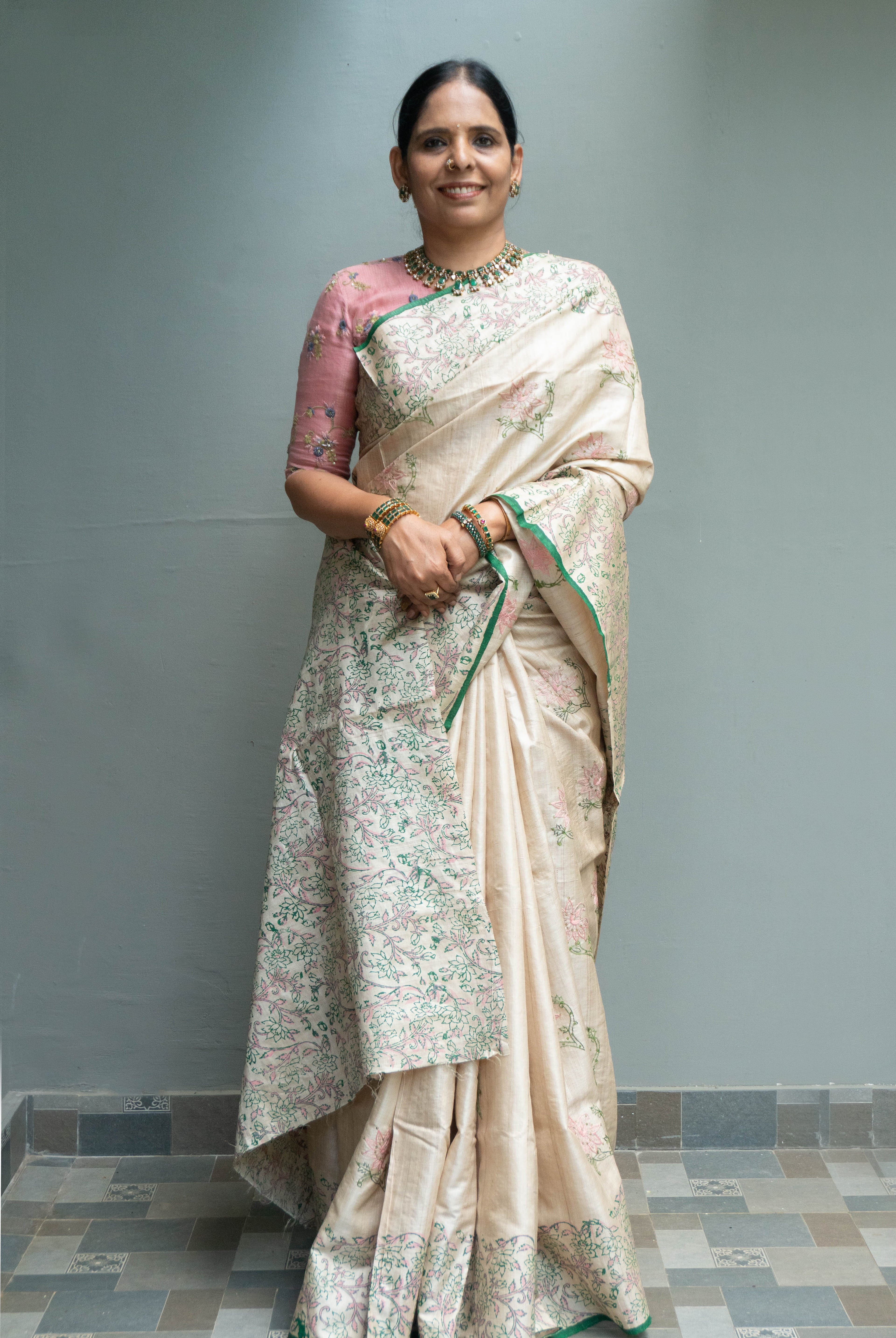 Cream Tussar silk saree, beautifully adorned with delicate floral motifs across the body. The striking Rani pink tissue border adds a regal charm, enhancing the saree with a touch of shimmer and elegance.
