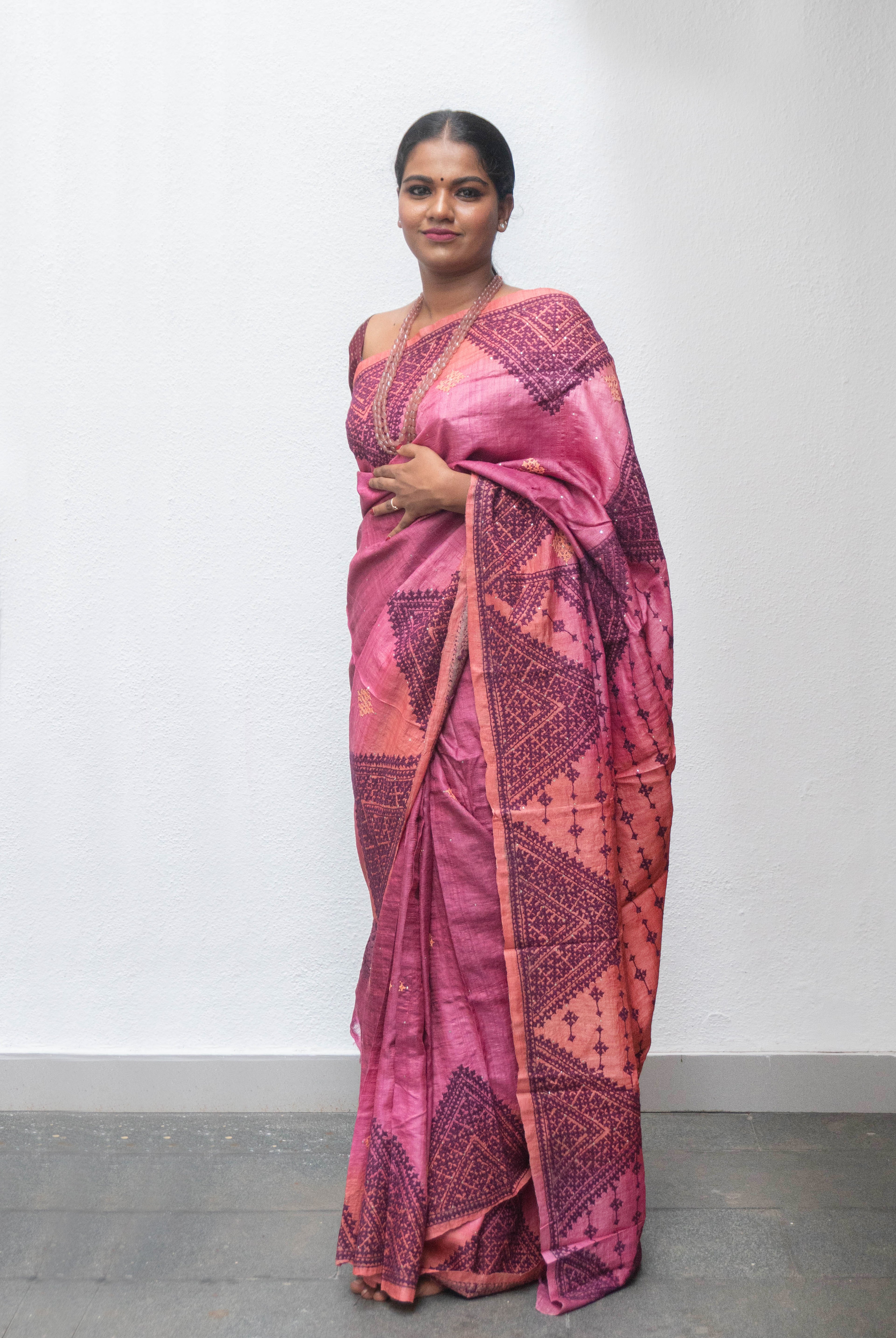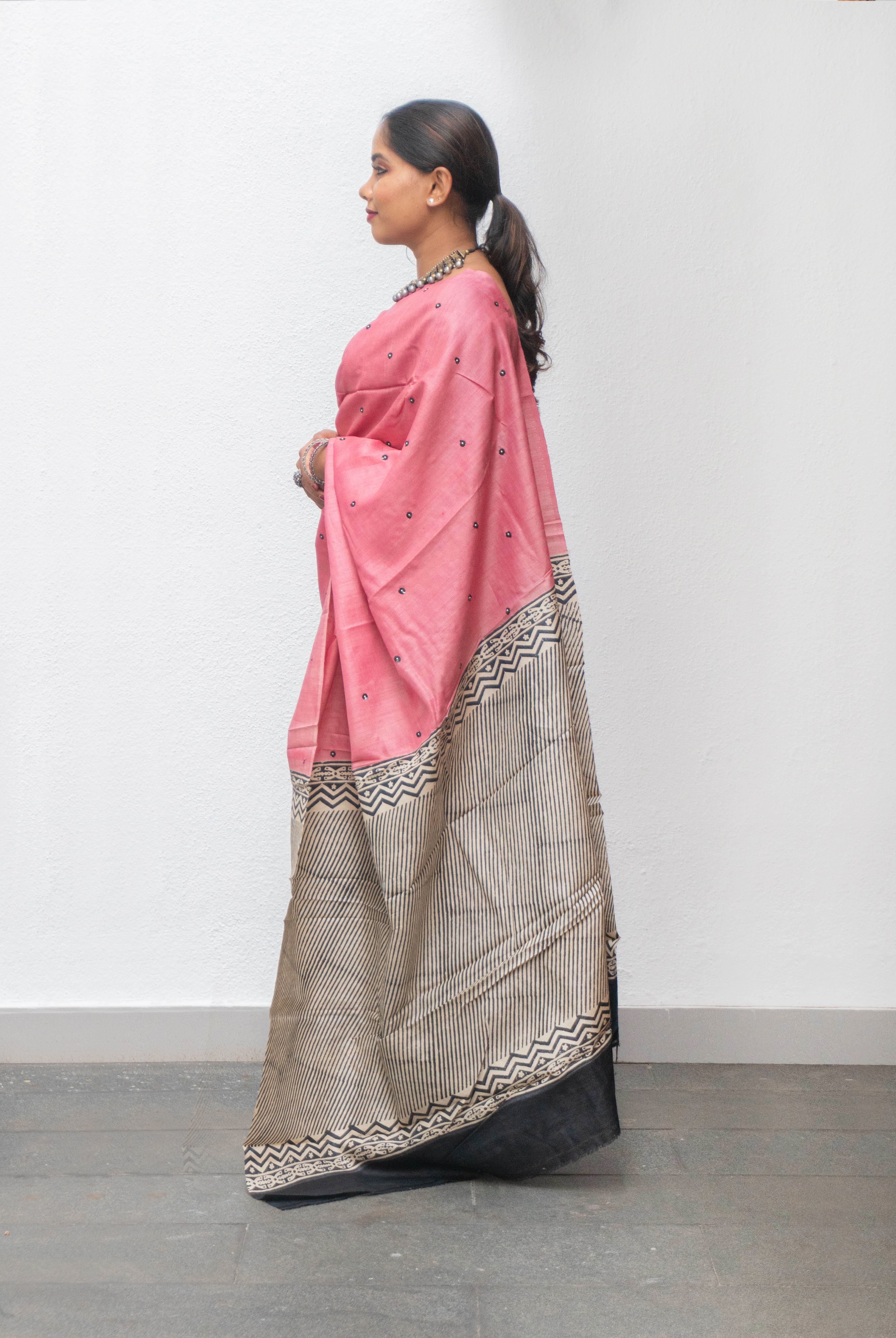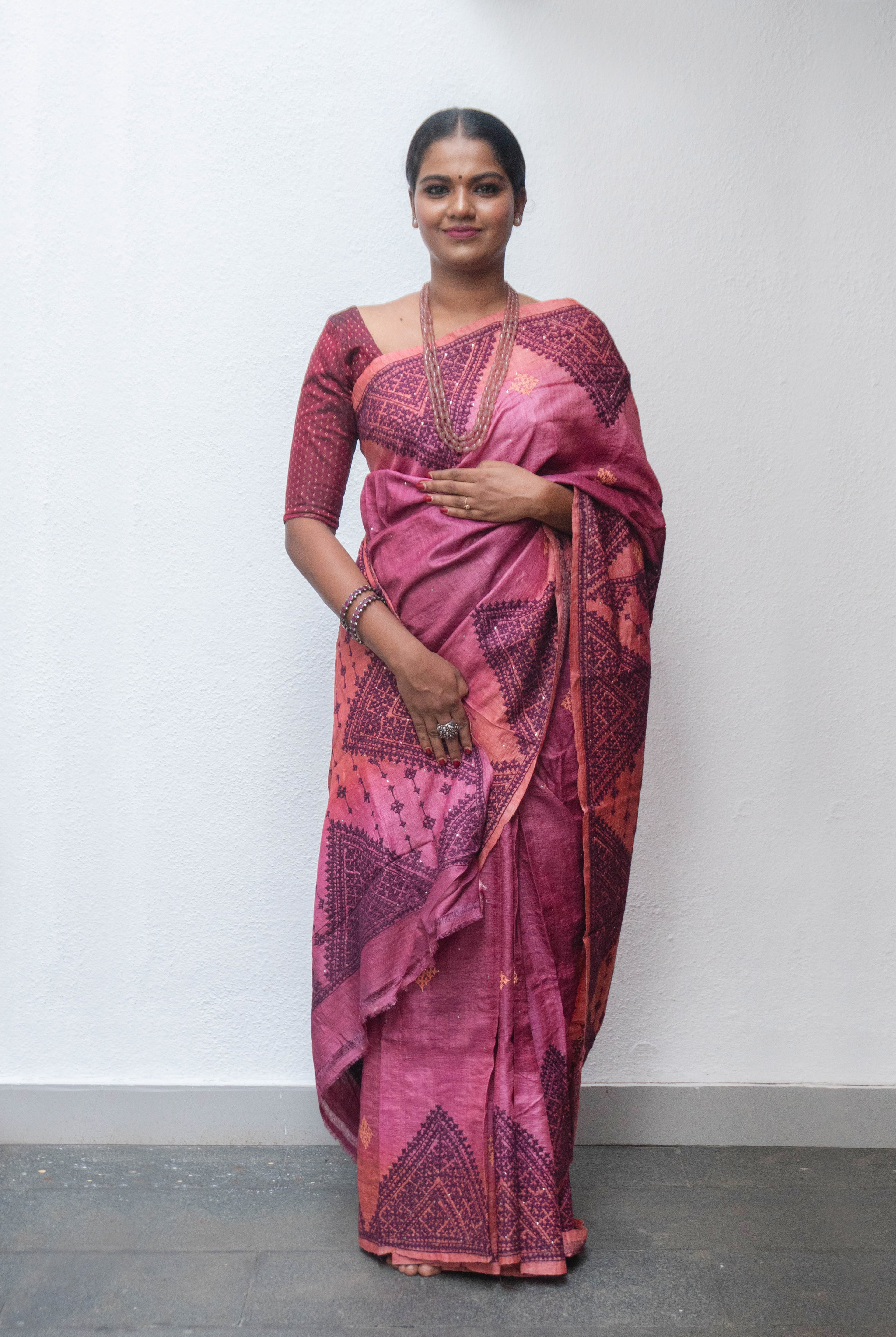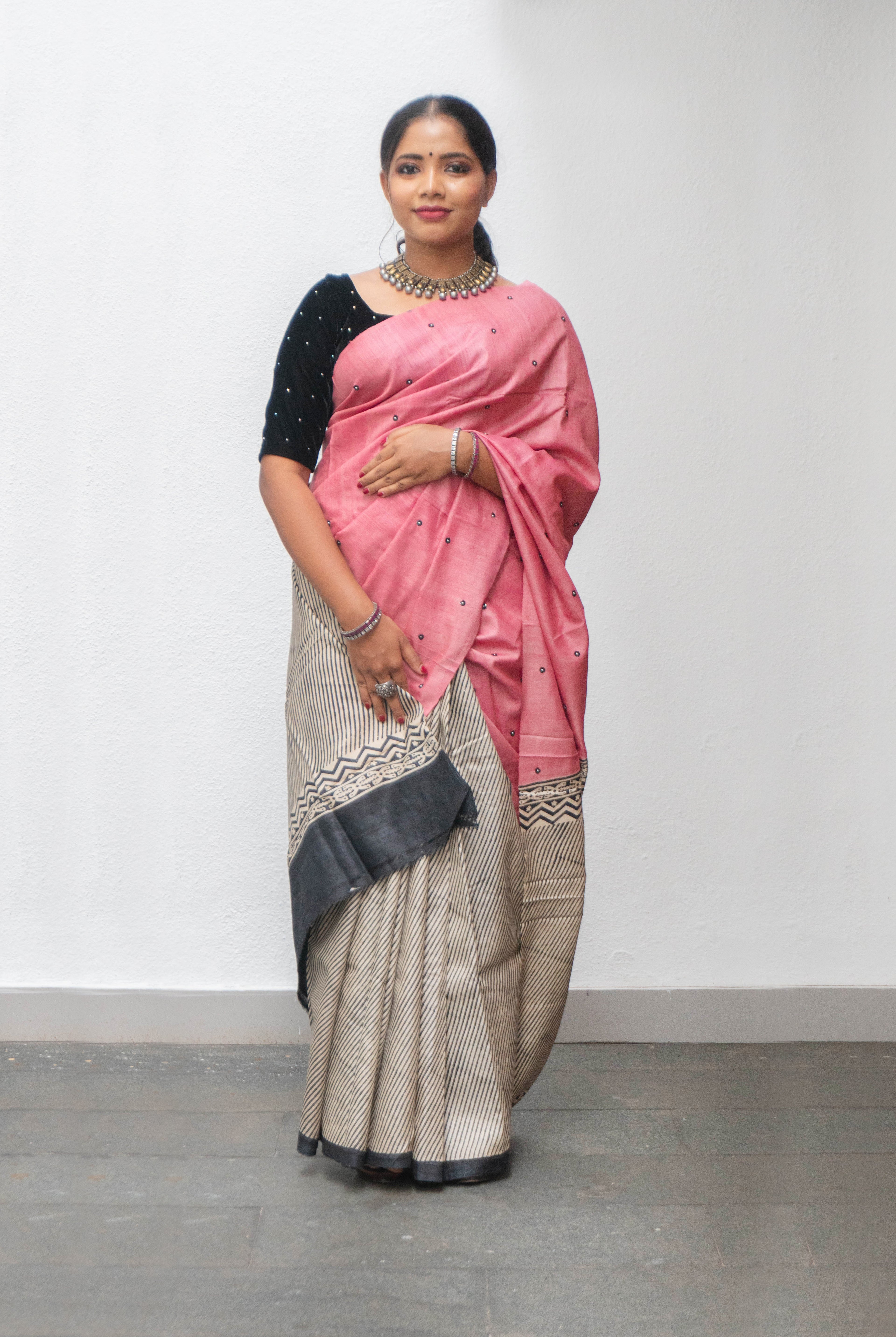 Cream Tussar silk saree, beautifully adorned with delicate floral motifs across the body. The striking Rani pink tissue border adds a regal charm, enhancing the saree with a touch of shimmer and elegance.