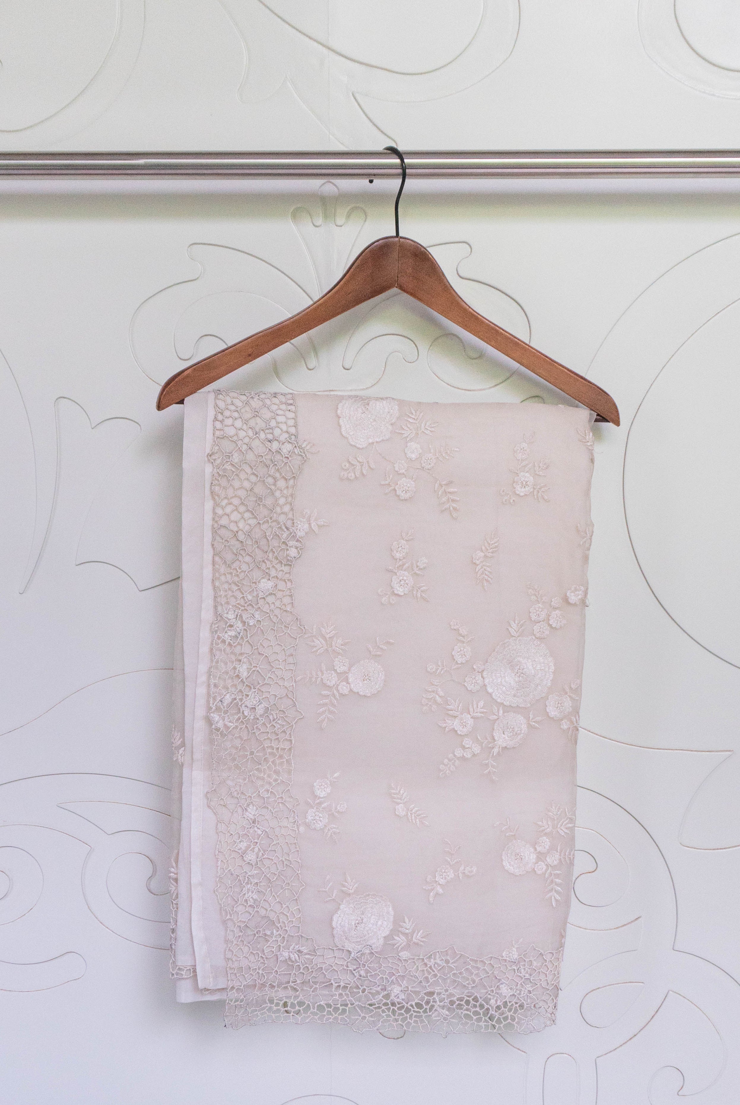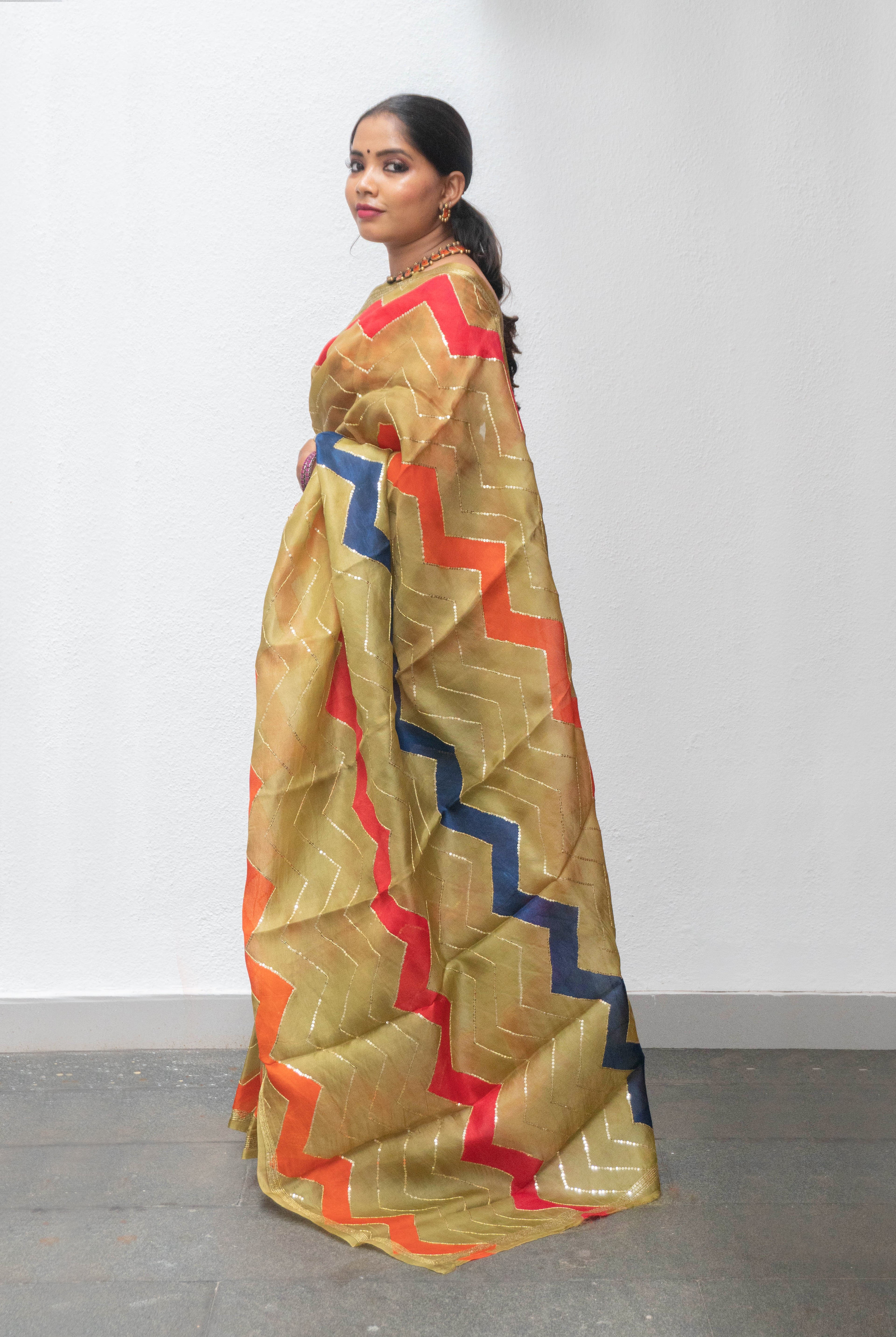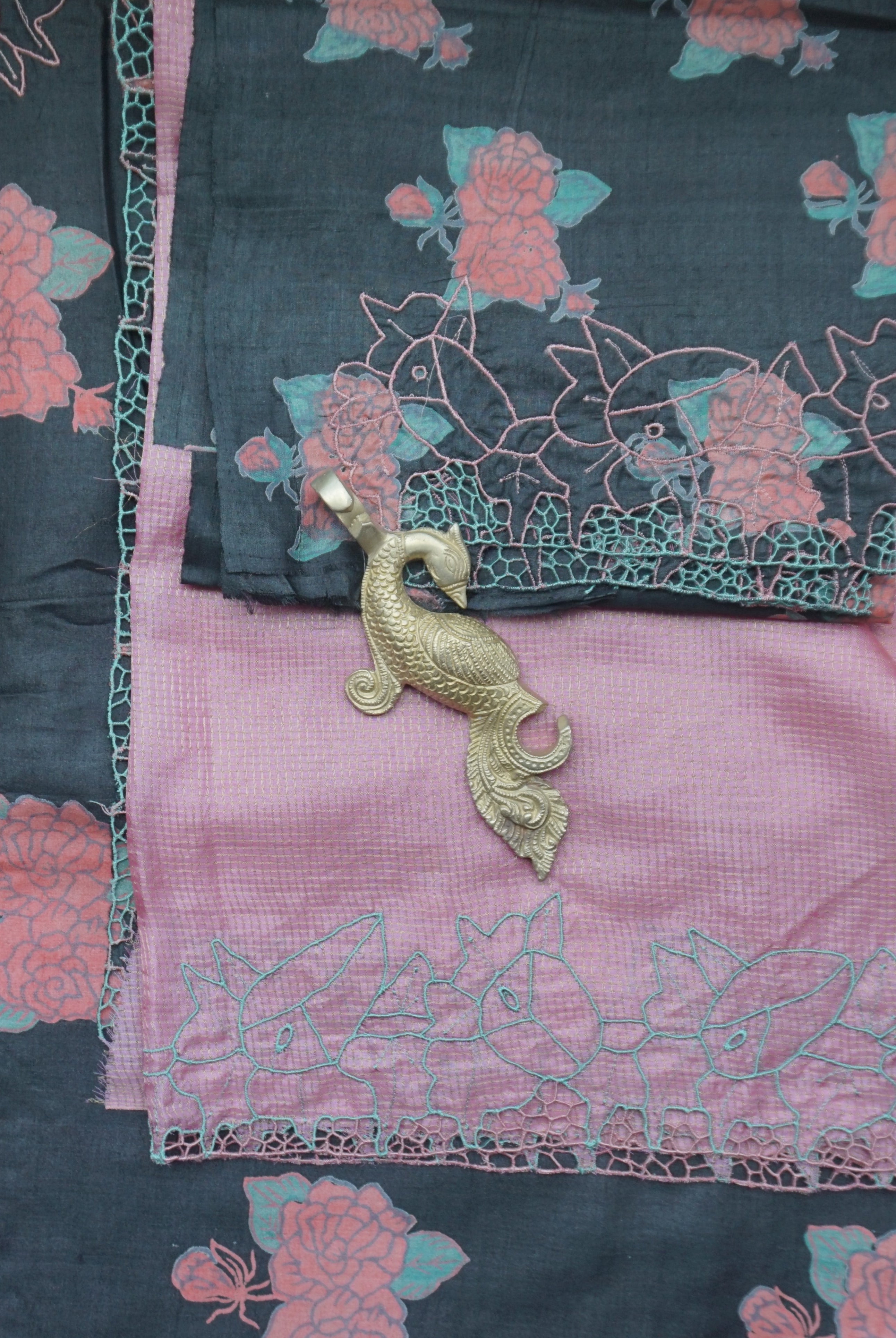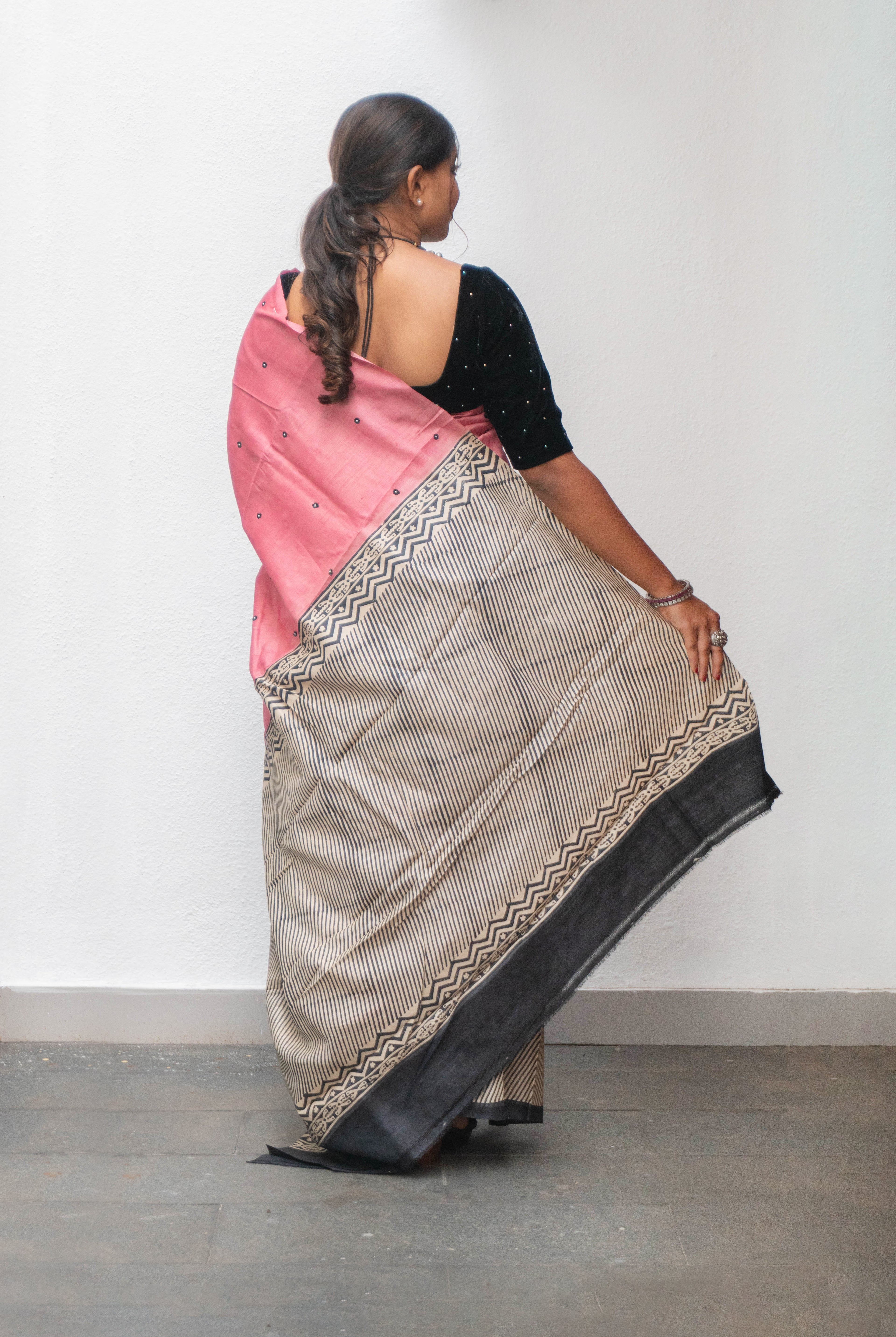 Cream Tussar silk saree, beautifully adorned with delicate floral motifs across the body. The striking Rani pink tissue border adds a regal charm, enhancing the saree with a touch of shimmer and elegance.