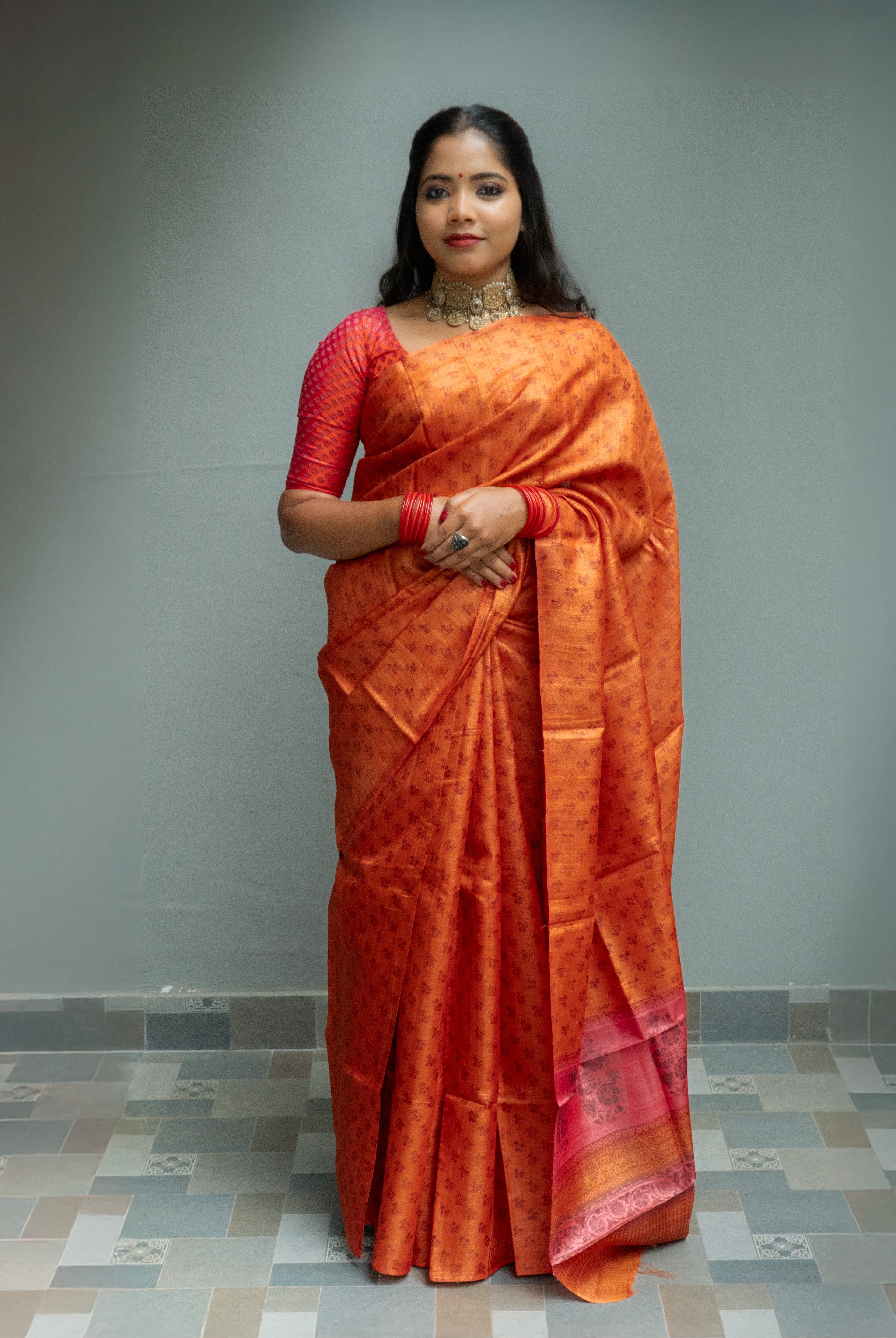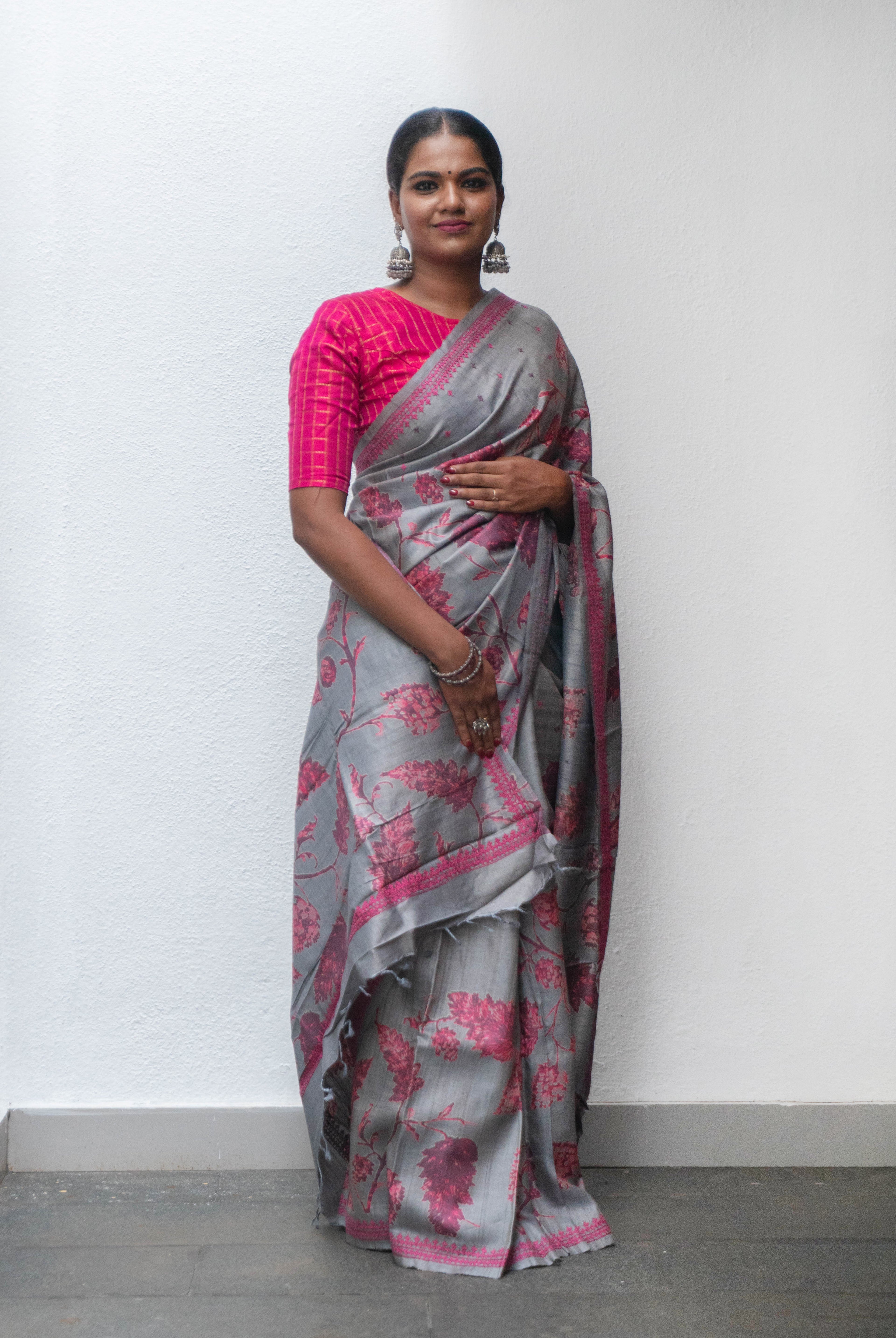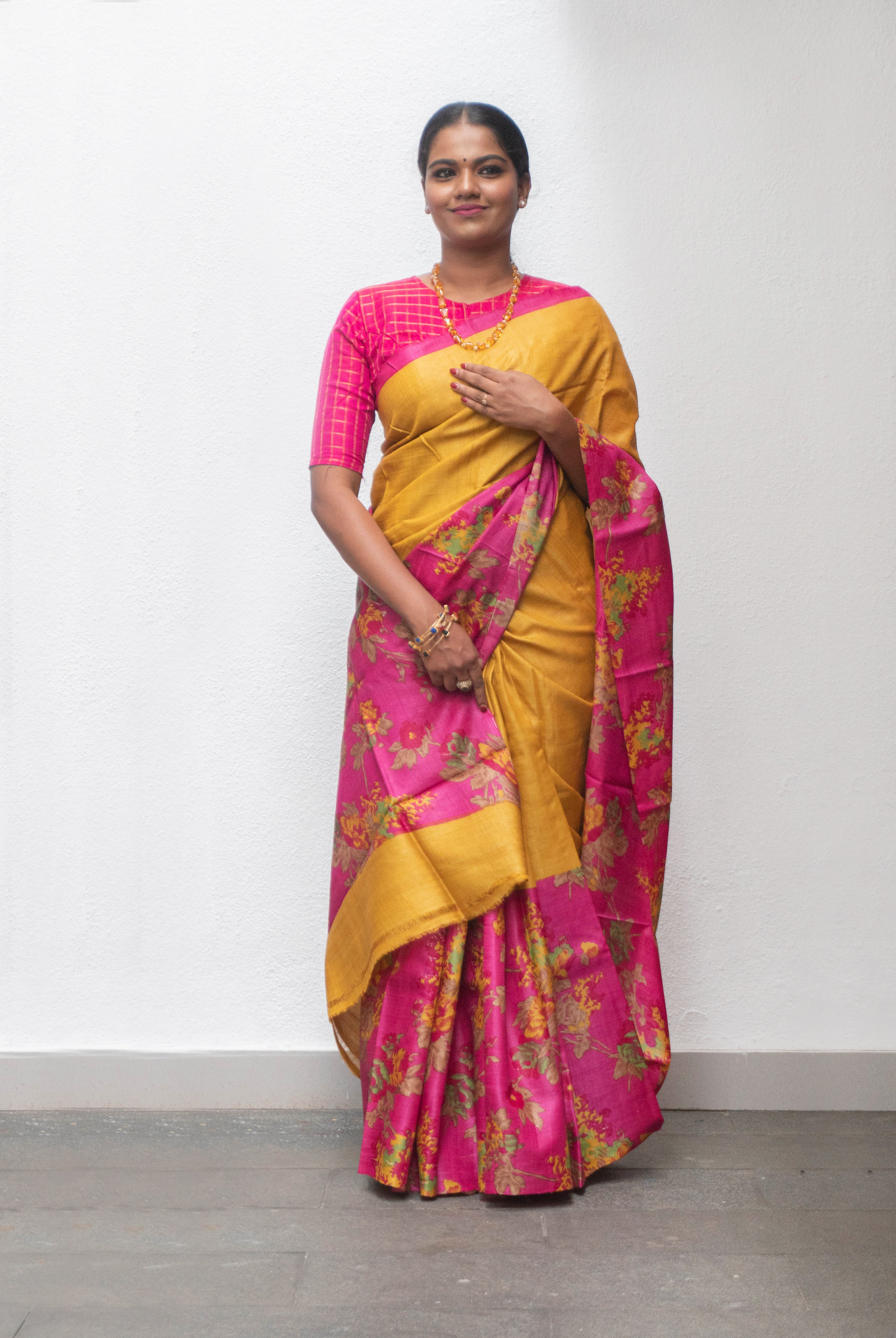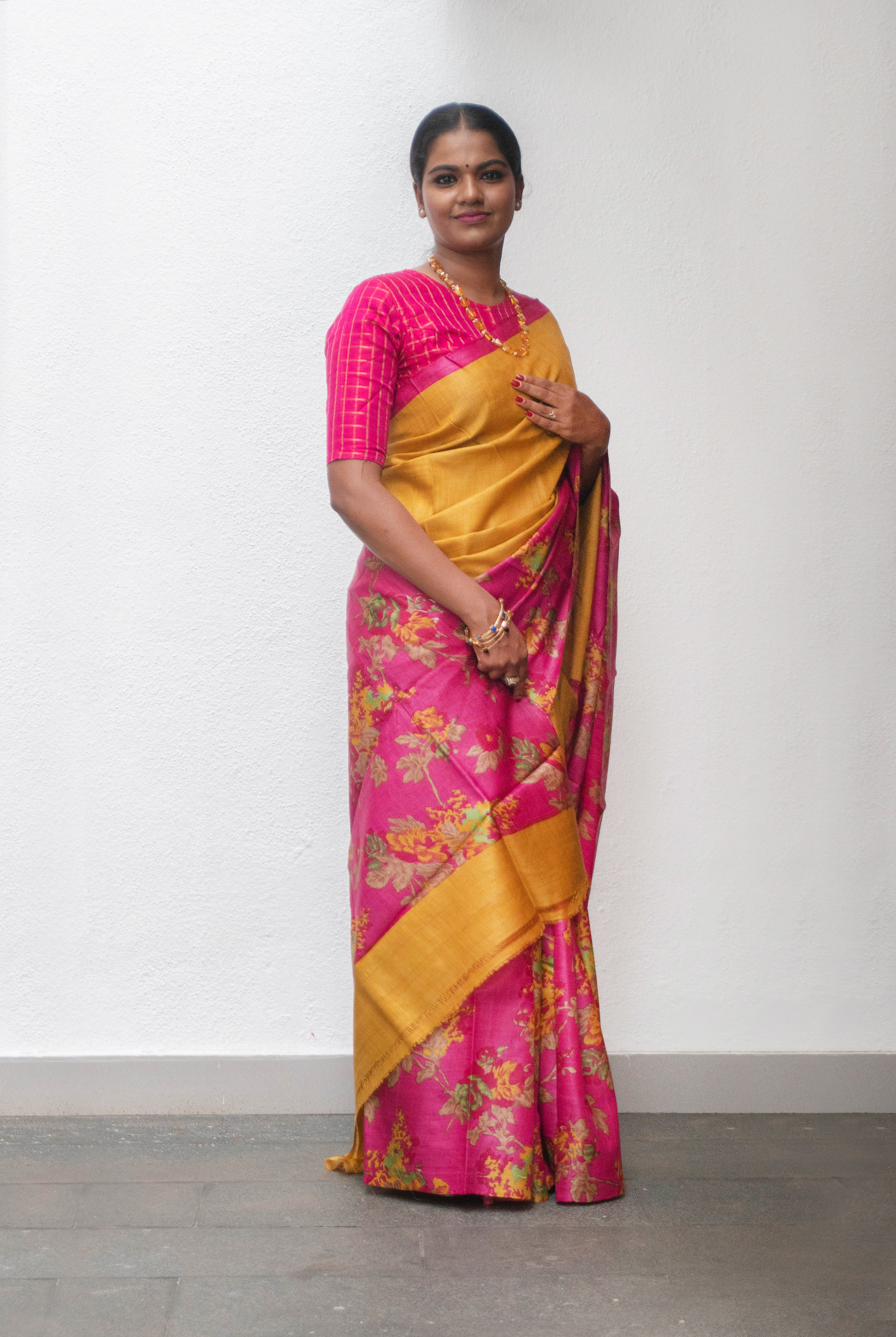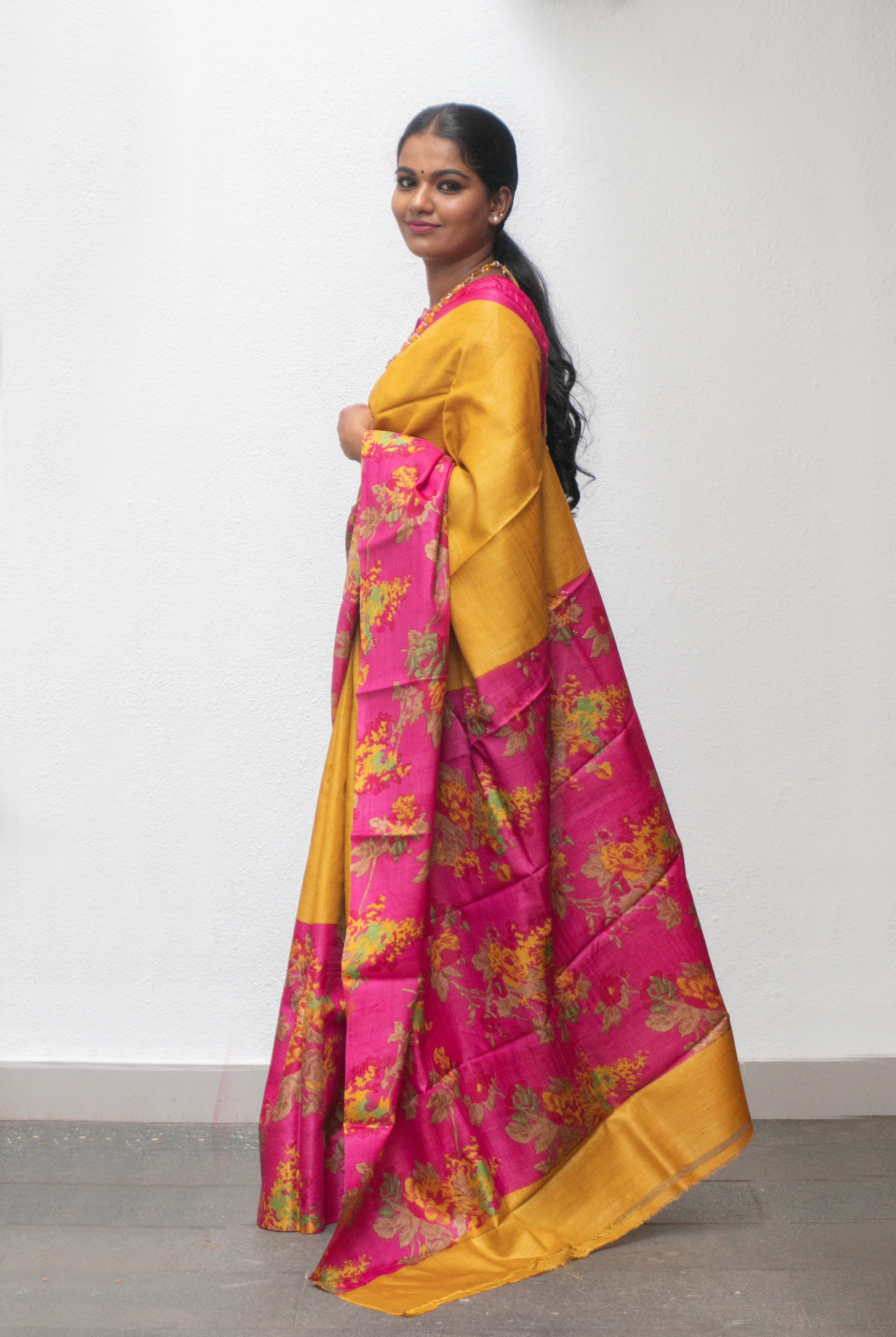 Perfect for festive occasions, weddings, and cultural celebrations, this floral tussar silk saree pairs effortlessly with traditional or contemporary blouses.