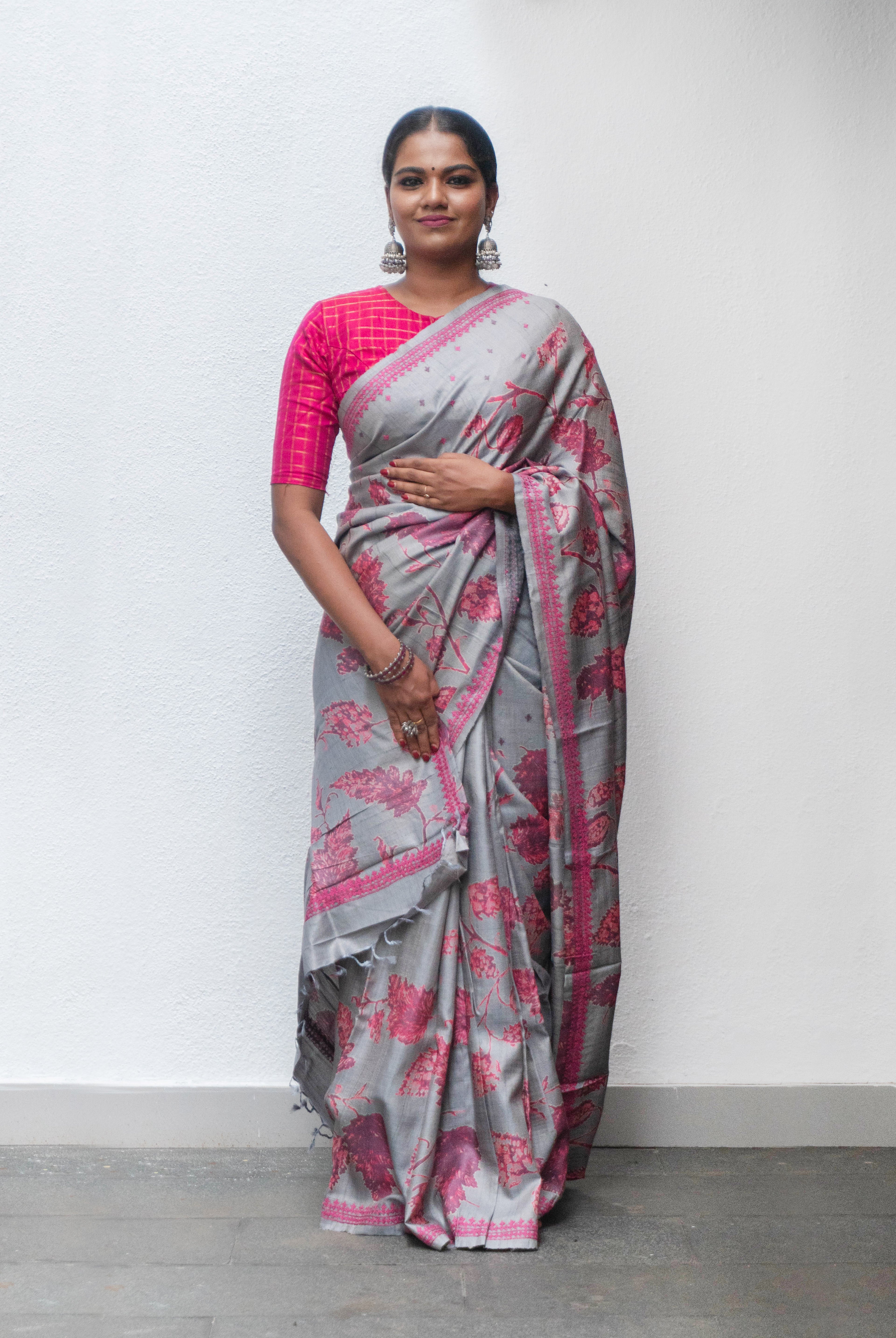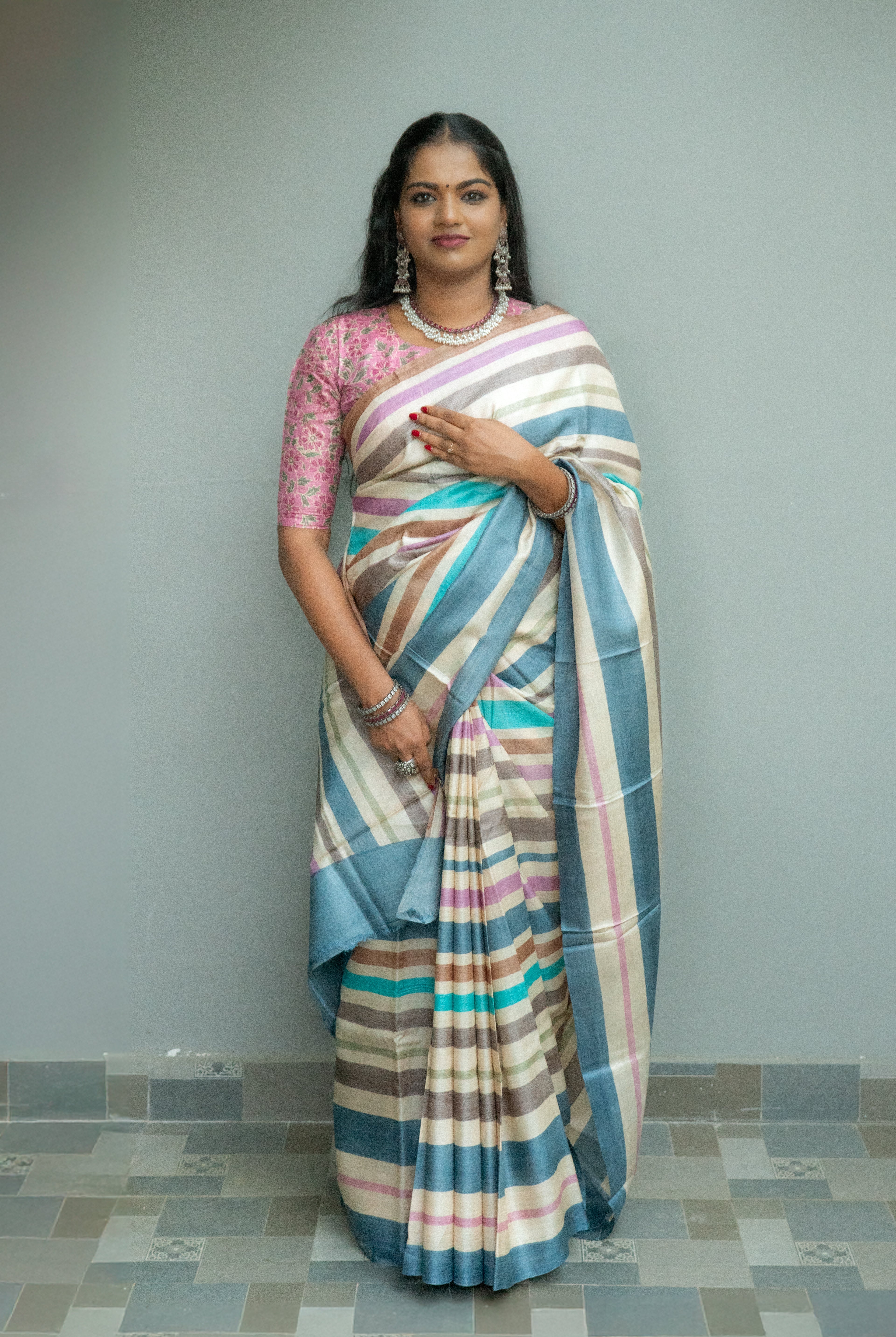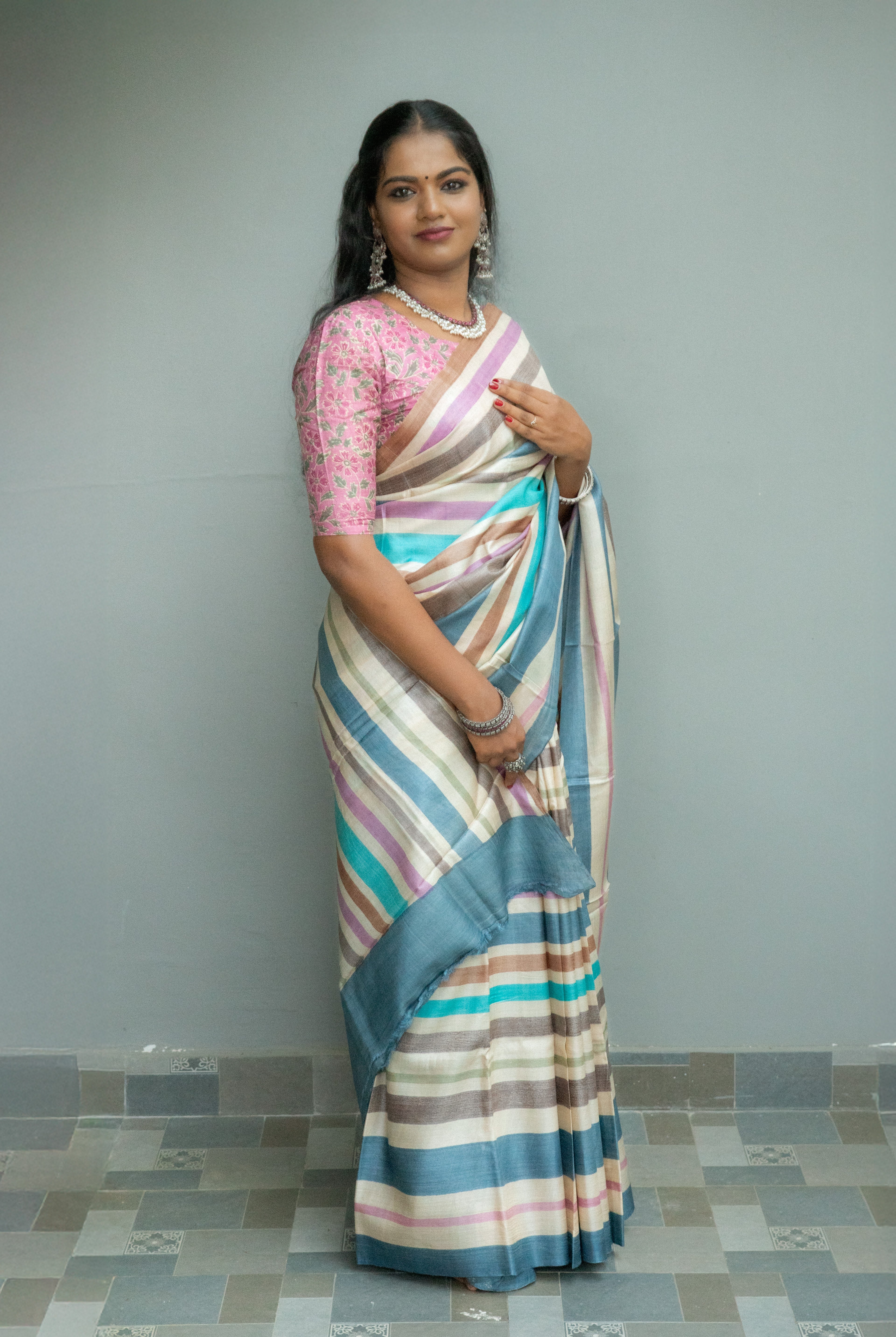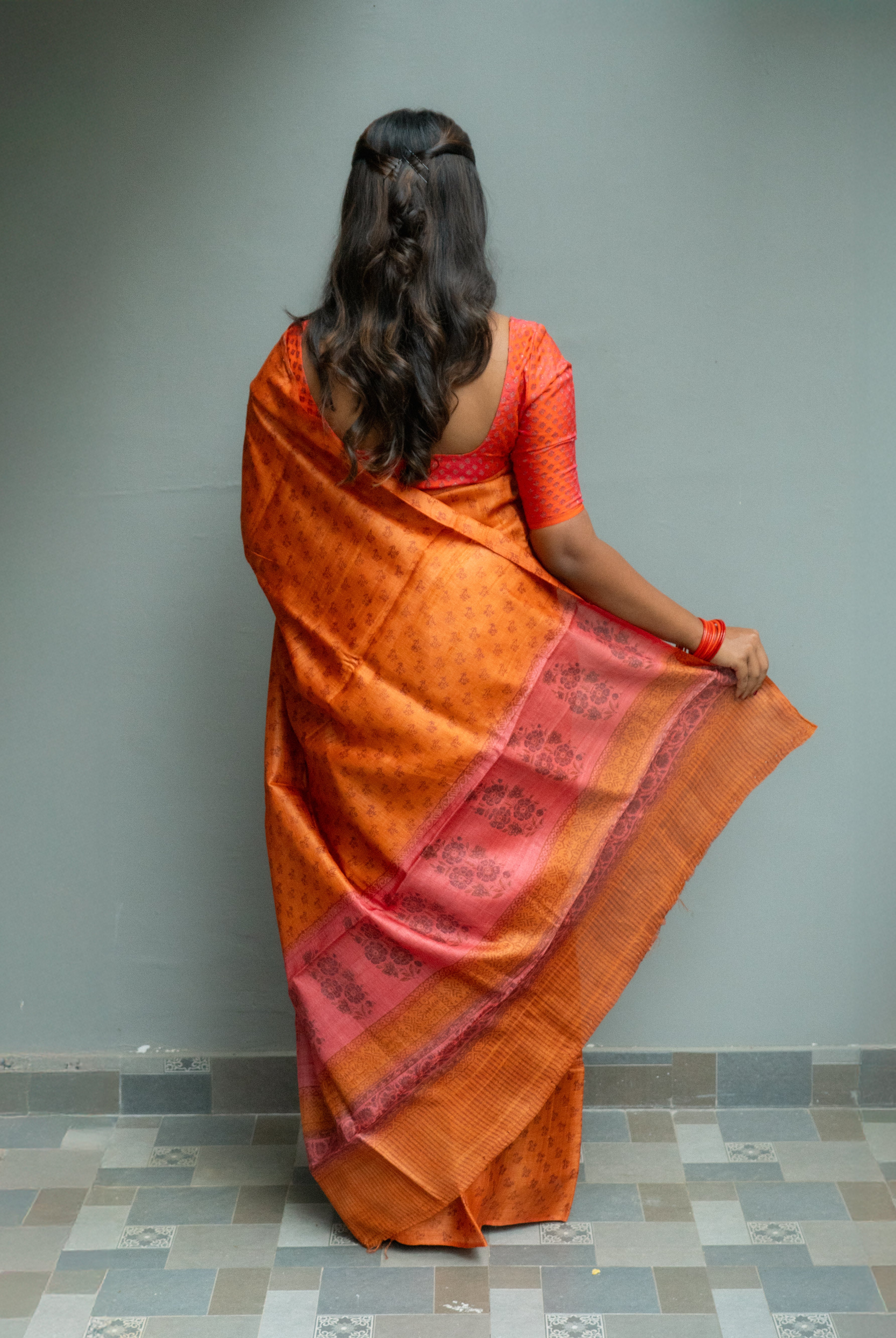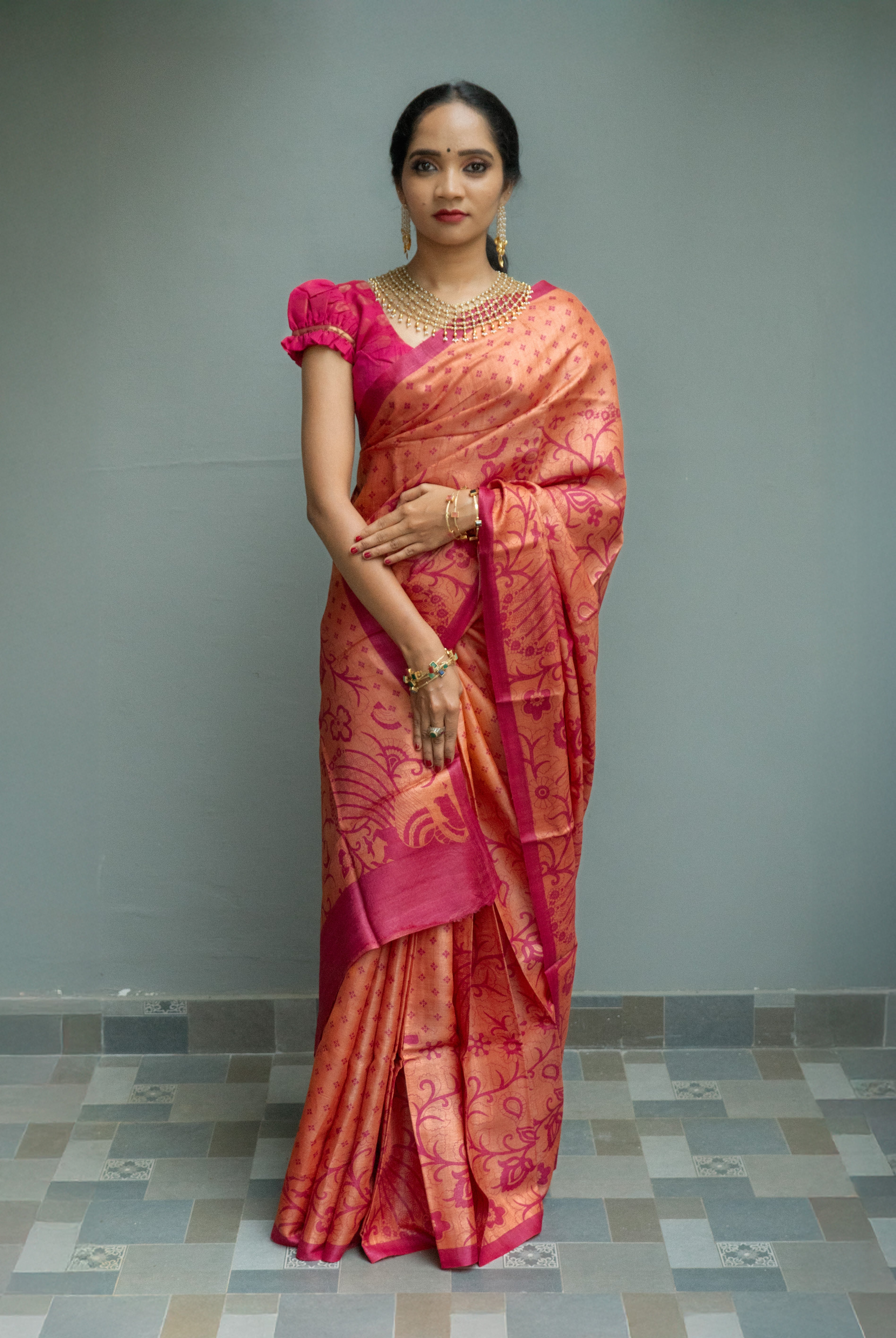Perfect for festive occasions, weddings, and cultural celebrations, this floral tussar silk saree pairs effortlessly with traditional or contemporary blouses.
