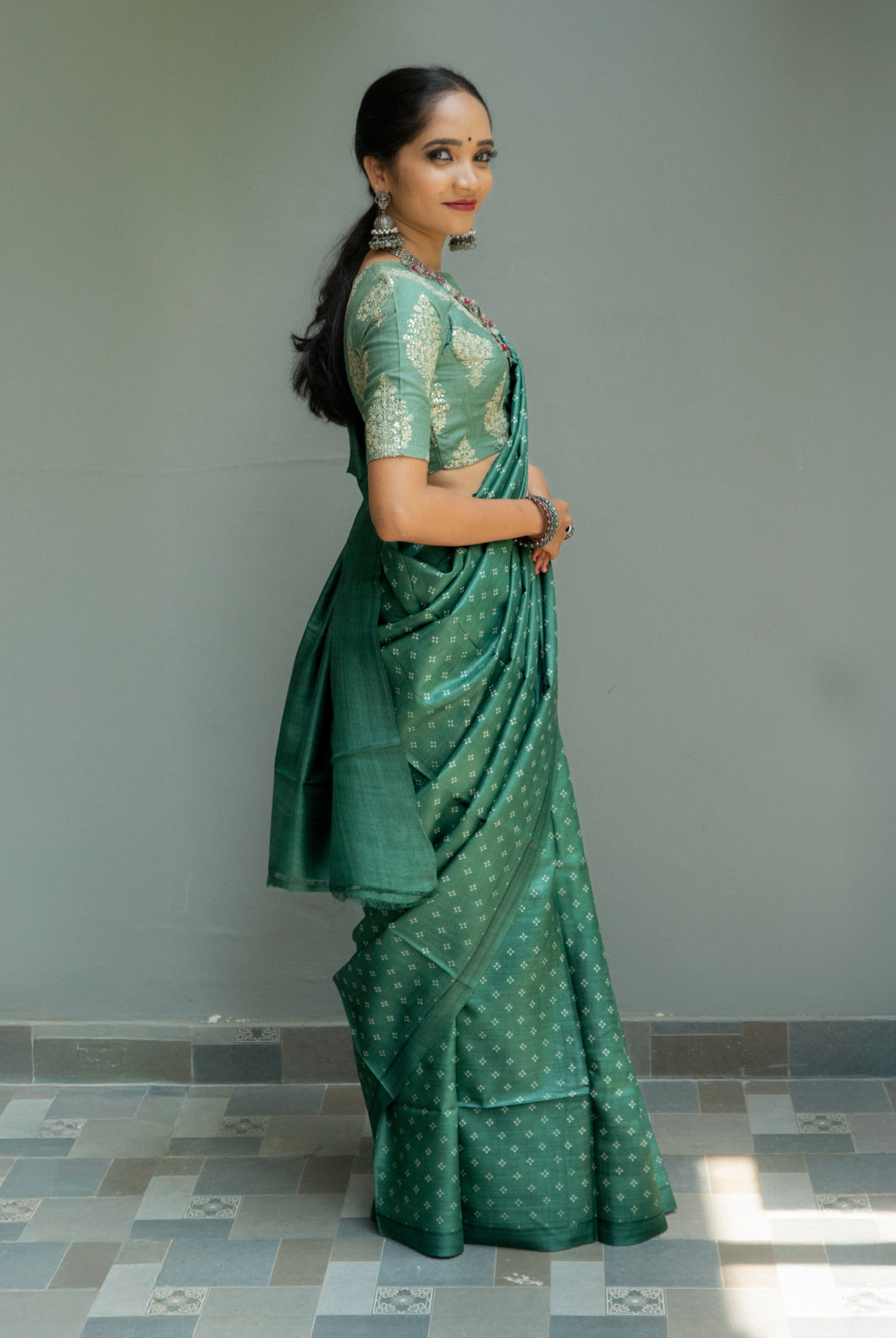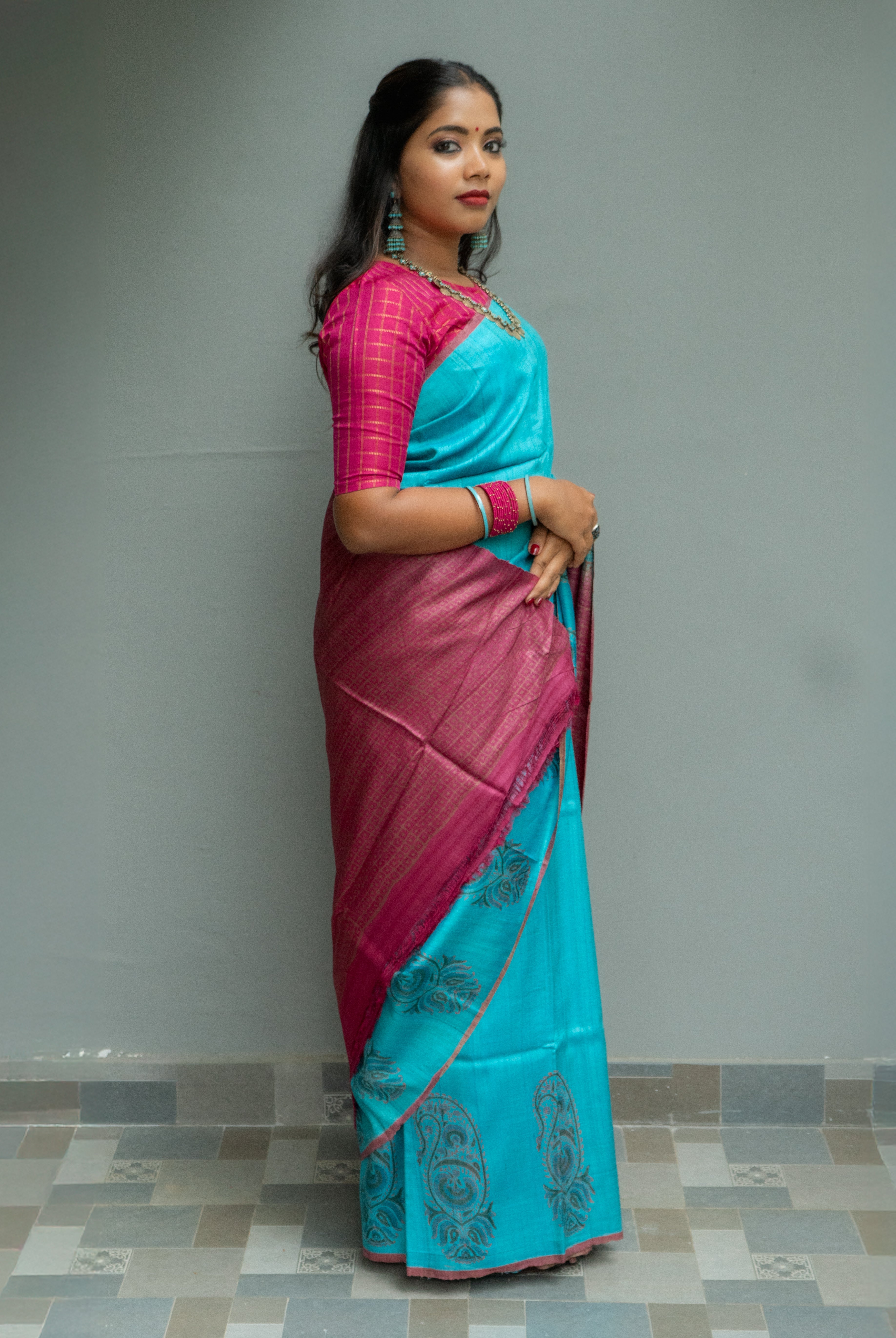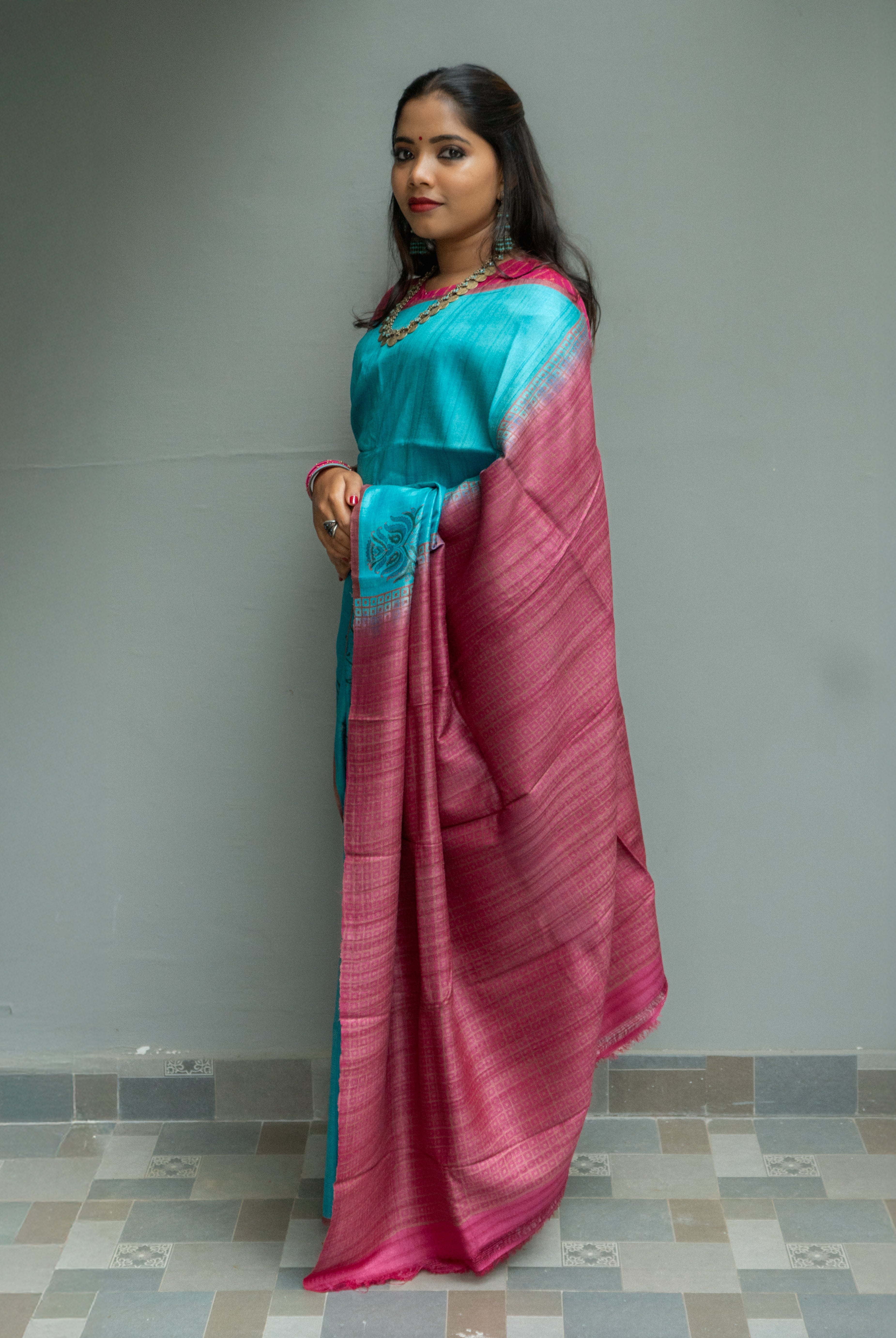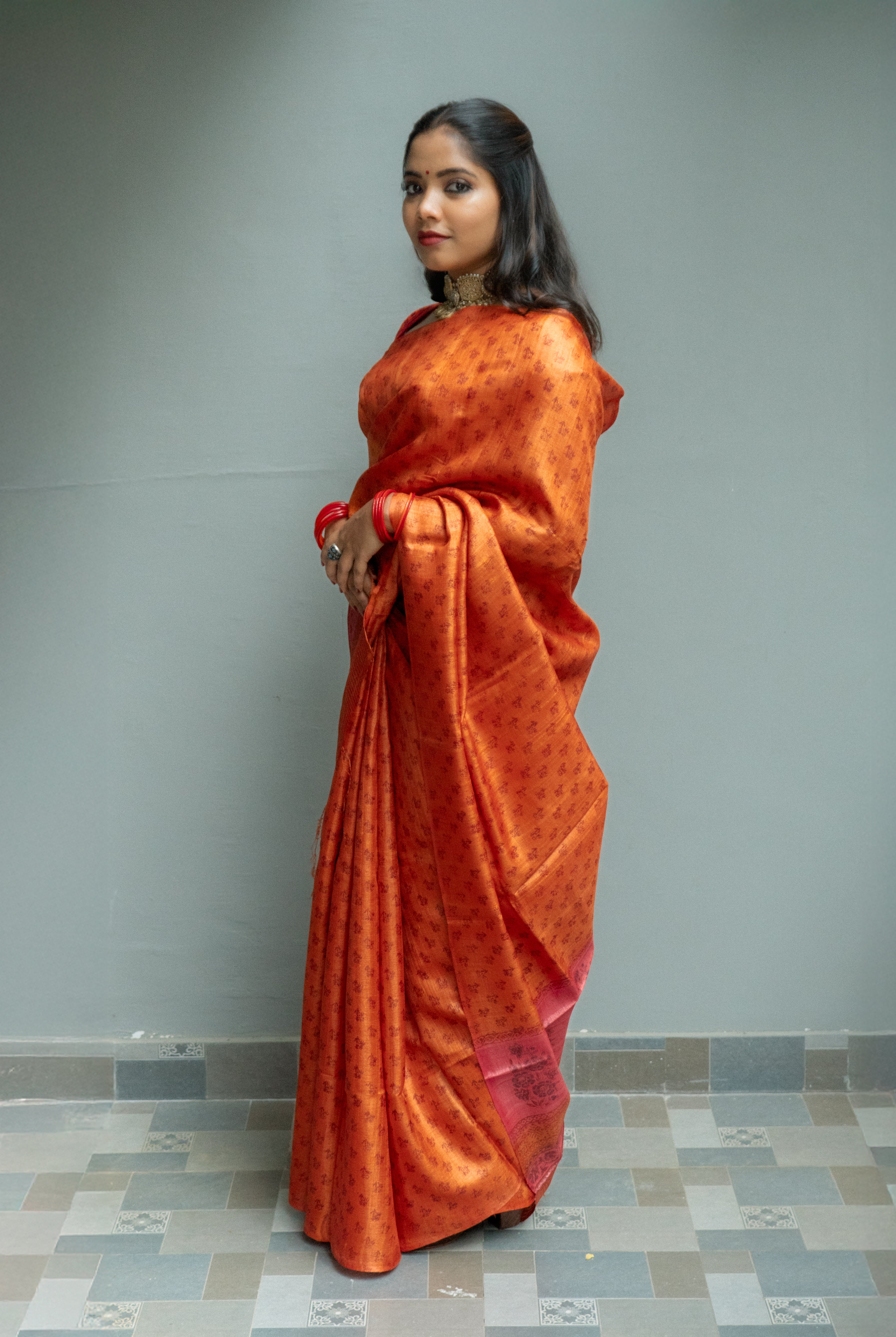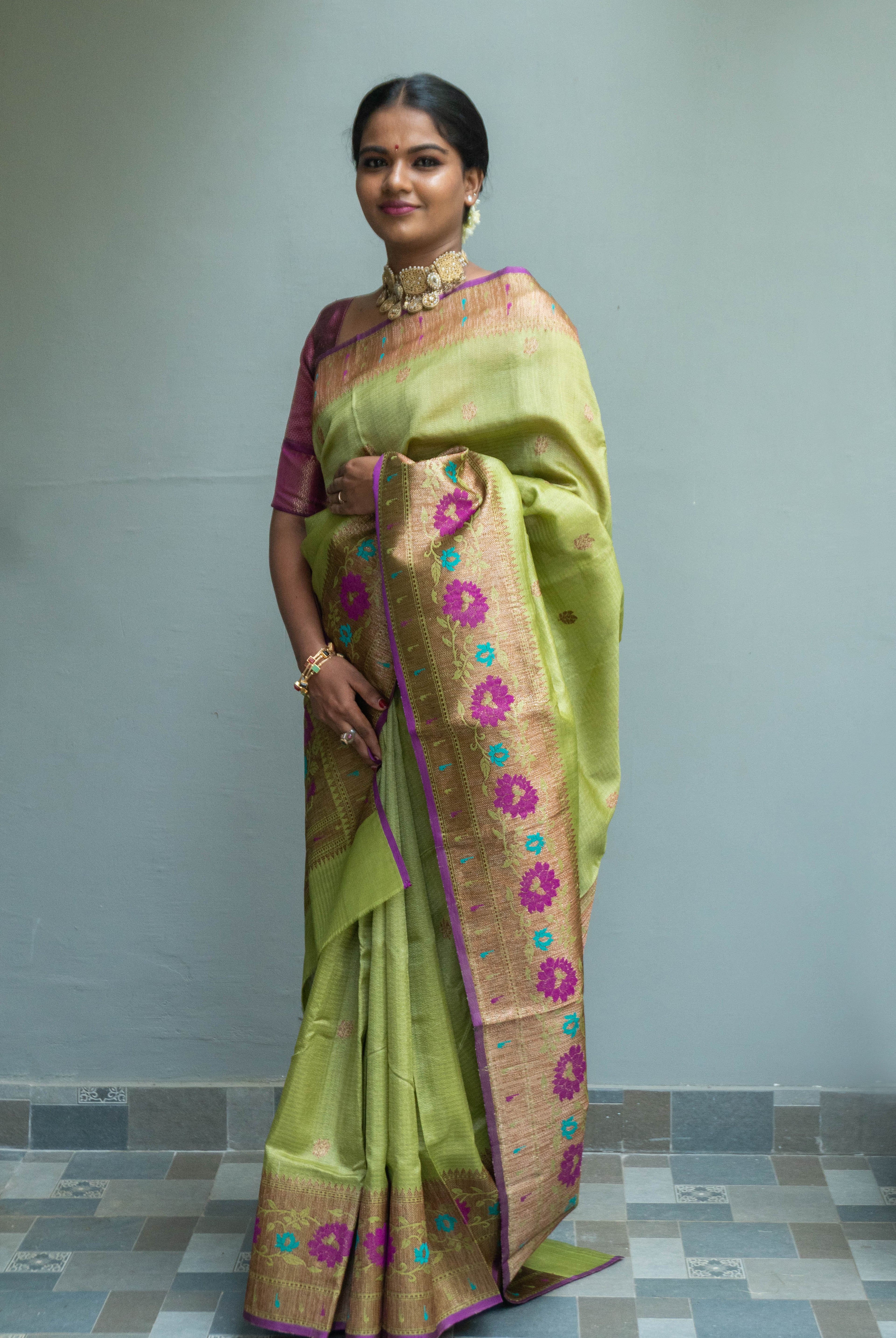 Perfect for festive occasions, weddings, and cultural celebrations, this floral tussar silk saree pairs effortlessly with traditional or contemporary blouses.