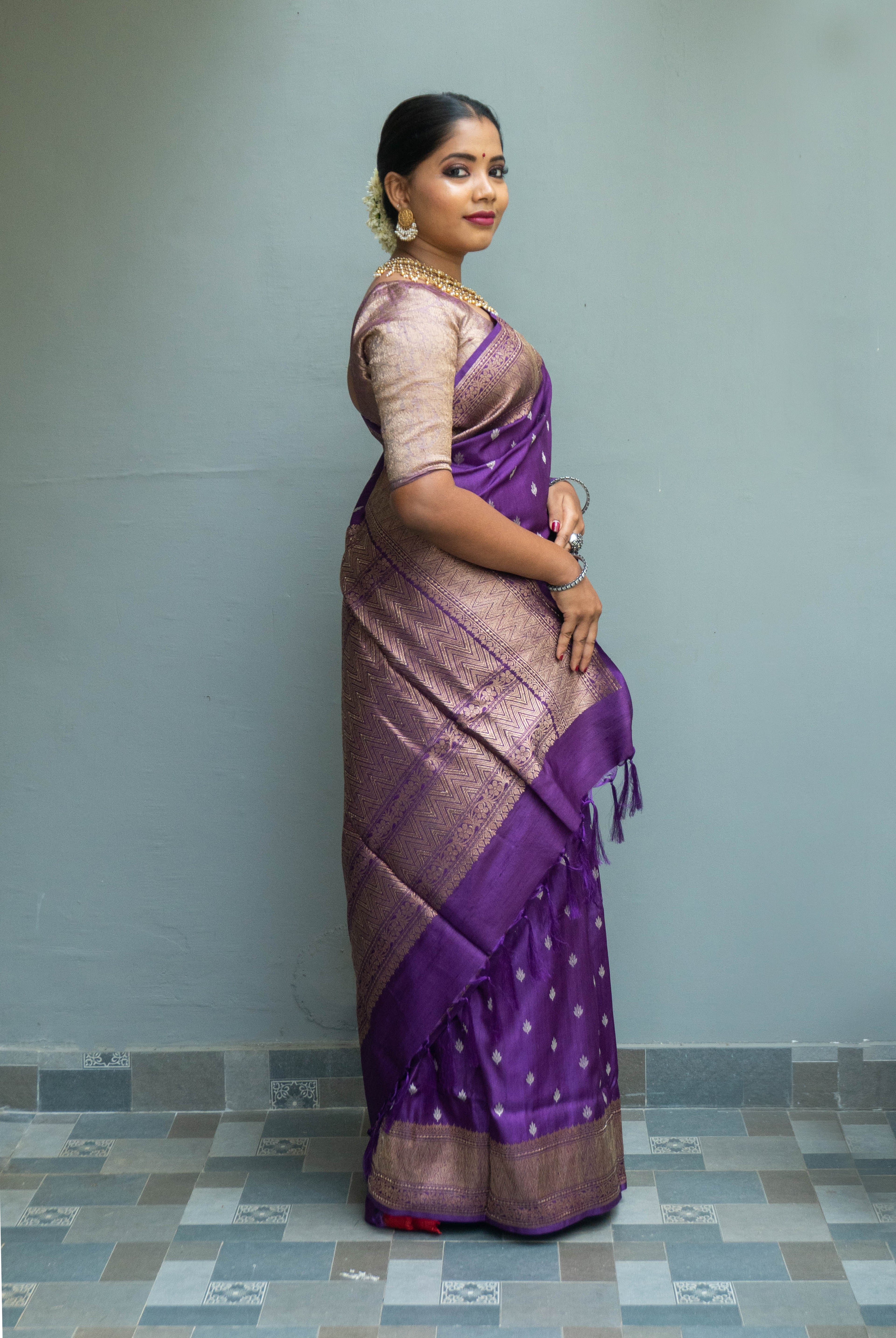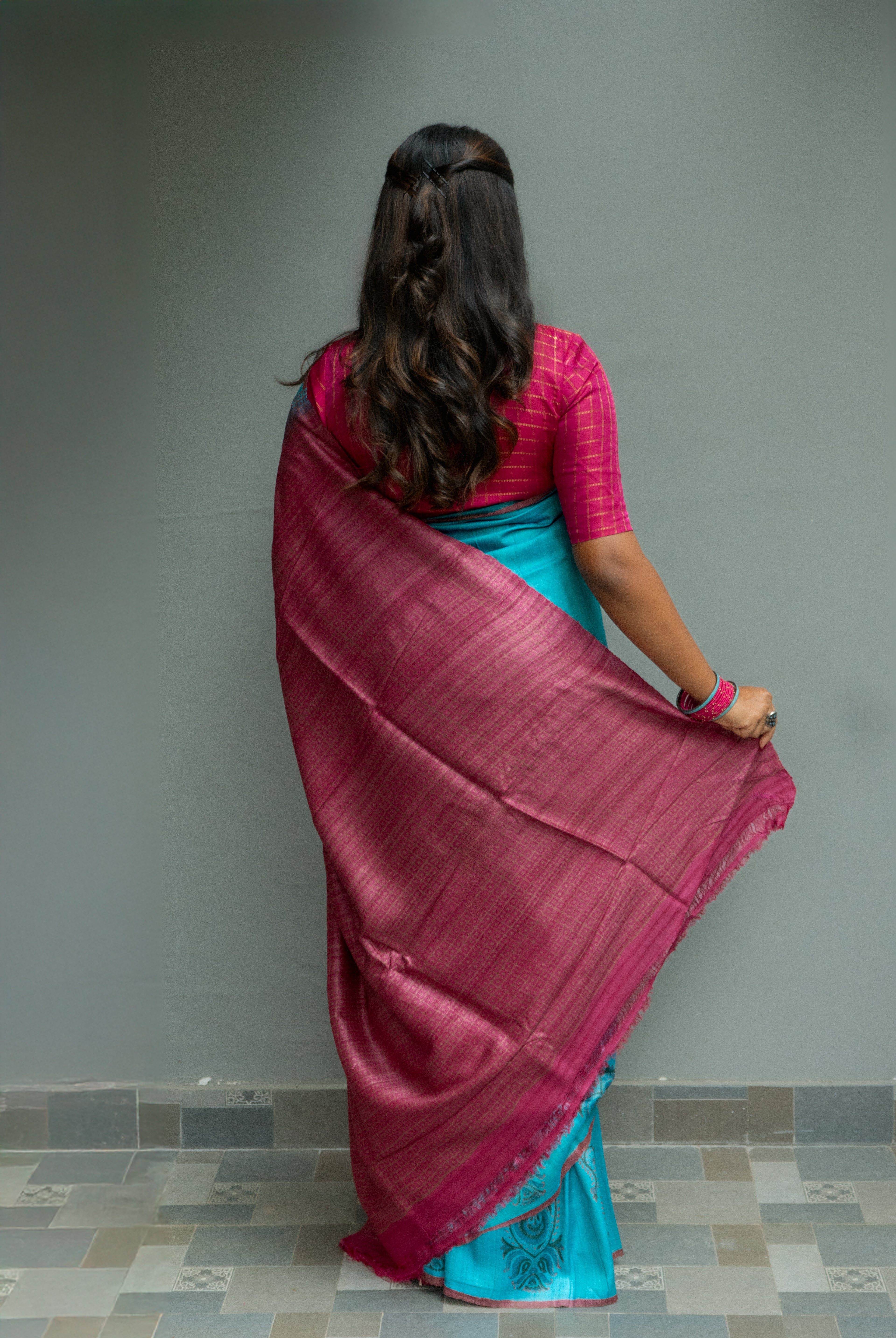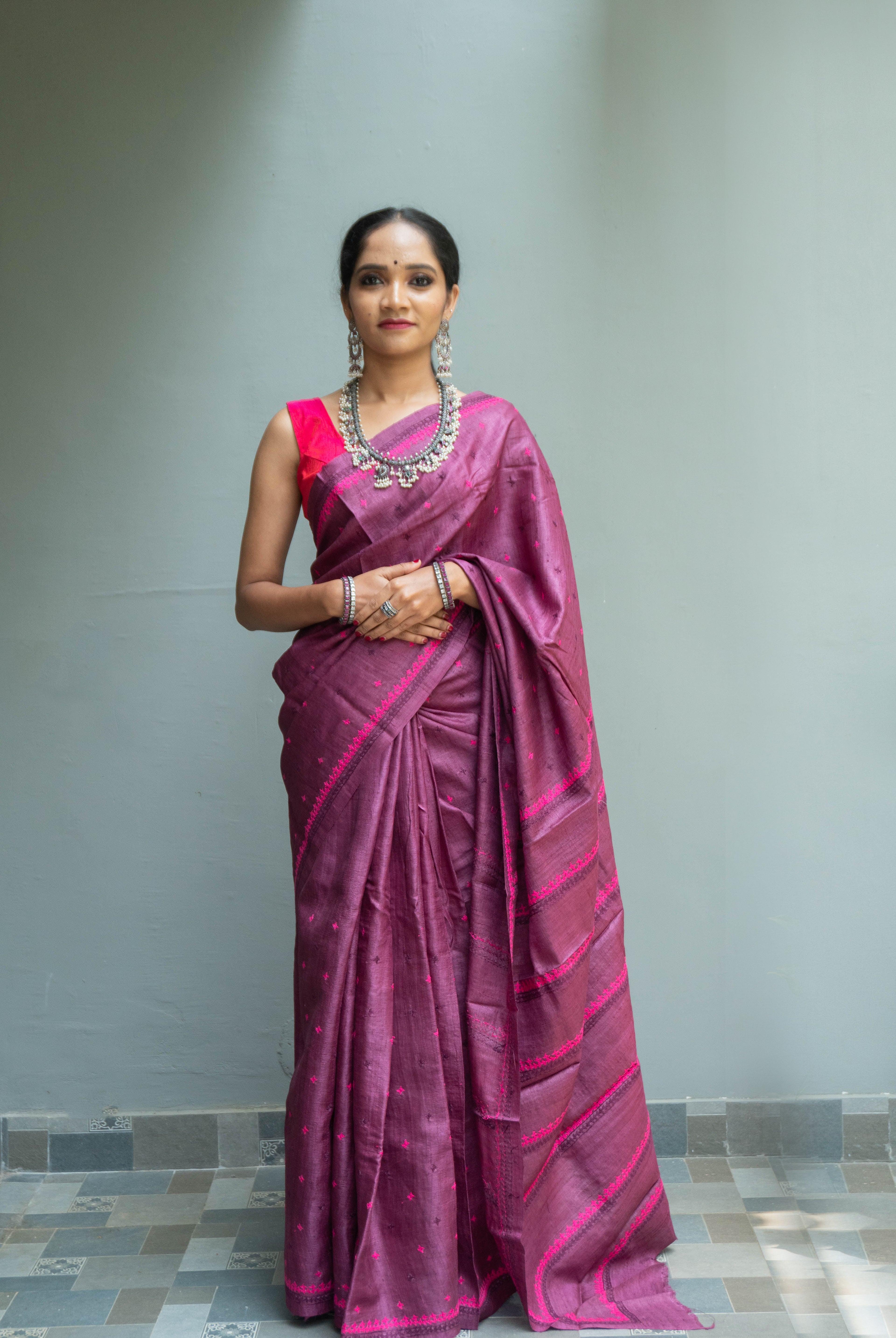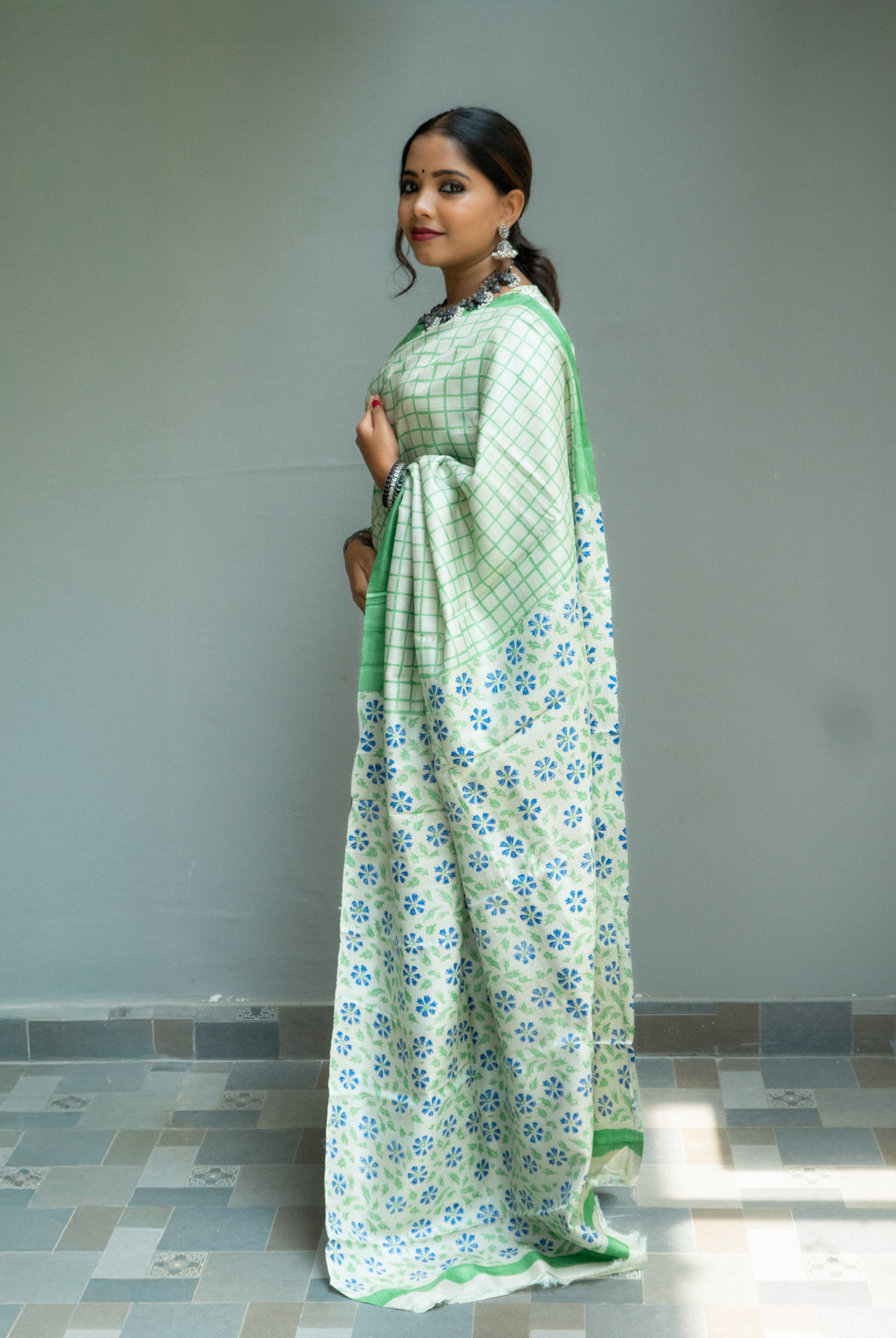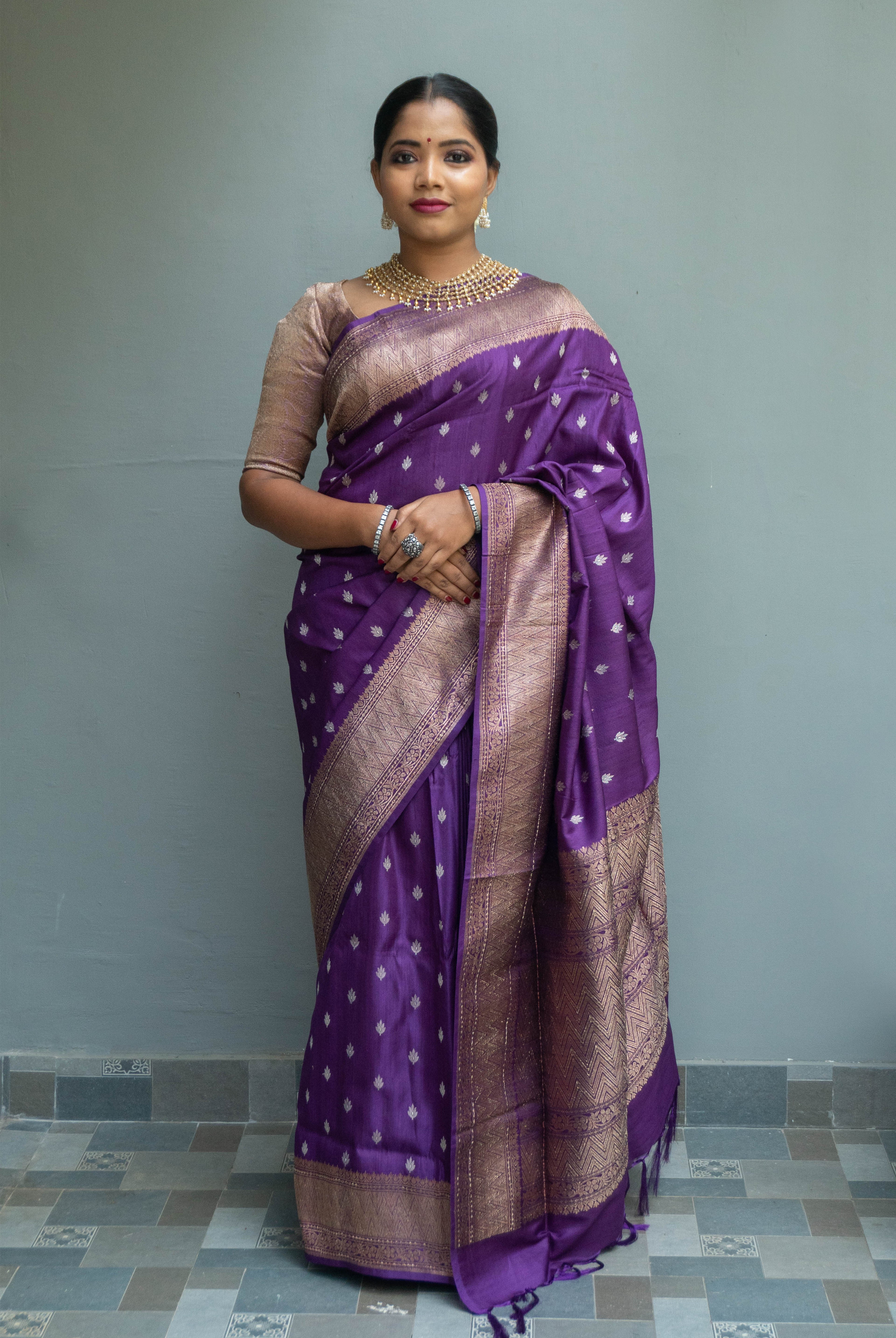 Perfect for festive occasions, weddings, and cultural celebrations, this floral tussar silk saree pairs effortlessly with traditional or contemporary blouses.