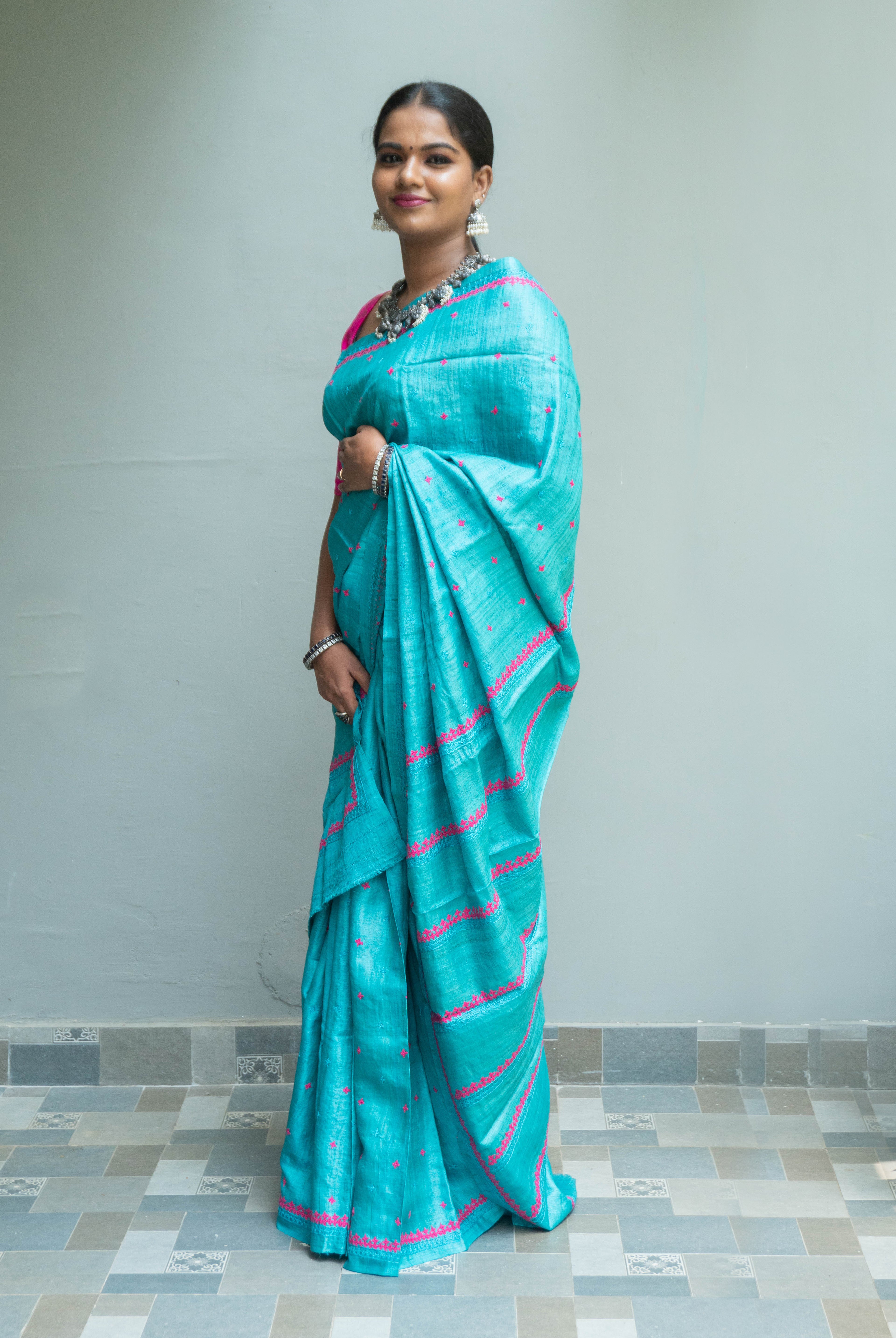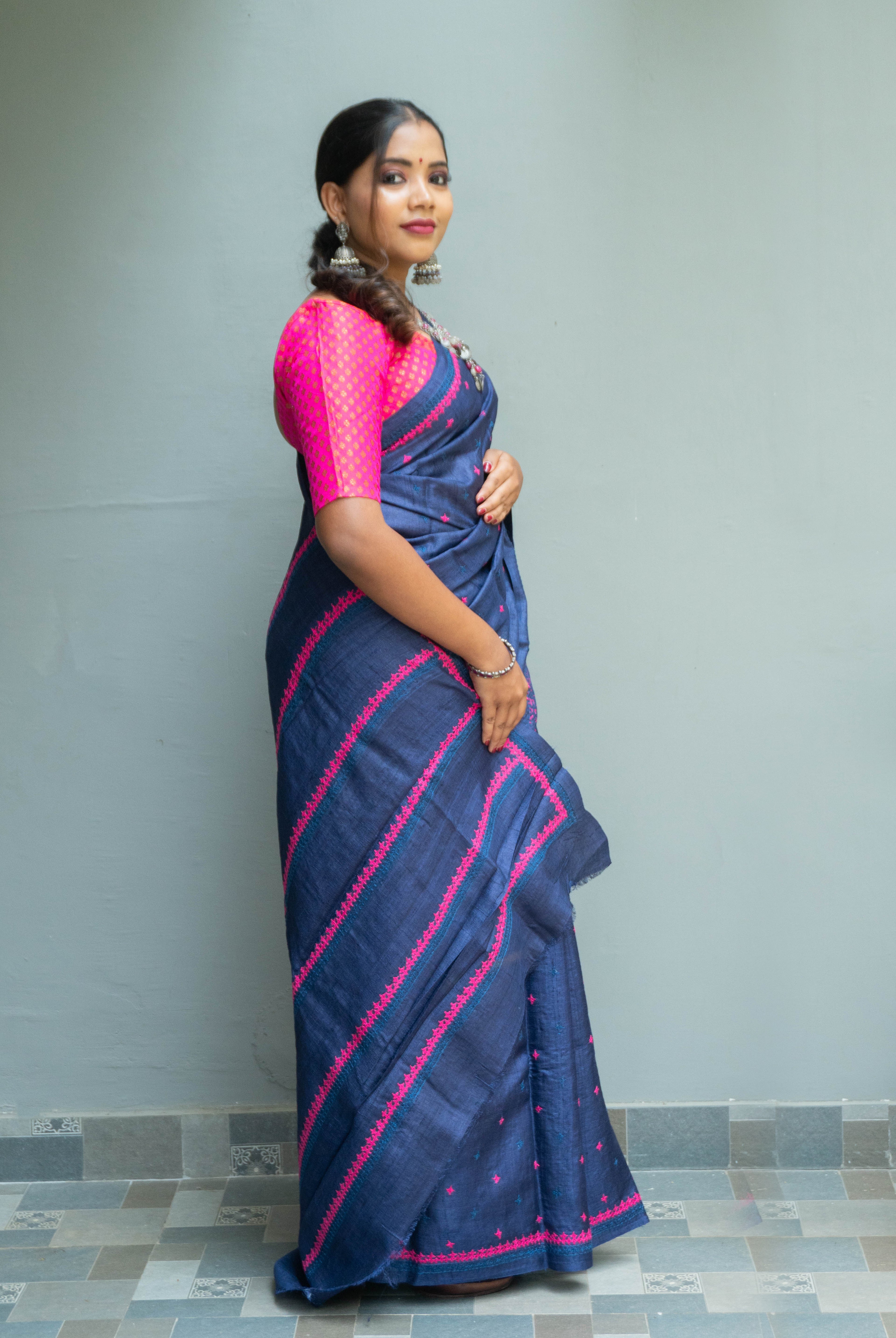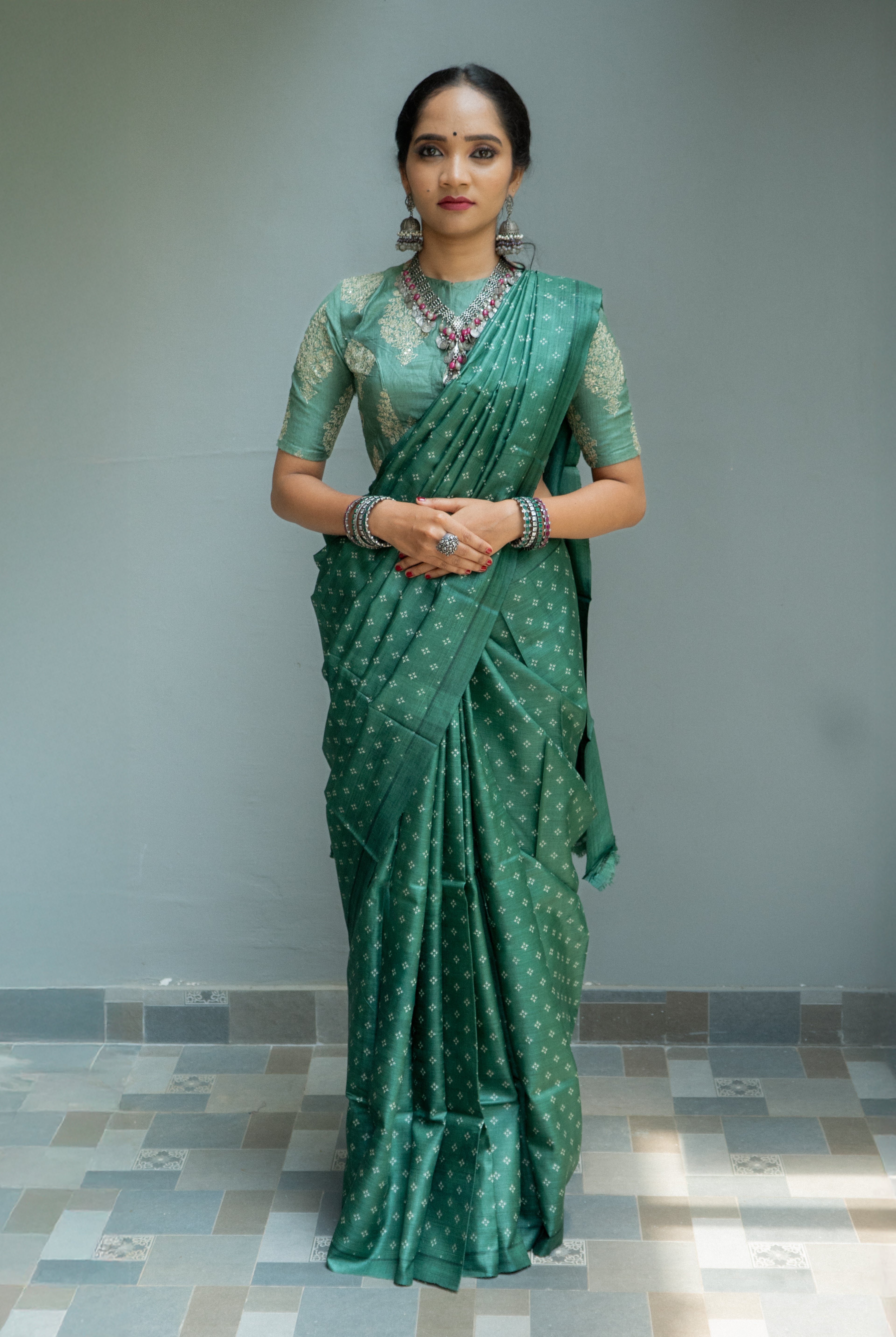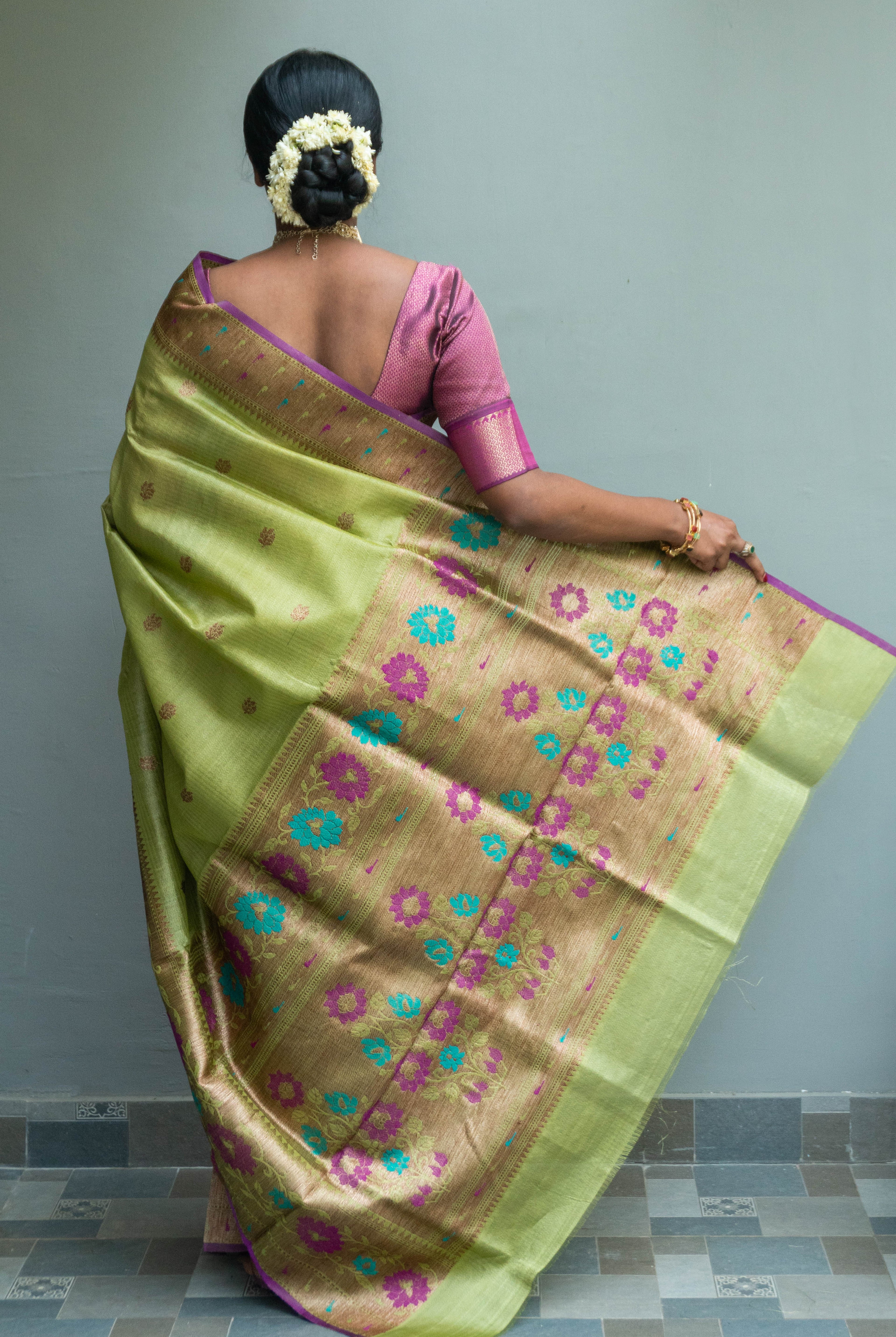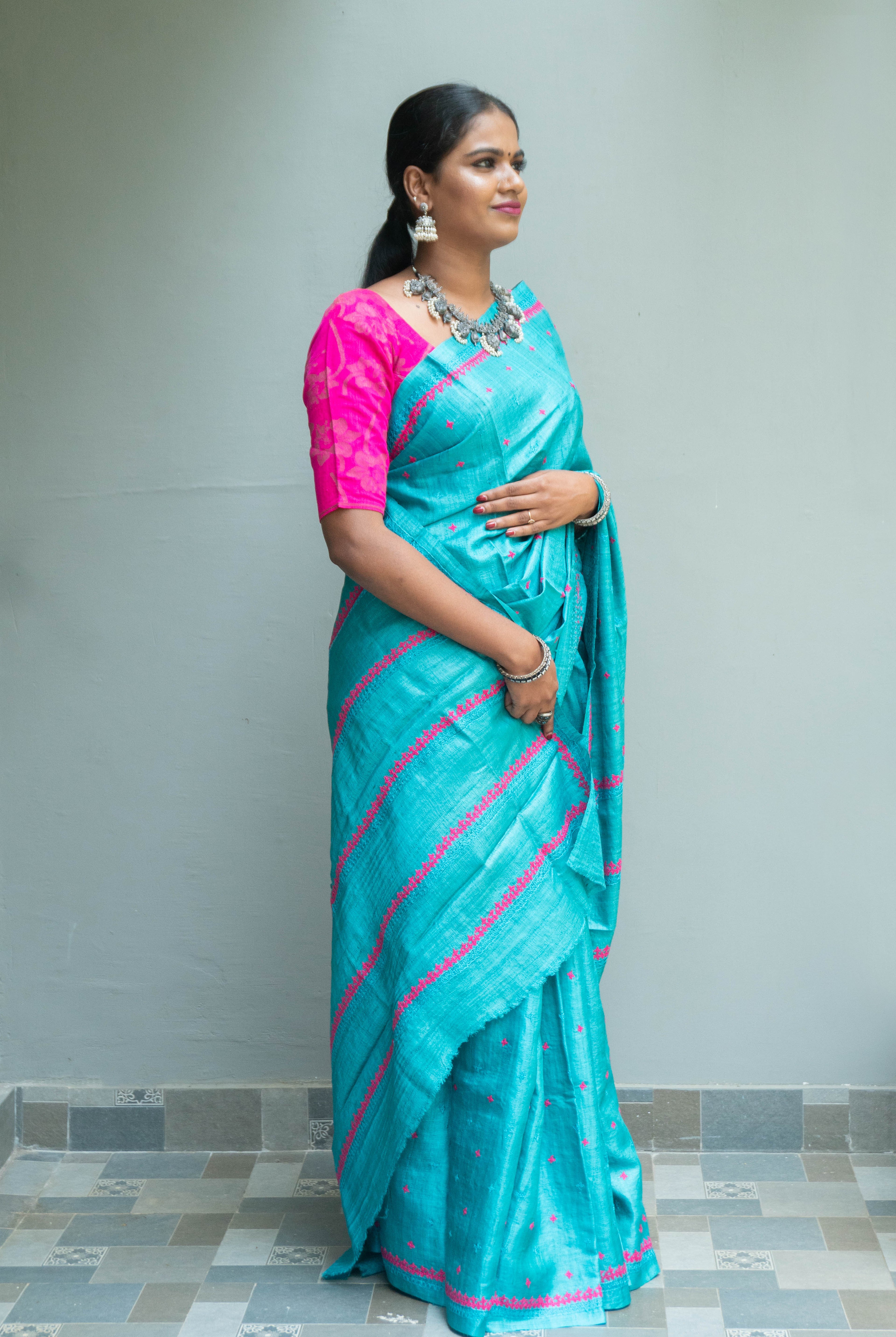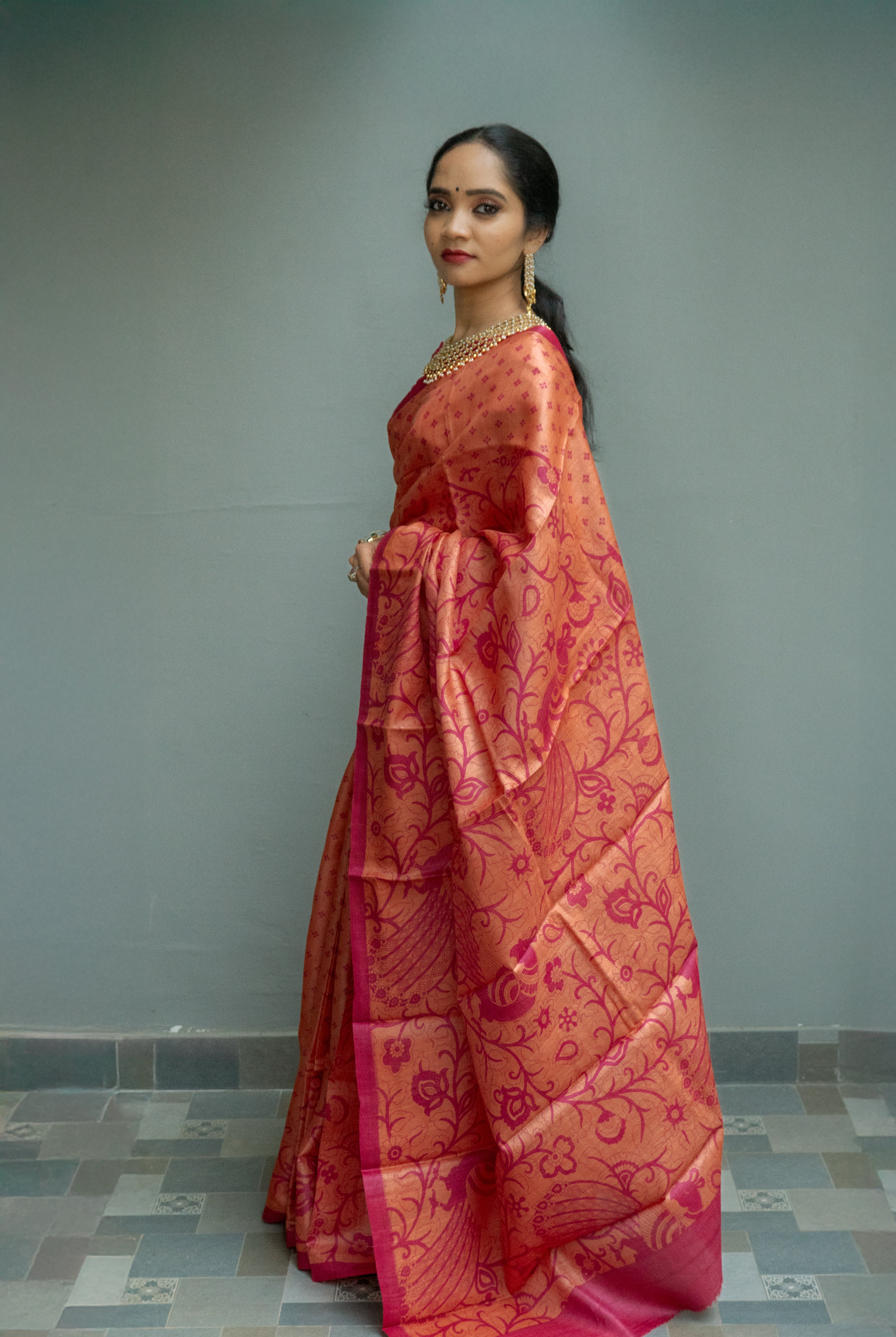 Perfect for festive occasions, weddings, and cultural celebrations, this floral tussar silk saree pairs effortlessly with traditional or contemporary blouses.