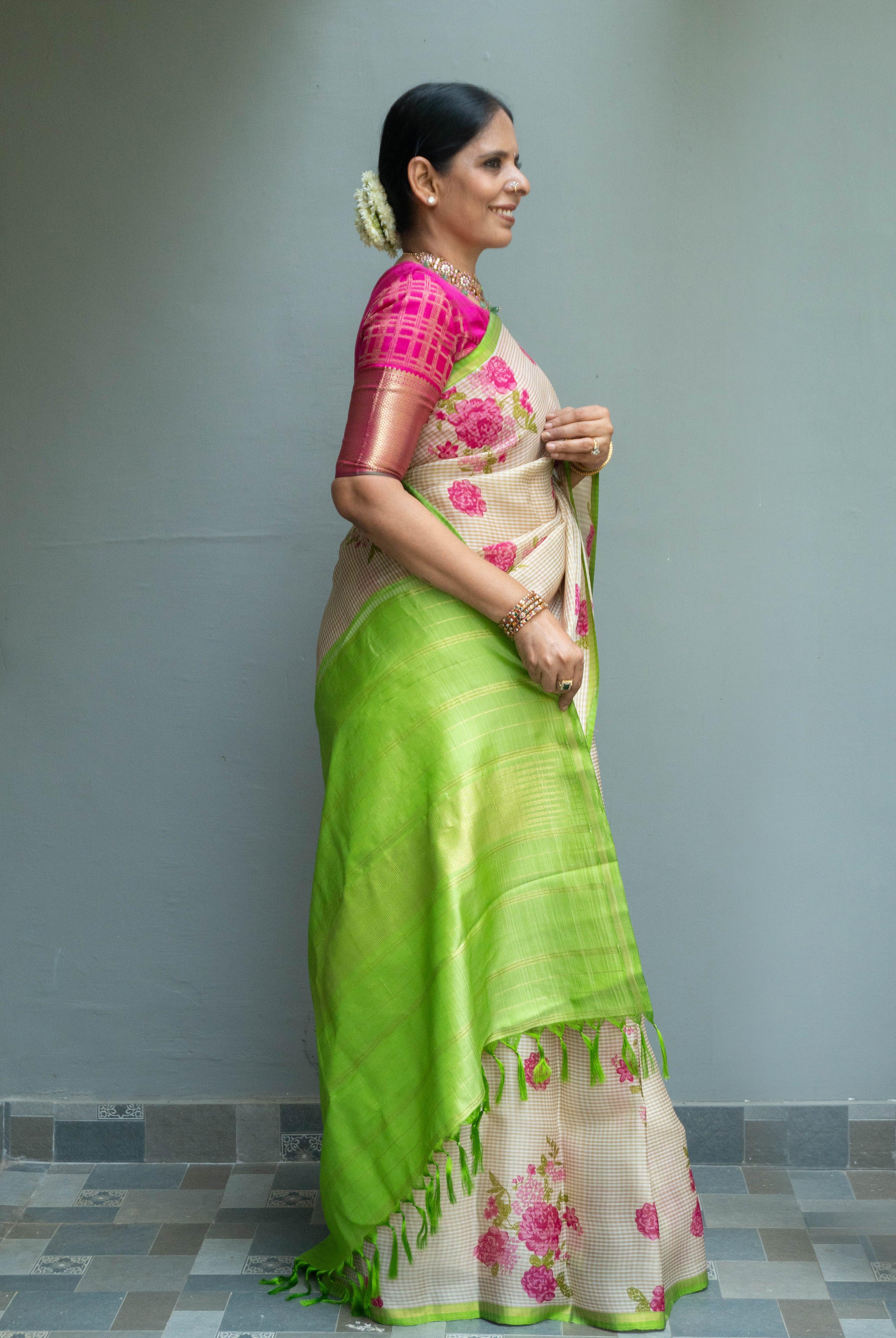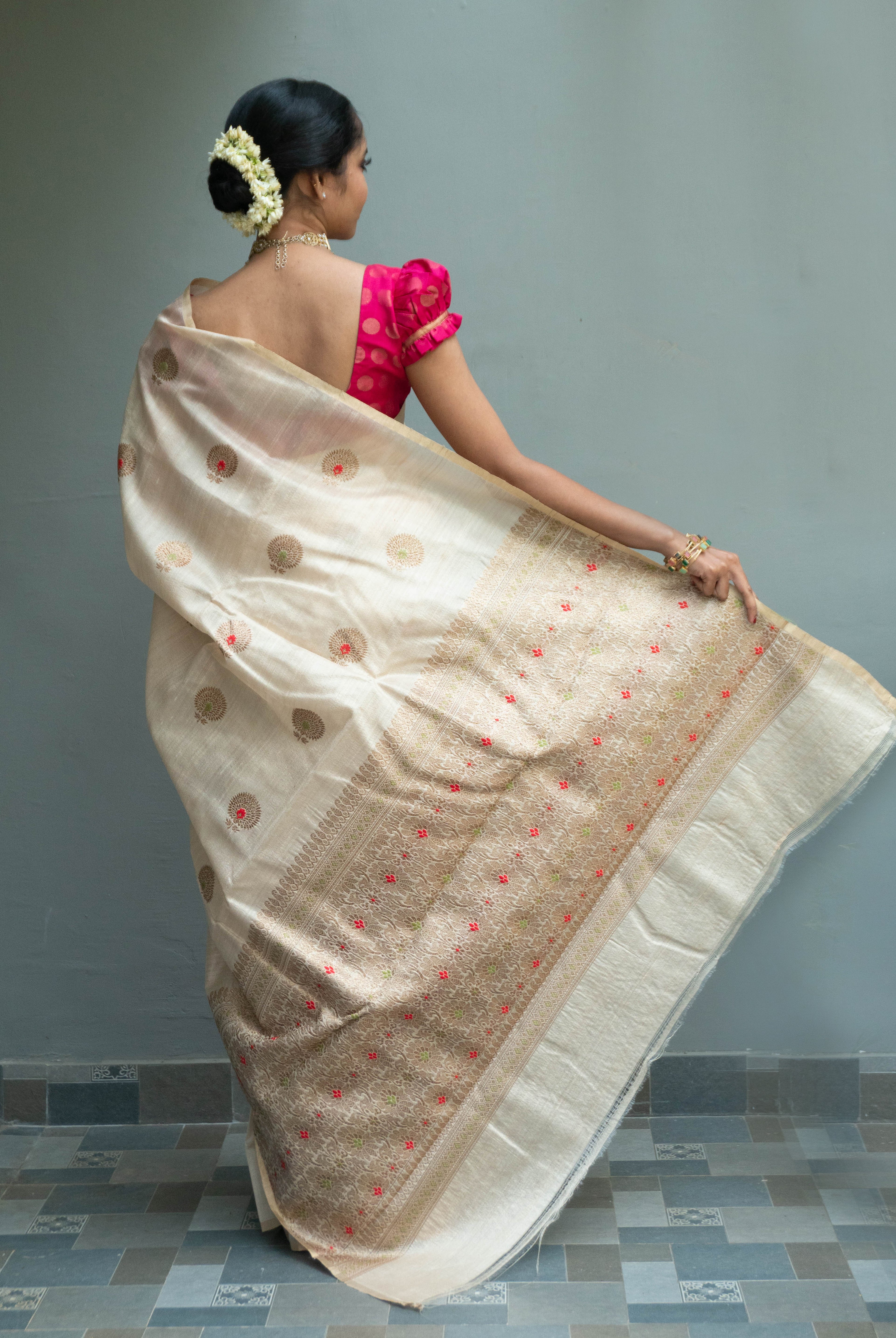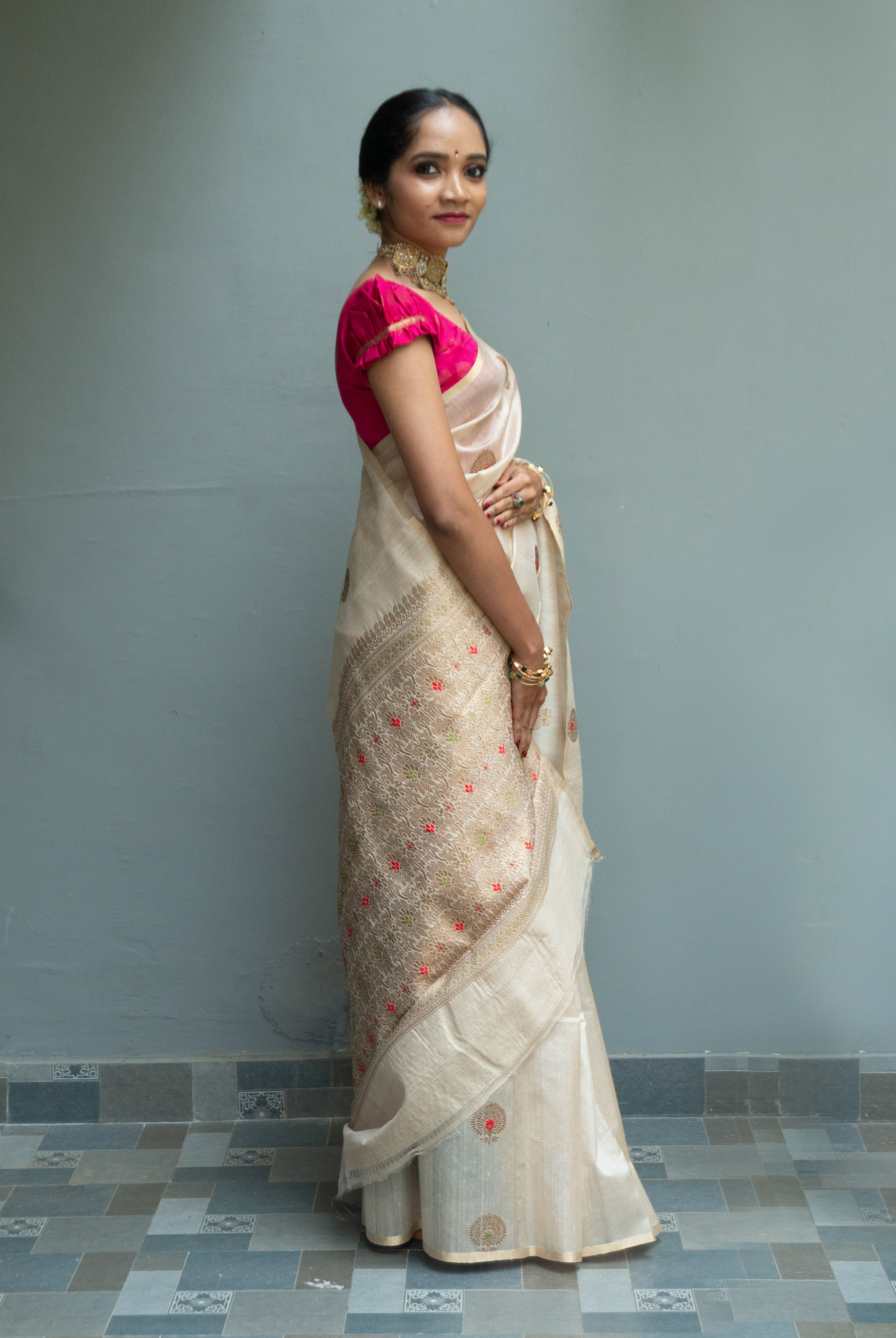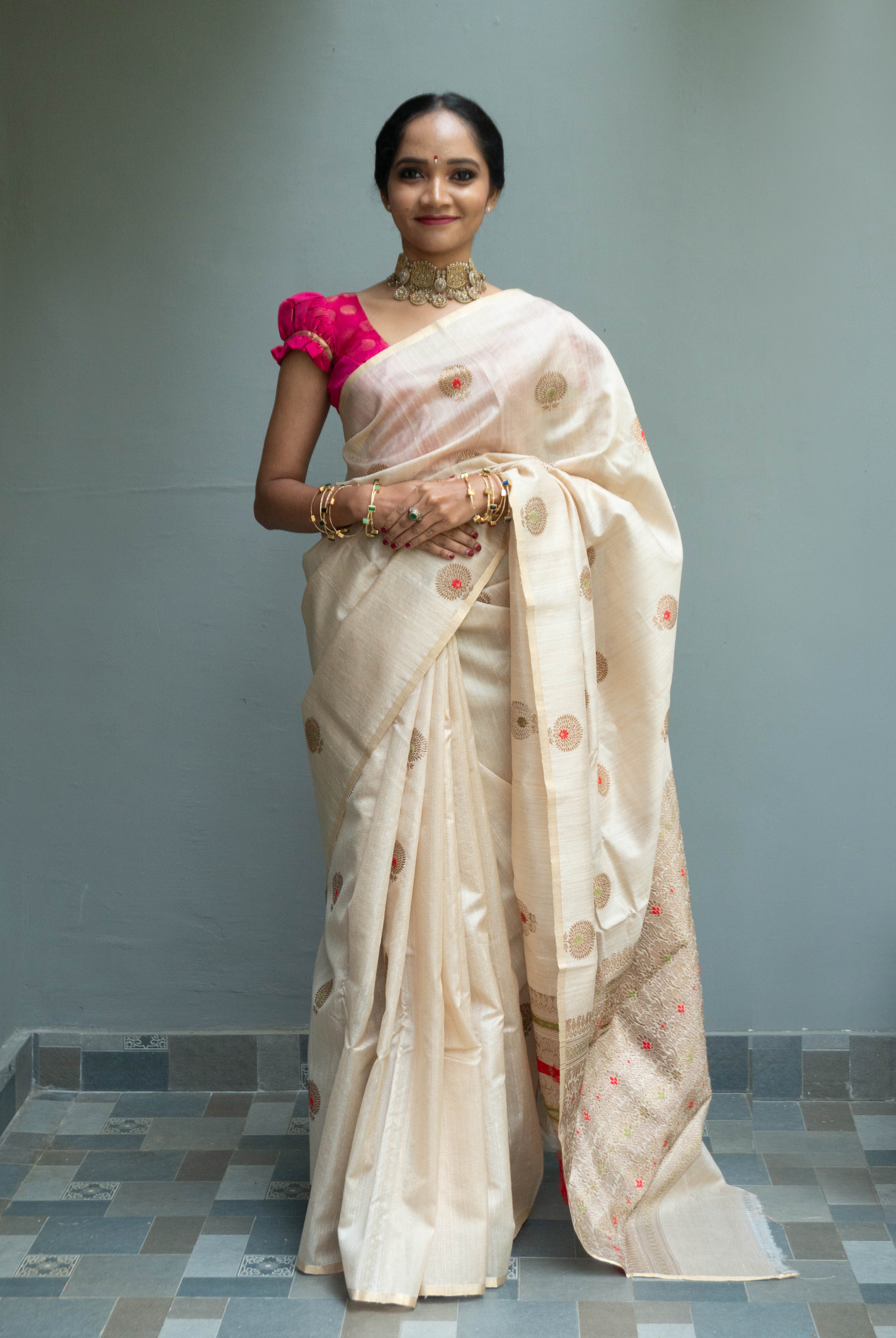 Cream Tussar silk saree, beautifully adorned with delicate floral motifs across the body. The striking Rani pink tissue border adds a regal charm, enhancing the saree with a touch of shimmer and elegance.