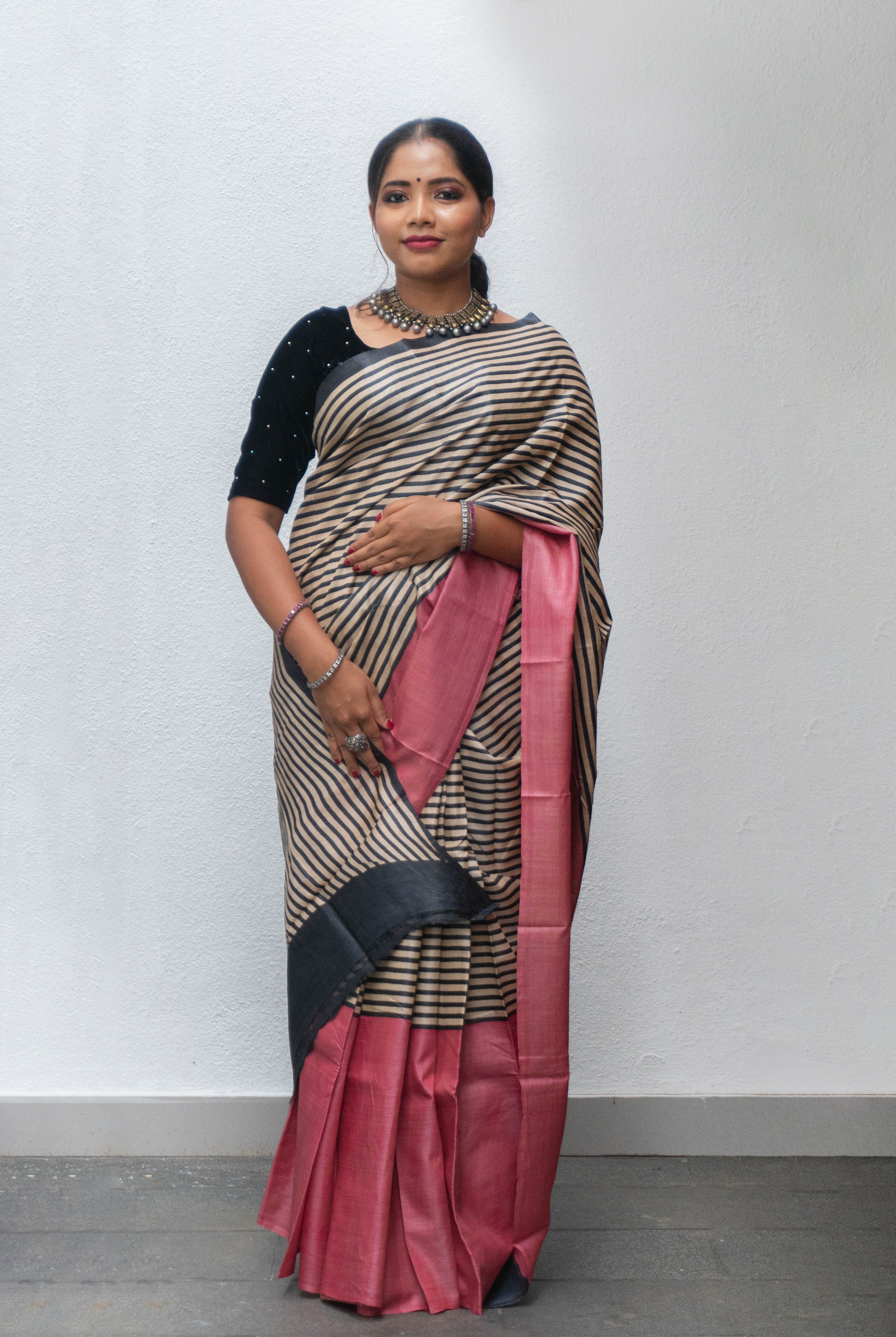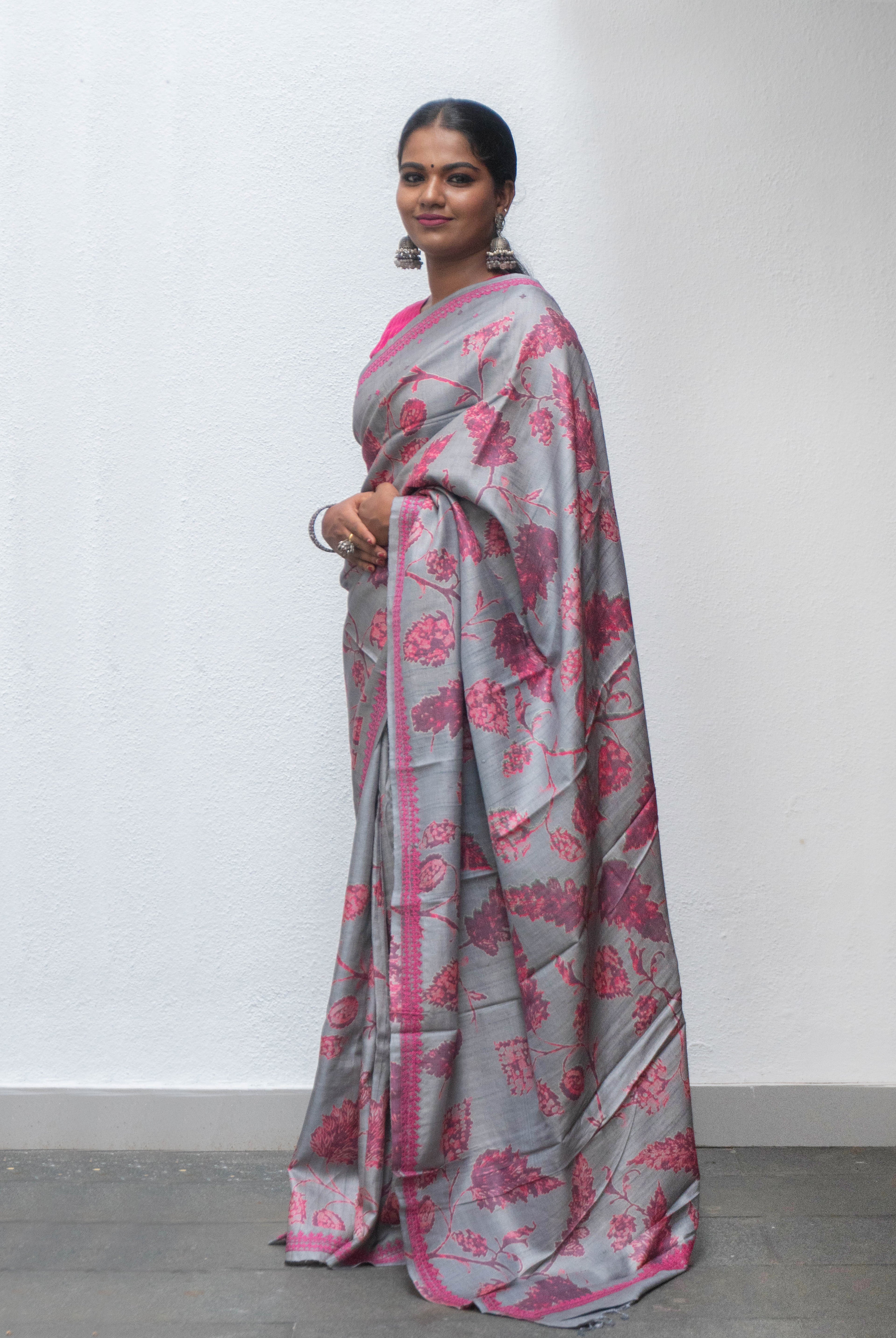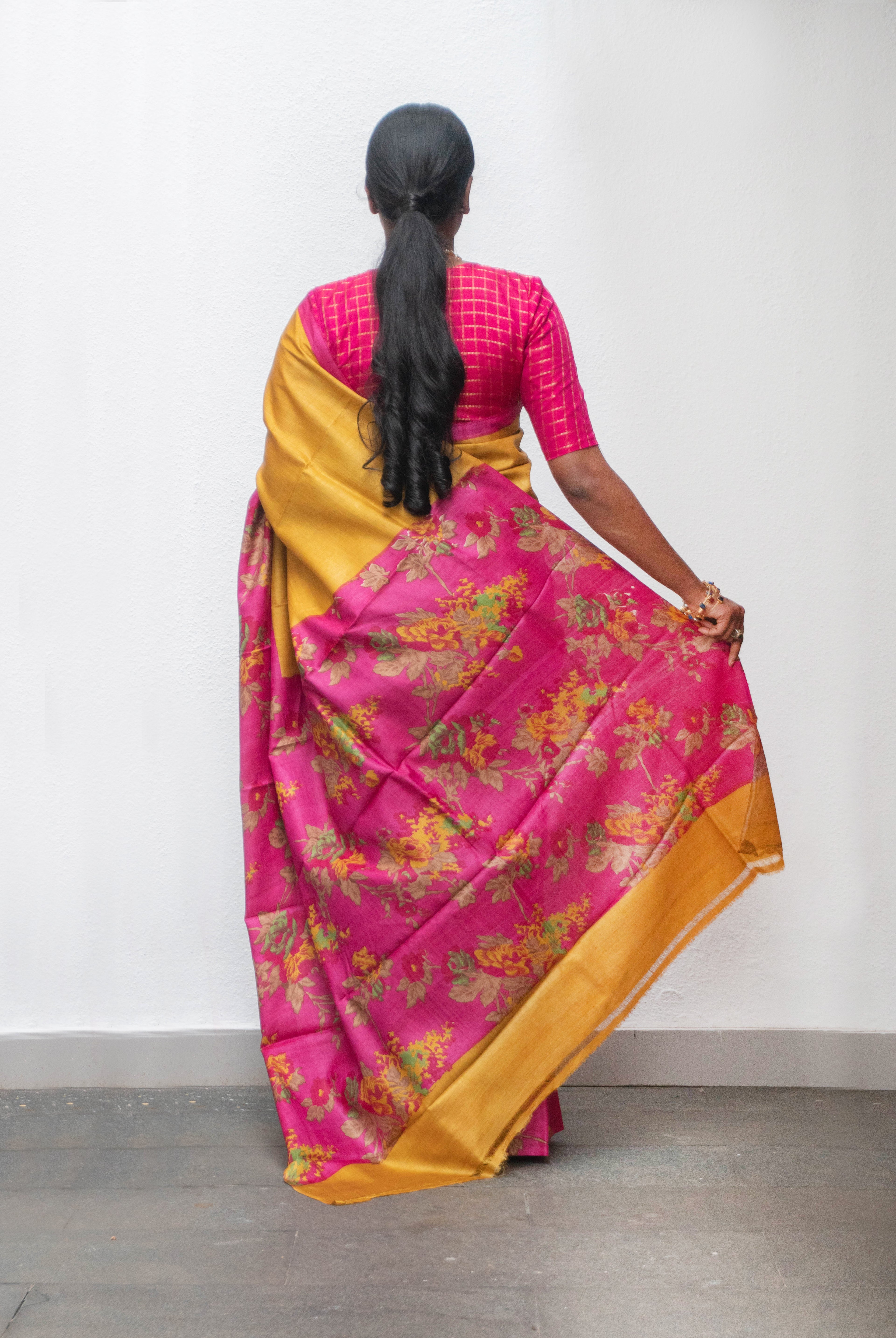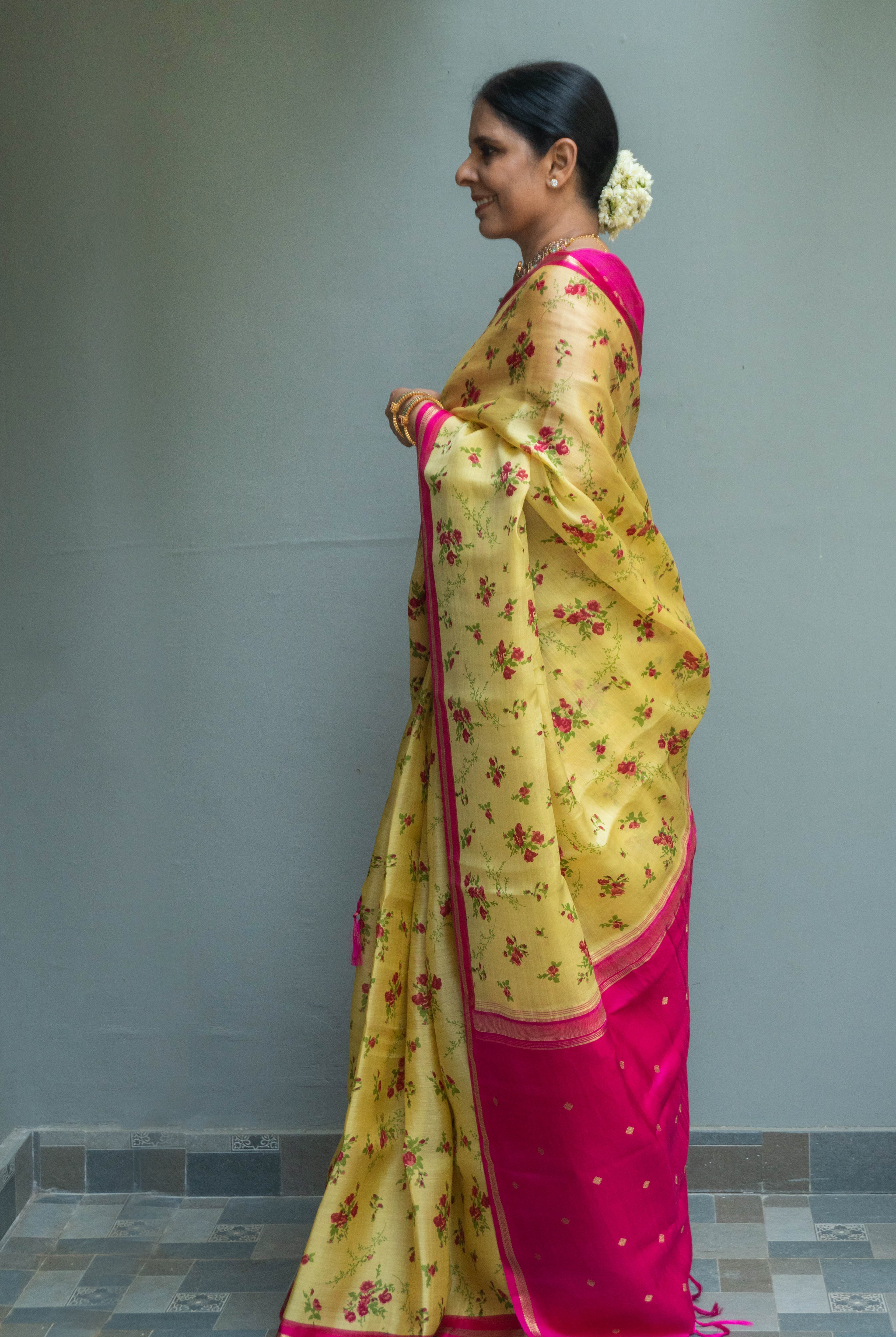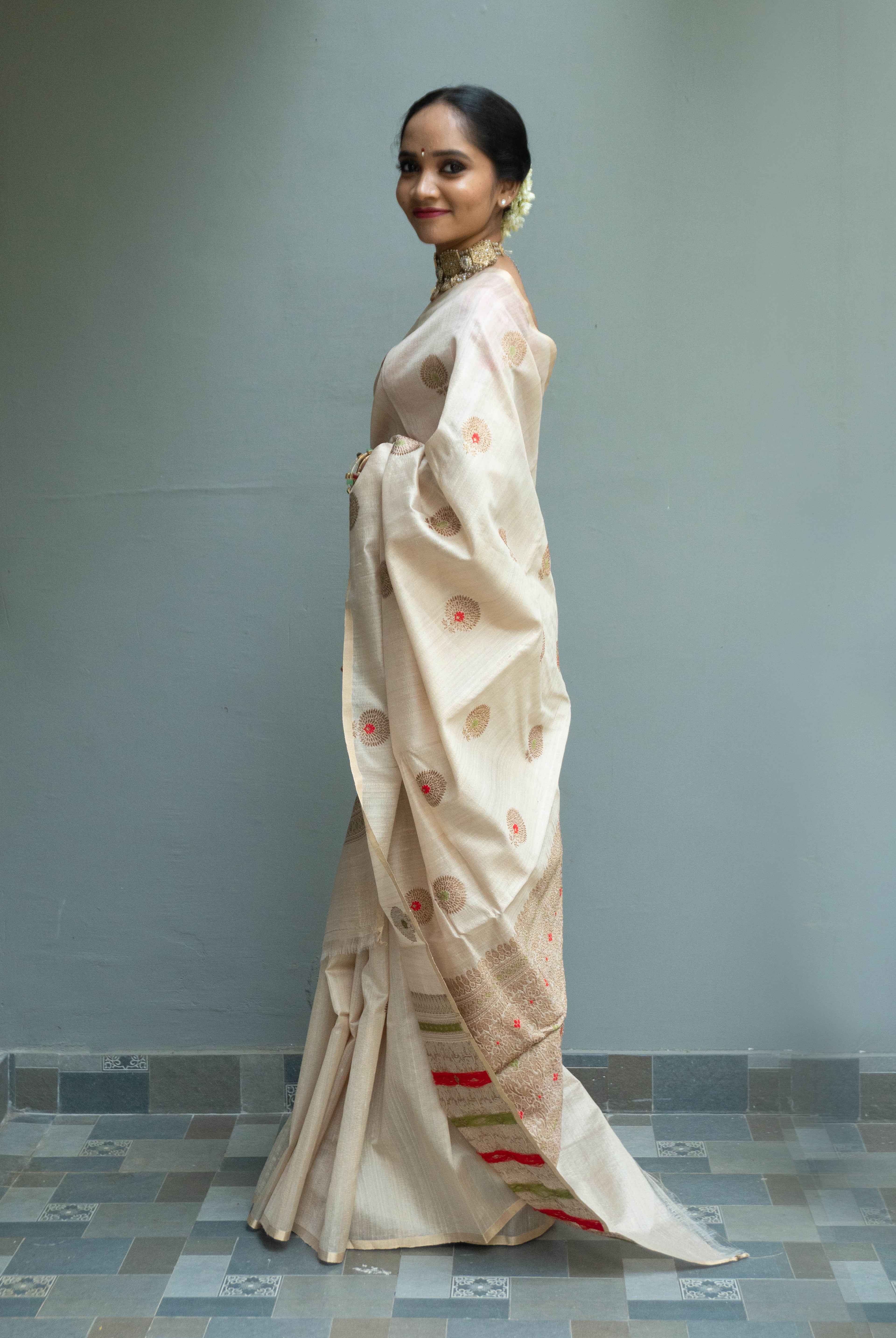 Cream Tussar silk saree, beautifully adorned with delicate floral motifs across the body. The striking Rani pink tissue border adds a regal charm, enhancing the saree with a touch of shimmer and elegance.