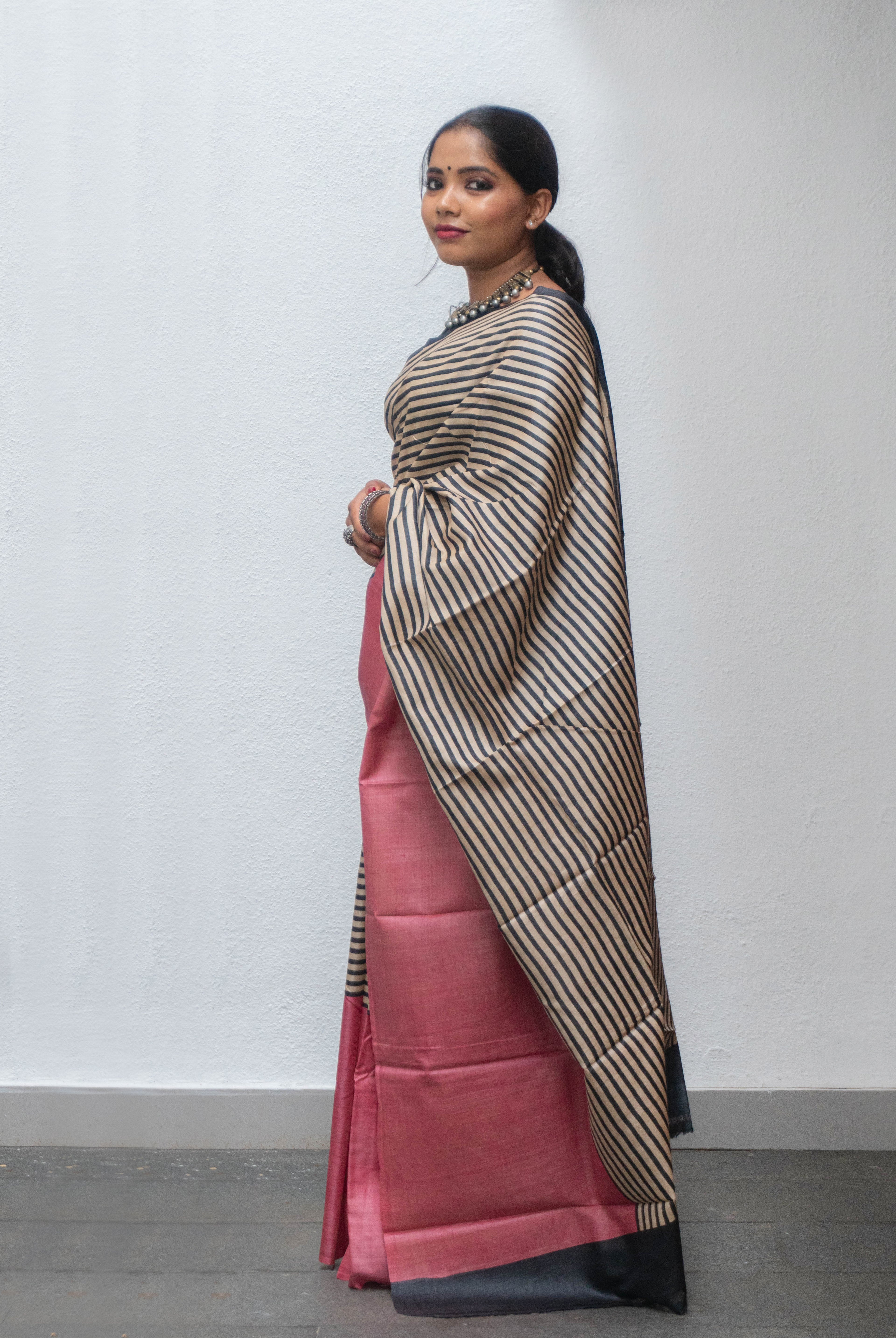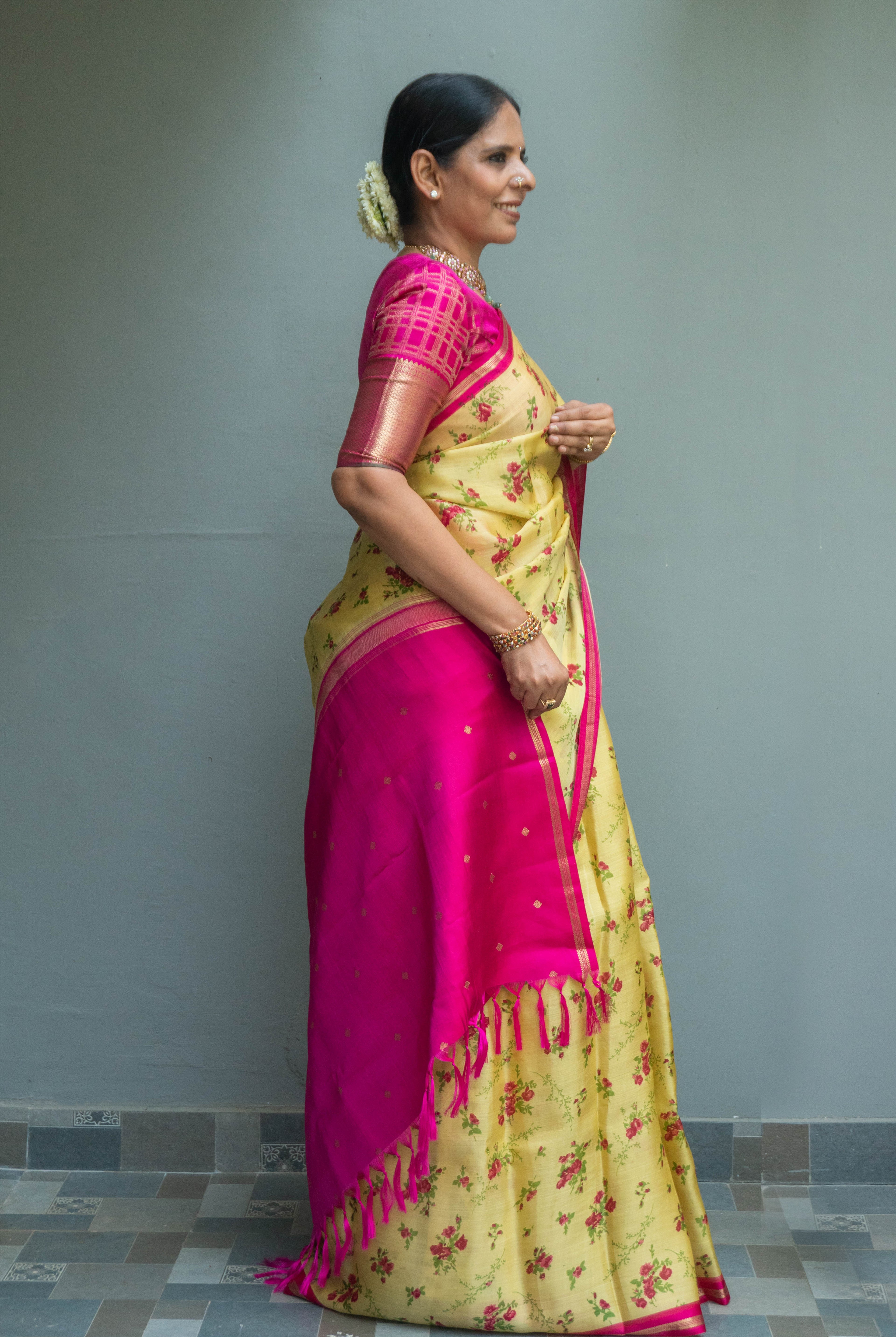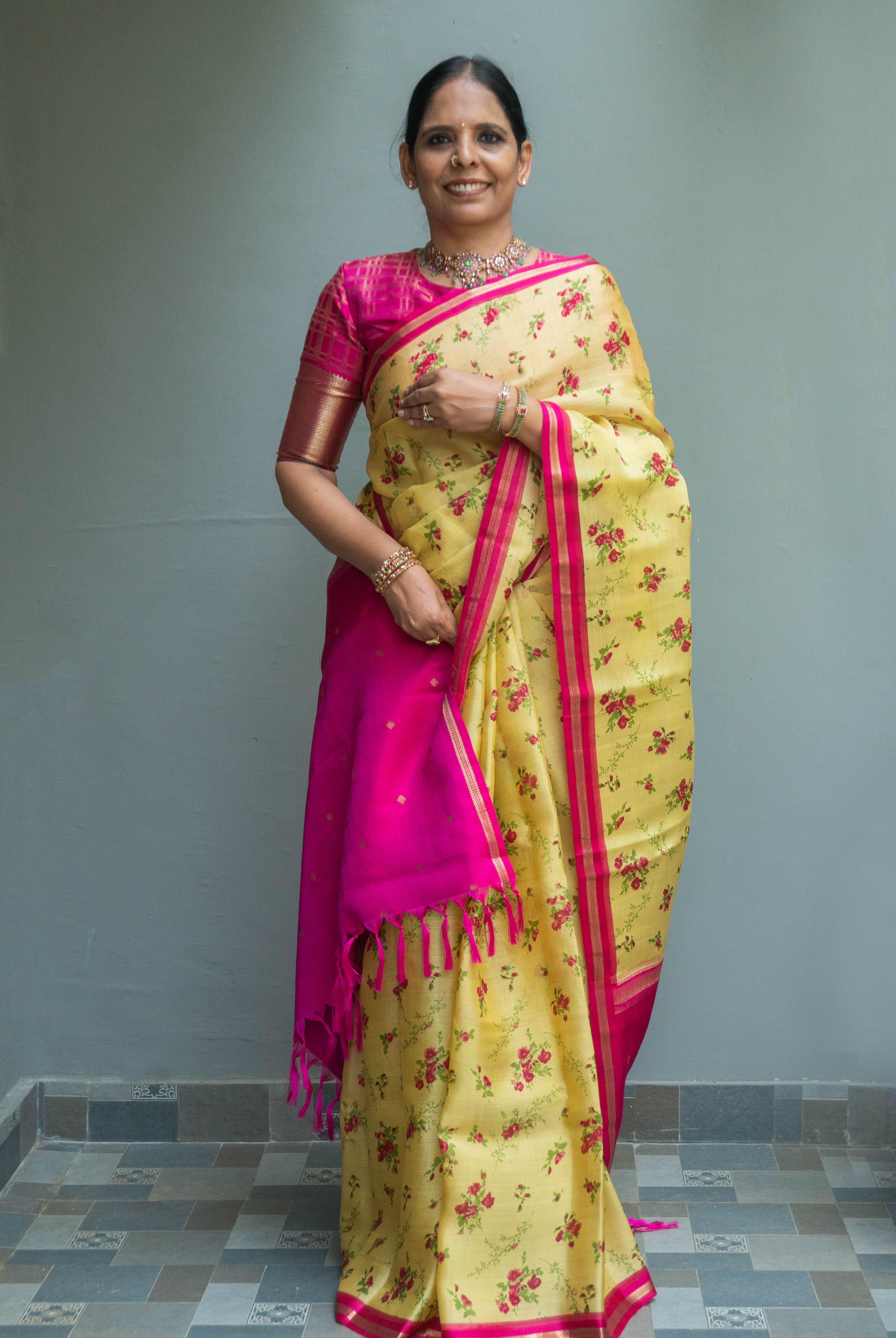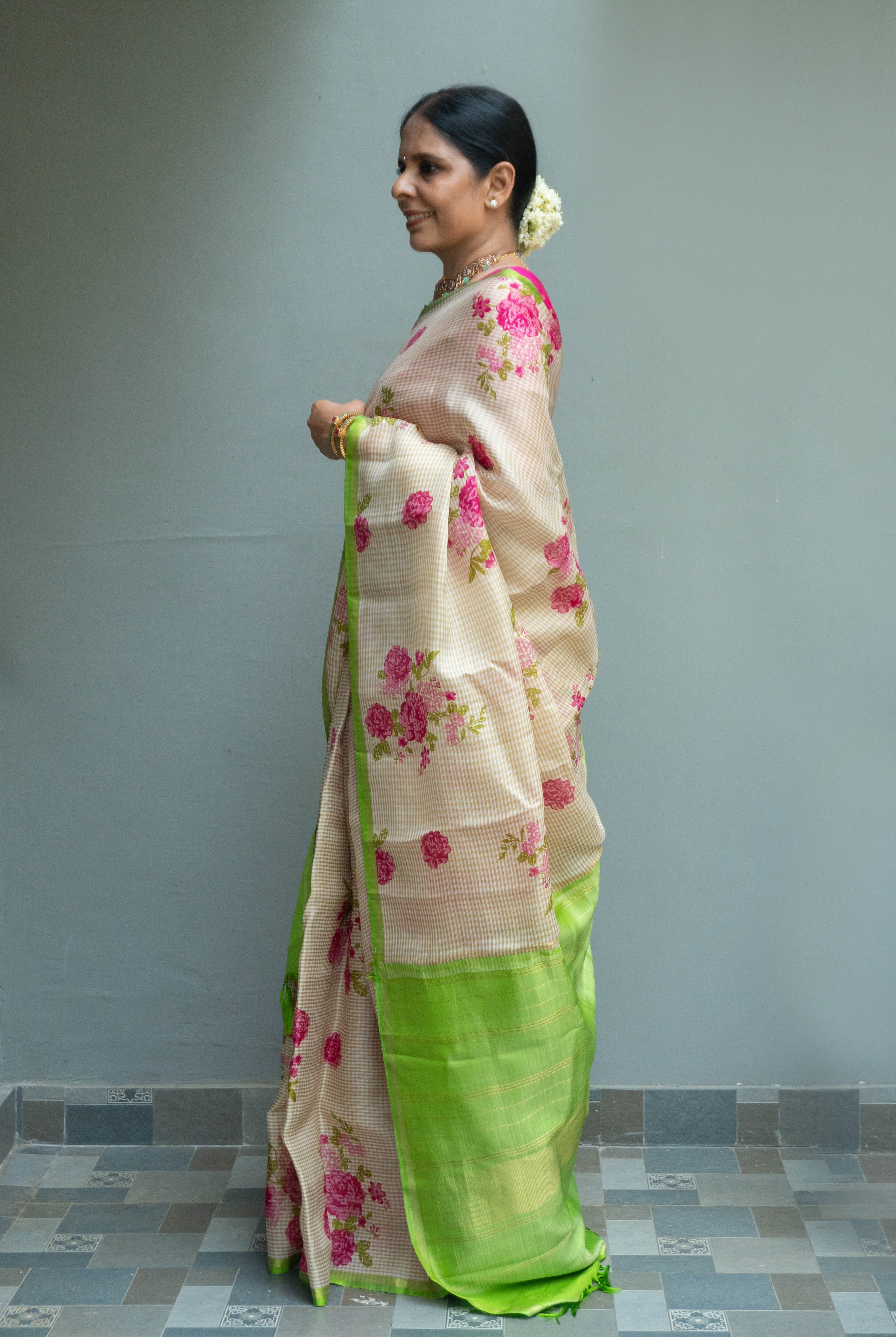 Cream Tussar silk saree, beautifully adorned with delicate floral motifs across the body. The striking Rani pink tissue border adds a regal charm, enhancing the saree with a touch of shimmer and elegance.