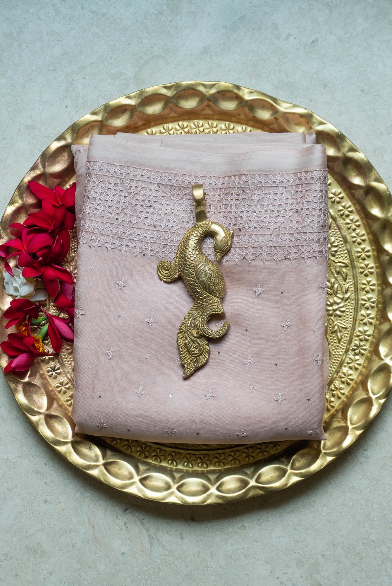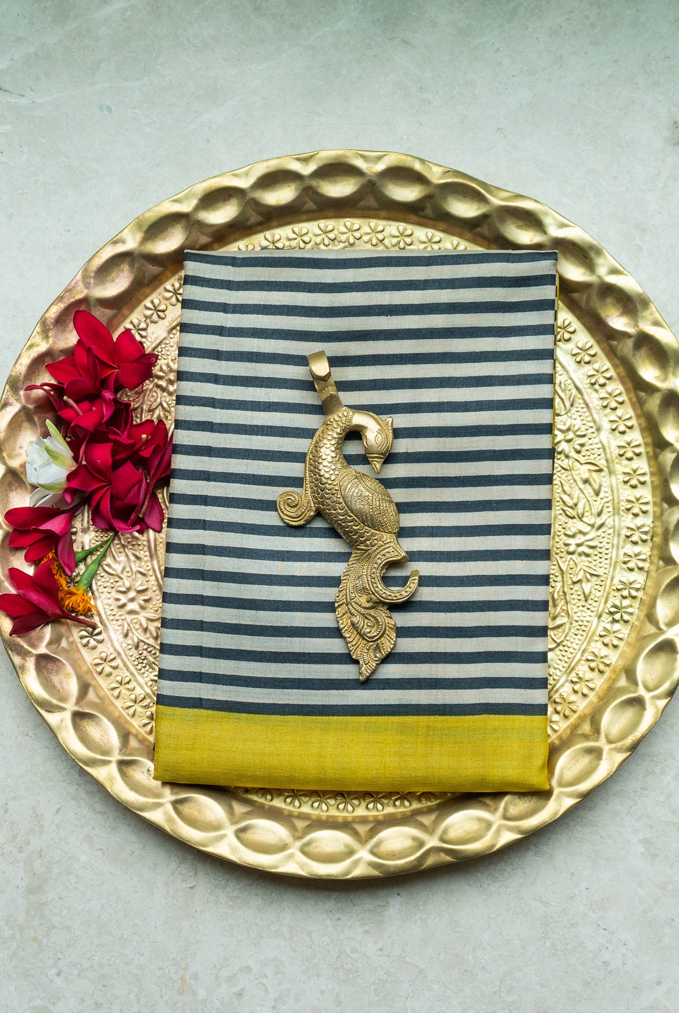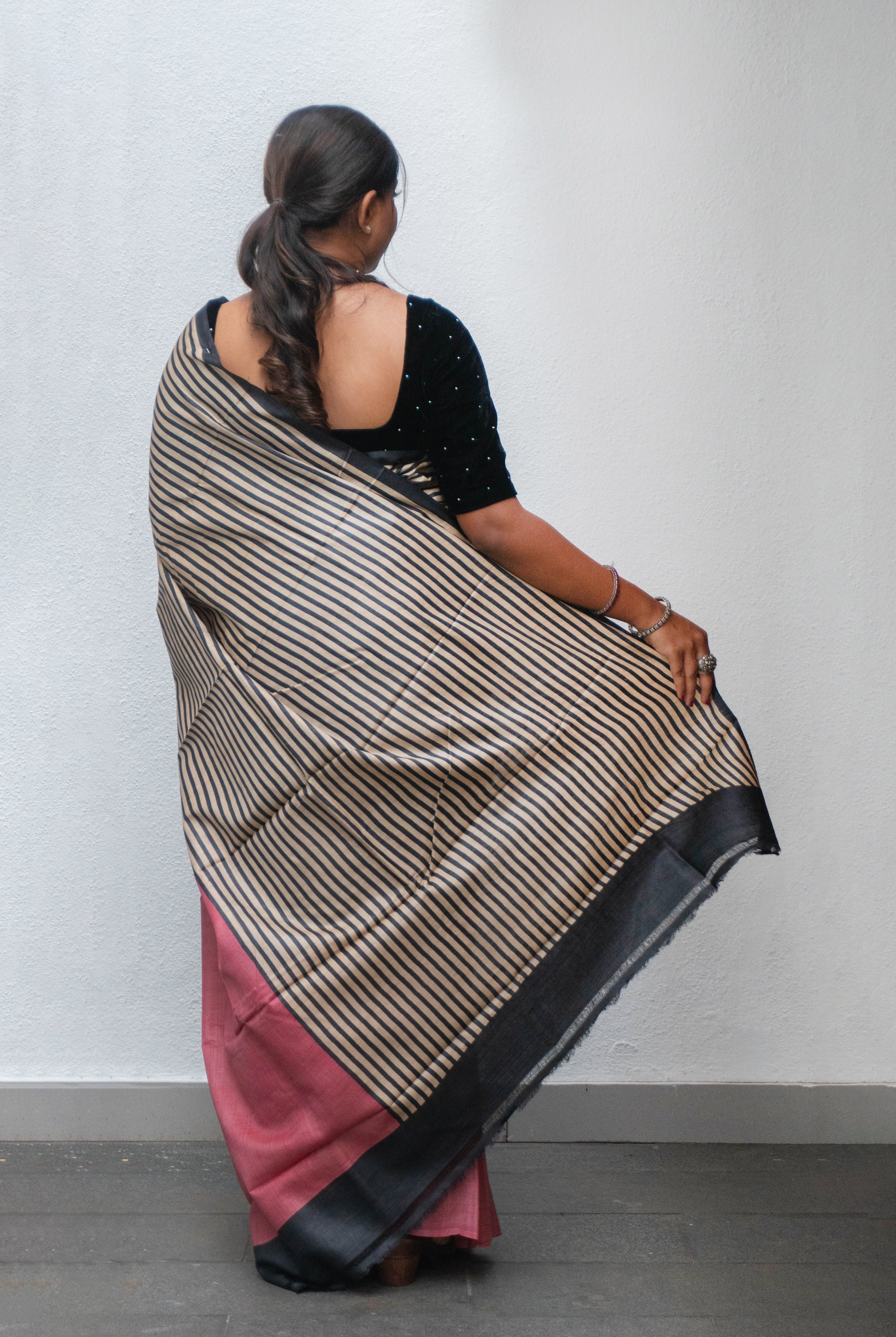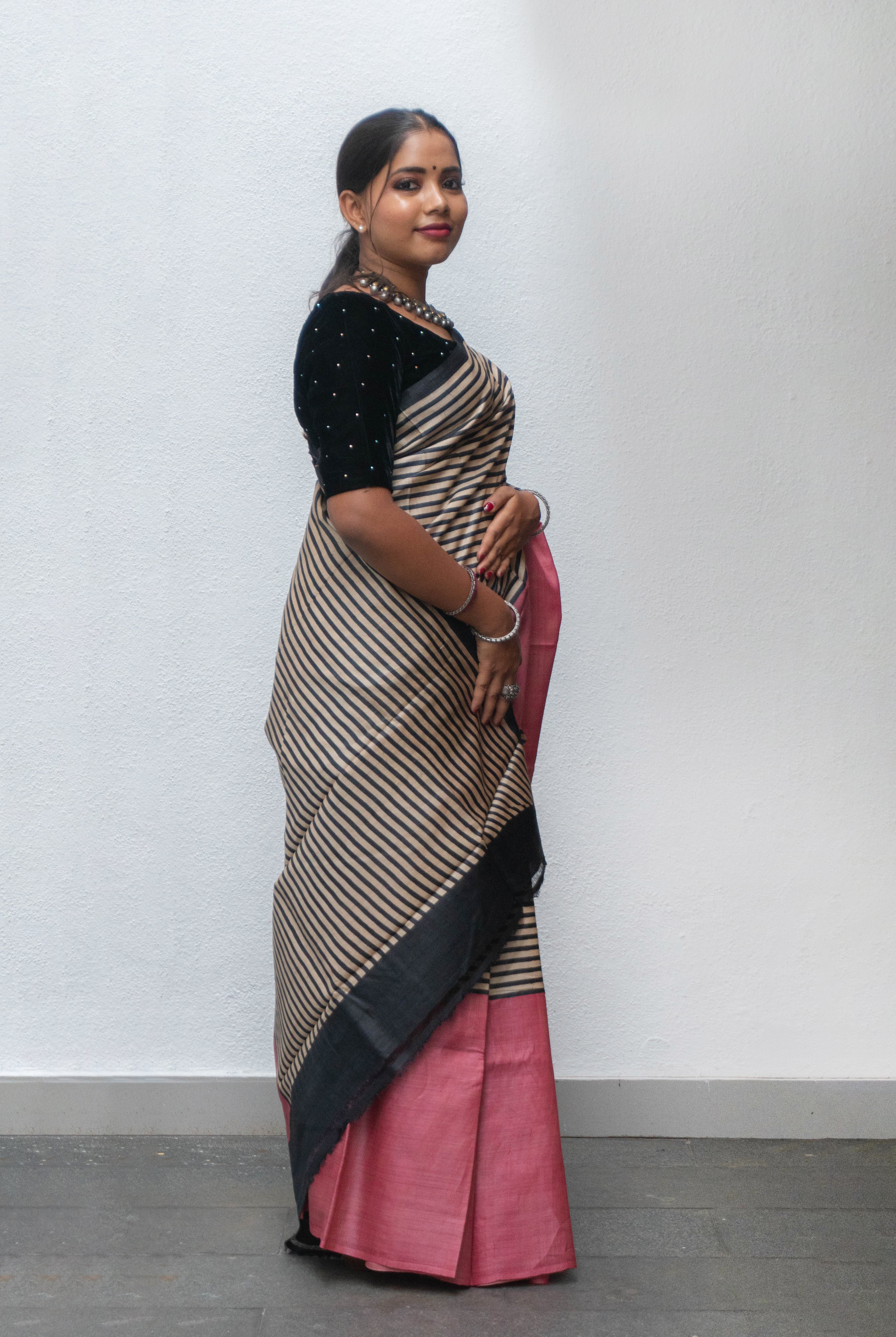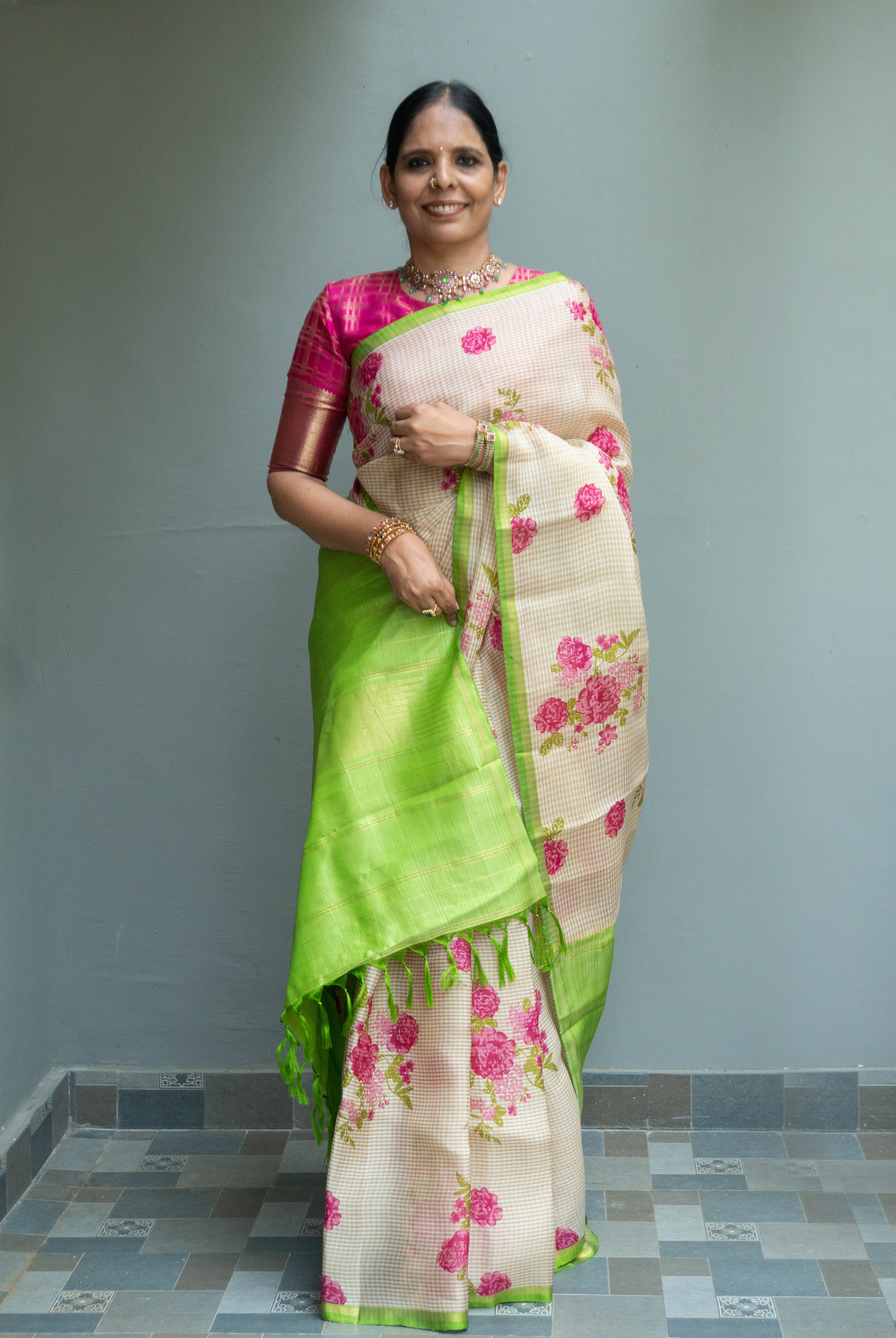 Cream Tussar silk saree, beautifully adorned with delicate floral motifs across the body. The striking Rani pink tissue border adds a regal charm, enhancing the saree with a touch of shimmer and elegance.