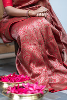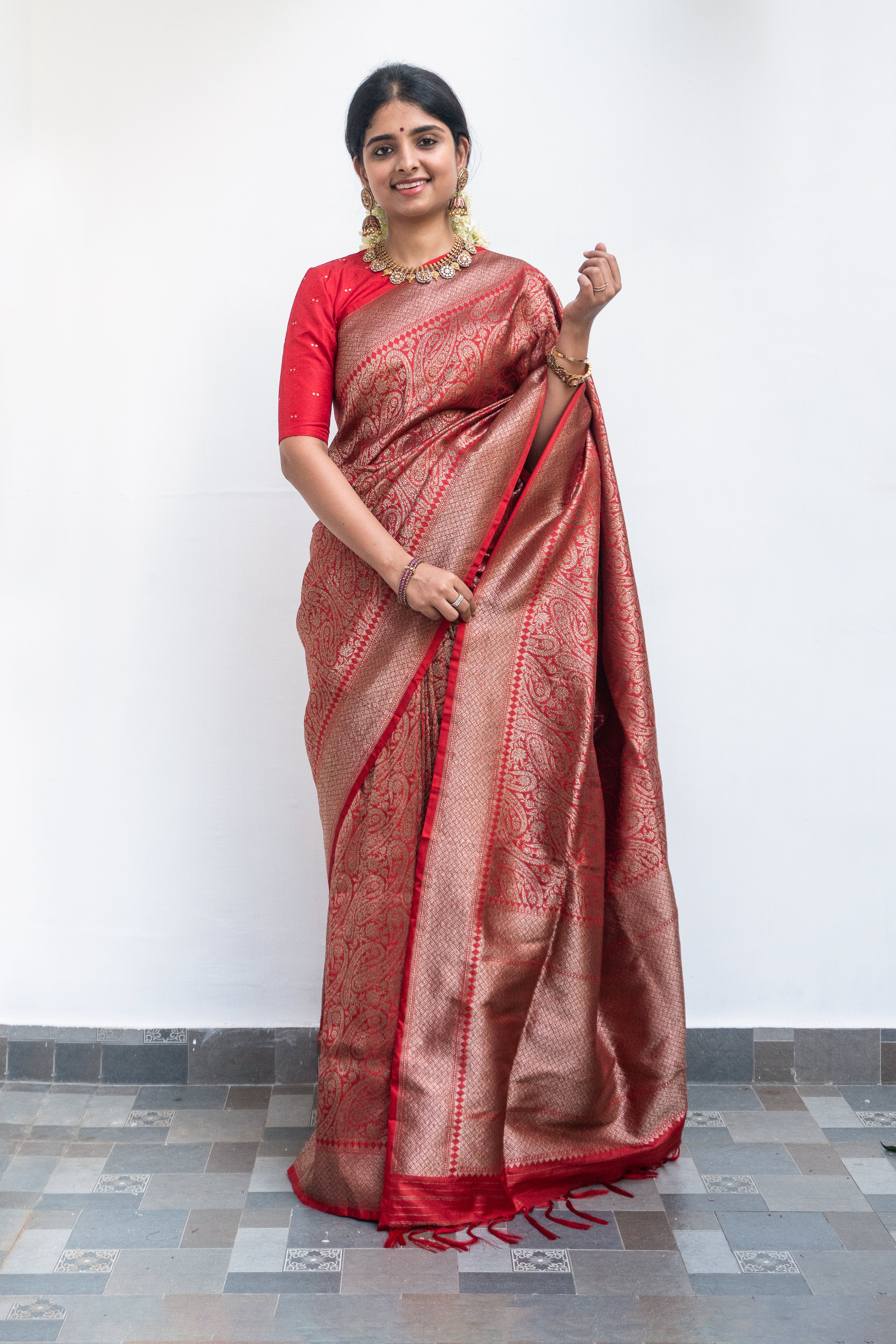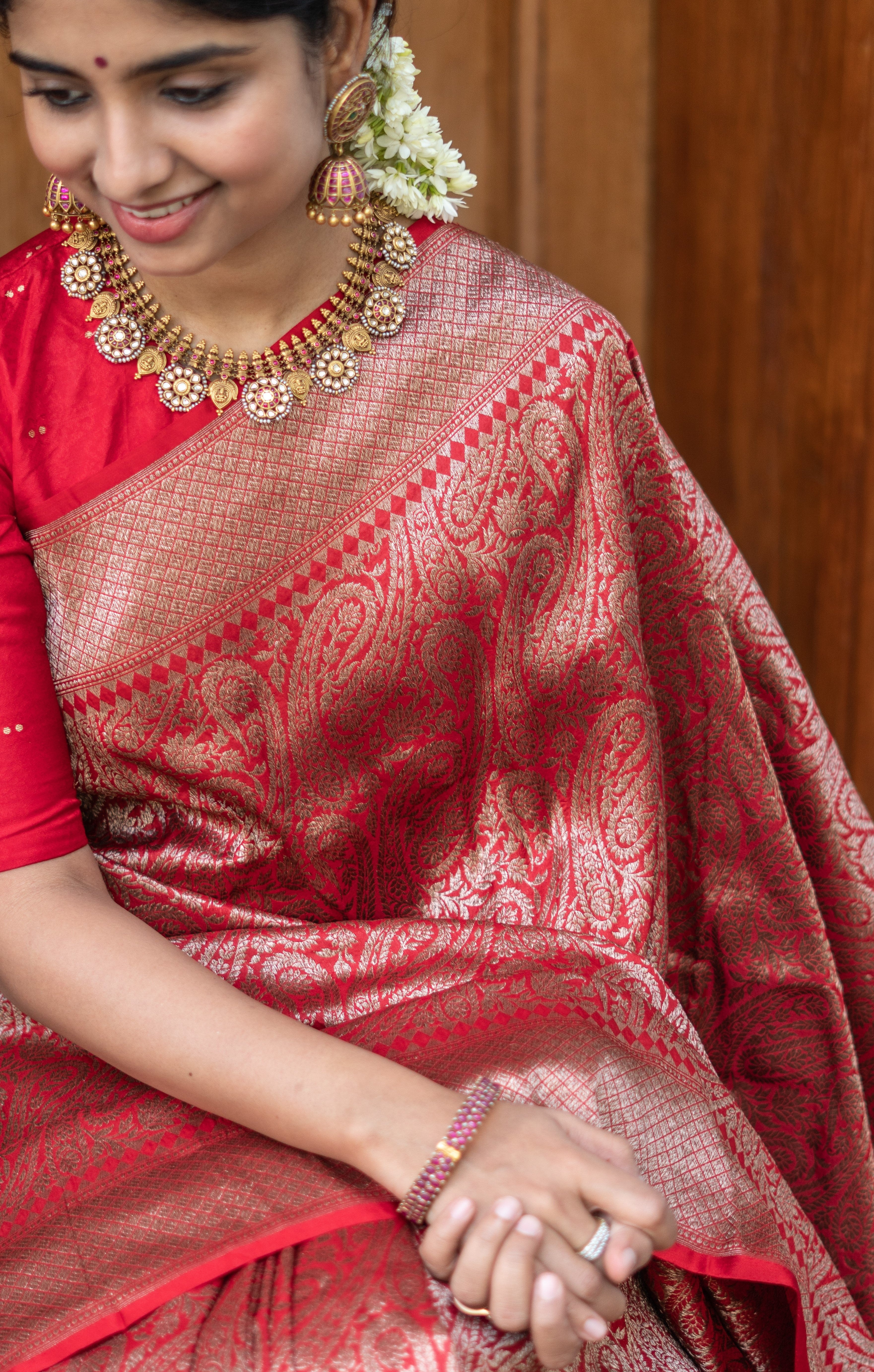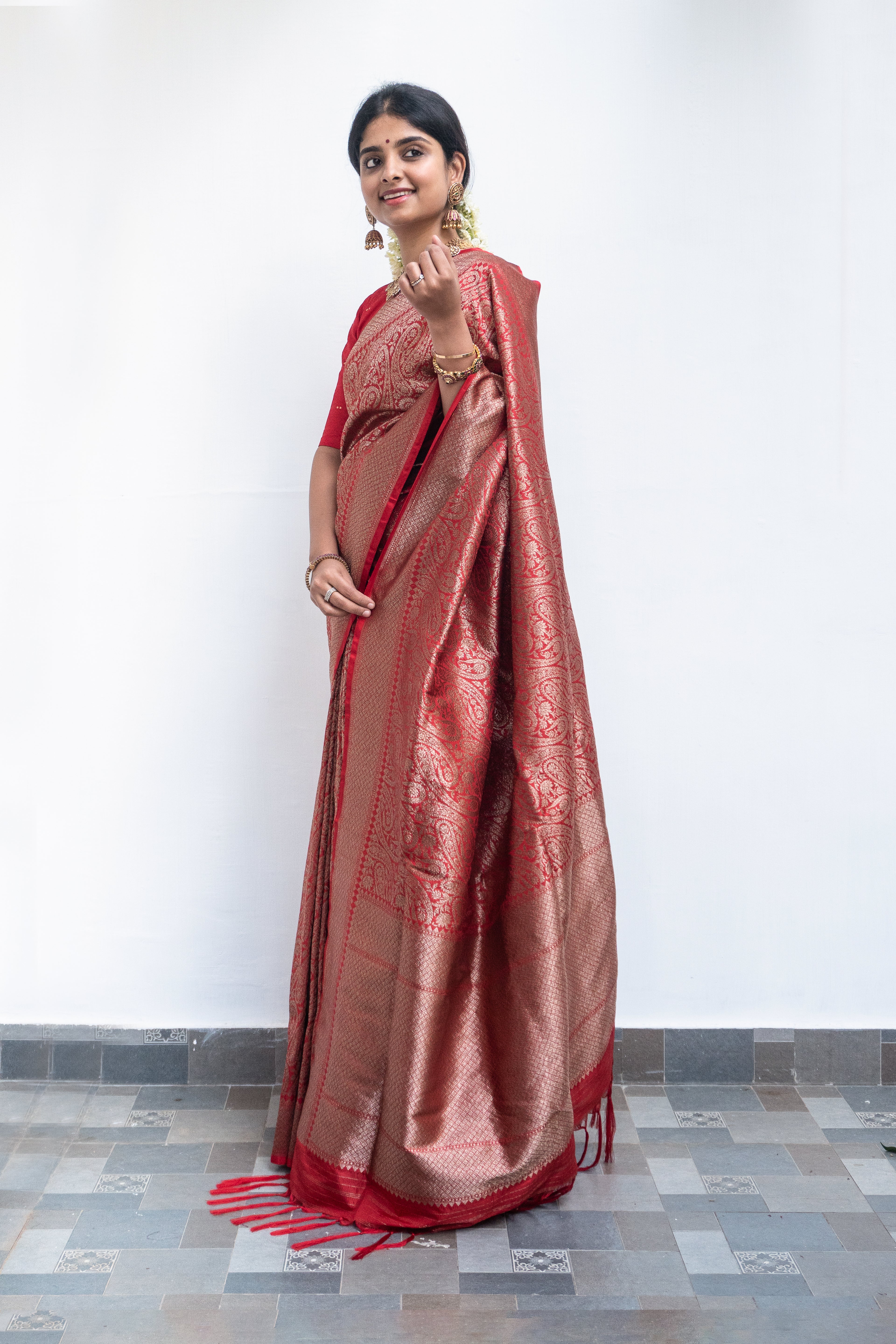 Step into timeless elegance with this stunning crimson red Banarasi silk saree, meticulously woven with intricate brocade in pure gold zari.