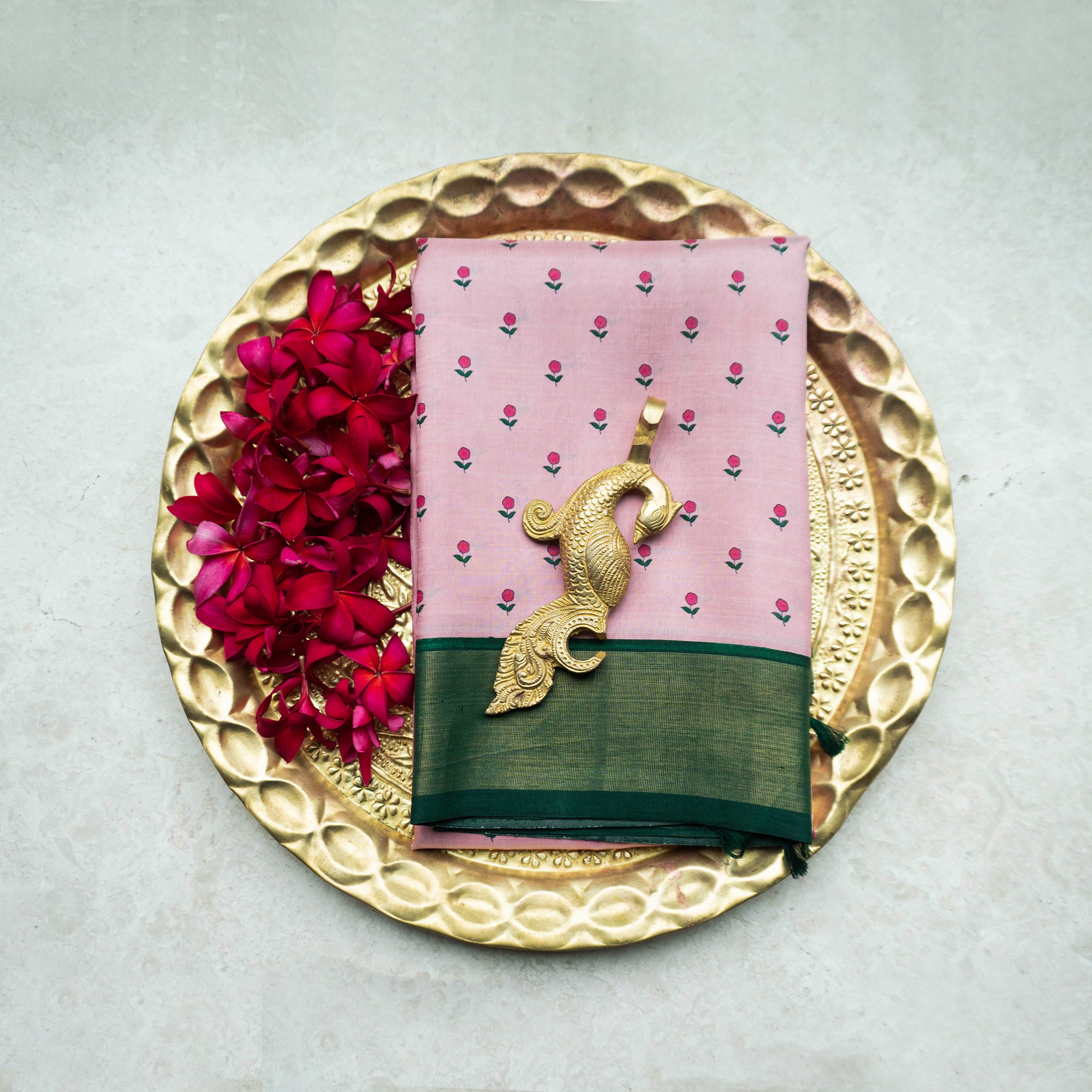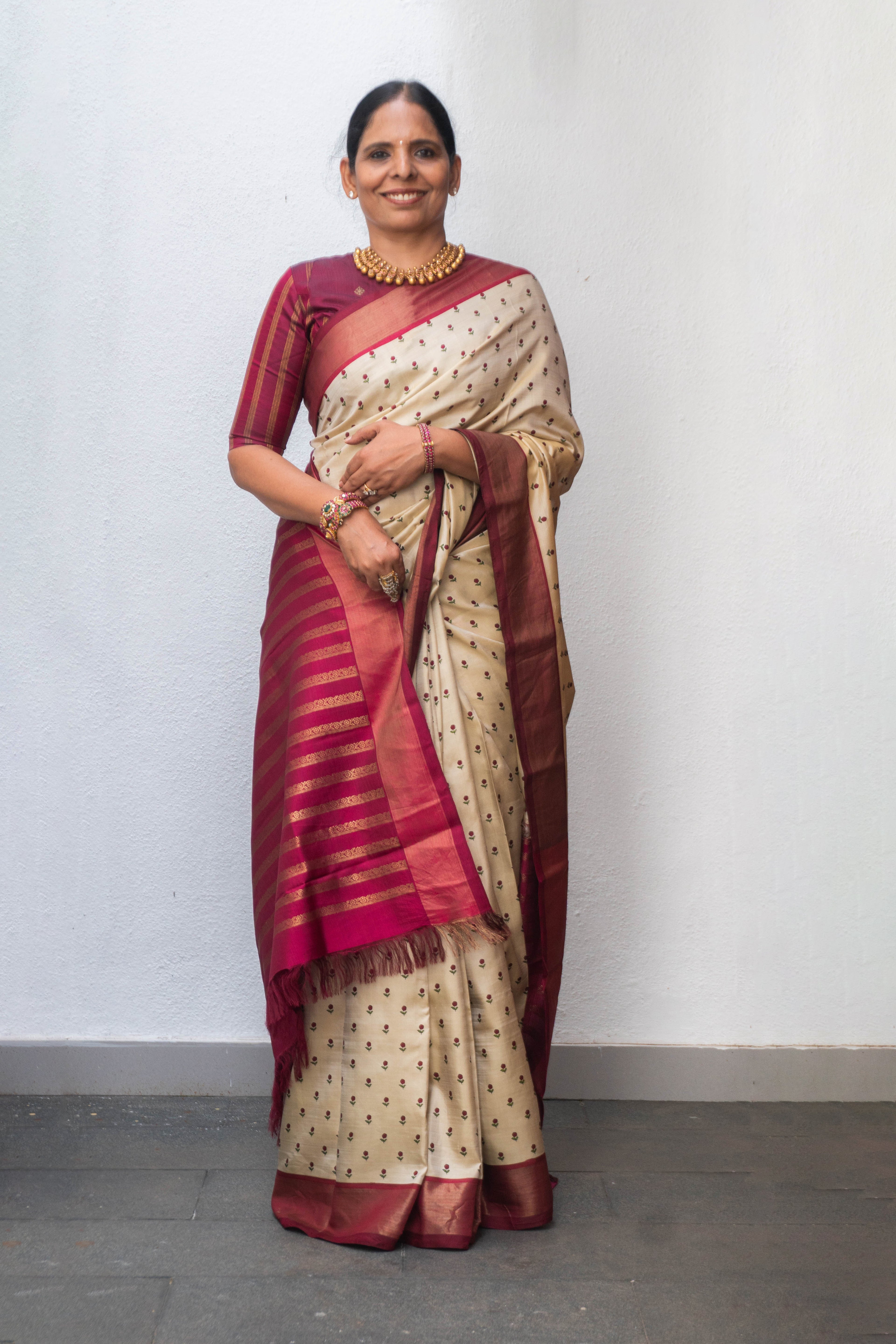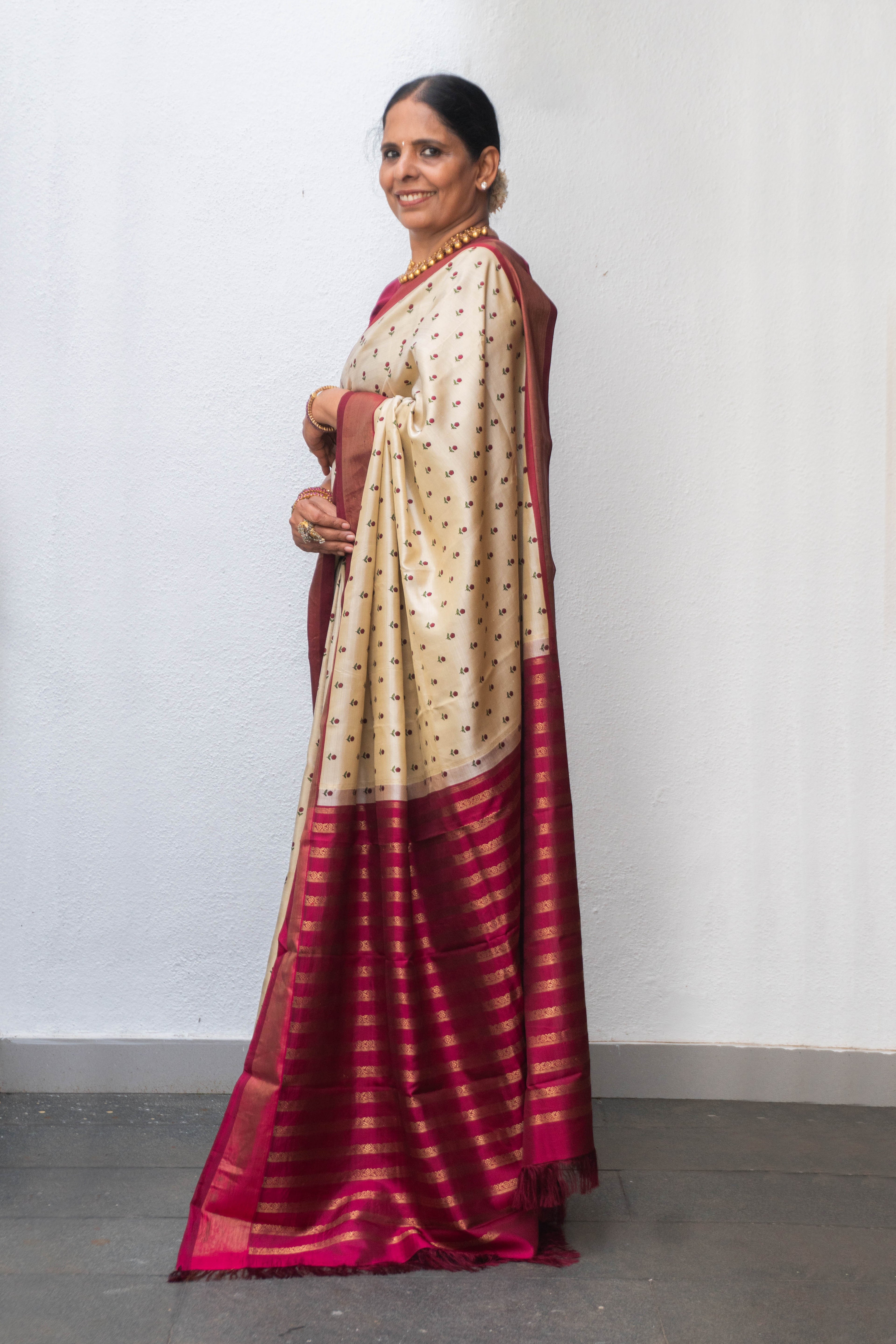 Cream Kanjivaram silk saree adorned with our signature hand block print in the body, which flows into a wine tissue border. The pallu and blouse mirror the colour of the border with vertical lines of golden zari.
