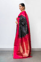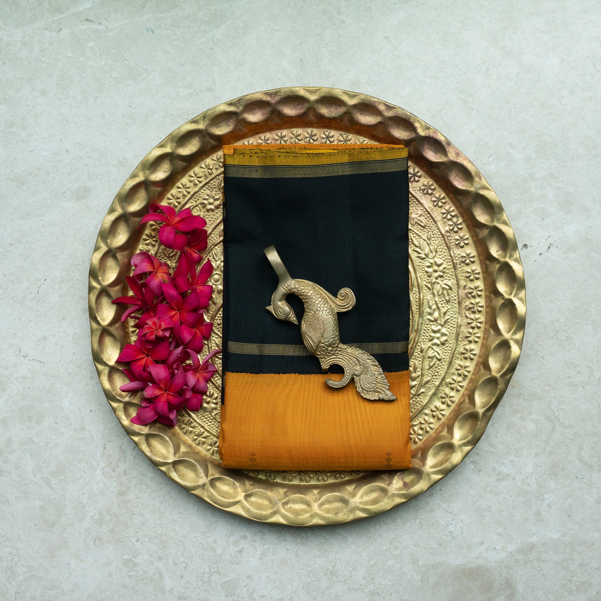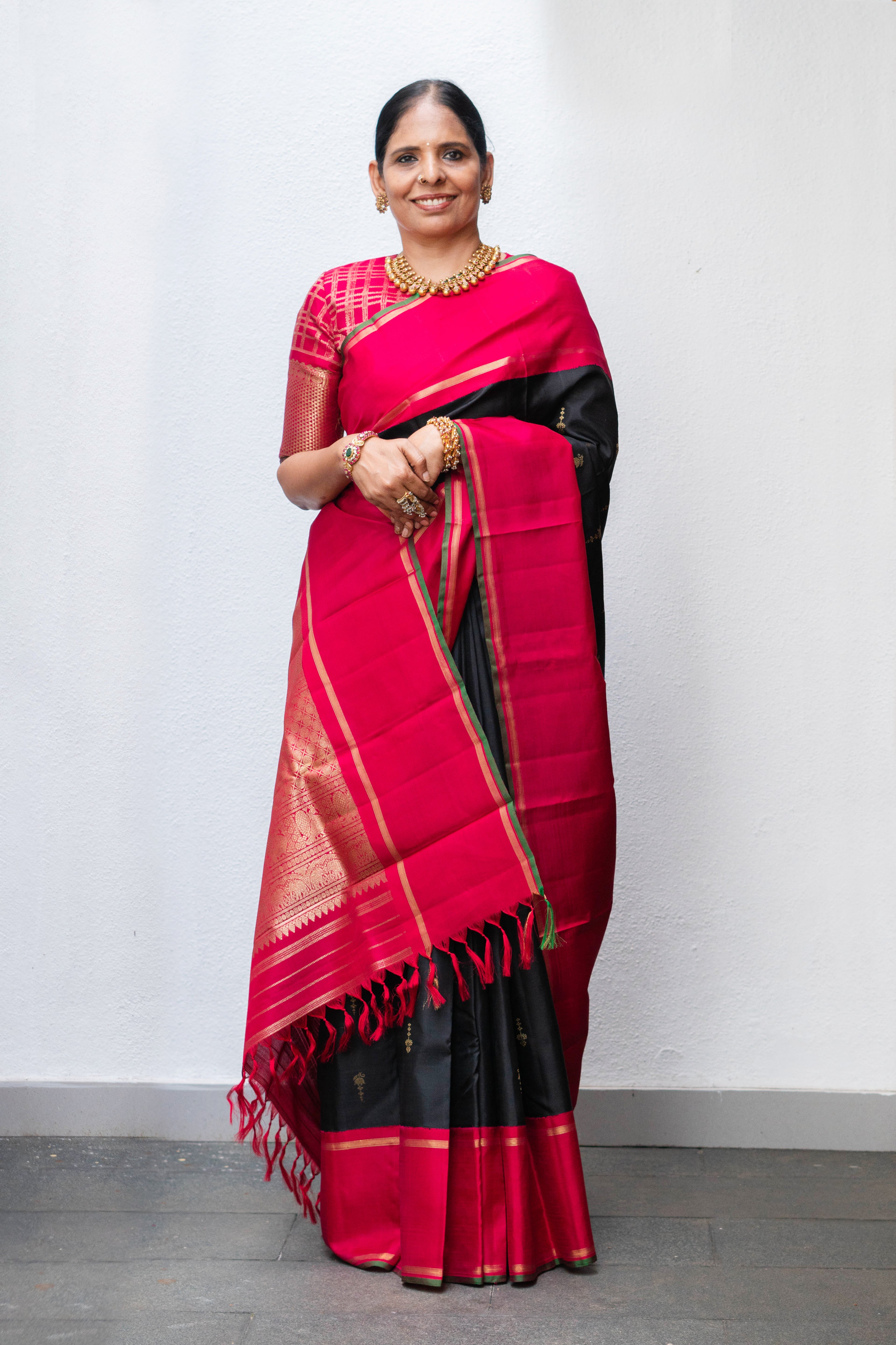 Black Kanjivaram silk saree with butti inspired by lamp design in the body. The saree is contrasted by a korvai arakku red border with bands of golden zari on either sides. The saree has a green selvedge.