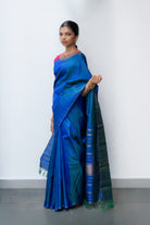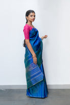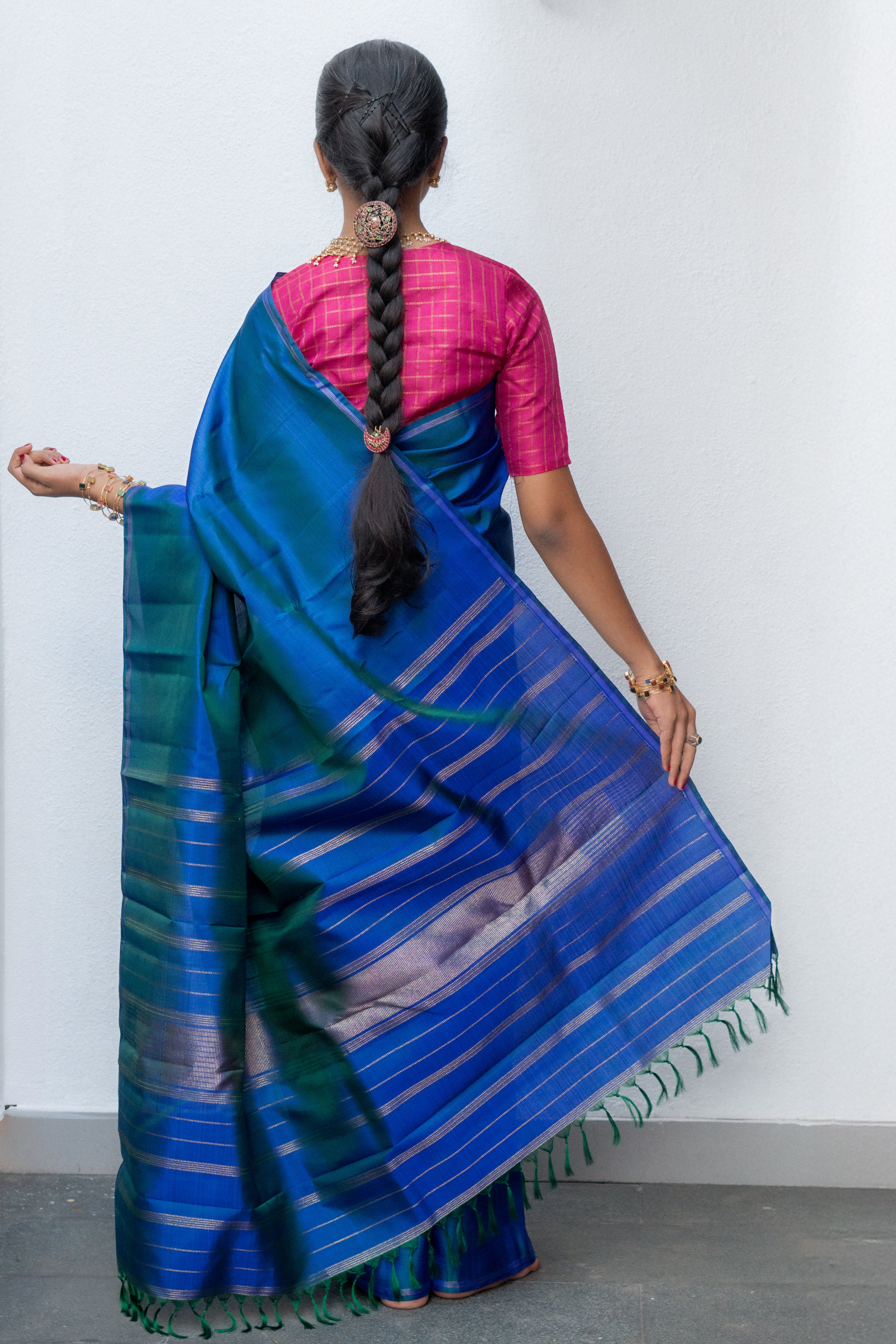 Vibrant Peacock Blue Kanjivaram silk saree featuring traditional "seeprekuu" bands of gold zari in the pallu and delicate thin zari border.