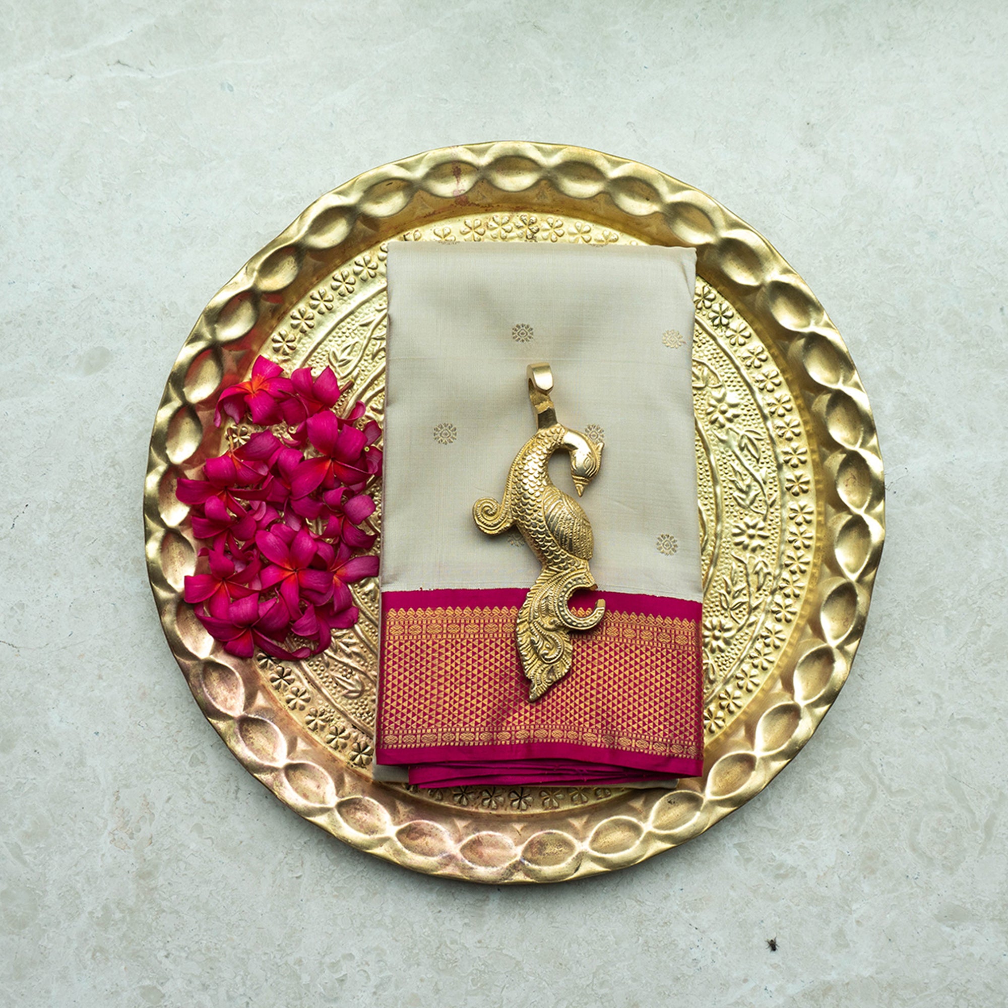 The pallu mirrors the colour of the border with sides of “yali” motifs and the center having “mayil-chakram” motifs.