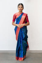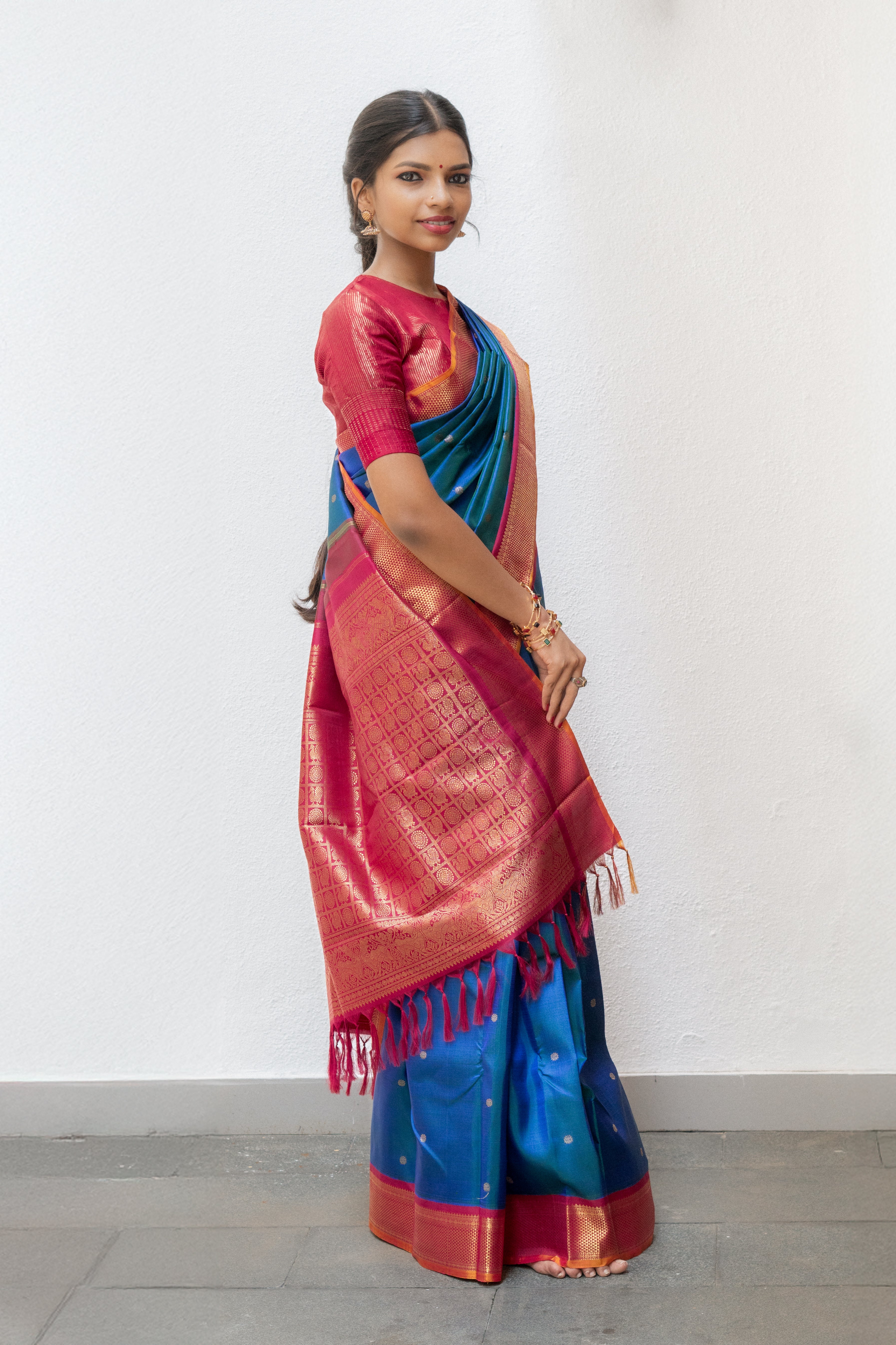 A beautiful Peacock Blue Kanjivaram silk saree with traditional buttis in the body. The saree is complemented by an “arakku” korvai border with diamond and geometric patterns in gold zari and mustard selvedge.
