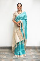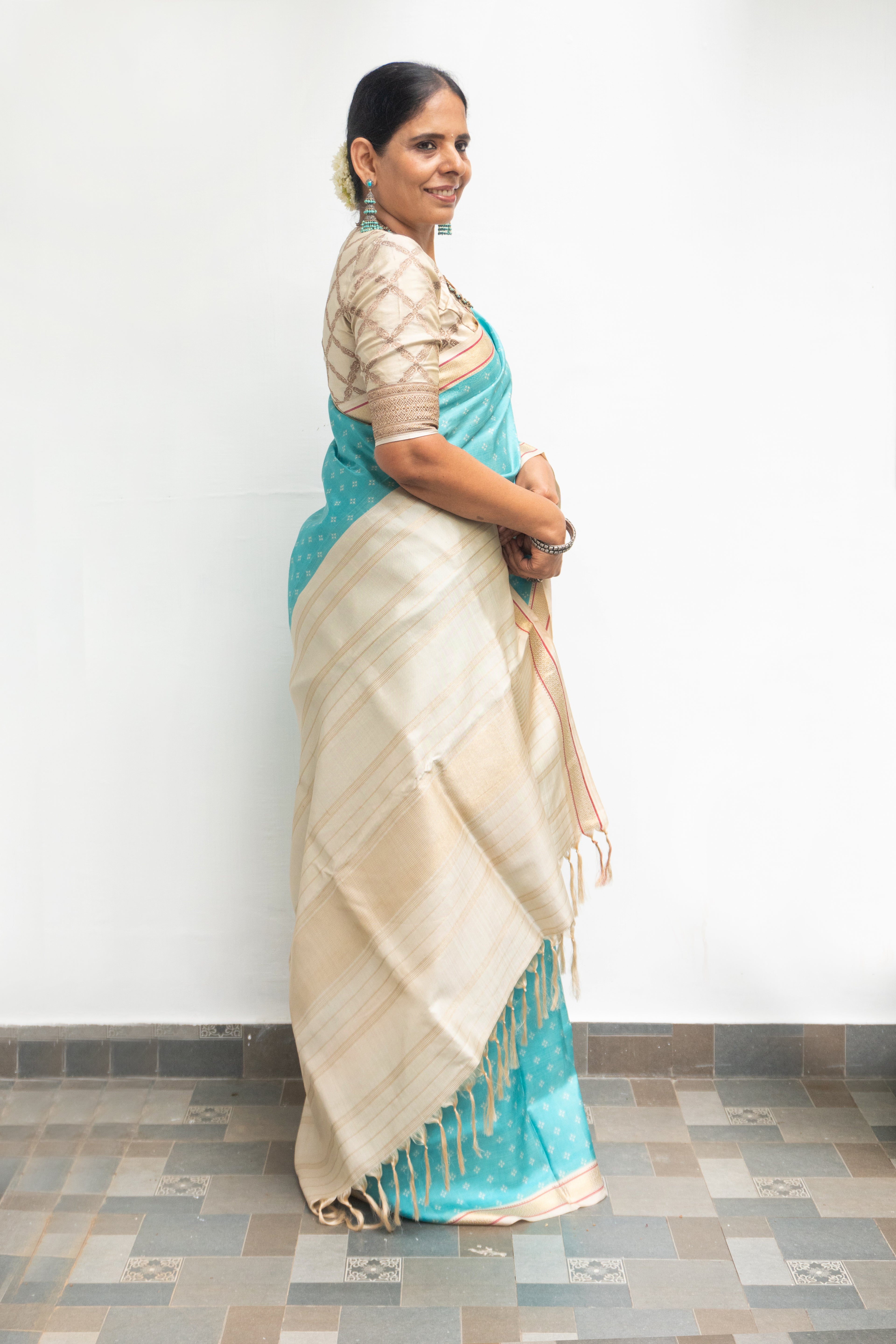 Elegant Kanjivaram silk saree in soft tone, adorned with hand block prints and finished with a rich zari border. The soft, flowing silk drapes beautifully, making it perfect for festive occasions, weddings, and evening wear. A blend of tradition and subtle luxury.