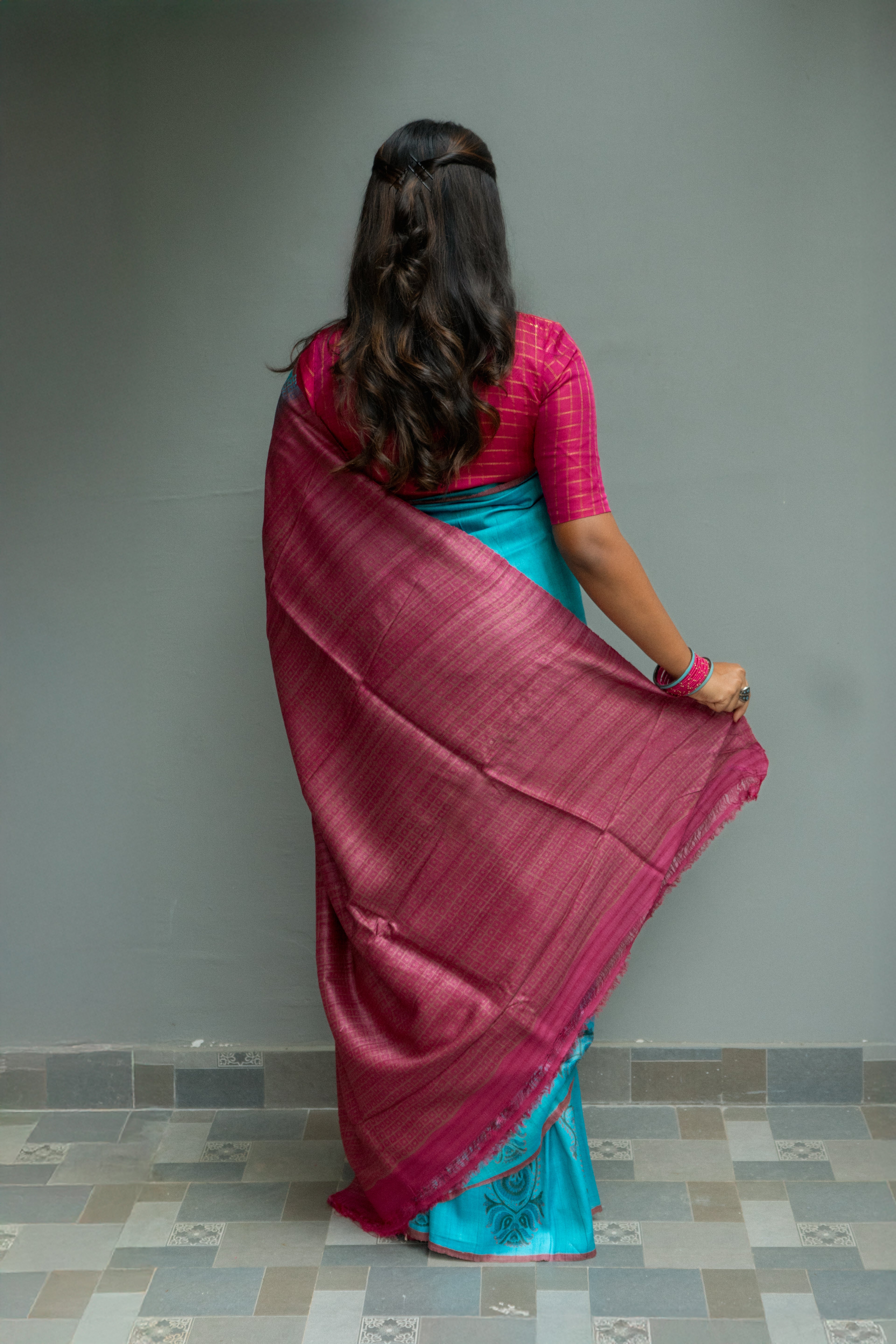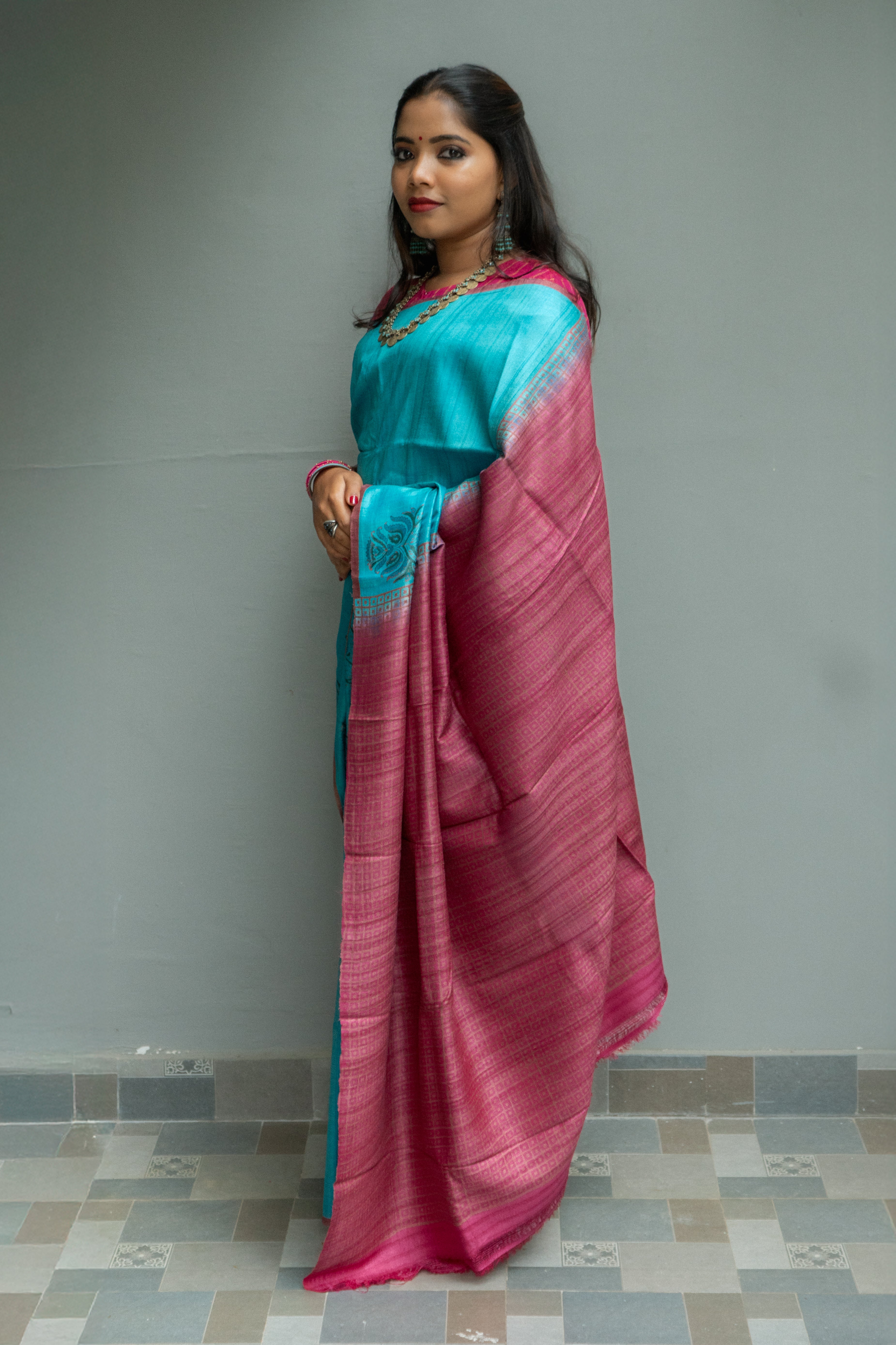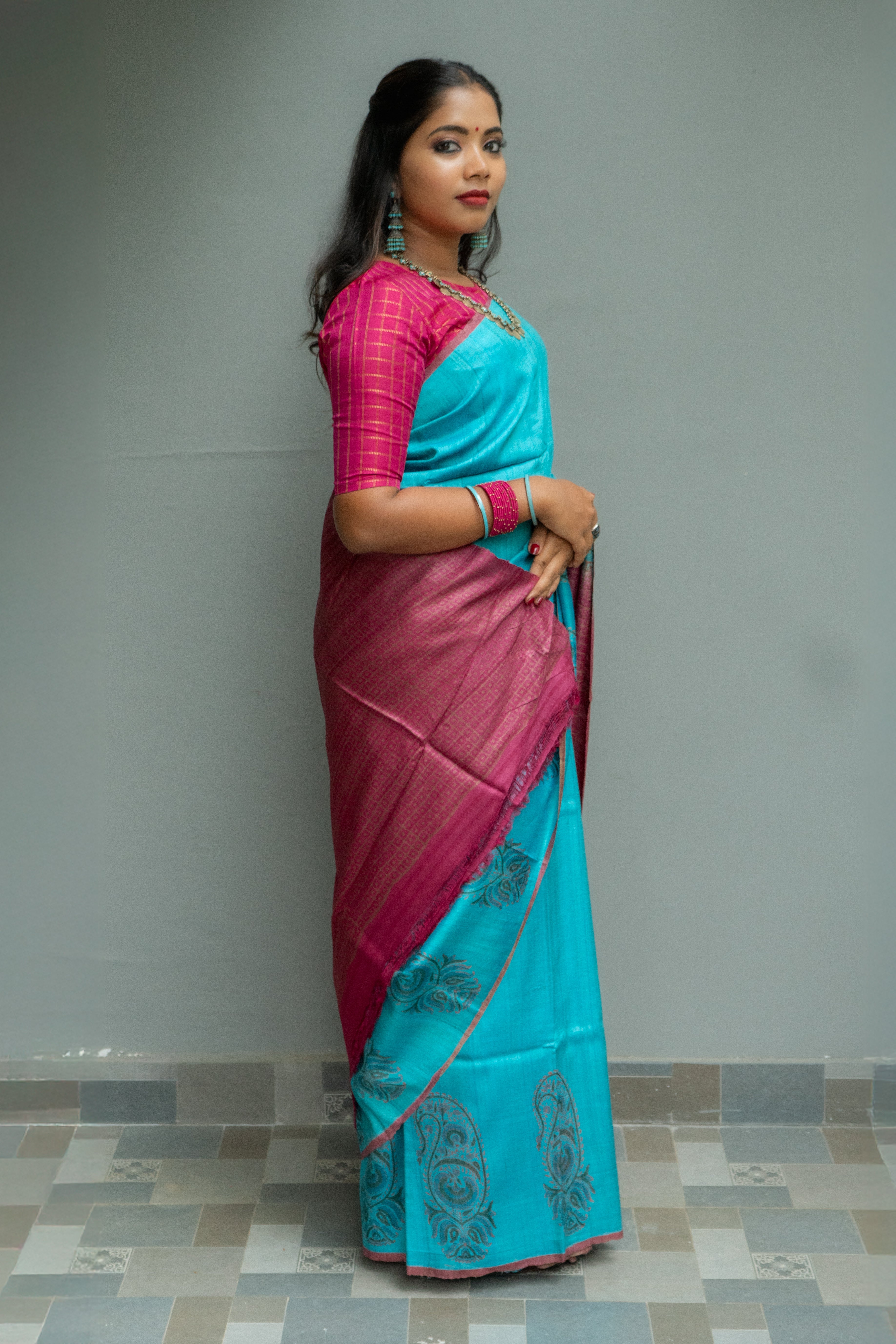 Peacock Blue soft Tussar silk saree with "Paisley" hand block printed motifs as the border. The pallu and blouse of the saree are a striking contrast in Rani Pink, adorned with checks.