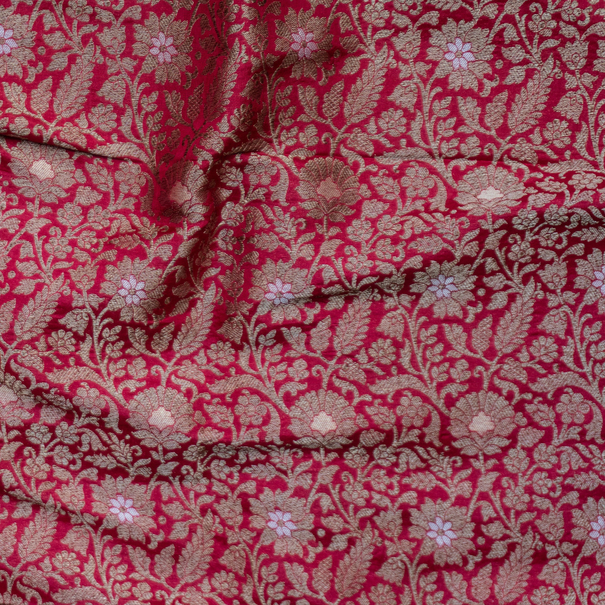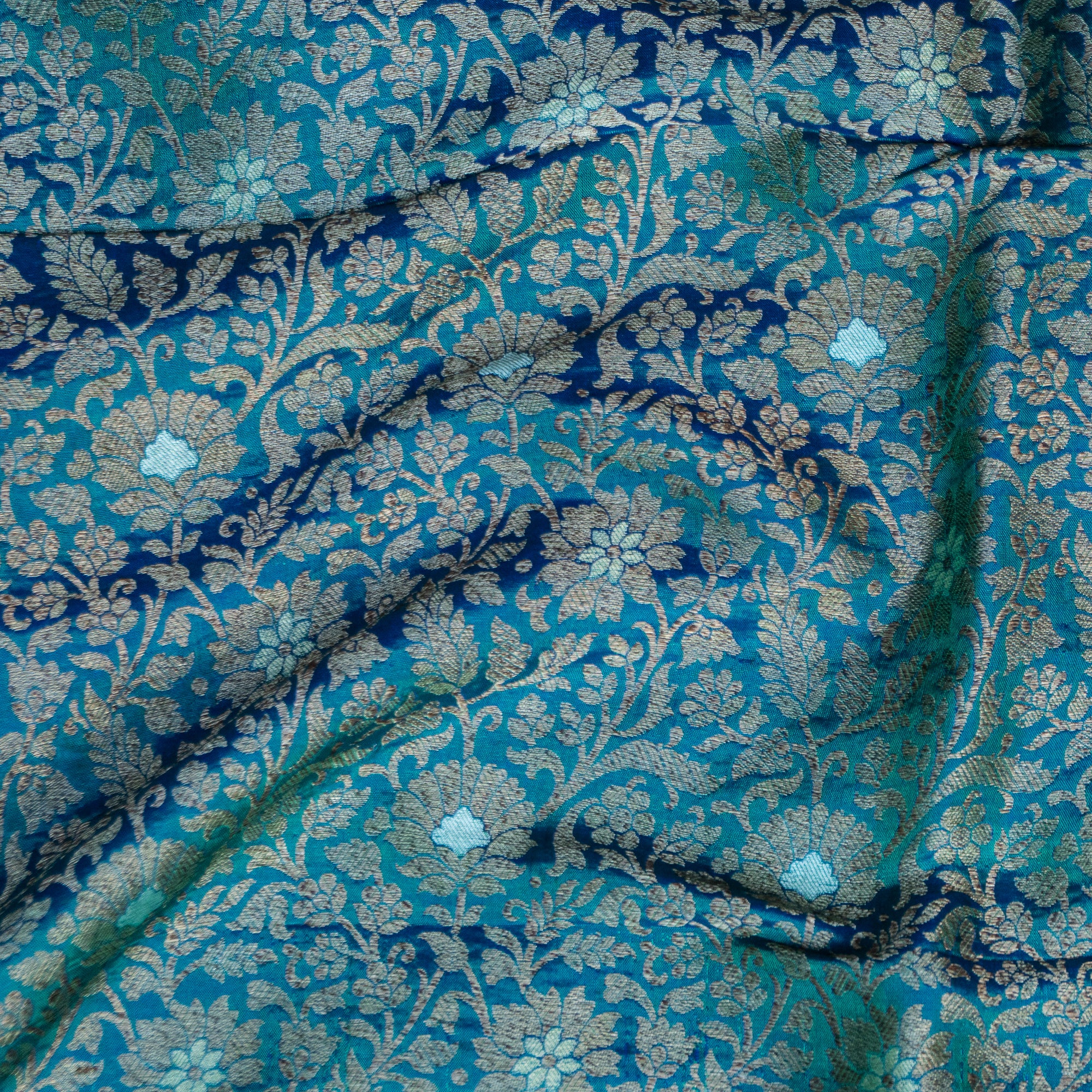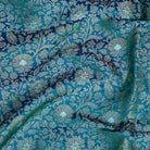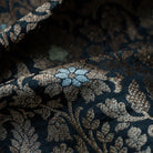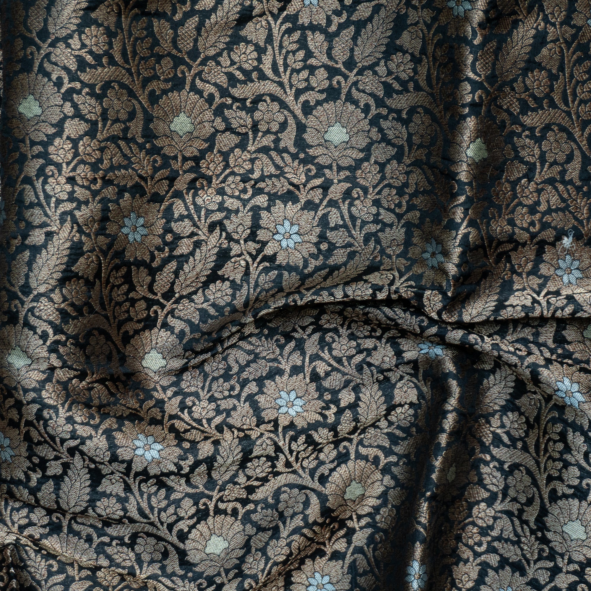 Deep black base is intricately woven with golden floral motifs. The floral patterns, which range from delicate blossoms to ornate vines, create a beautiful texture that catches the light, enhancing the fabric’s opulent appeal.