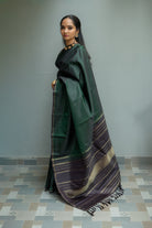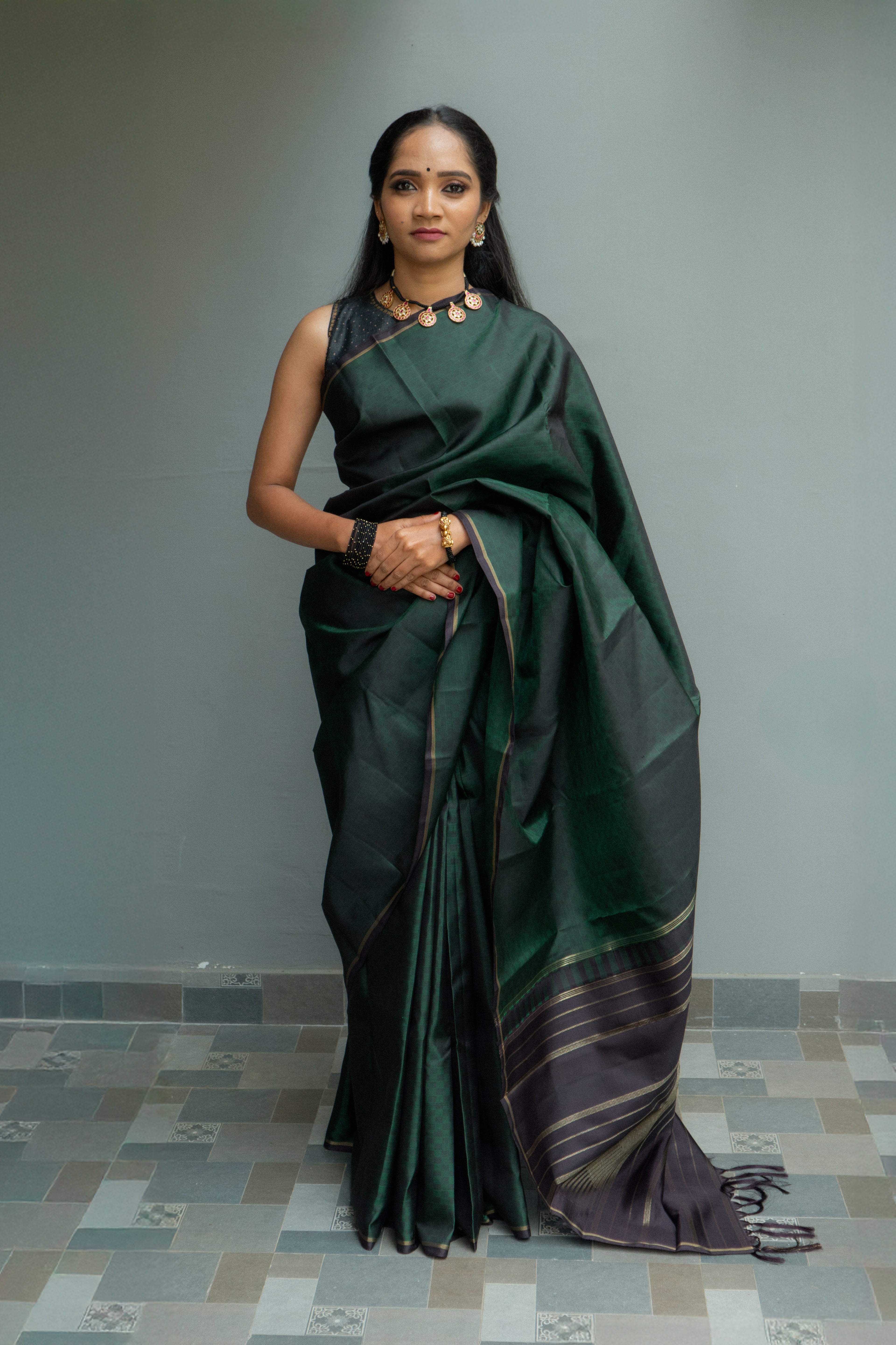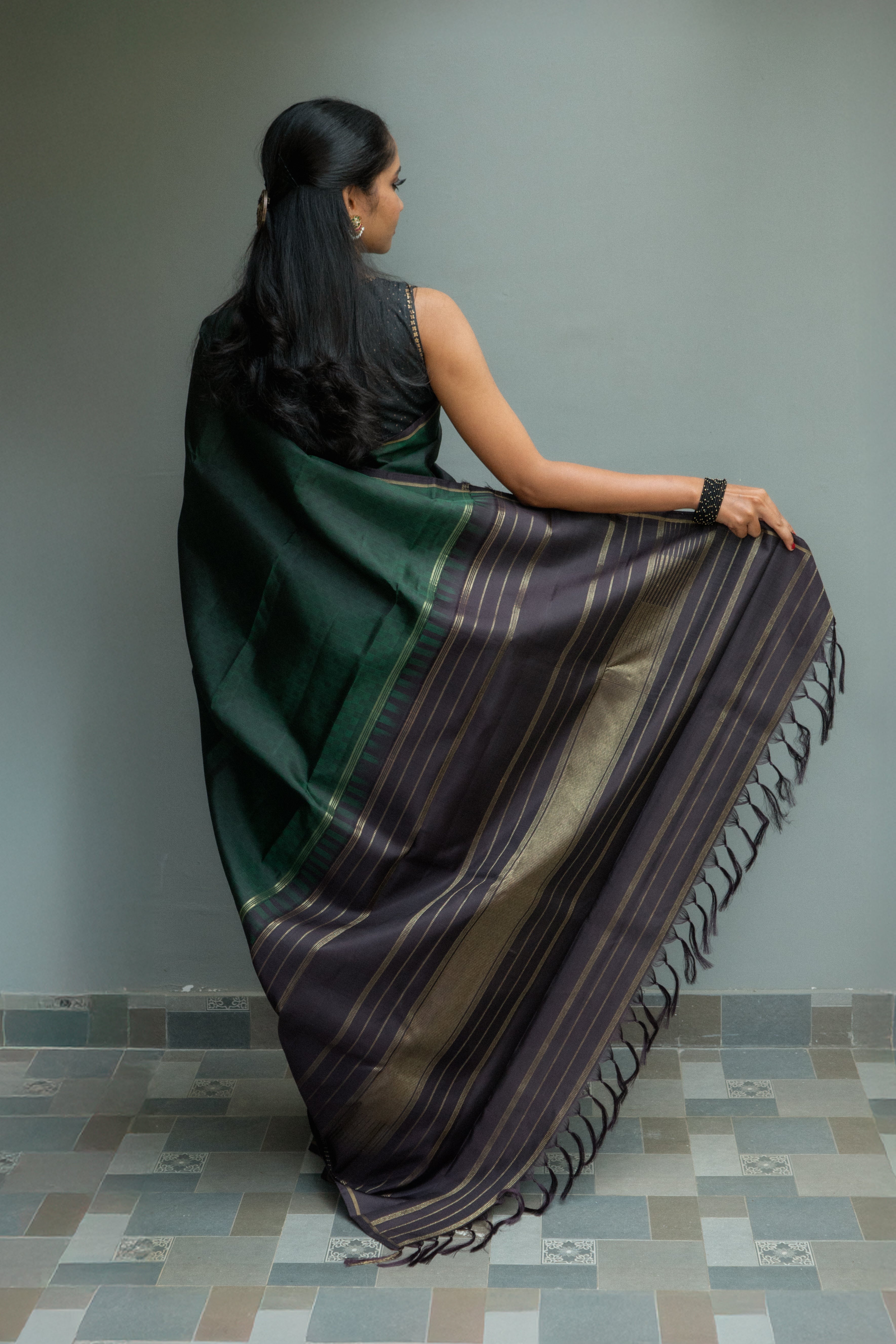 This classic Kanchivaram weave with mat checks in green and black flows into a black pallu featuring a traditional “Seeprekku” pallu with golden zari.