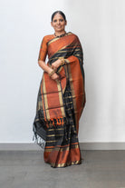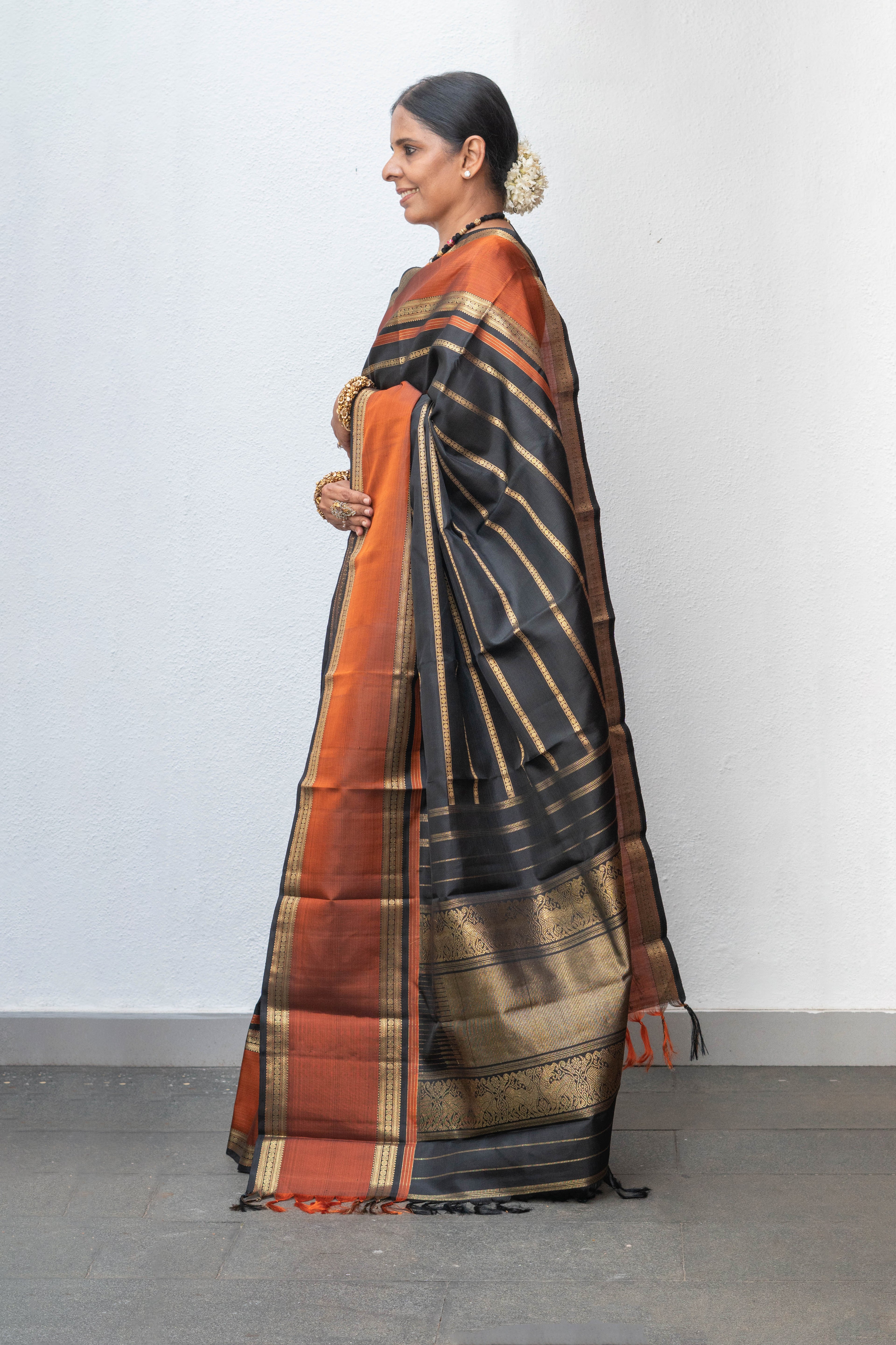 Black kanjivaram silk saree with traditional “veldhari” design in the body woven in pure gold zari.The body of the saree is contrasted by a rust border with geometric patterns on either sides. The pallu of the saree is beautiful with “Yazhi” motifs and bands of gold zari.