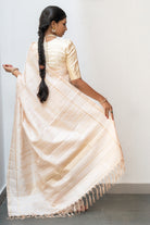 Cream Kanjivaram silk saree with traditional checks in the body. The borders have “rudraksham” and geometric patterns in gold. The pallu features a traditional “seeprekku” pallu.
