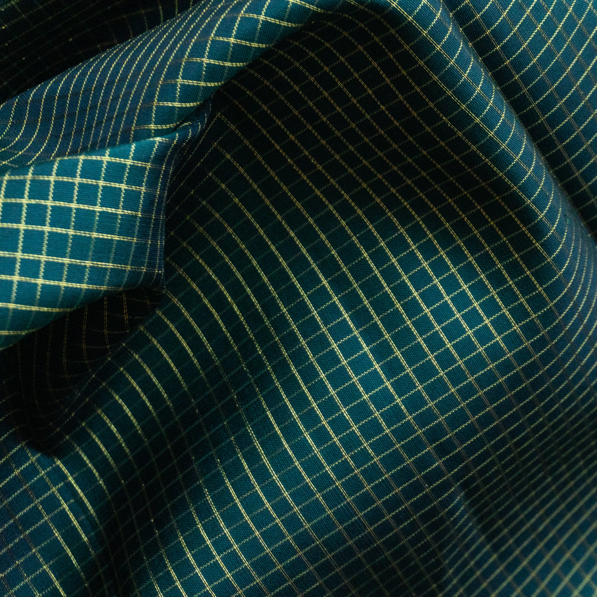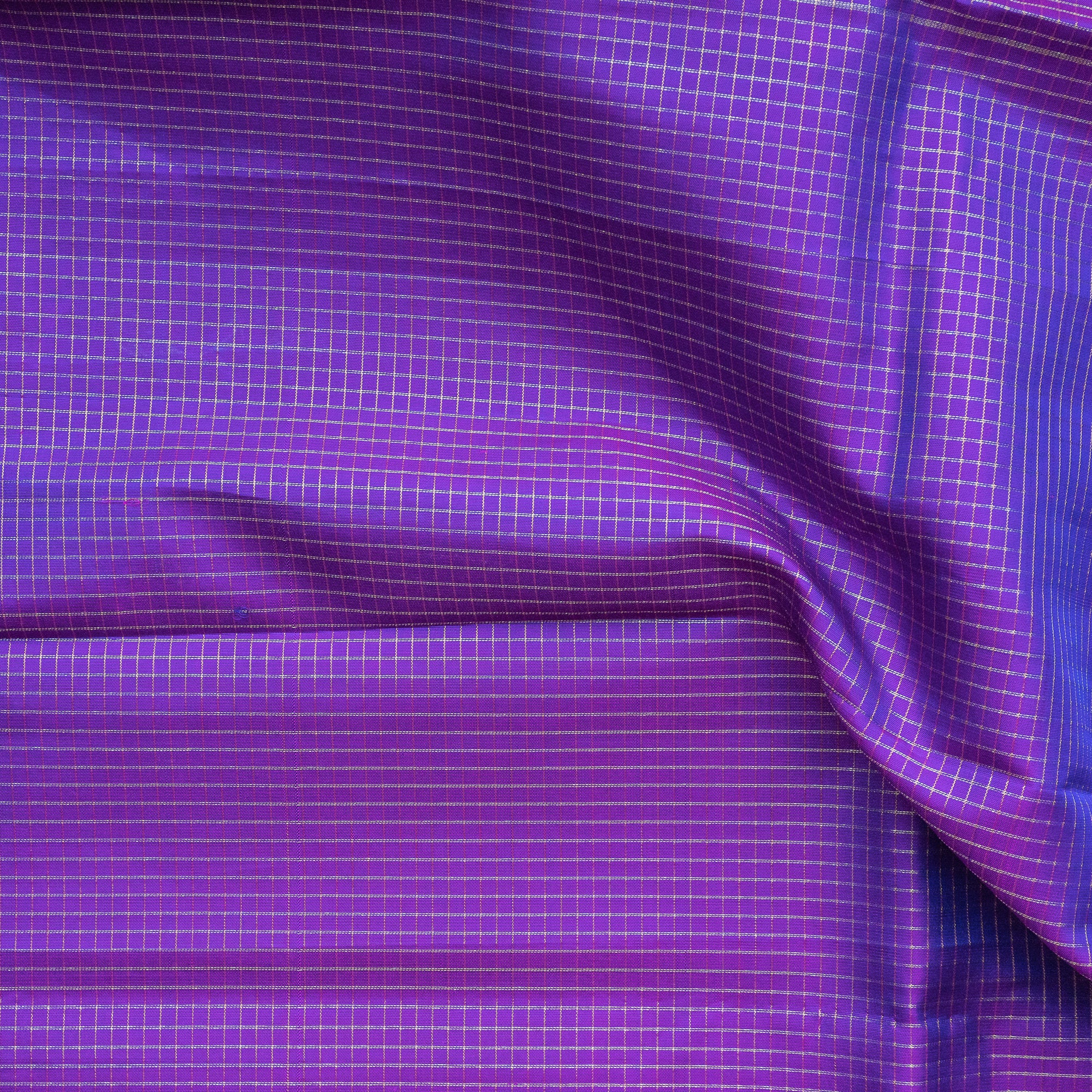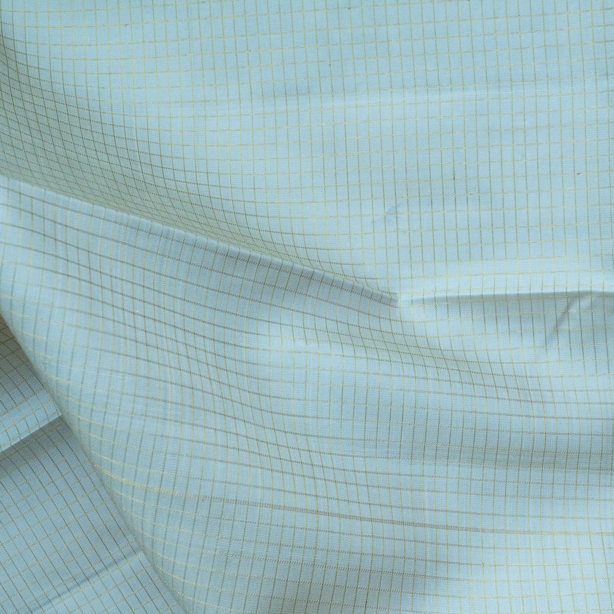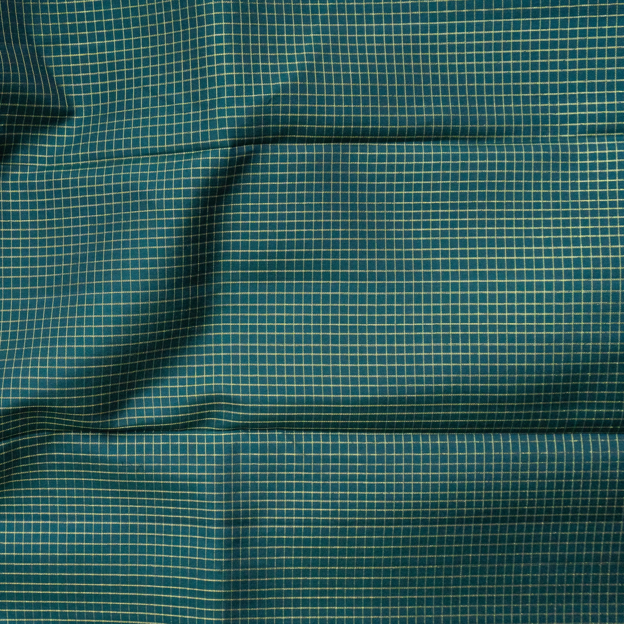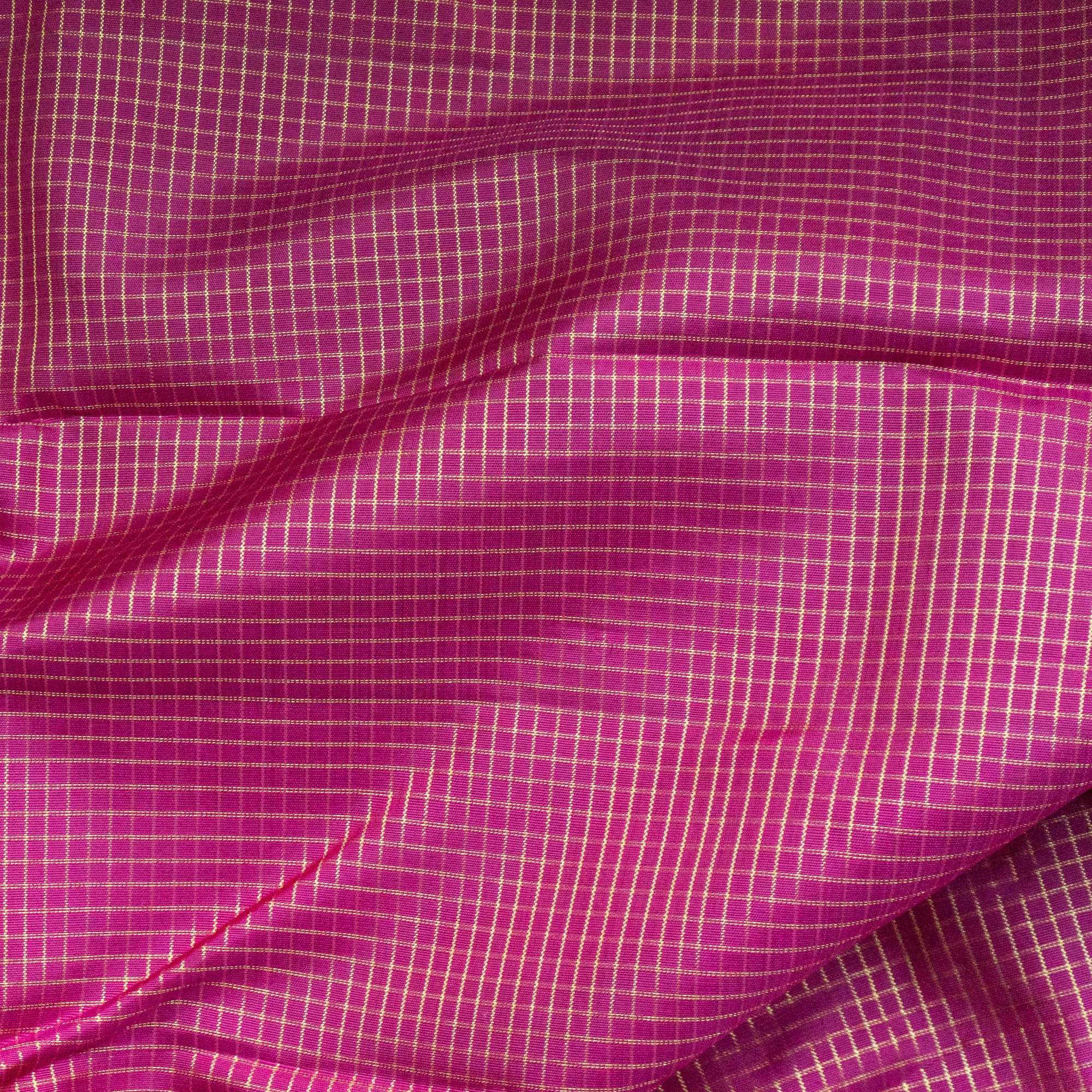 Kanjivaram silk fabric with micro checks in gold zari features a traditional design, showcasing intricate small check patterns woven with fine gold threads.