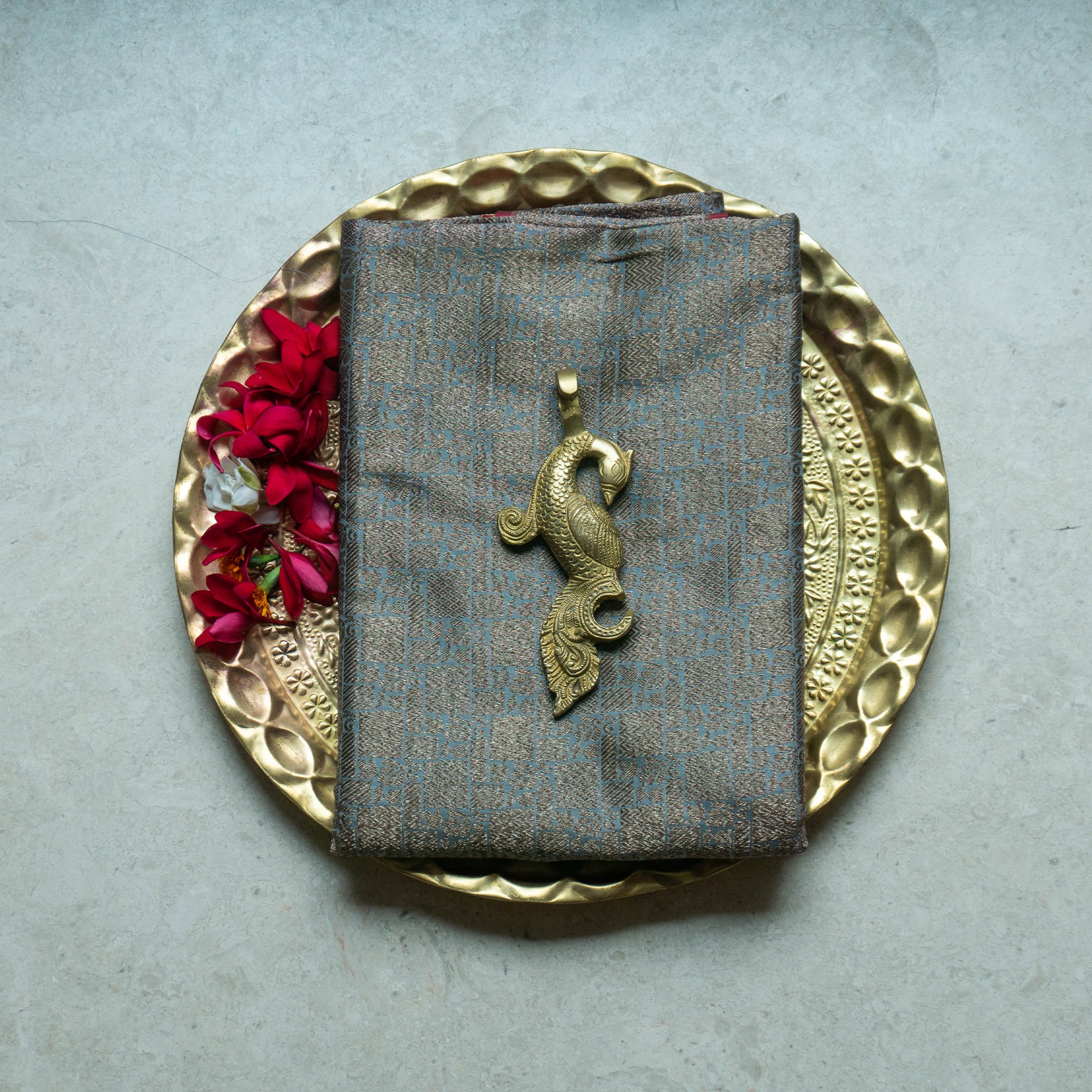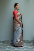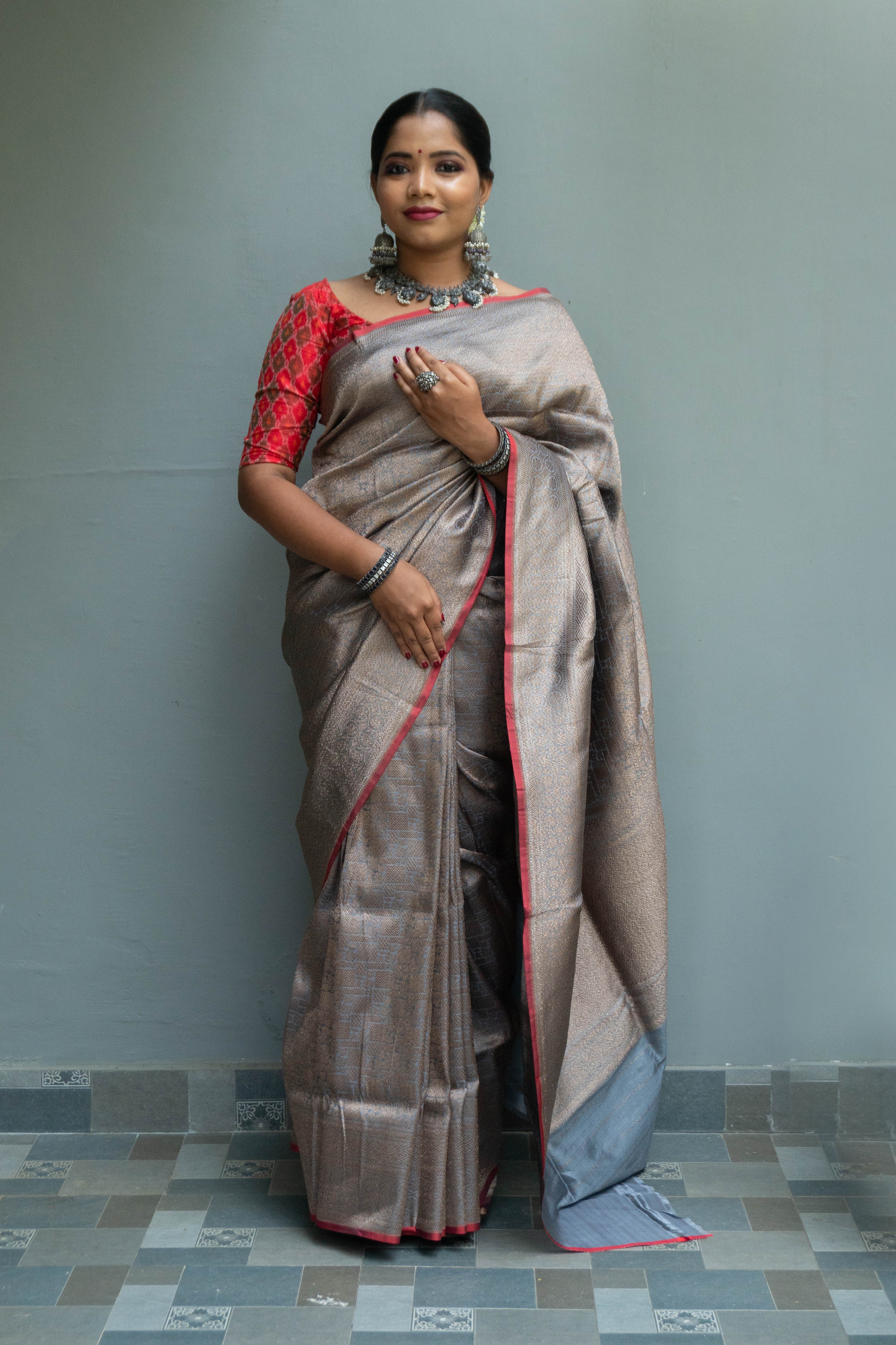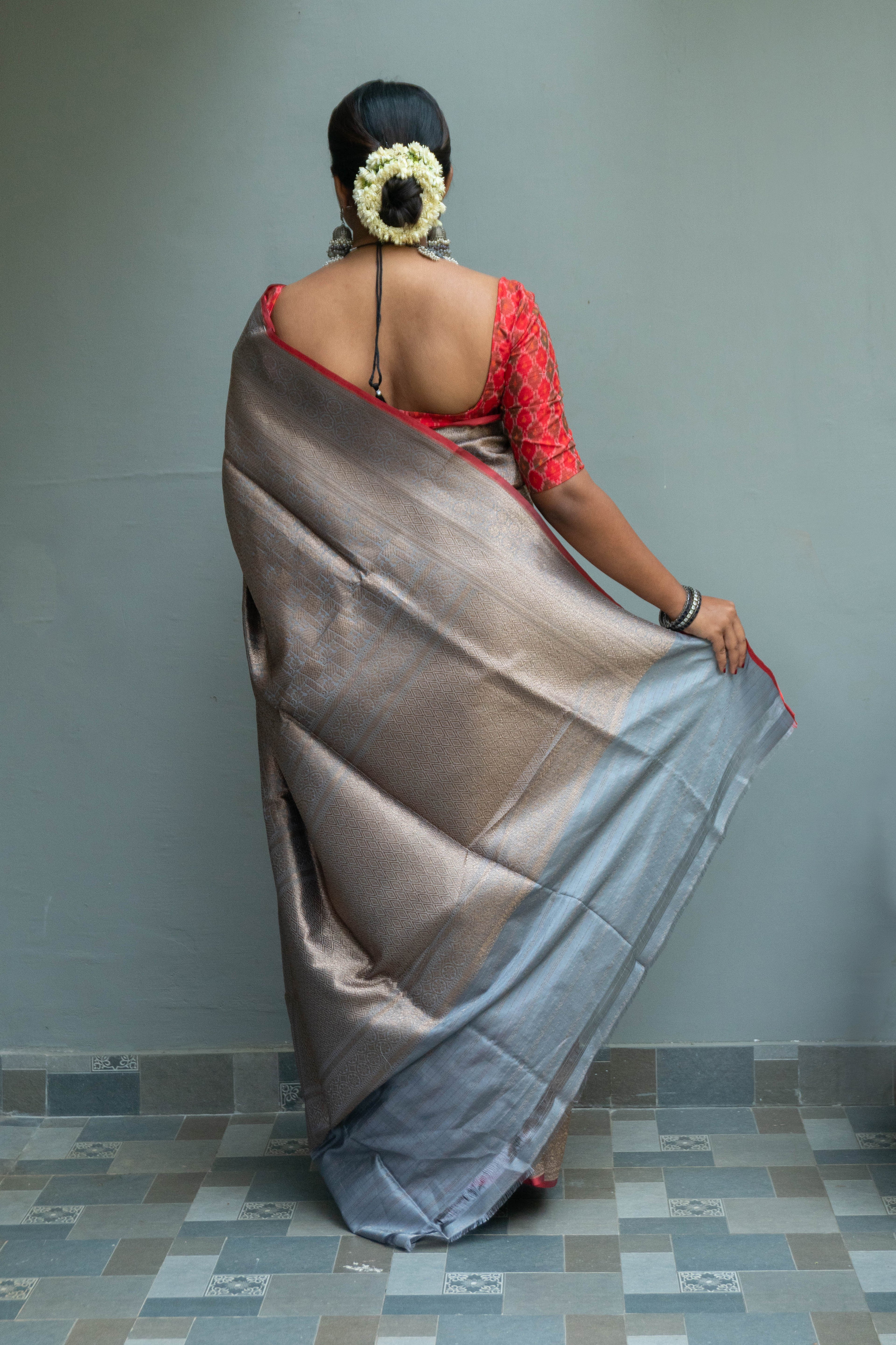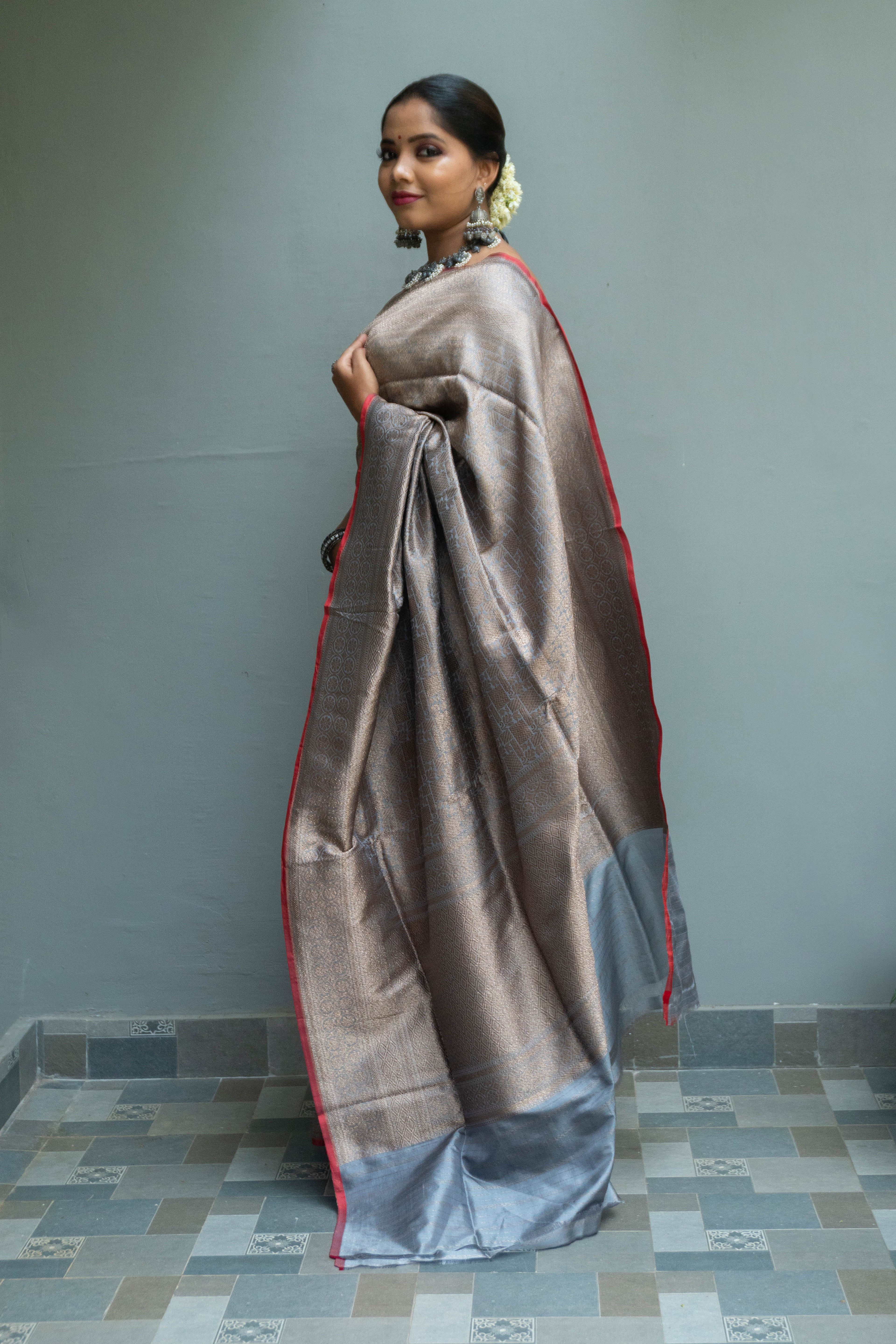 Grey Banarasi silk saree with as zari weaving all over the body. The weaving technique uses supplemental usage of zari, which allows less float of zari on the backside of the saree. We love the pop of red selvedge of the saree which completes the look of the saree