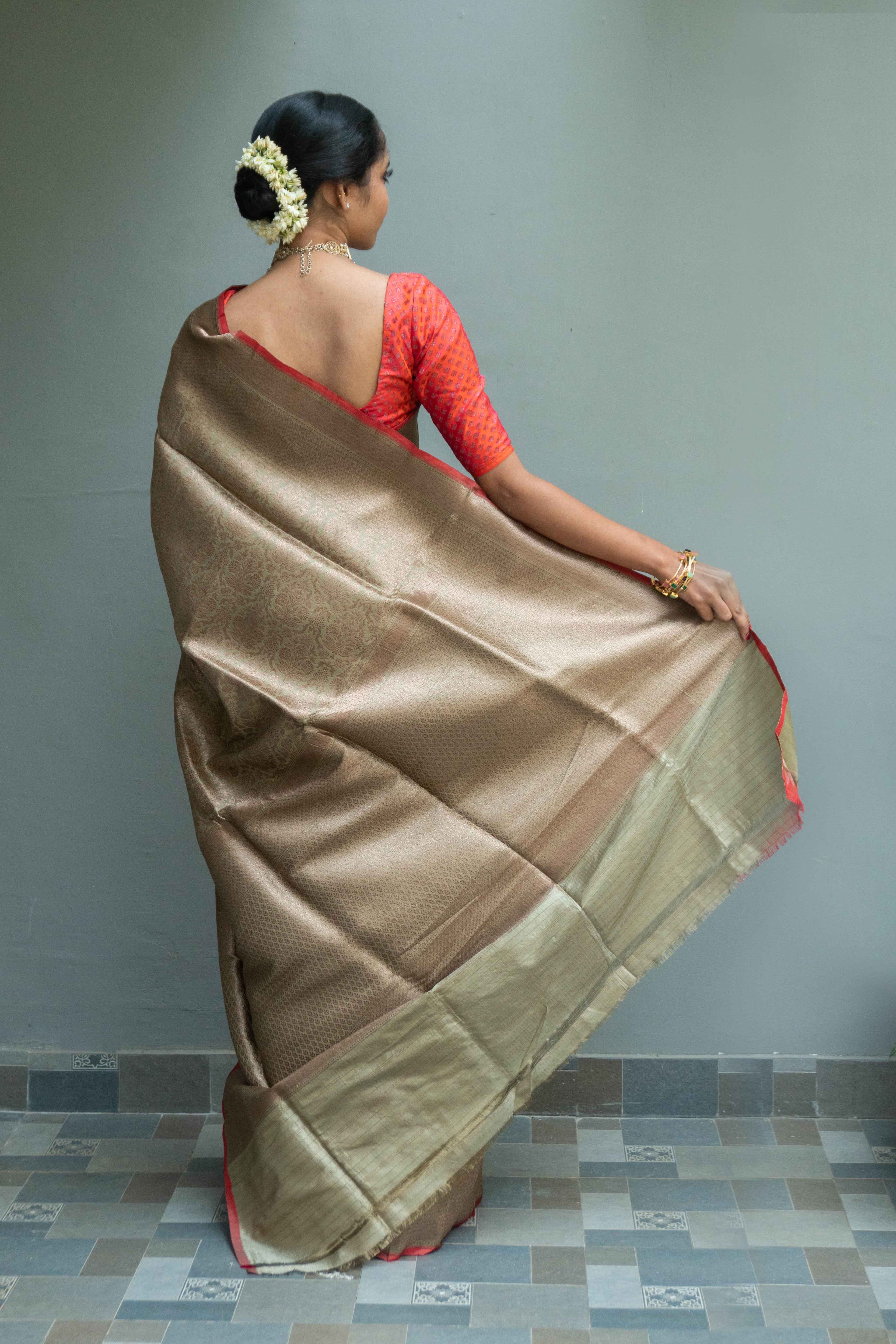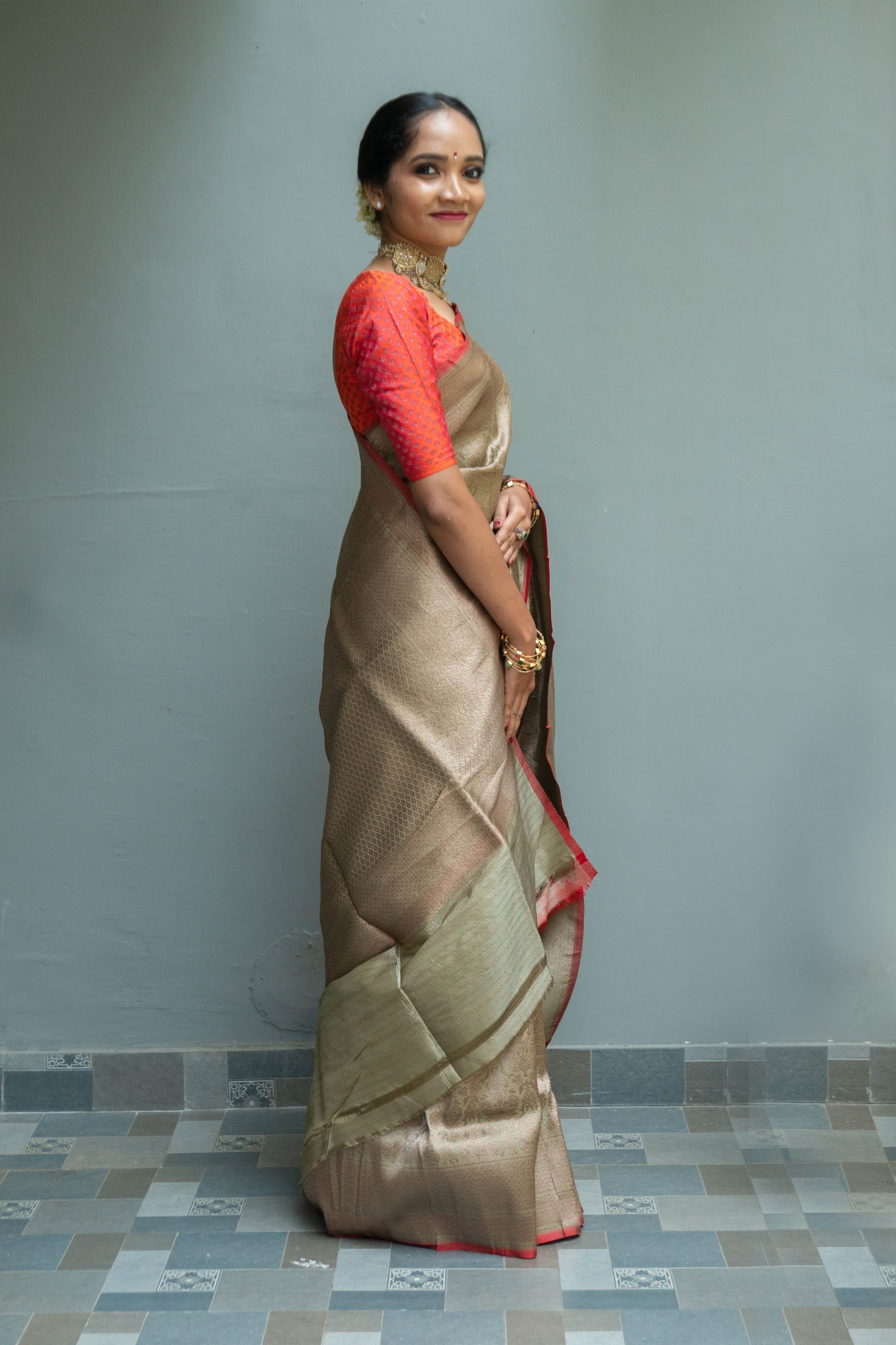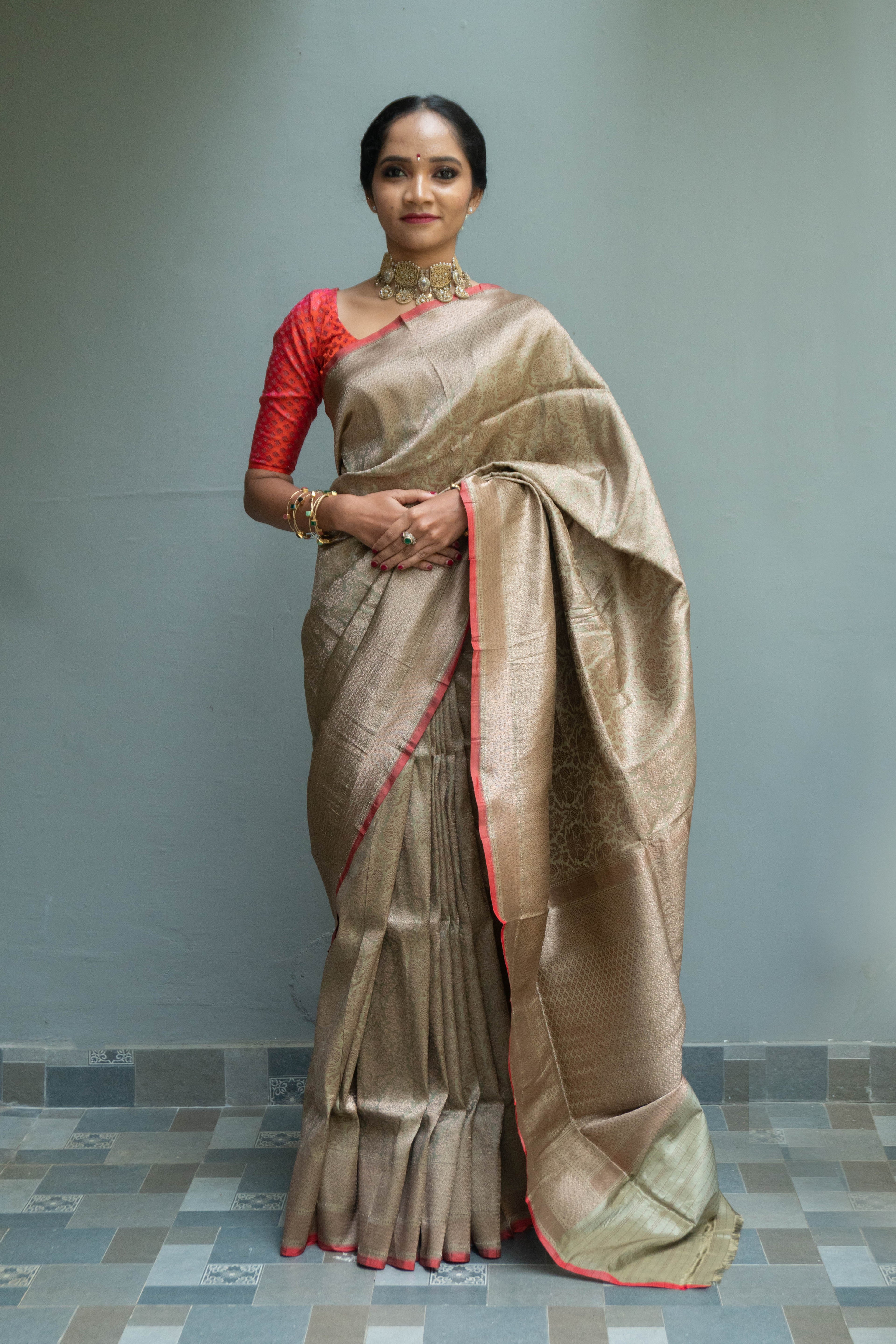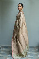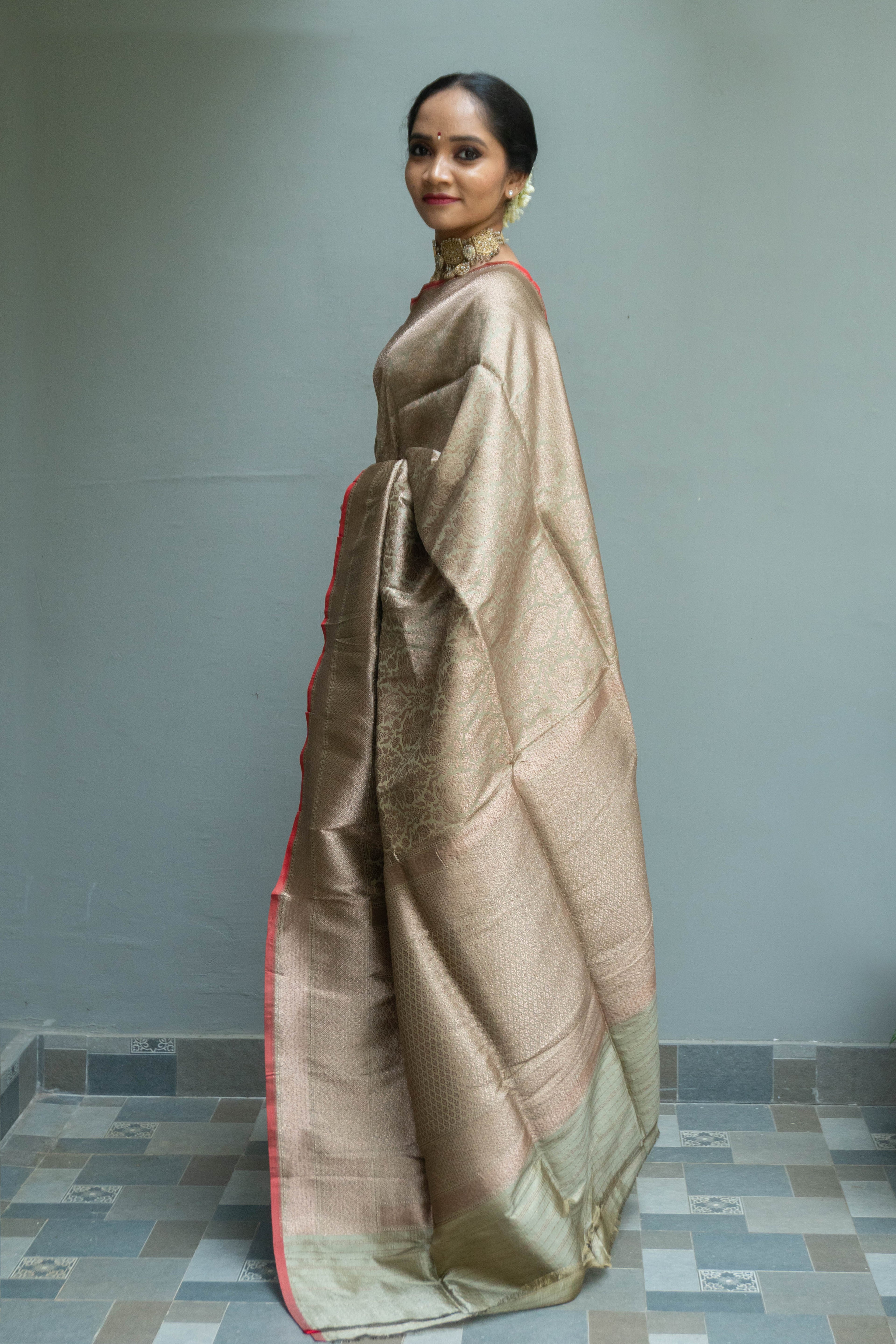 Greenish Beige Banarasi silk saree with a rich web of zari all over the body. Handwoven with fine gold zari vasket and complemented with a contrast selvedge.