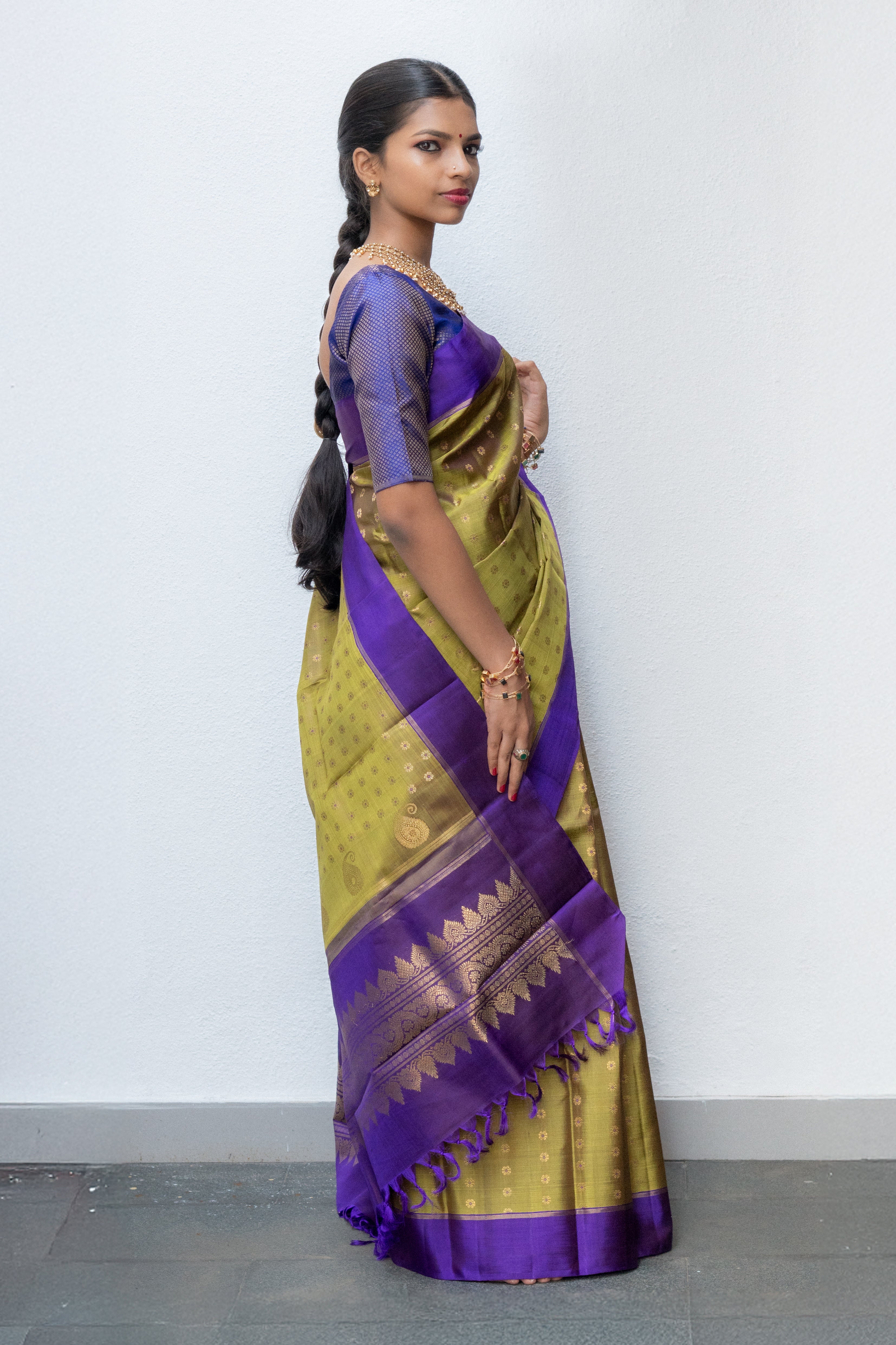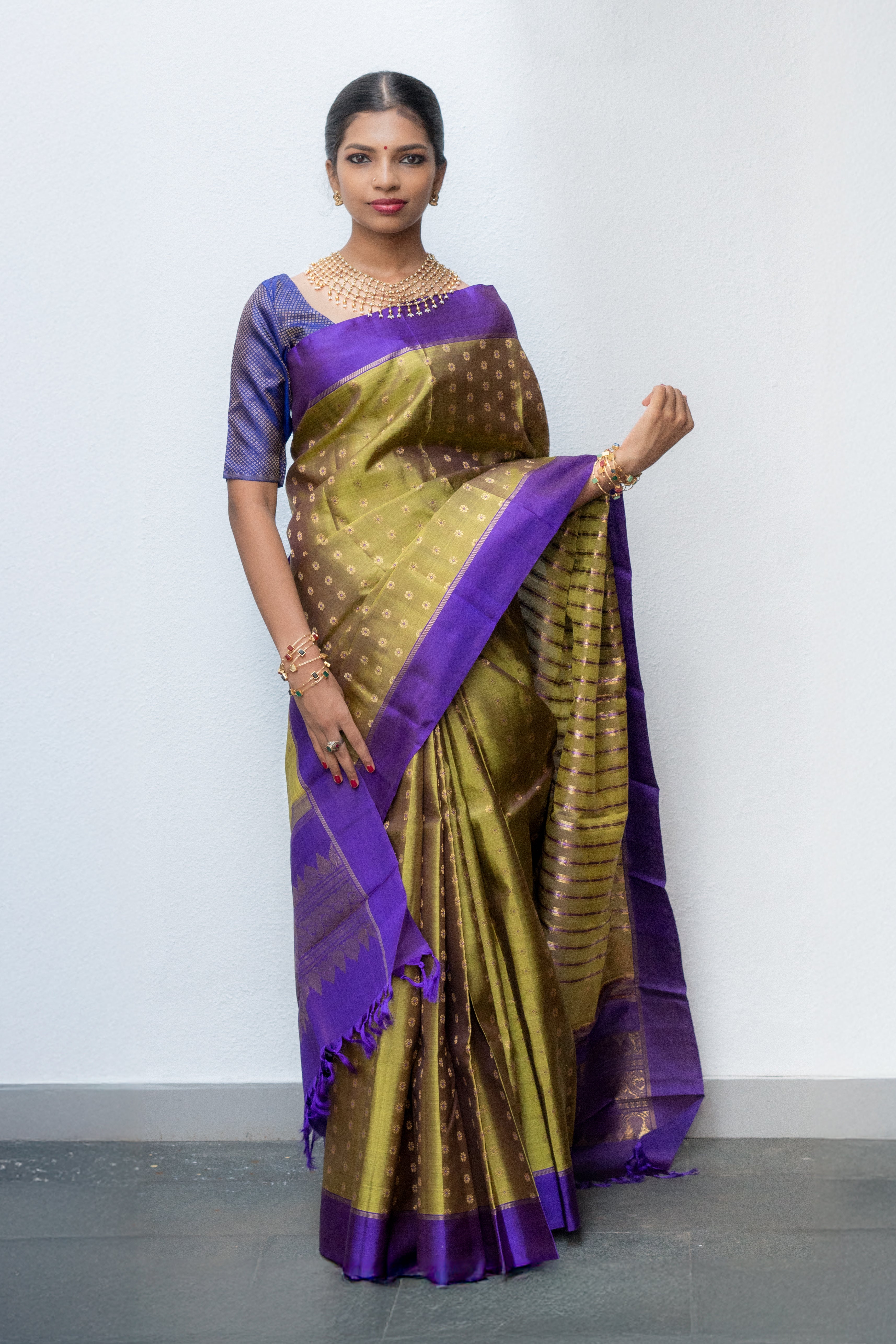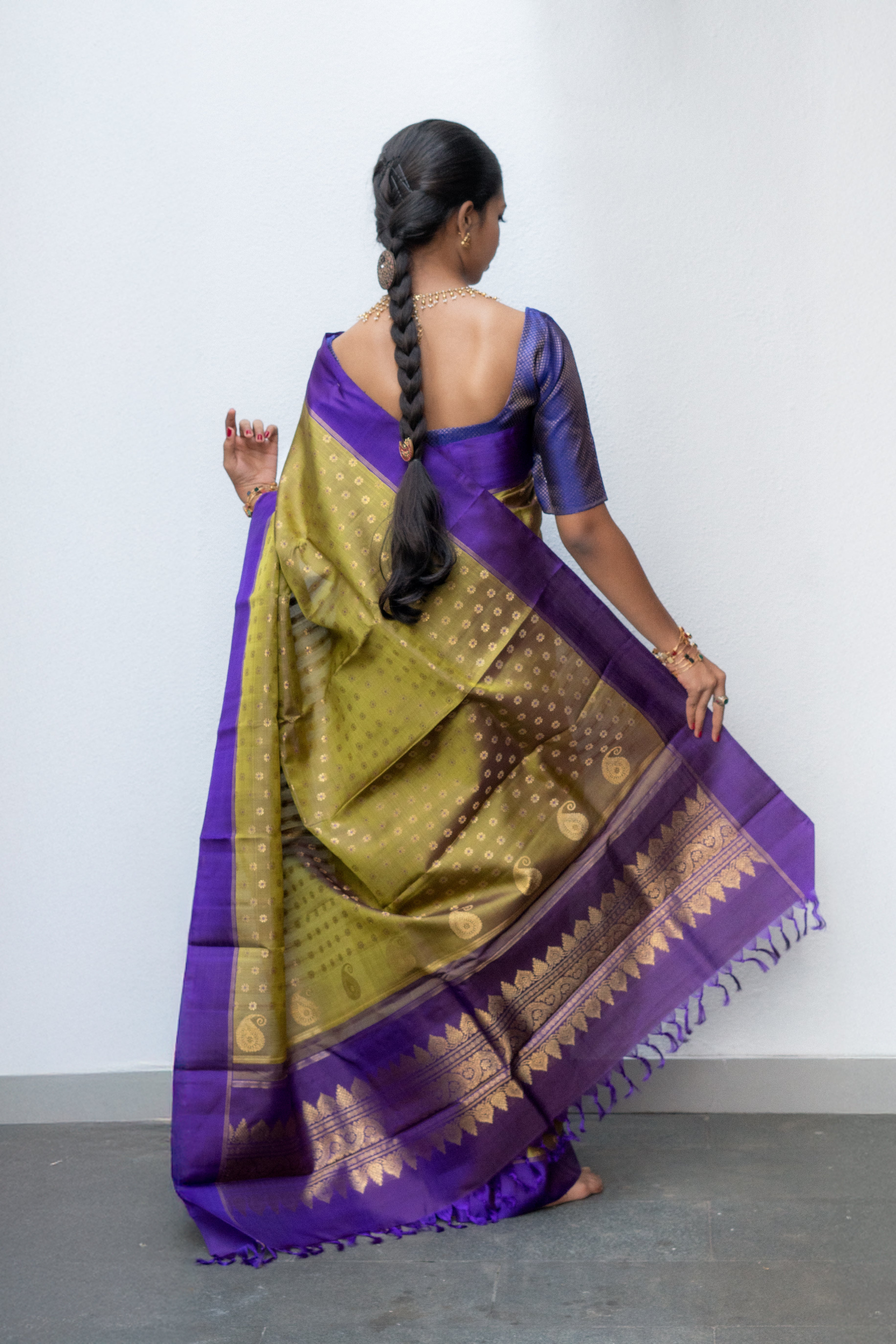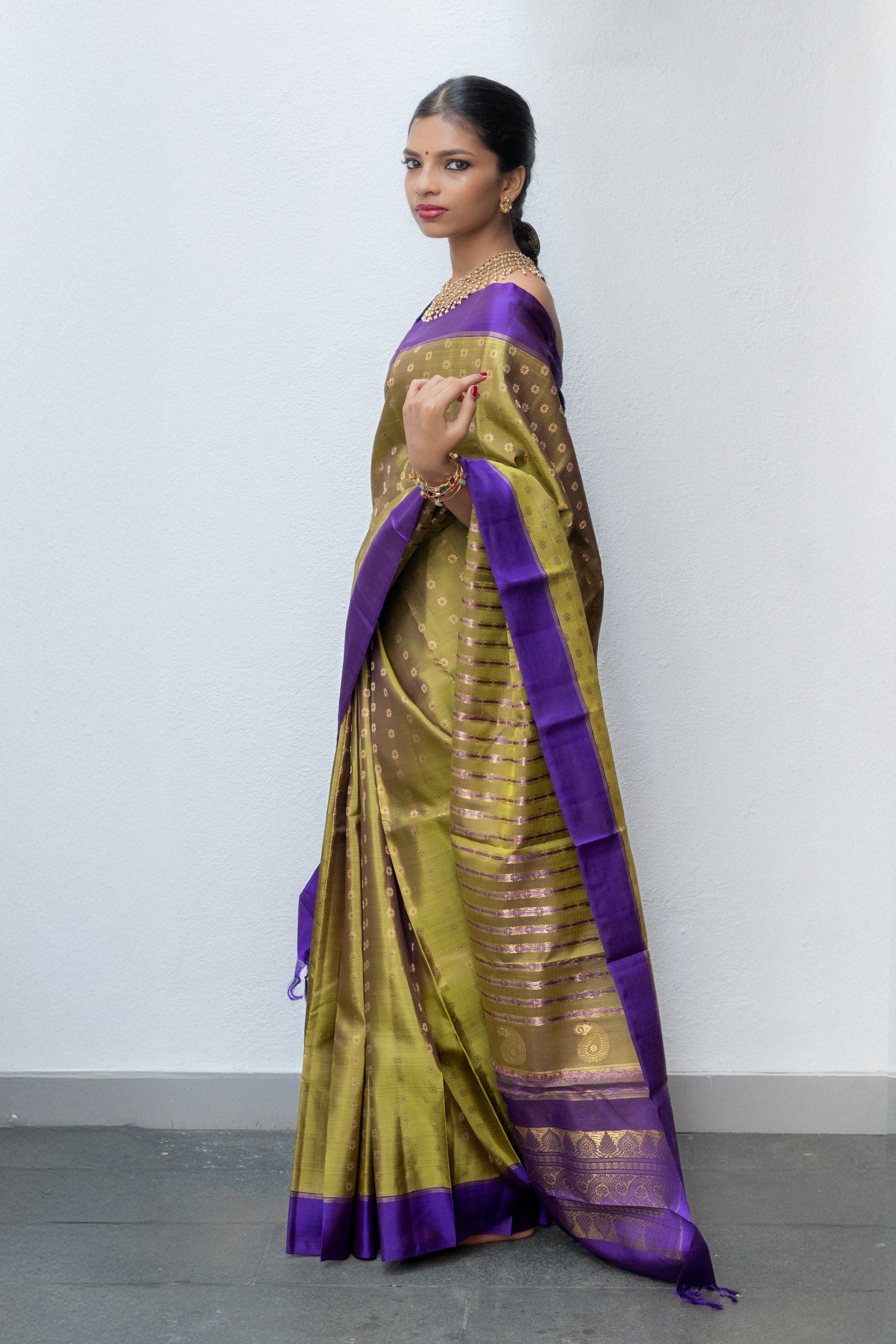 Beautiful Green saree with linearly arranged "Kamalam" buttis that lead to a bold violet border. The pallu is a unique masterpiece, where the body's design evolves into mango motifs against the violet backdrop, all brought to life with meticulously woven zari.