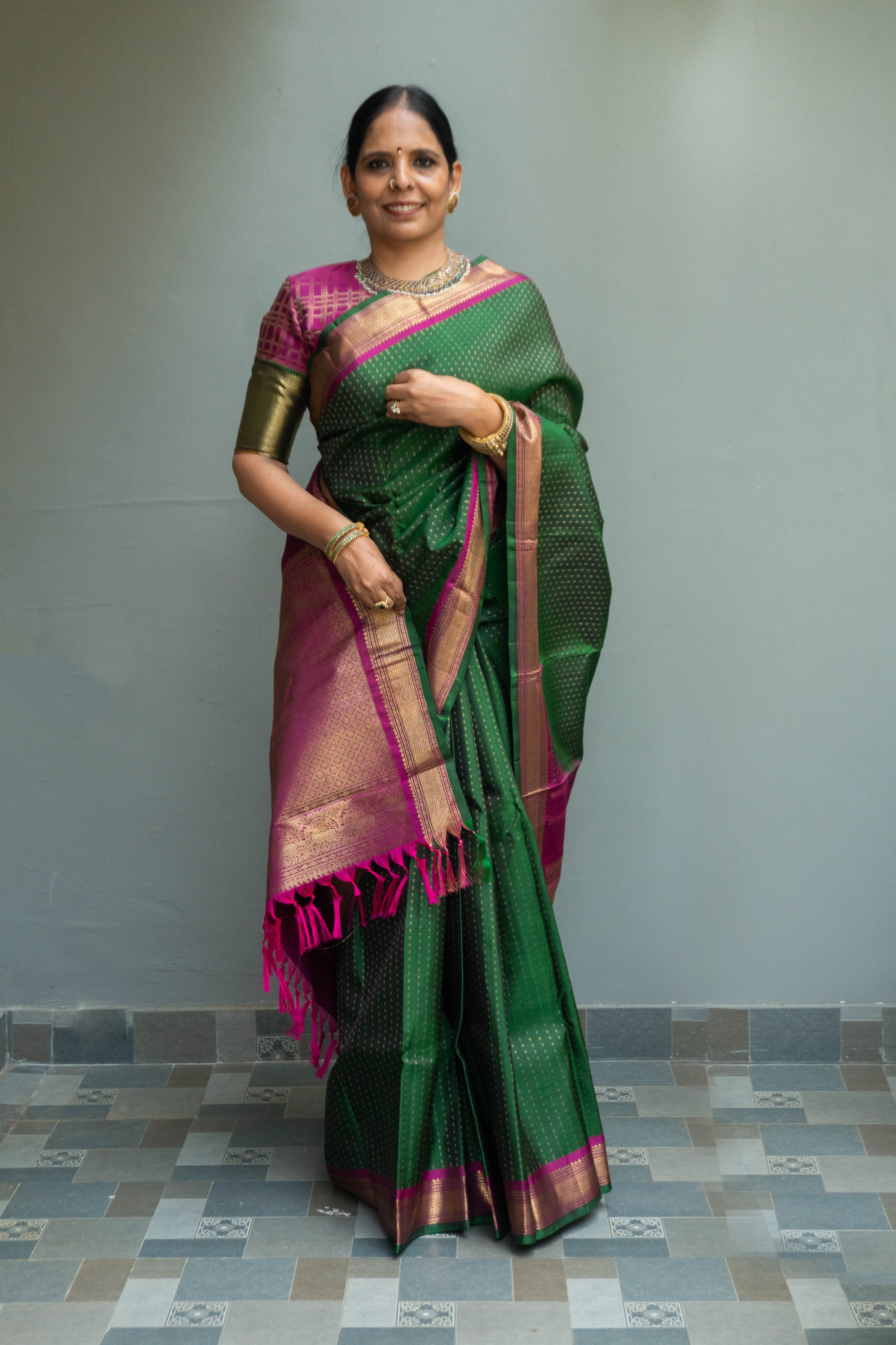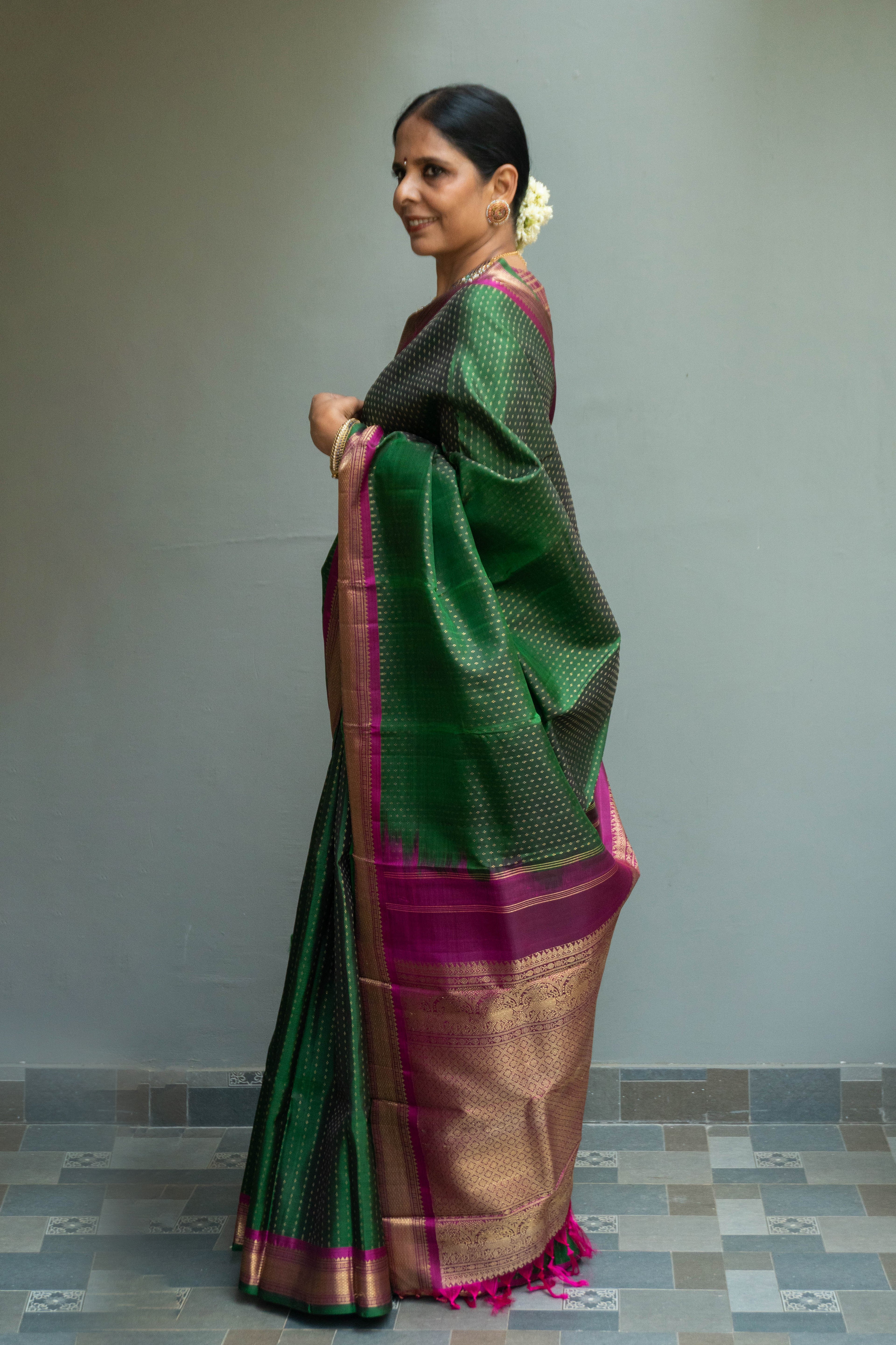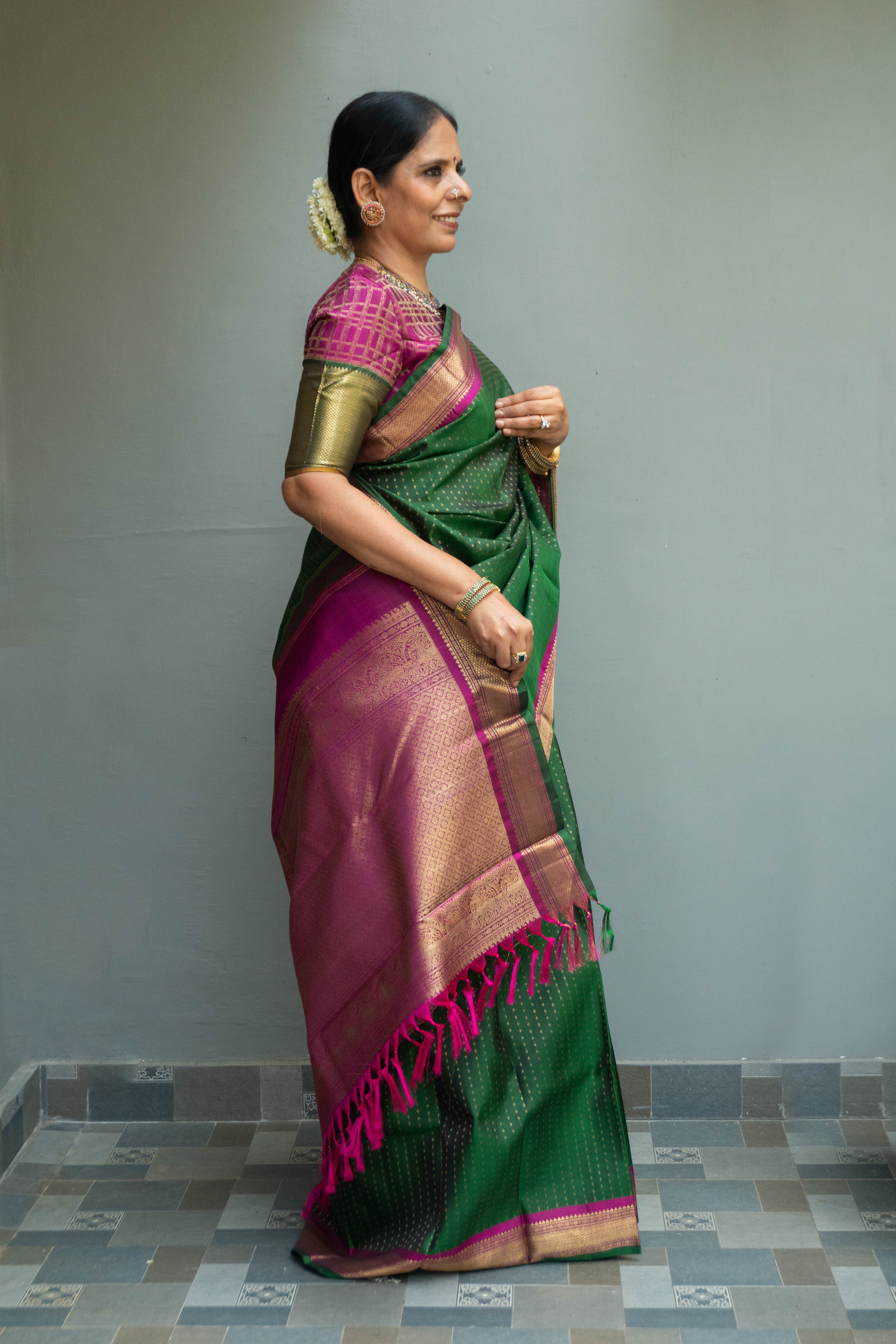 Bottle Green Kanjivaram silk saree with “Kuli kann” motifs in the body. The saree is complemented by a purple border with rich gold zari, and the pallu has traditional motifs such as “Yazhi” , geometric and leaf designs.