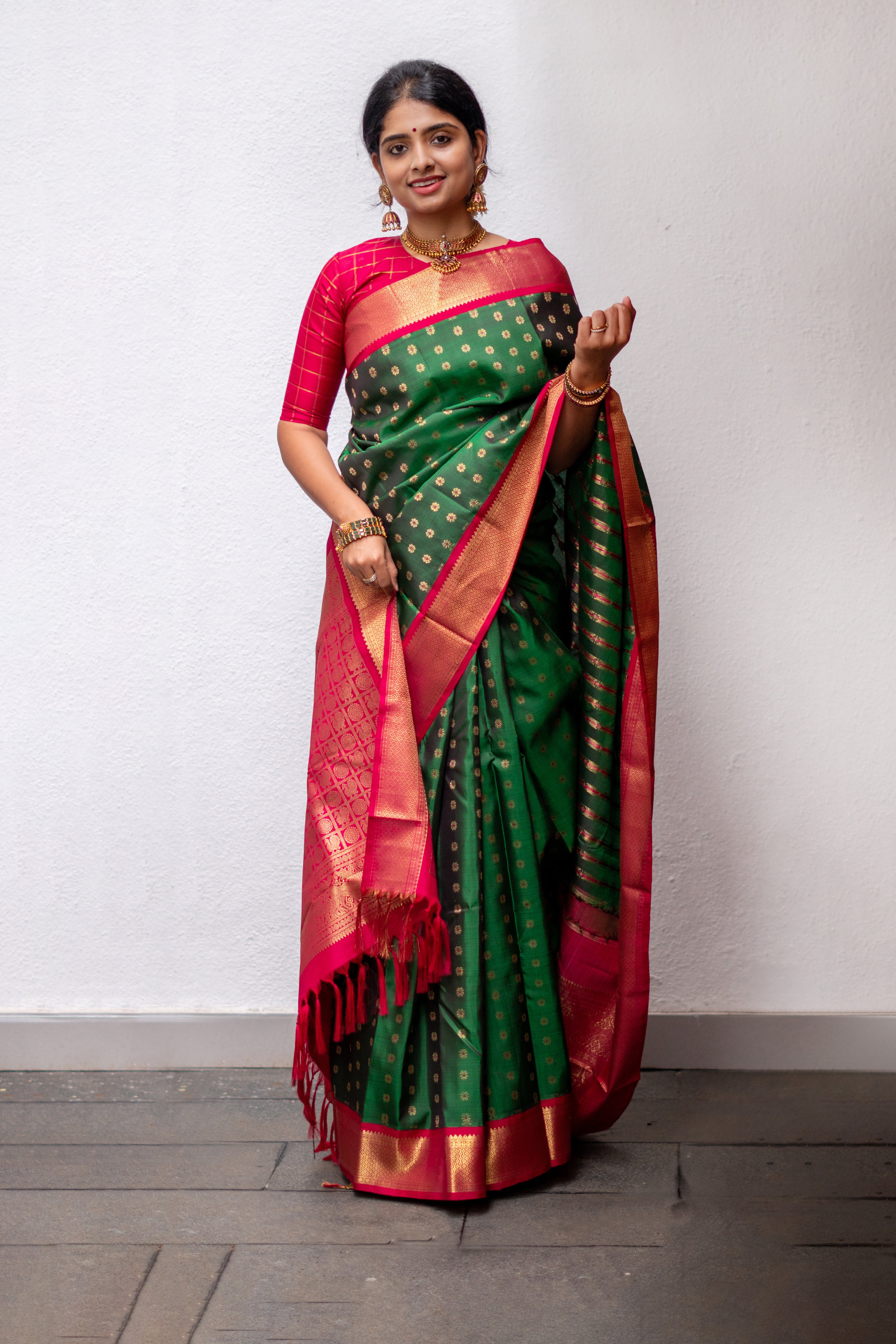 Bottle Green Kanjivaram Silk Saree with Kamalam Buttis