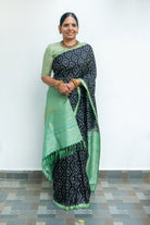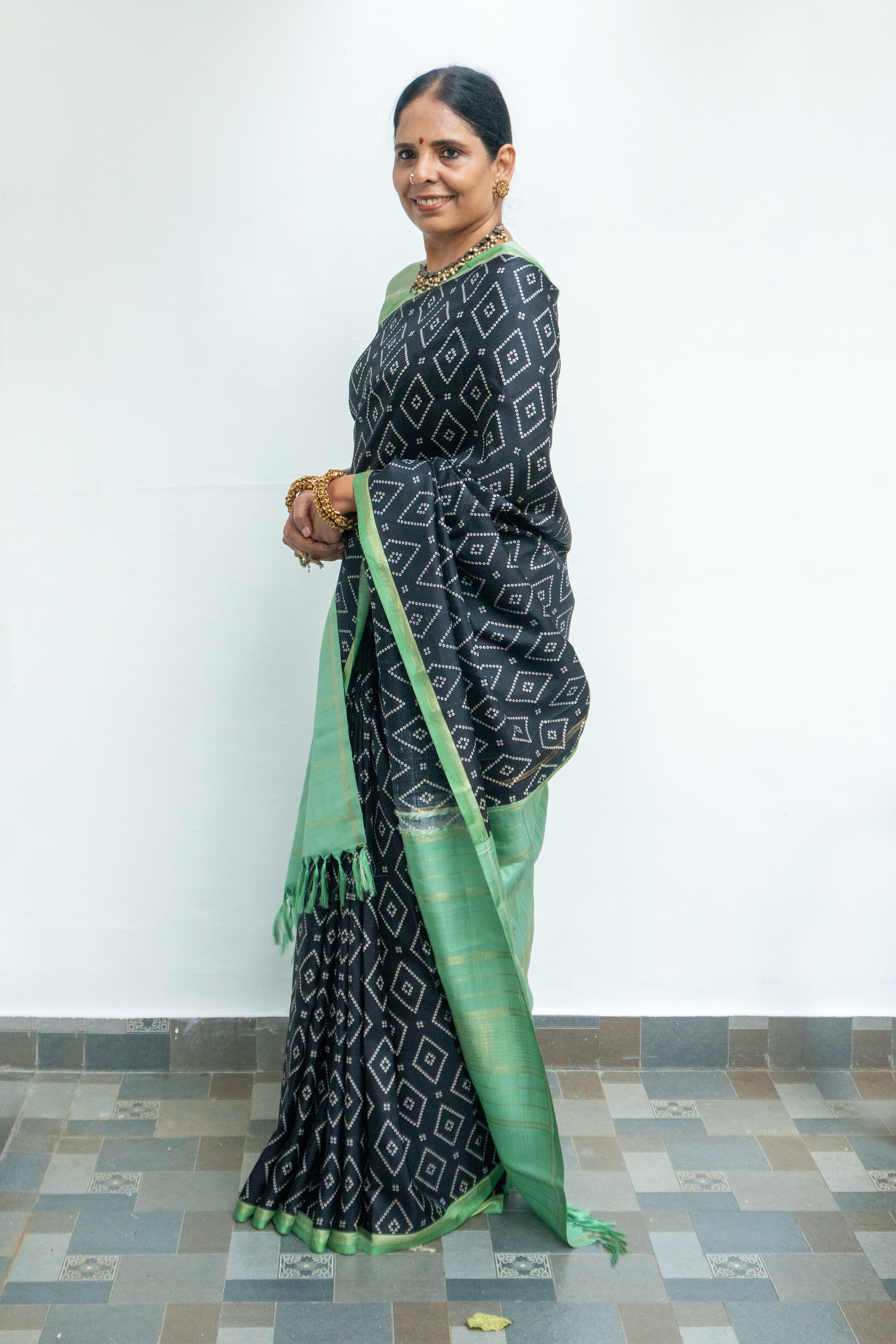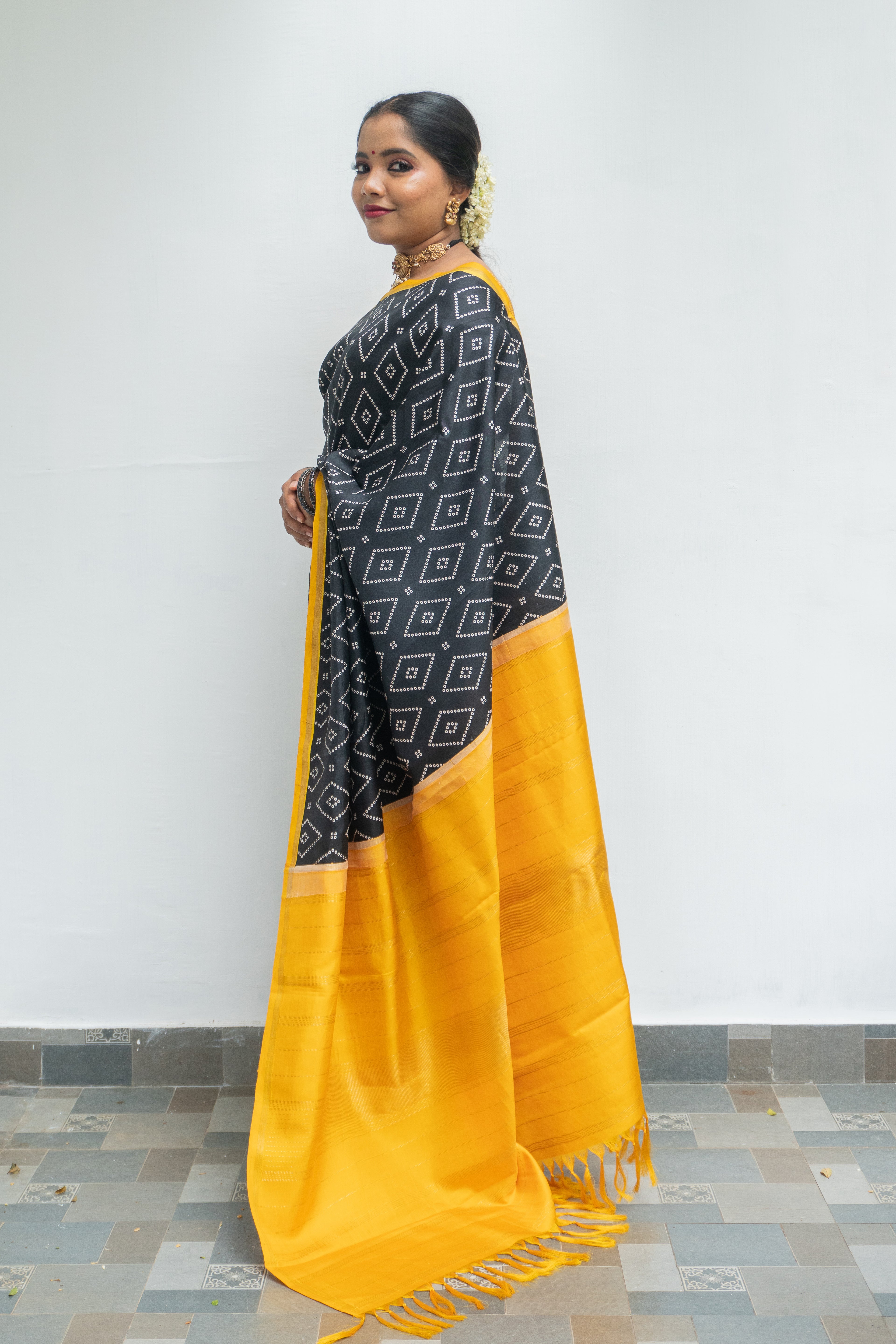 Black Kanjivaram Silk Saree with Bandhani Block Print