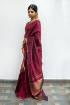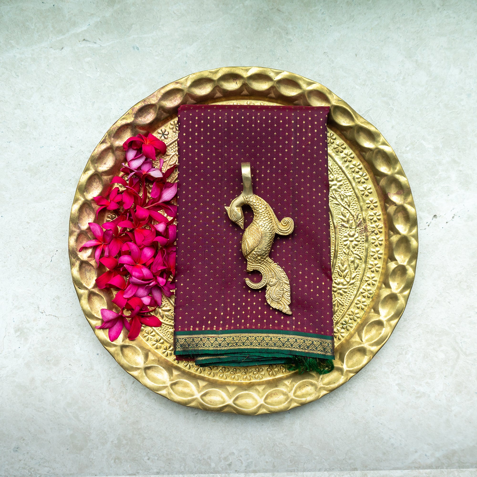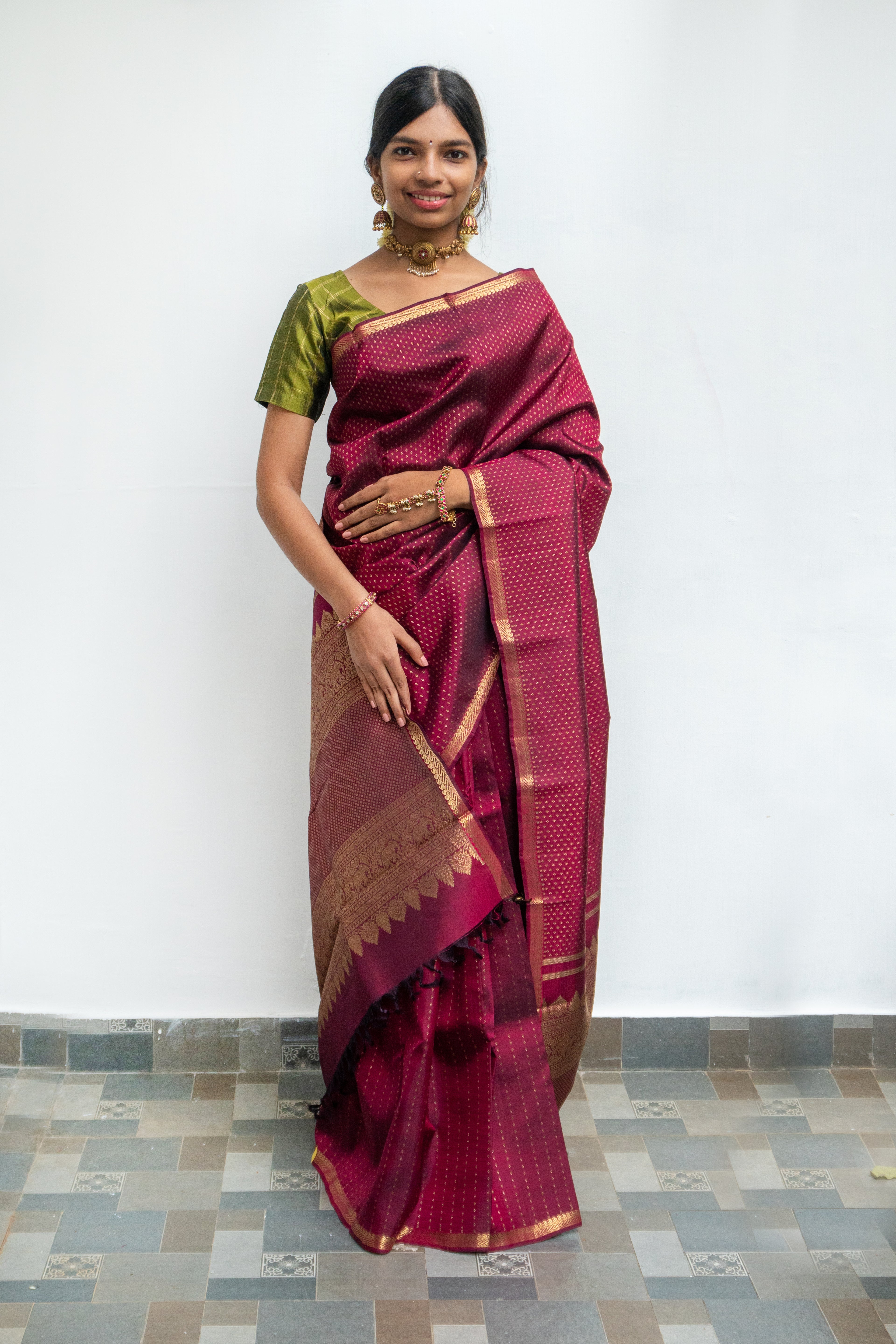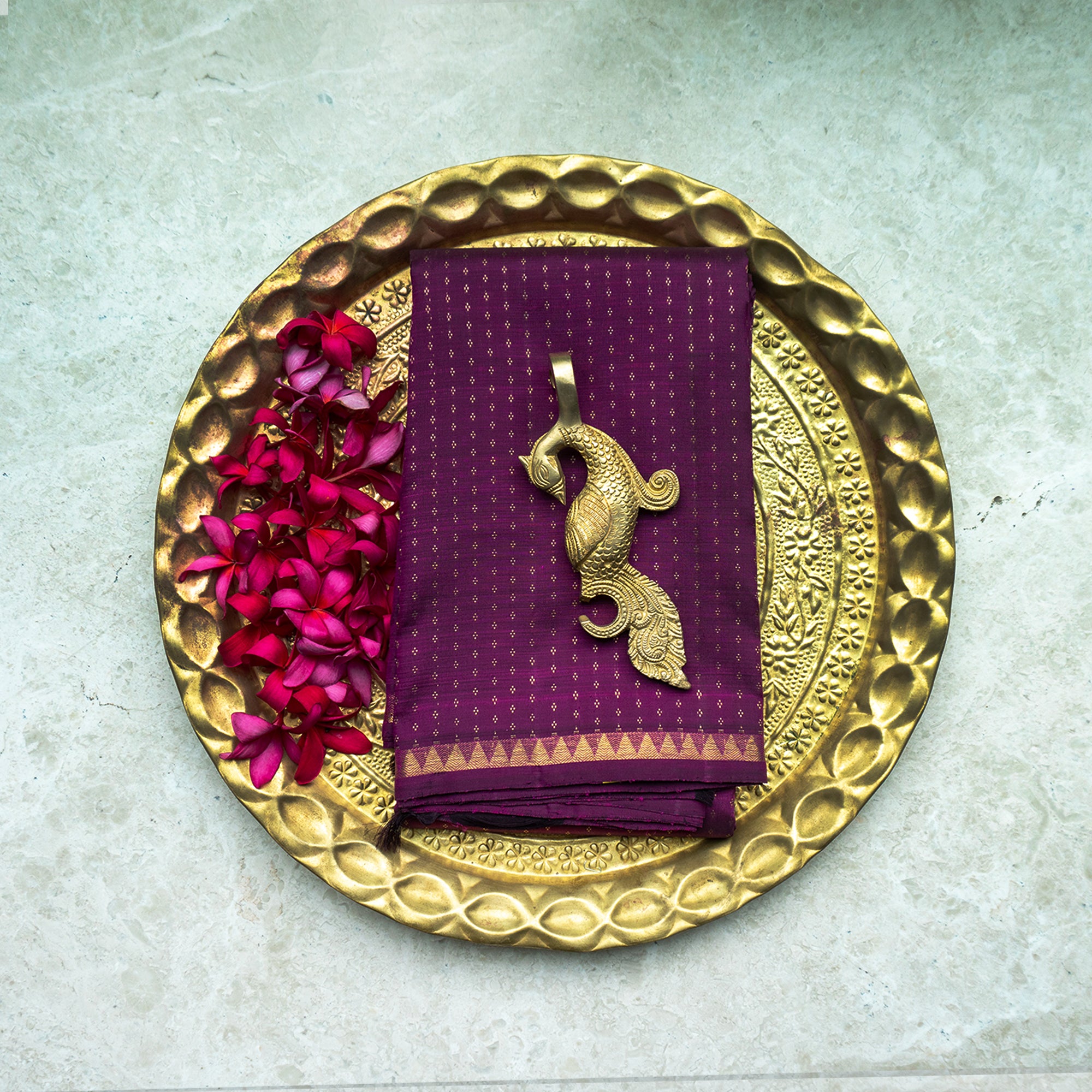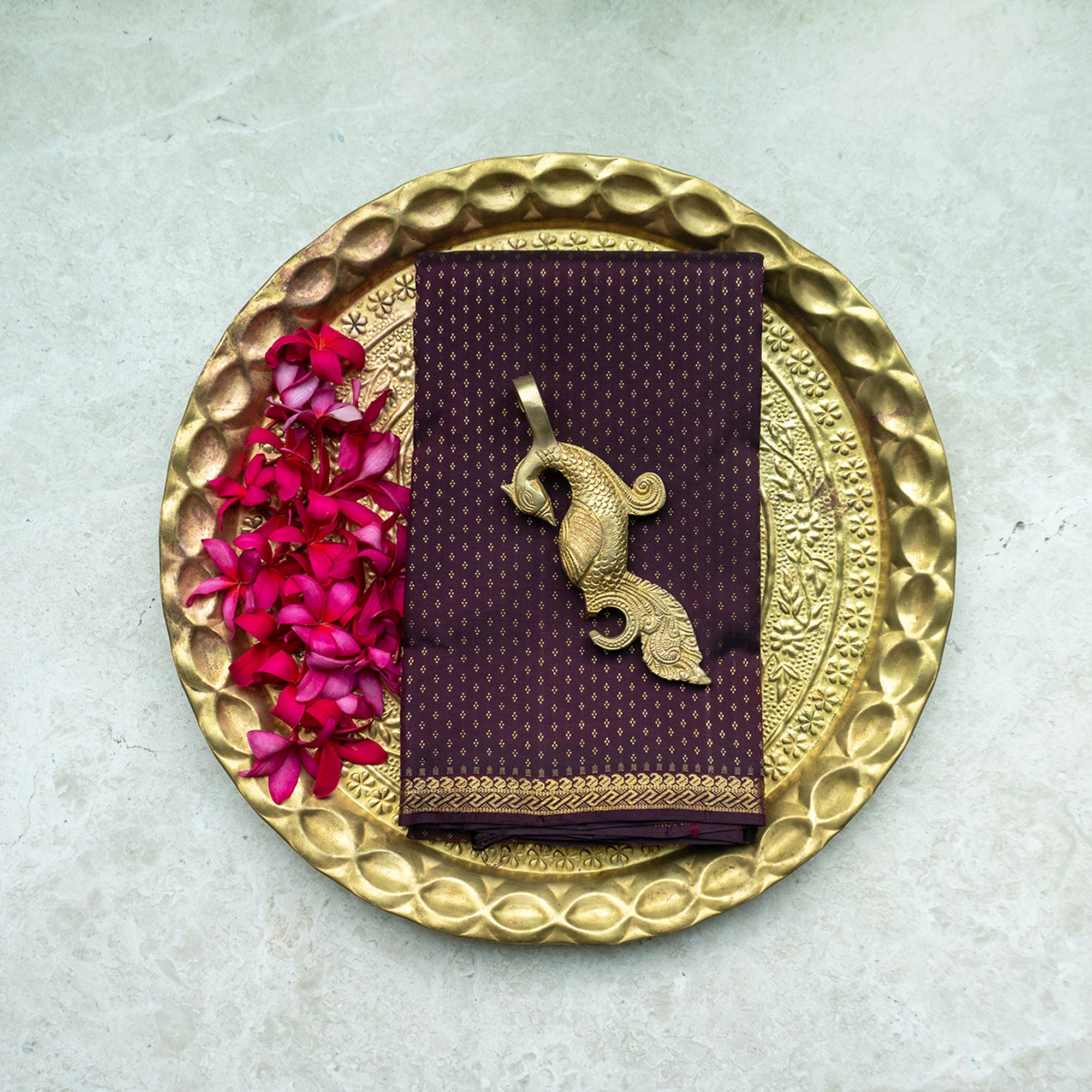 Elevate your ethnic wardrobe with this regal wine Kanjivaram silk saree. The body of the sareee is gracefully adorned with “kuil - kann” motifs, lending the saree a refined yet distinctive charm. The saree features a grand pallu, richly woven with elaborate floral patterns and intricate animal figurines - a tribute to the storytelling heritage of kanjivaram weaving.