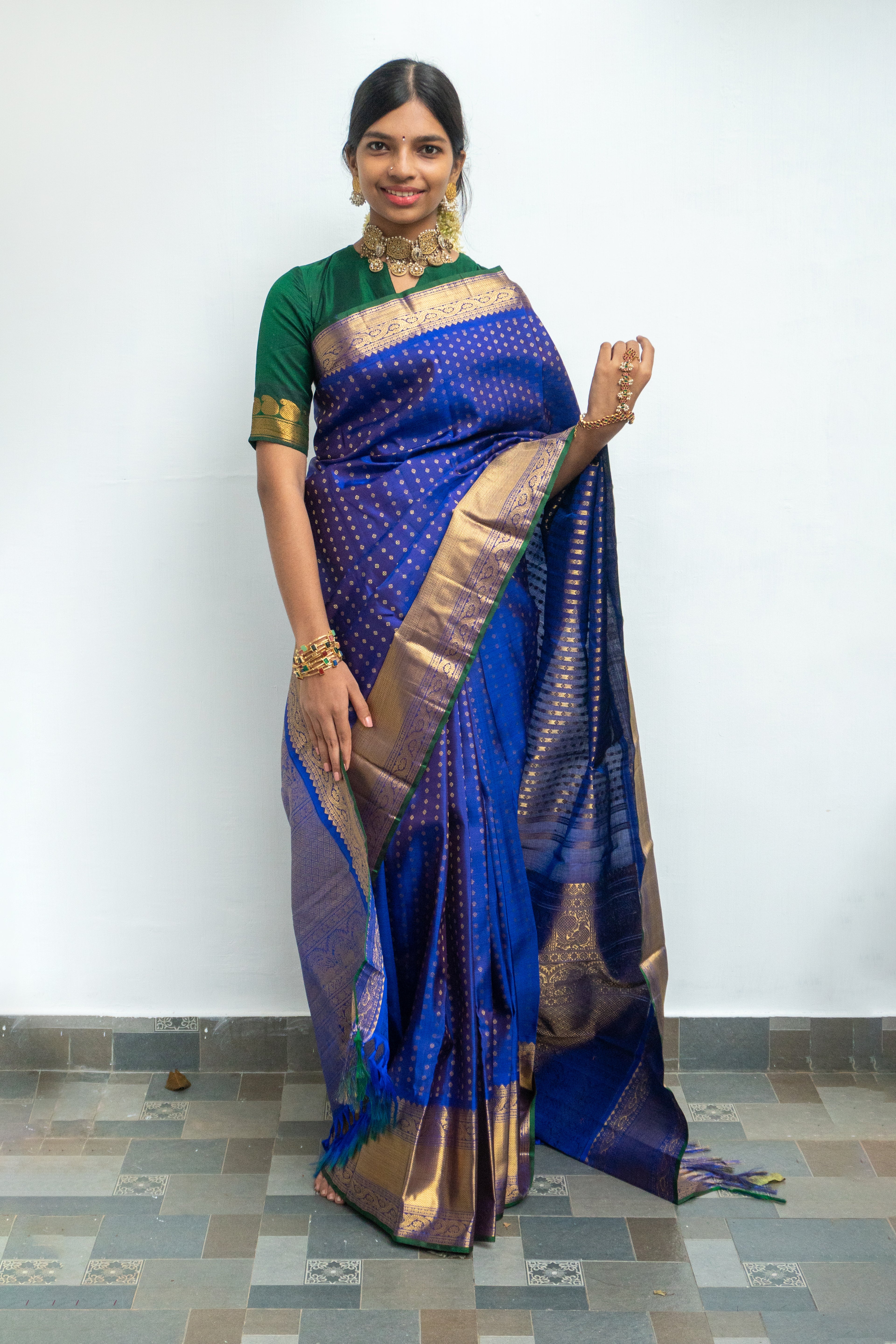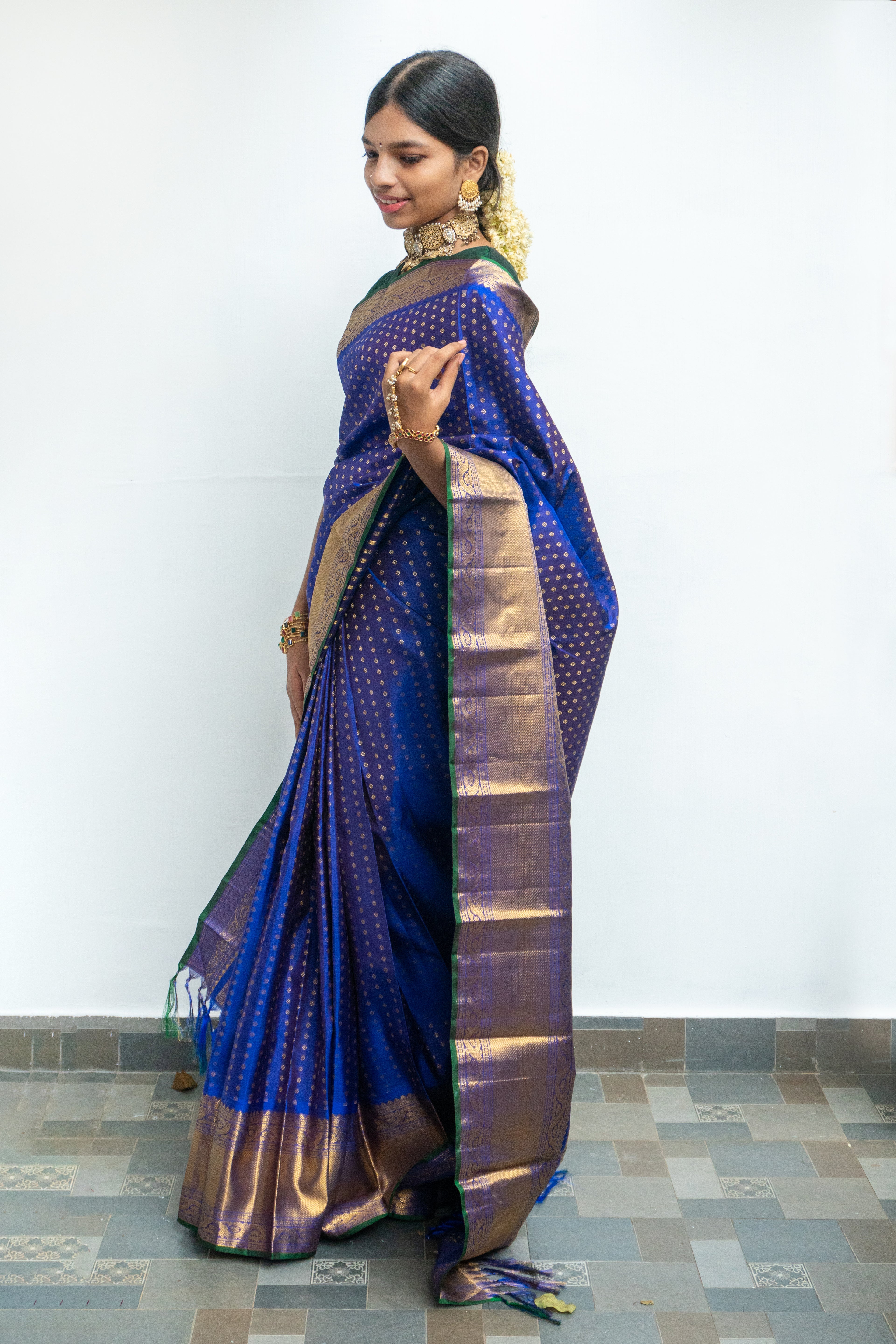 Radiate regal elegance on your special day with this exquisite royal blue bridal kanjivaram silk saree. This masterpiece features an opulent intricate gold zari border that glimmers with every movement, adding a majestic touch. The rich royal blue body is gracefully contrasted by a vibrant green selevedge, highlighting the saree’s refined craftsmanship.
