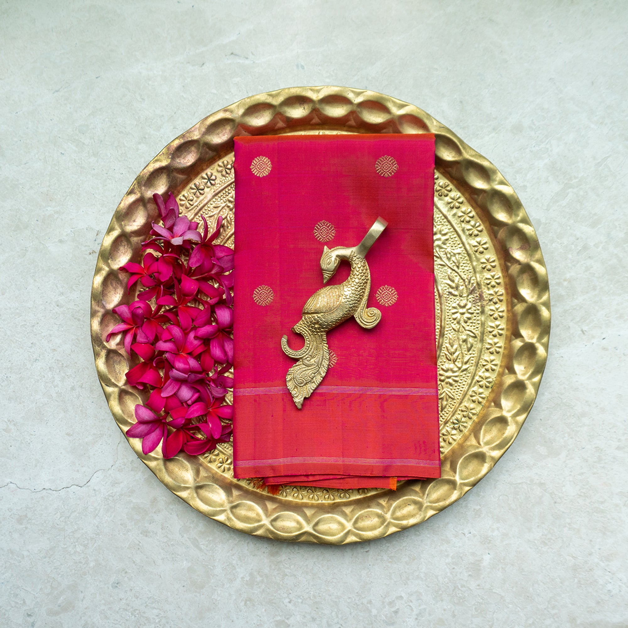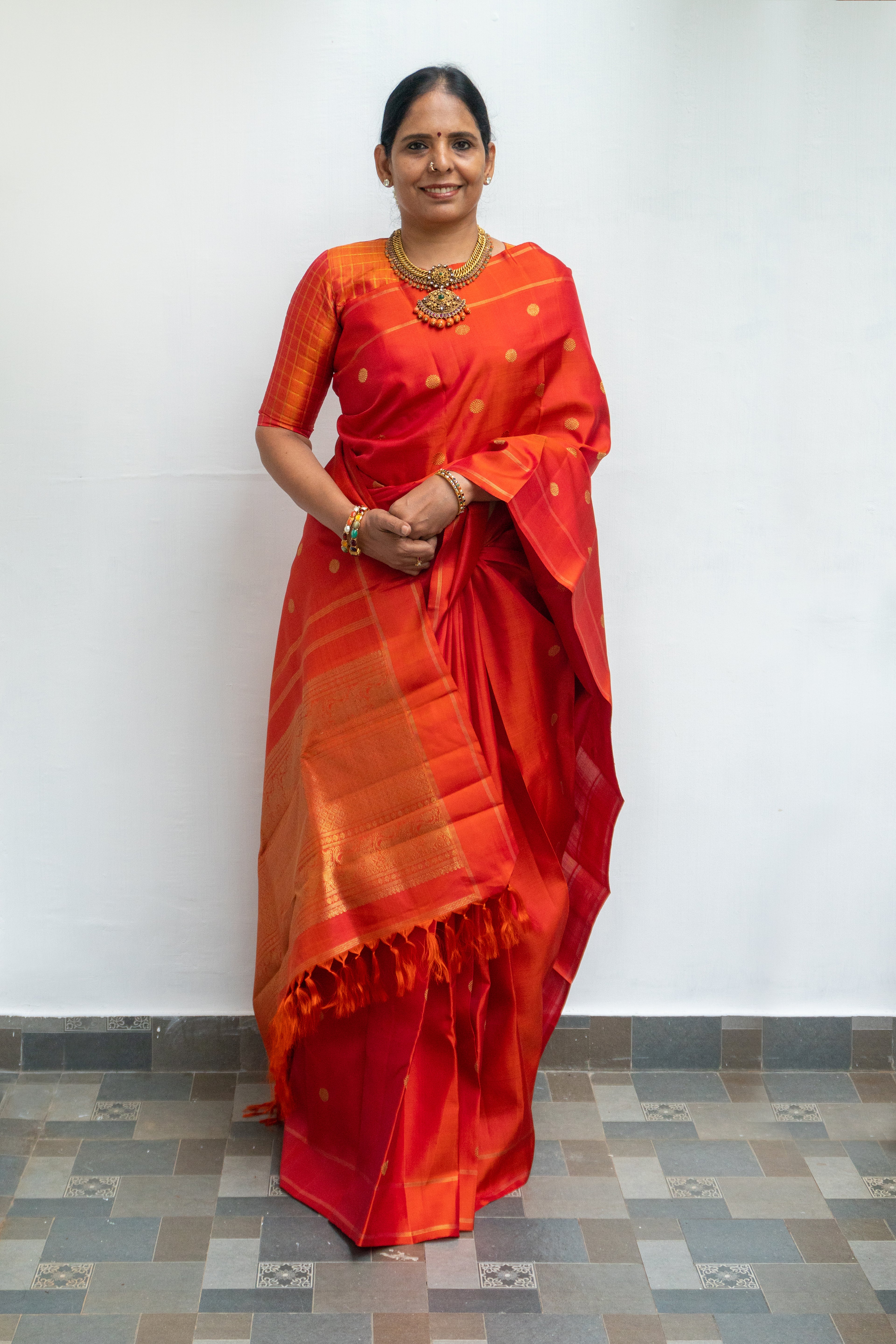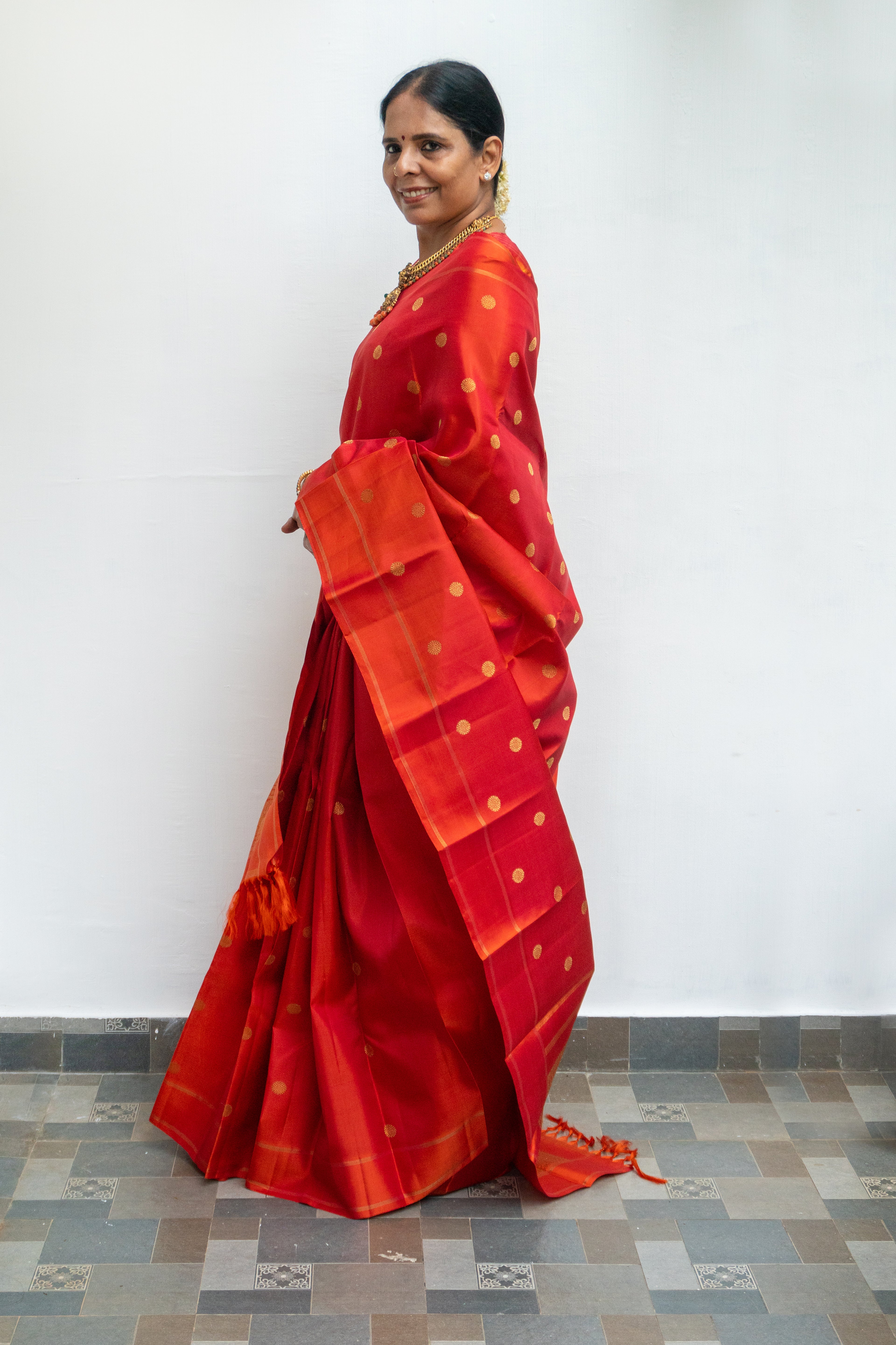 Radiating elegance and tradition, this stunning orange kanjivaram saree features buttis woven across the body, adding subtle charm and texture. The saree has a simple refined border that enhances its timeless appeal without overpowering the rich hue.