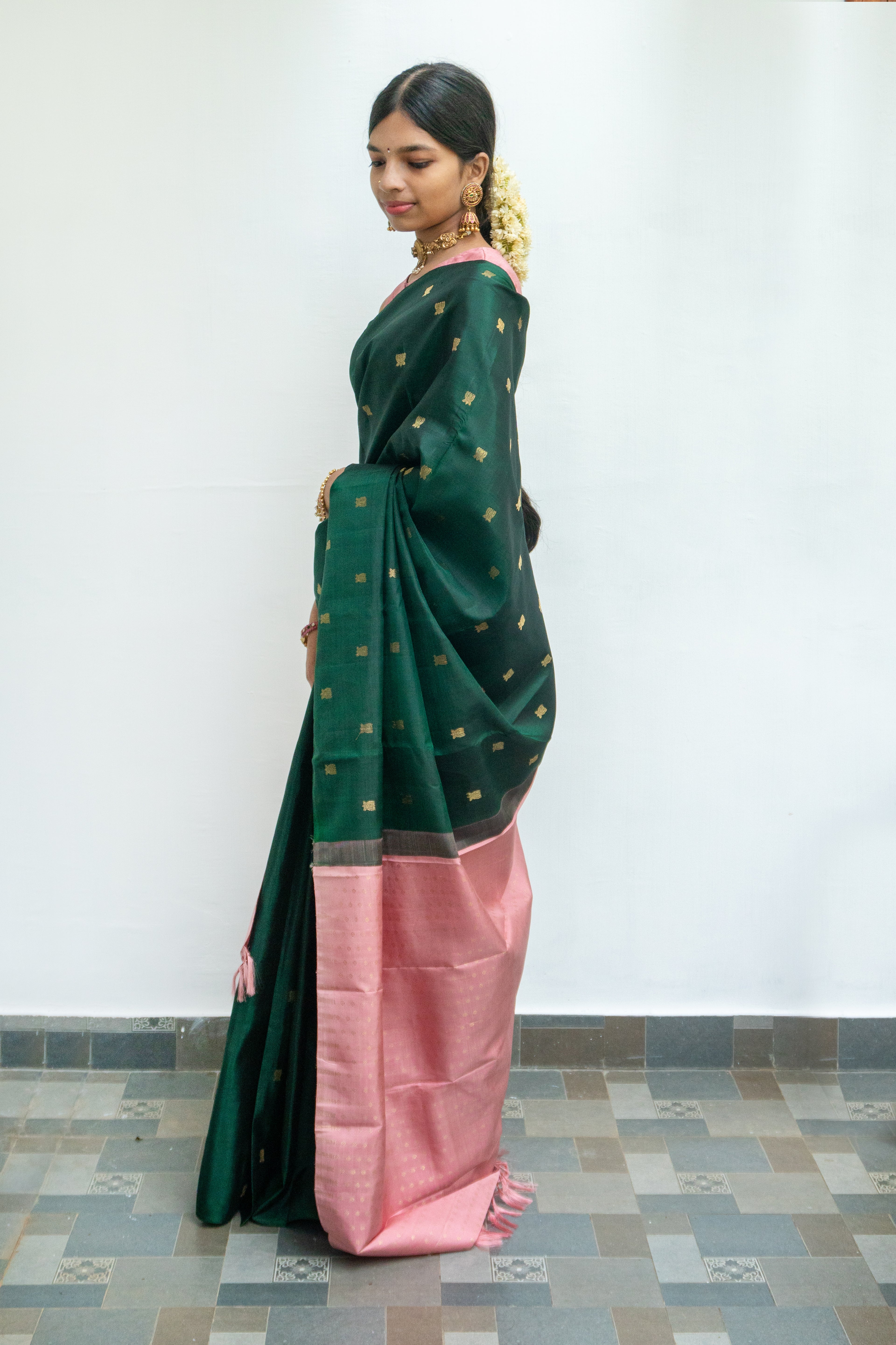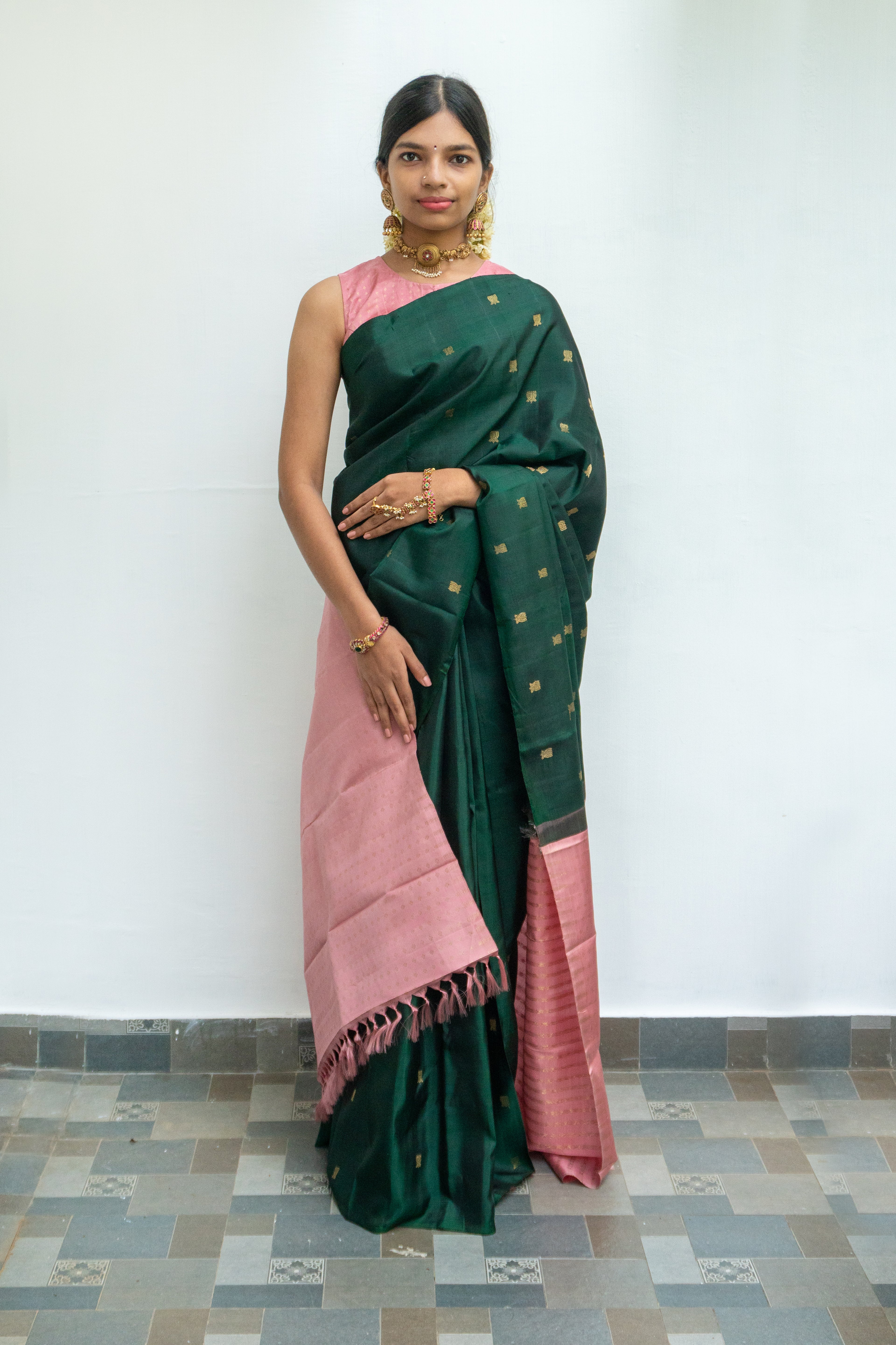 A timeless blend of tradition and minimalism, this silk saree crafted without border, allows the rich silk weave to take center stage. The body of the saree has scattered traditional woven zari buttis. The sari is paired with a soft pastel pink pallu that adds a soft graceful touch, woven with zari buttis. The blouse mirrors the same design as the pallu.