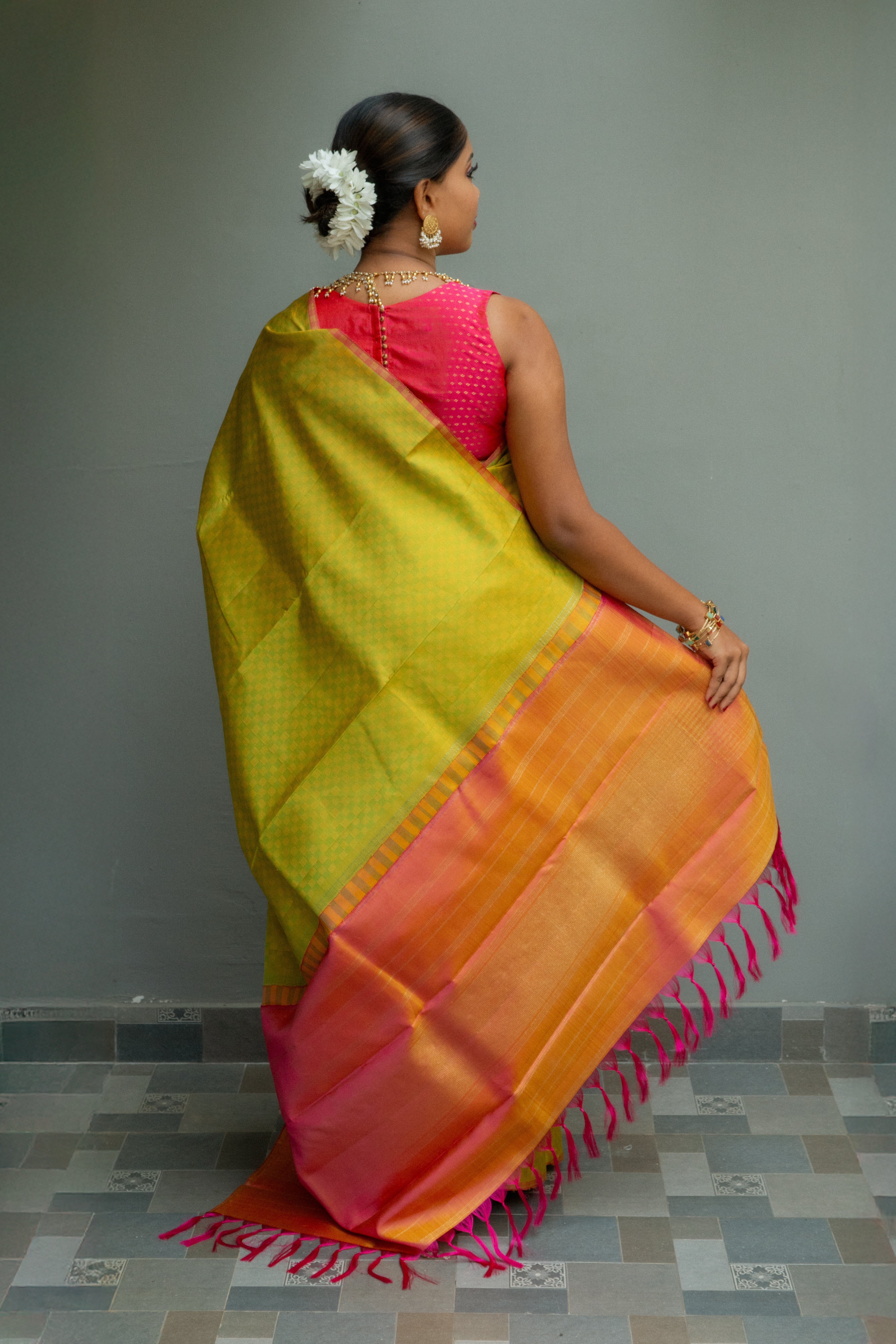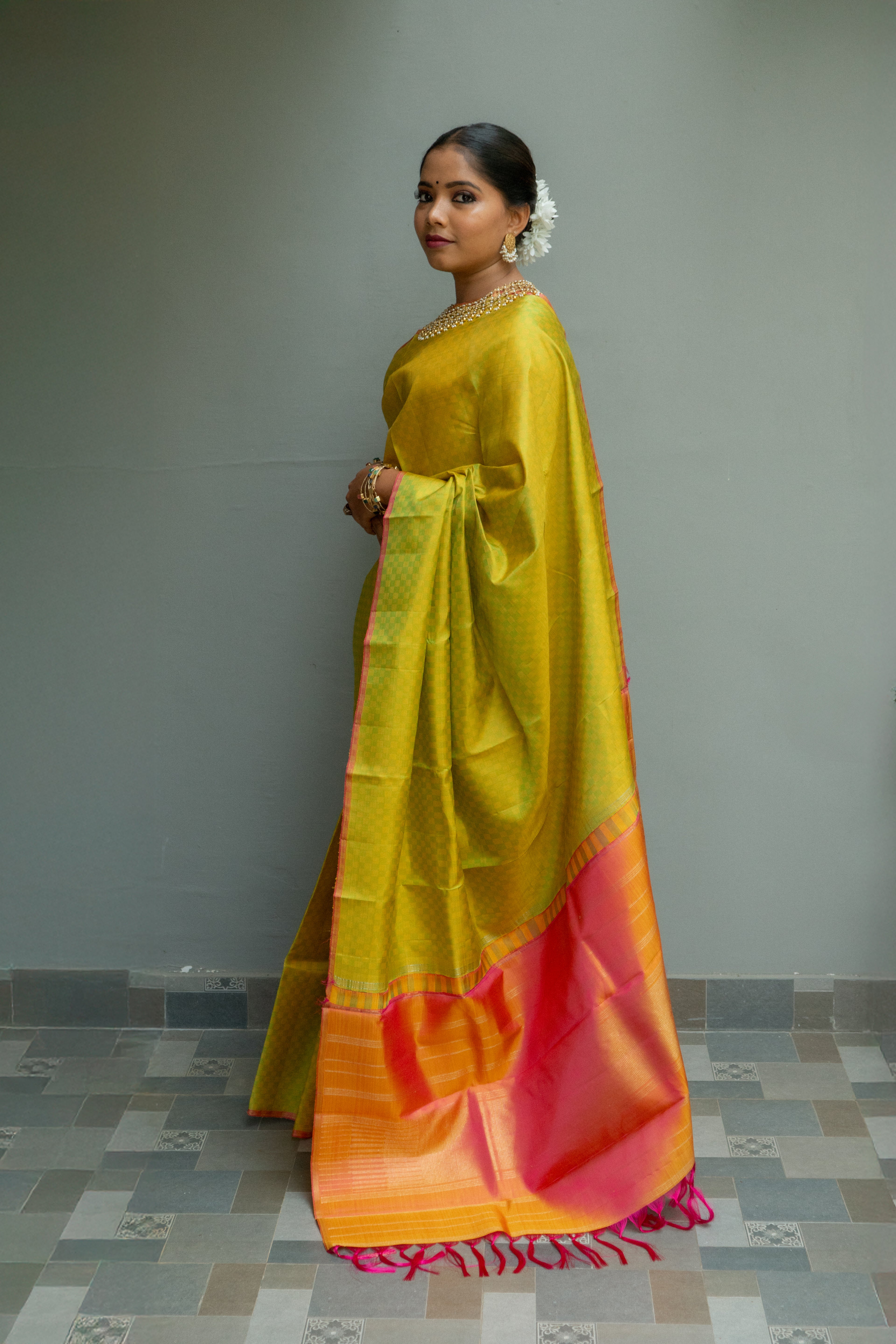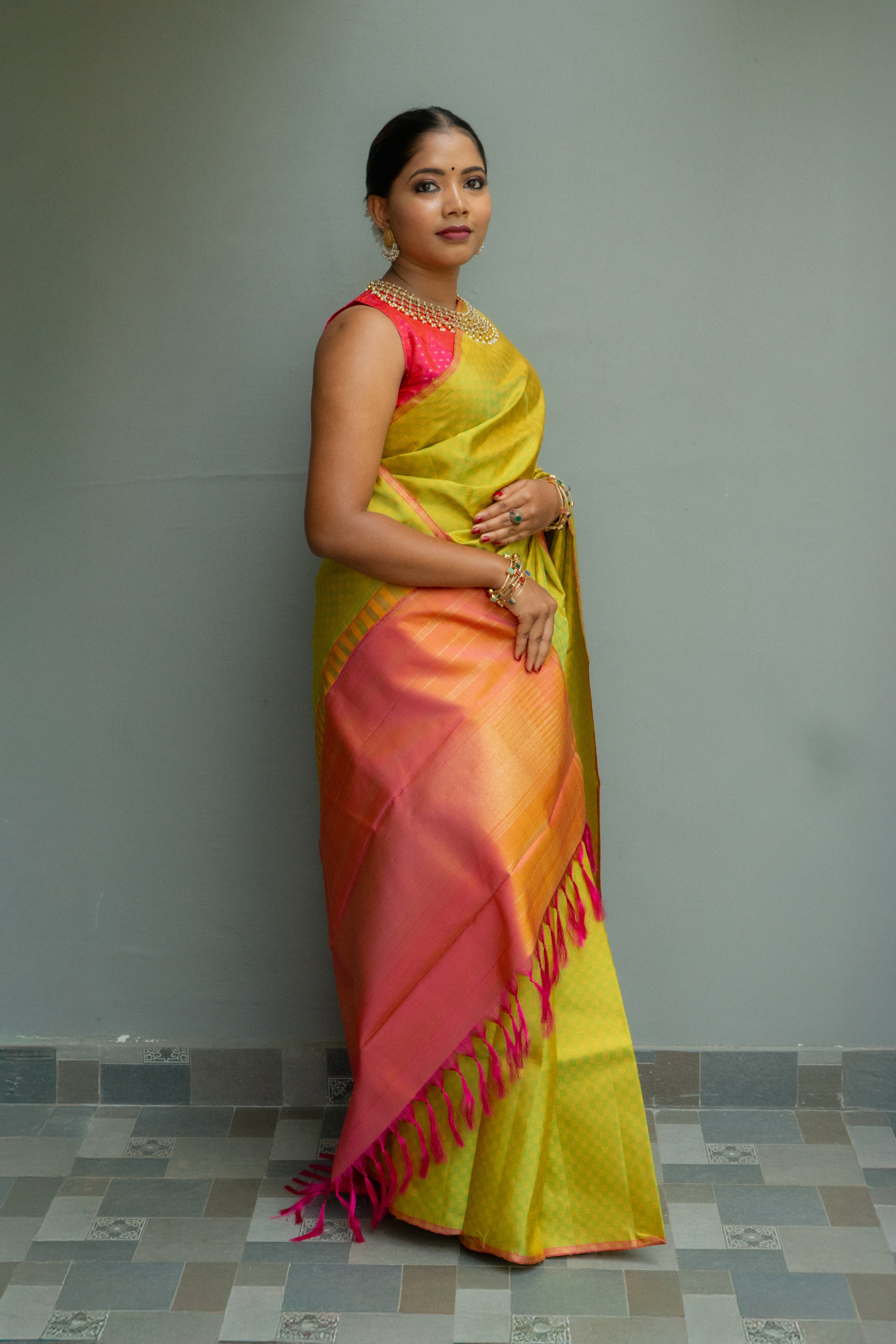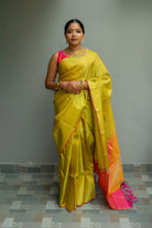 Lemon Yellow Peach Kanjivaram Saree