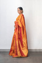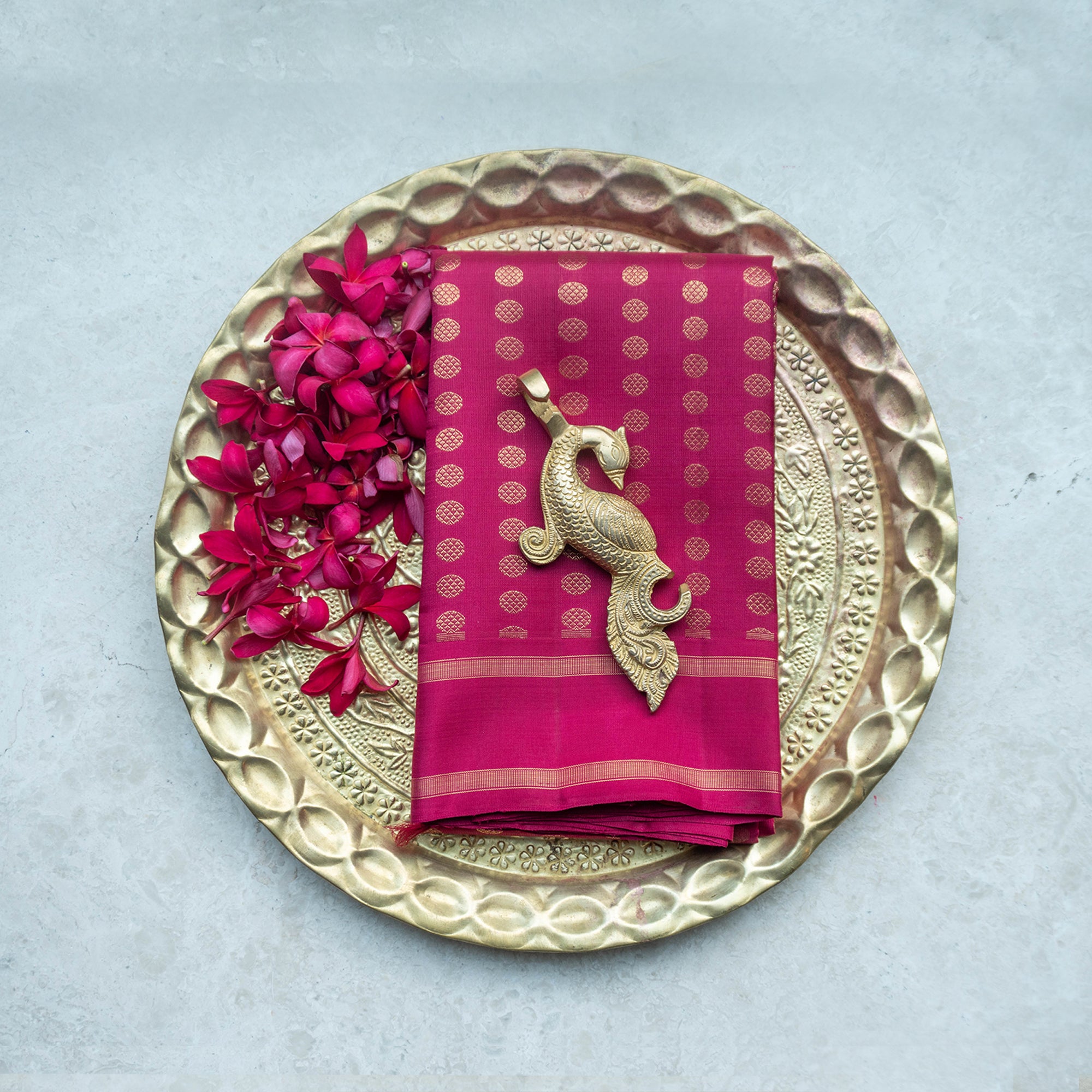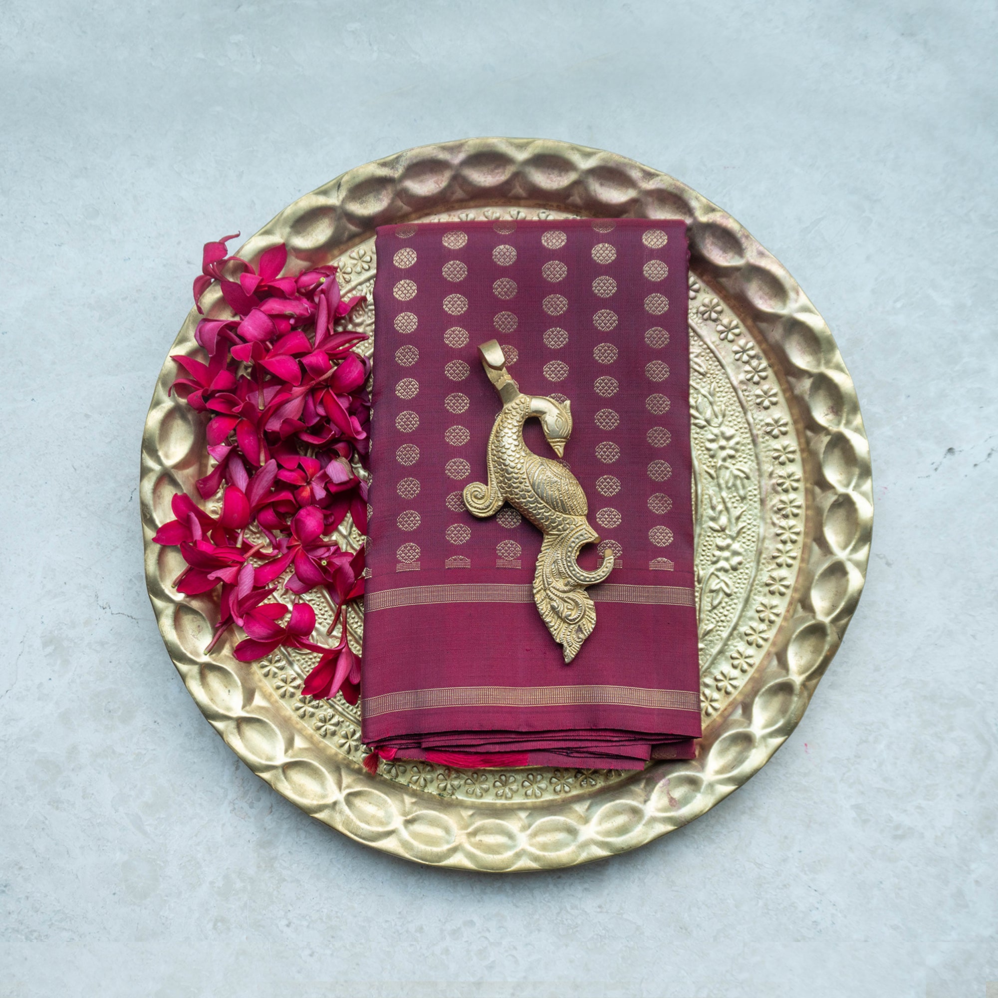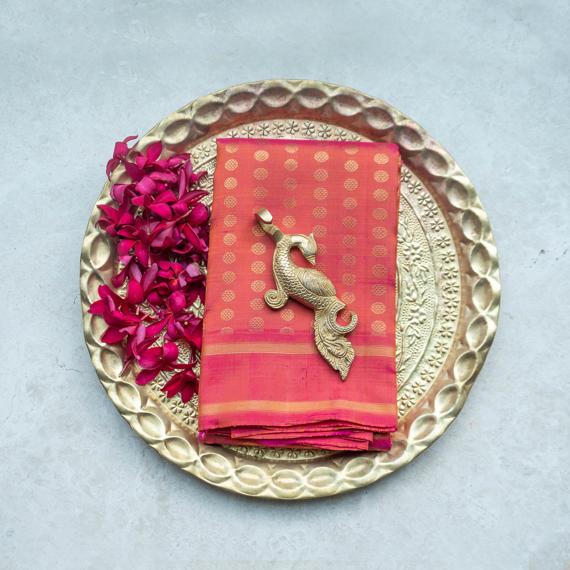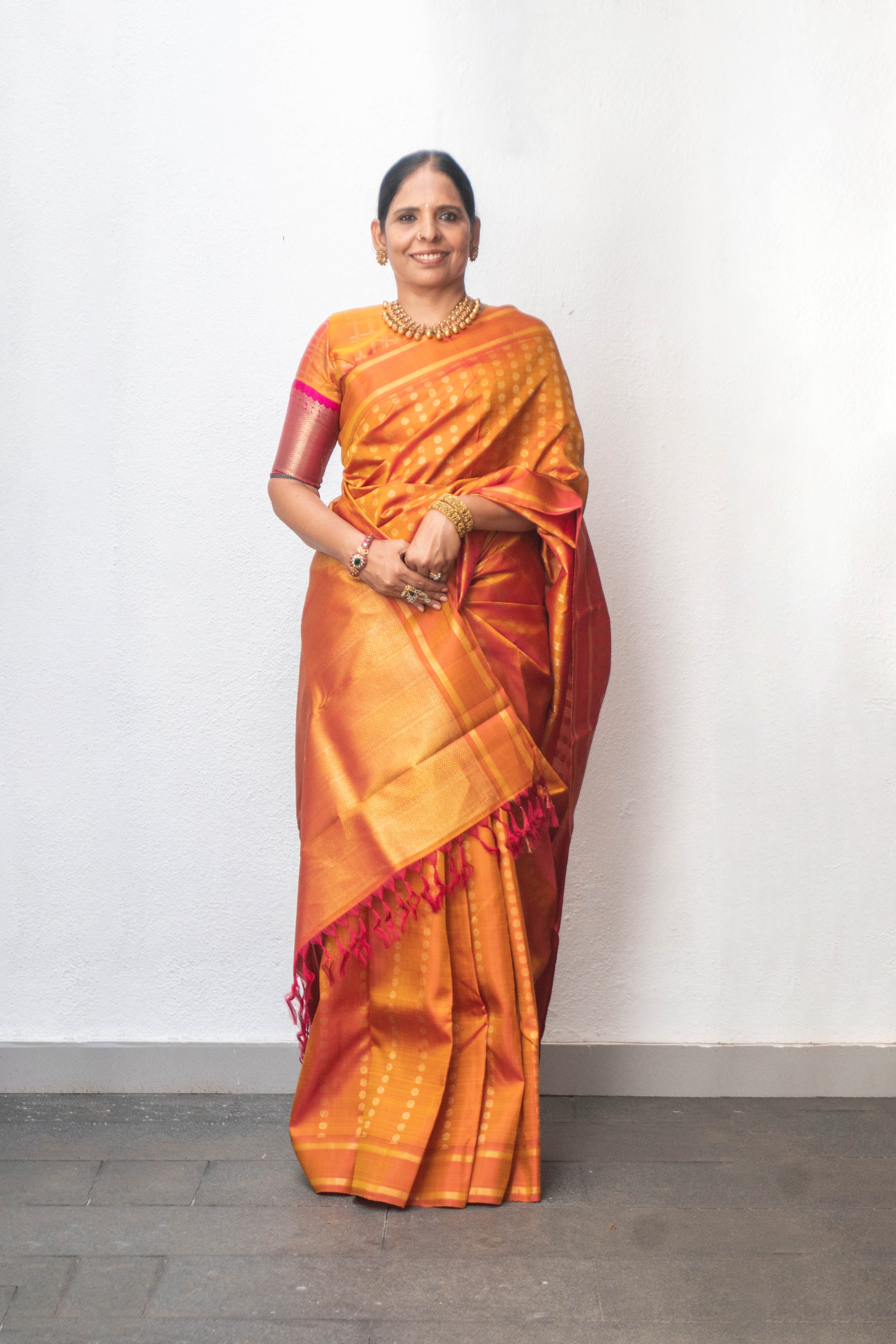 This Mustard Kanjivaram silk saree's body features uniform gold zari polka dot motifs, arranged in delicate linear patterns. Without a contrasting border, the tone-on-tone palette allows the gold zari work to take center stage.