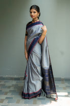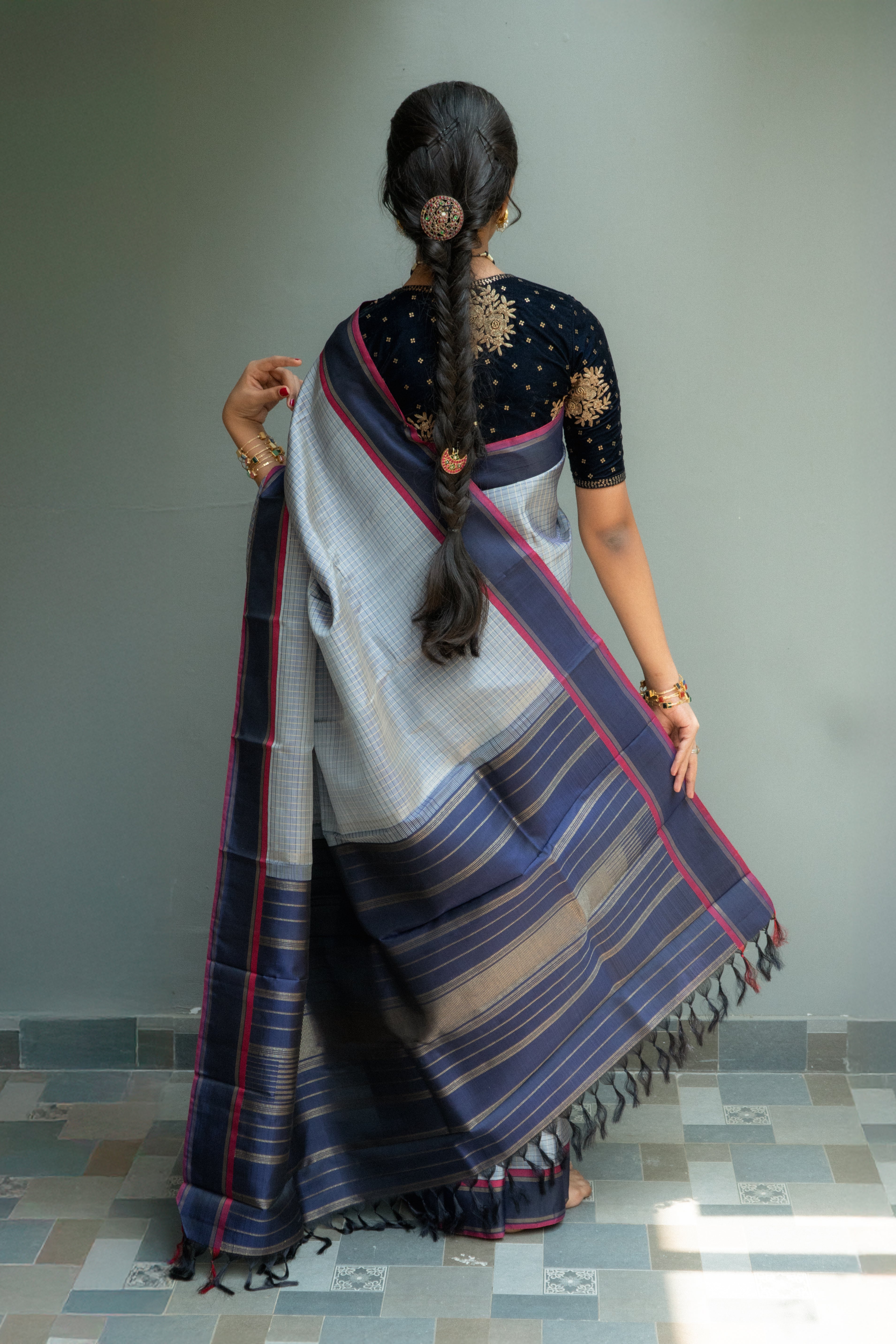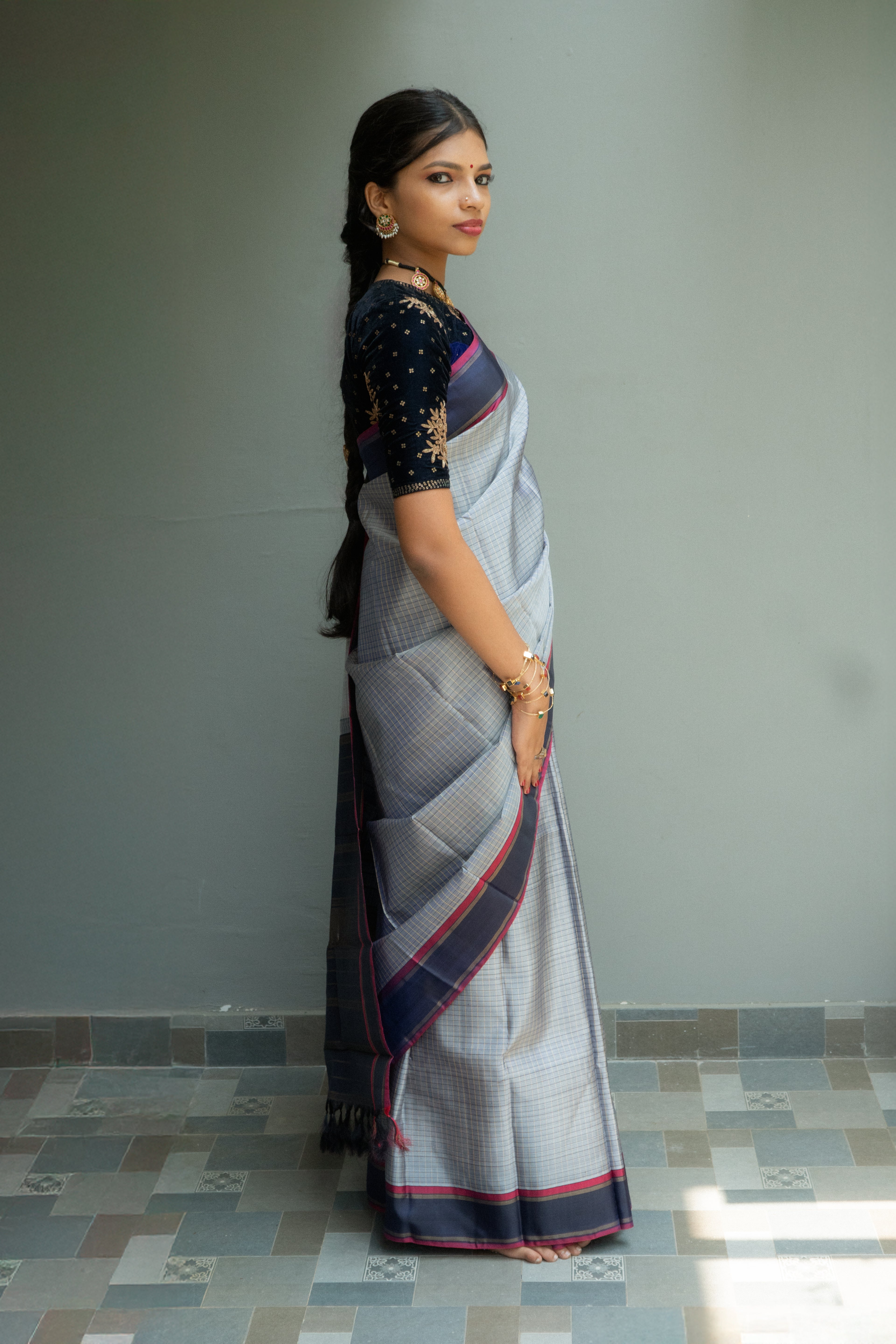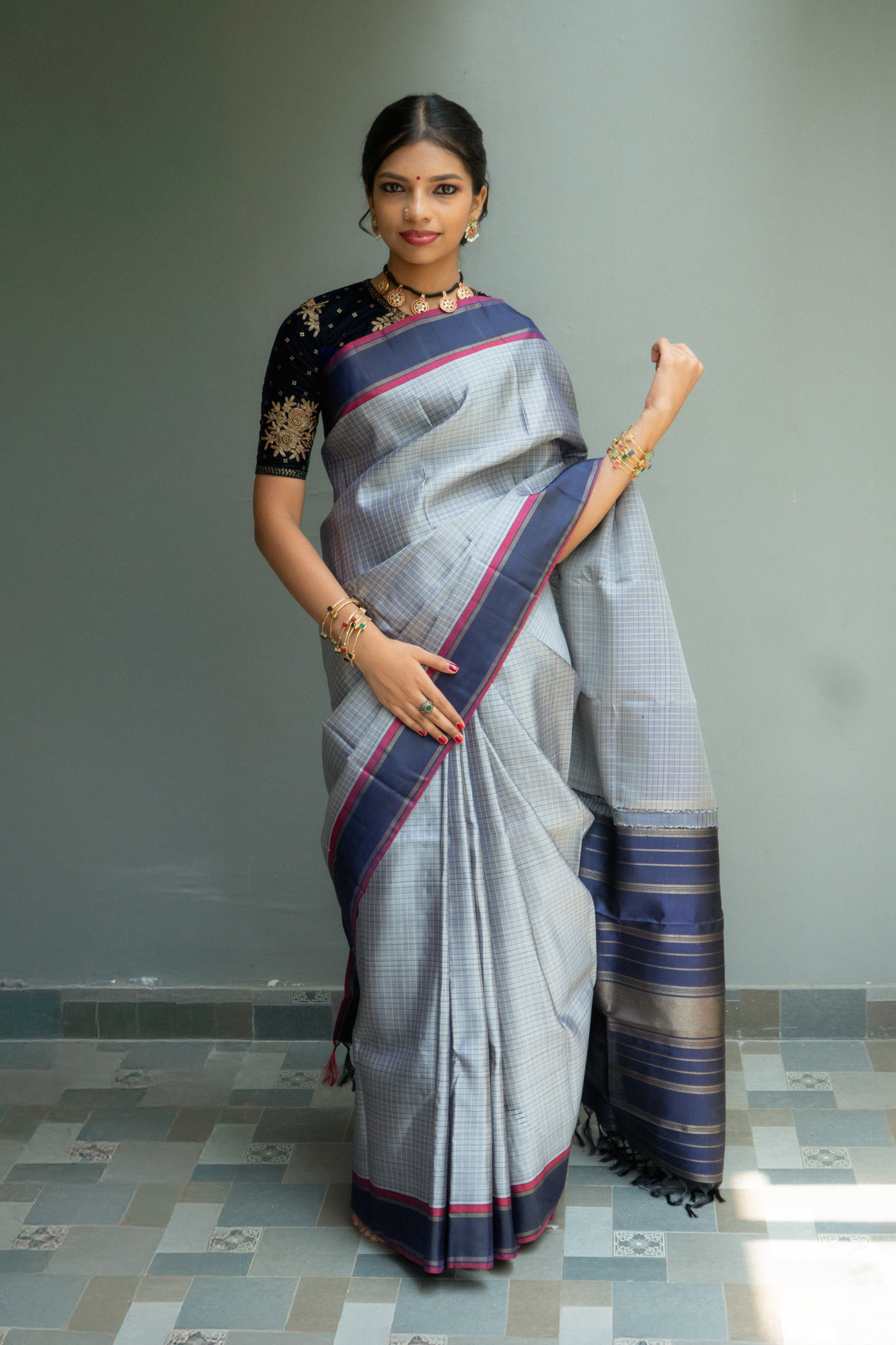 Elegant Grey Shot Blue Kanjivaram silk saree with checks running along the body. The borders are navy blue with bands in gold zari with deep red selvedge. The pallu has a traditional "seeprekku" pattern.