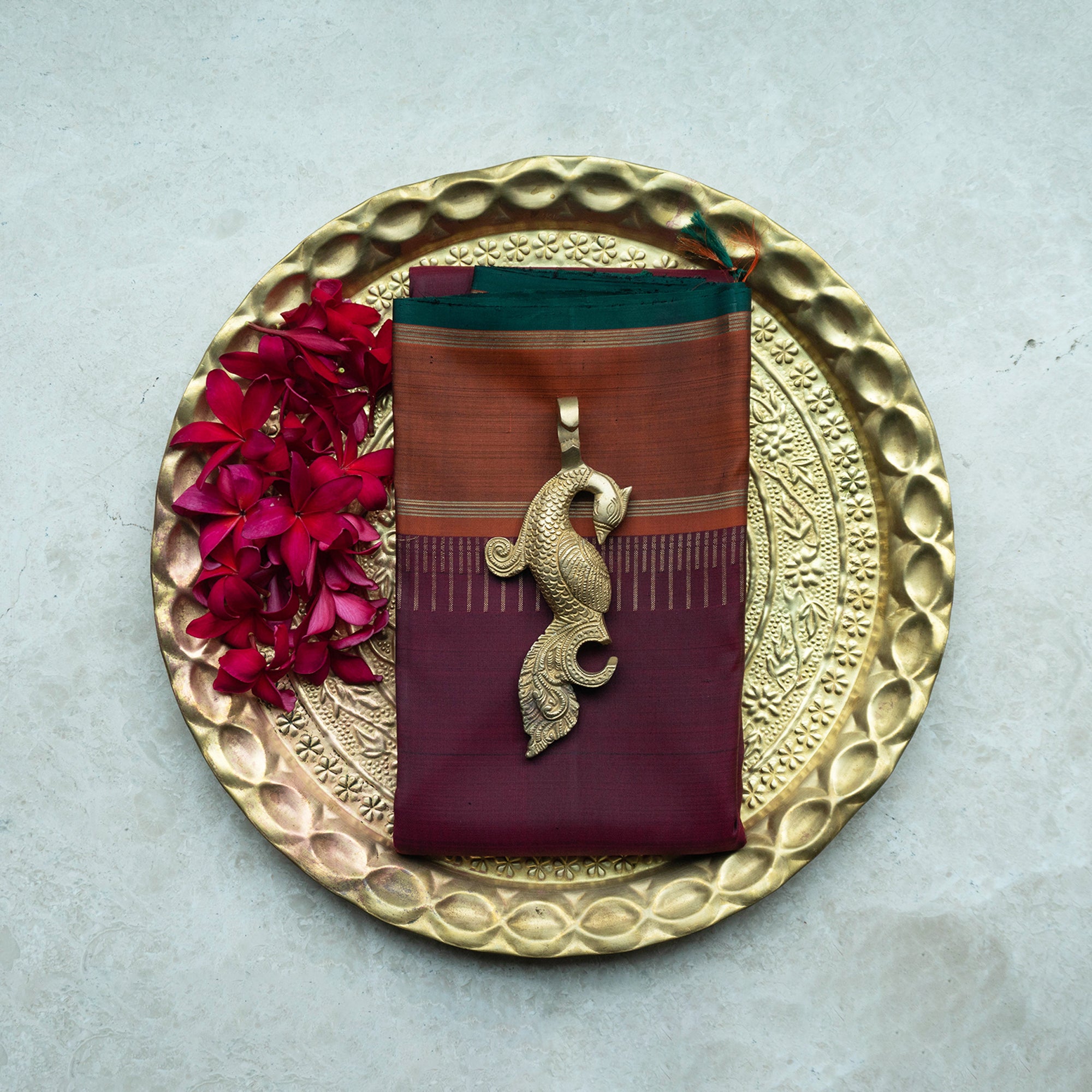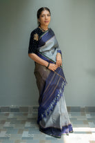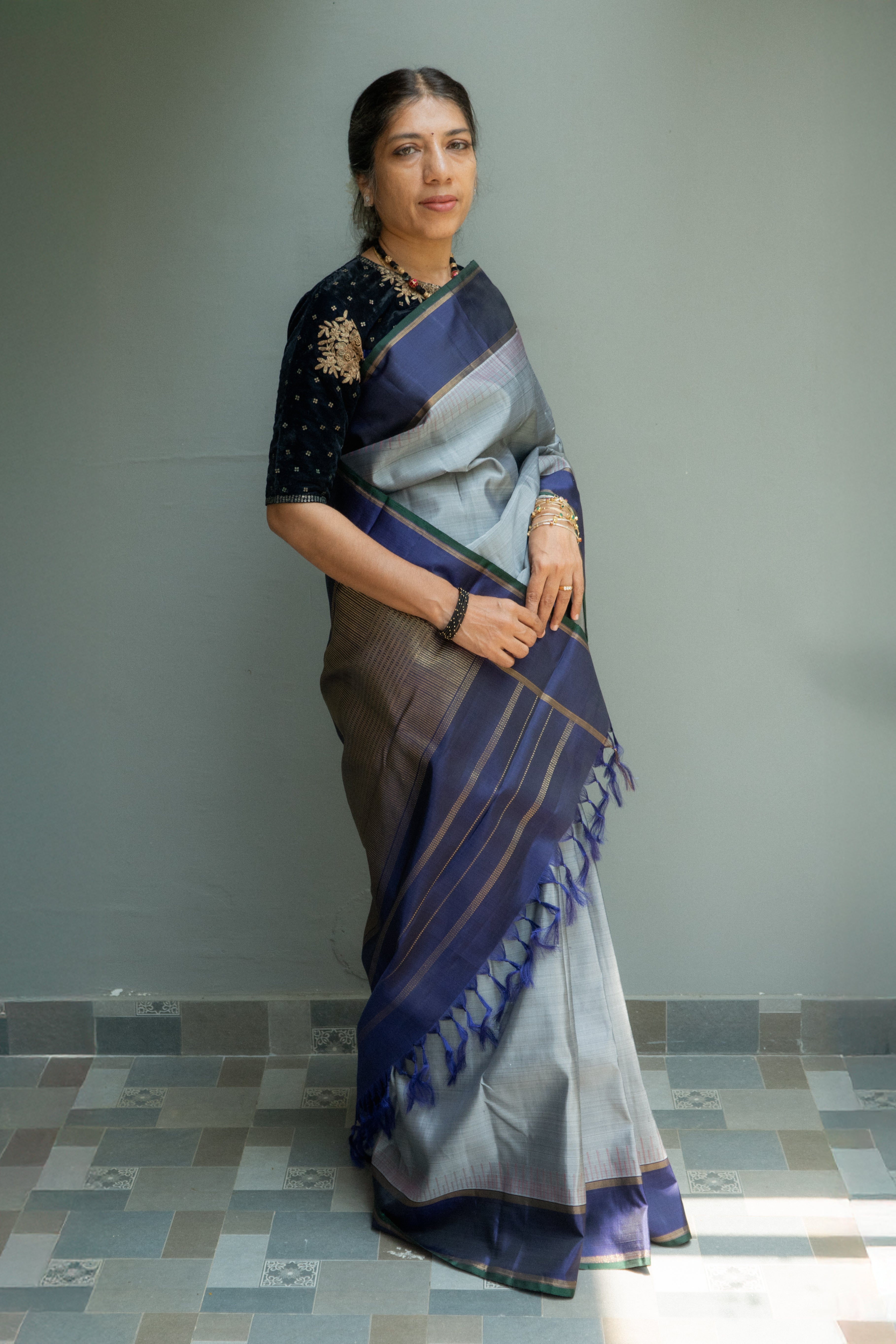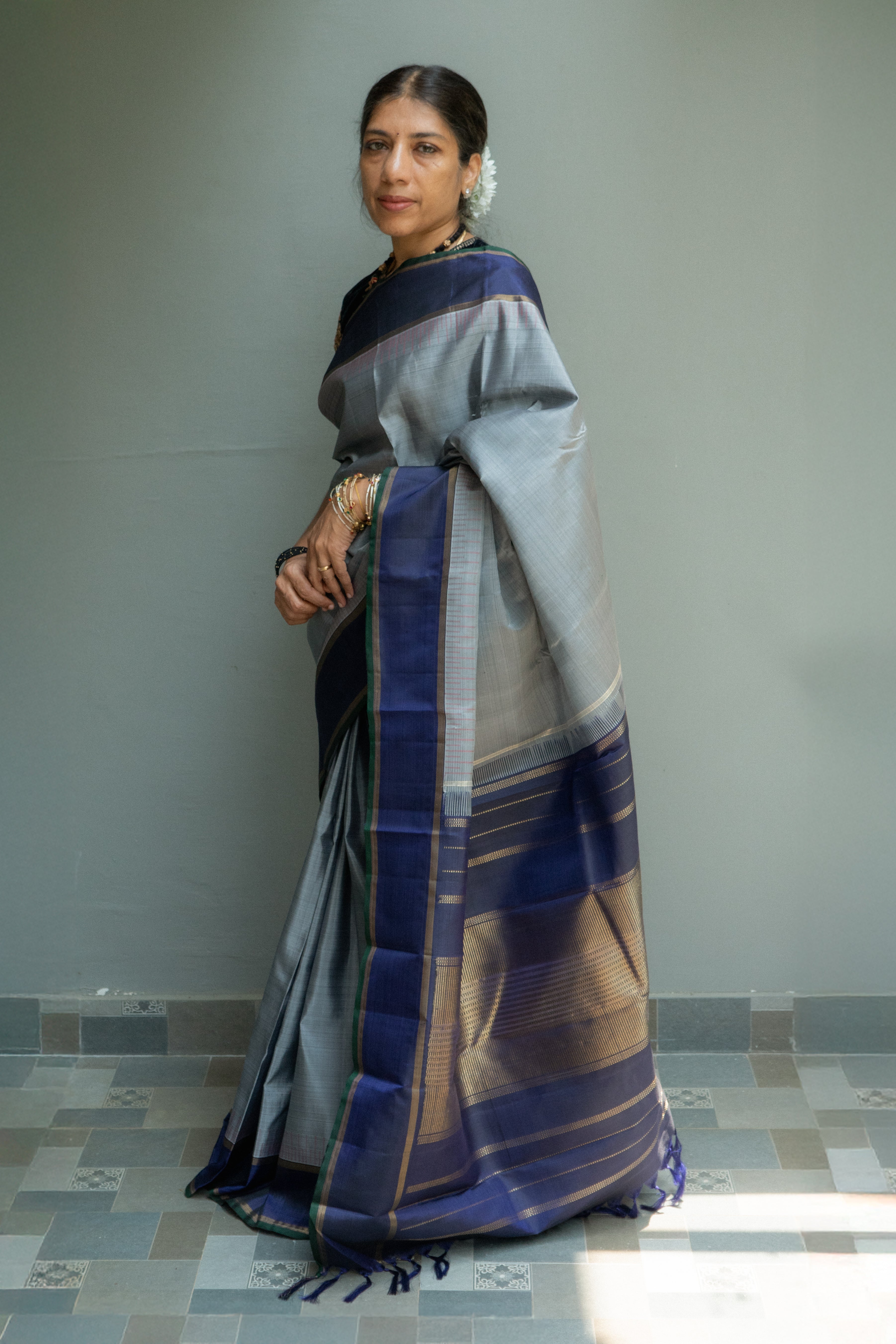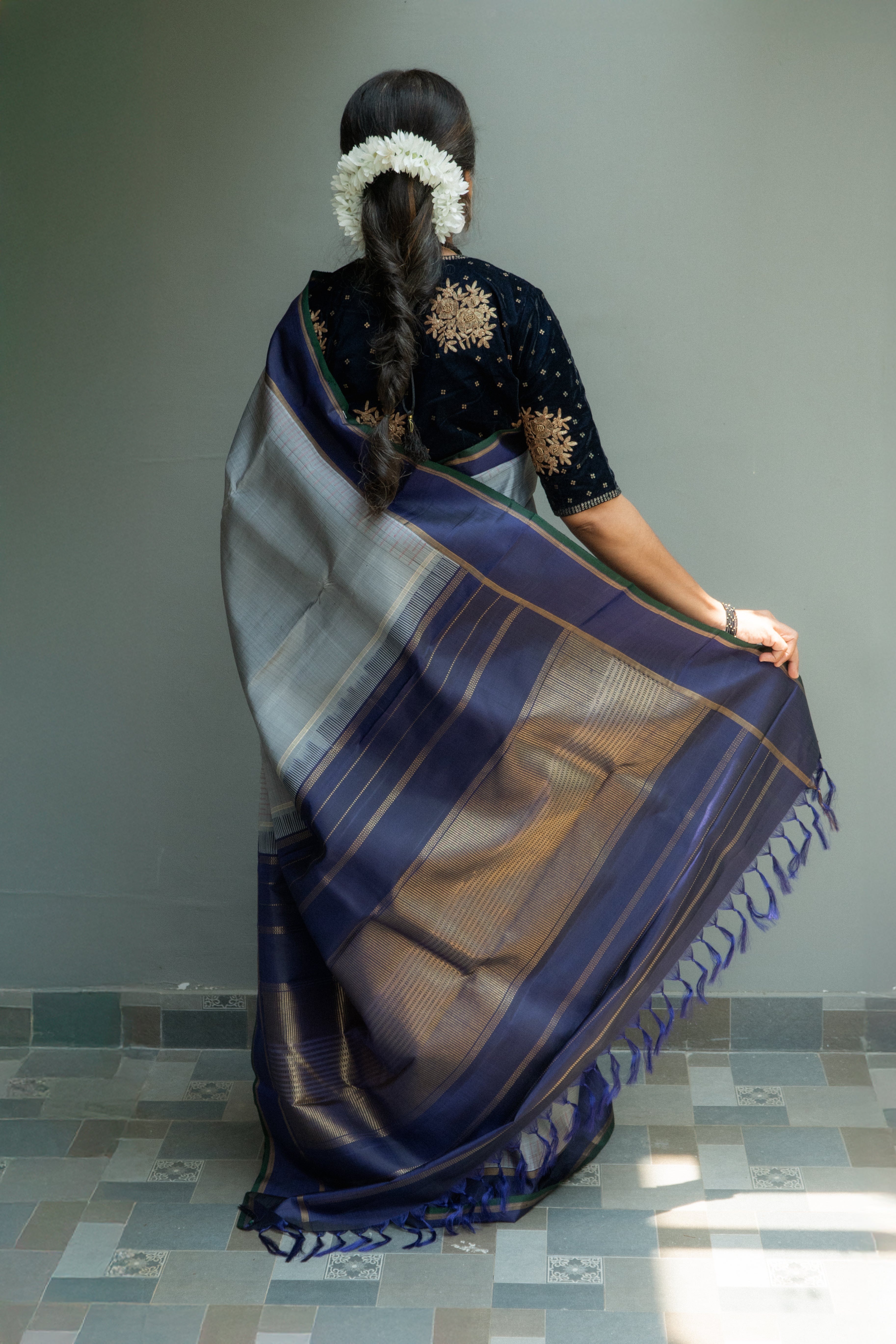 Grey Kanjivaram silk sari flows into a jagged navy blue border with bands of gold zari and bottle green selvedge. The pallu features a traditional "seeprekku" pattern.