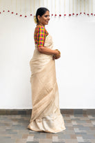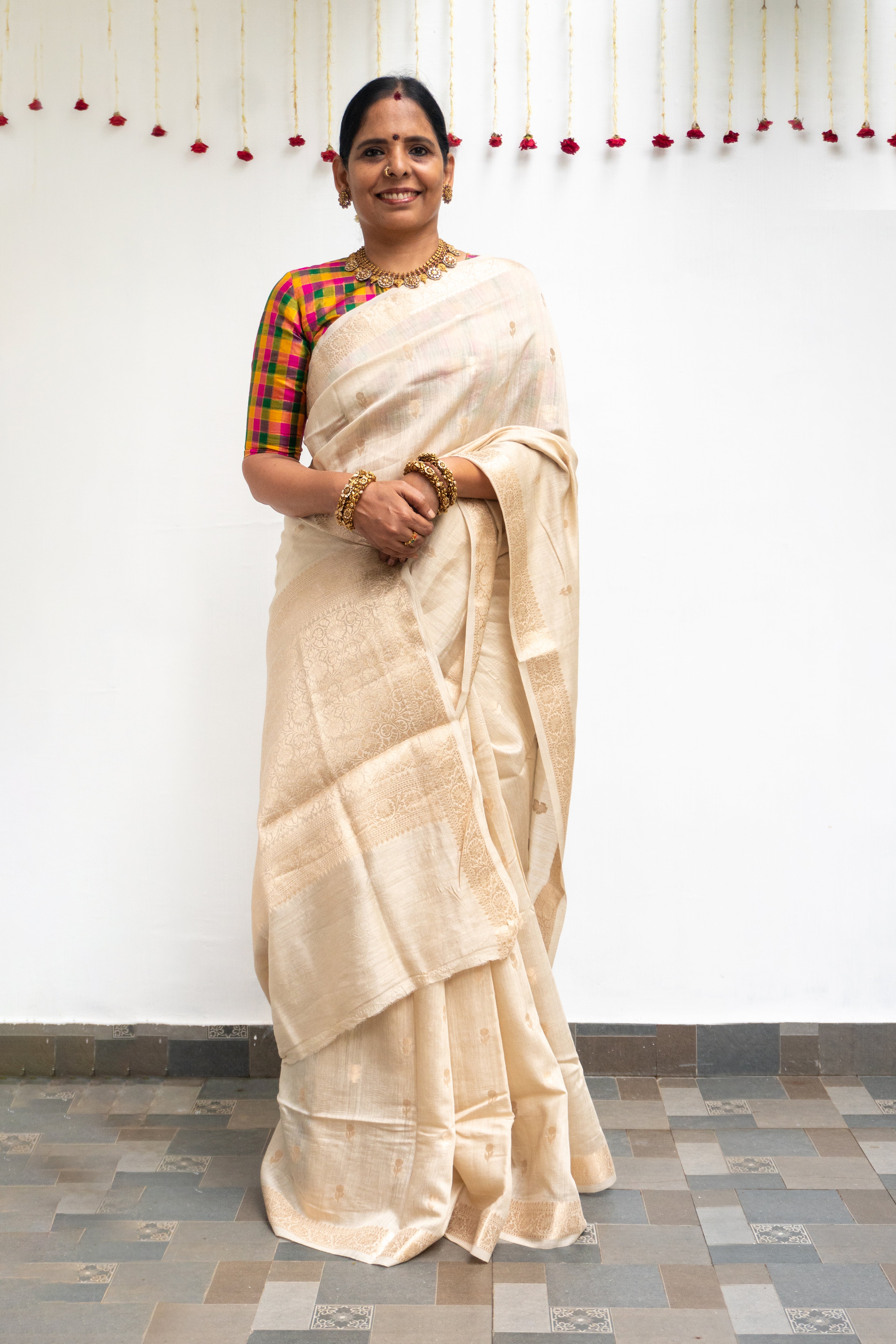 Ivory moonga silk saree adorned with delicate gold zari detailing. The zari borders and motifs add a subtle shimmer, evoking the warmth of the festive spirit.