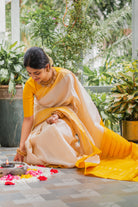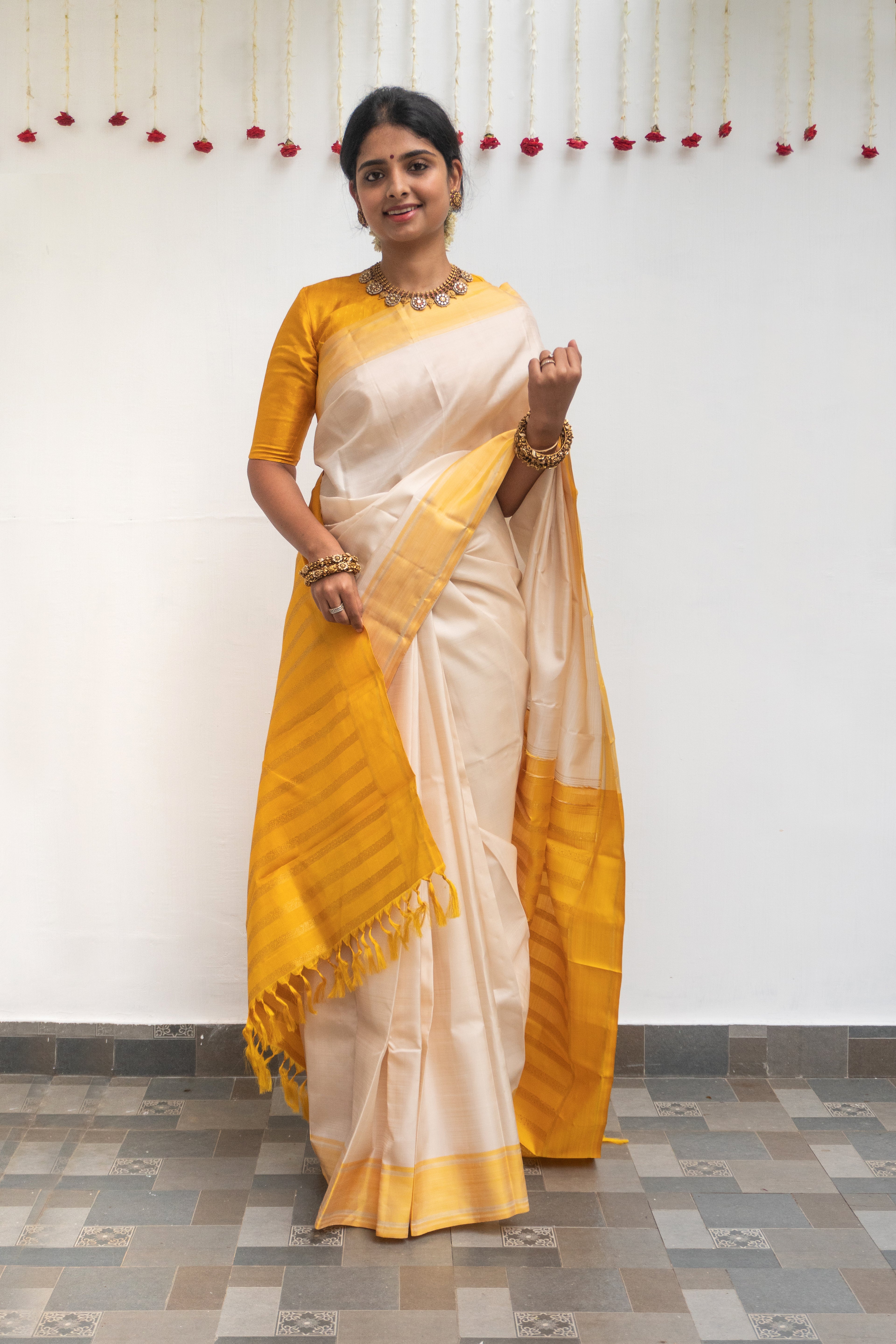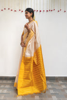 Soft cream body is beautifully framed by contrasting zari borders on both sides, exuding timeless sophistication.
