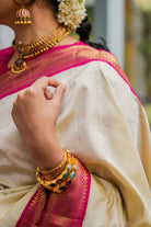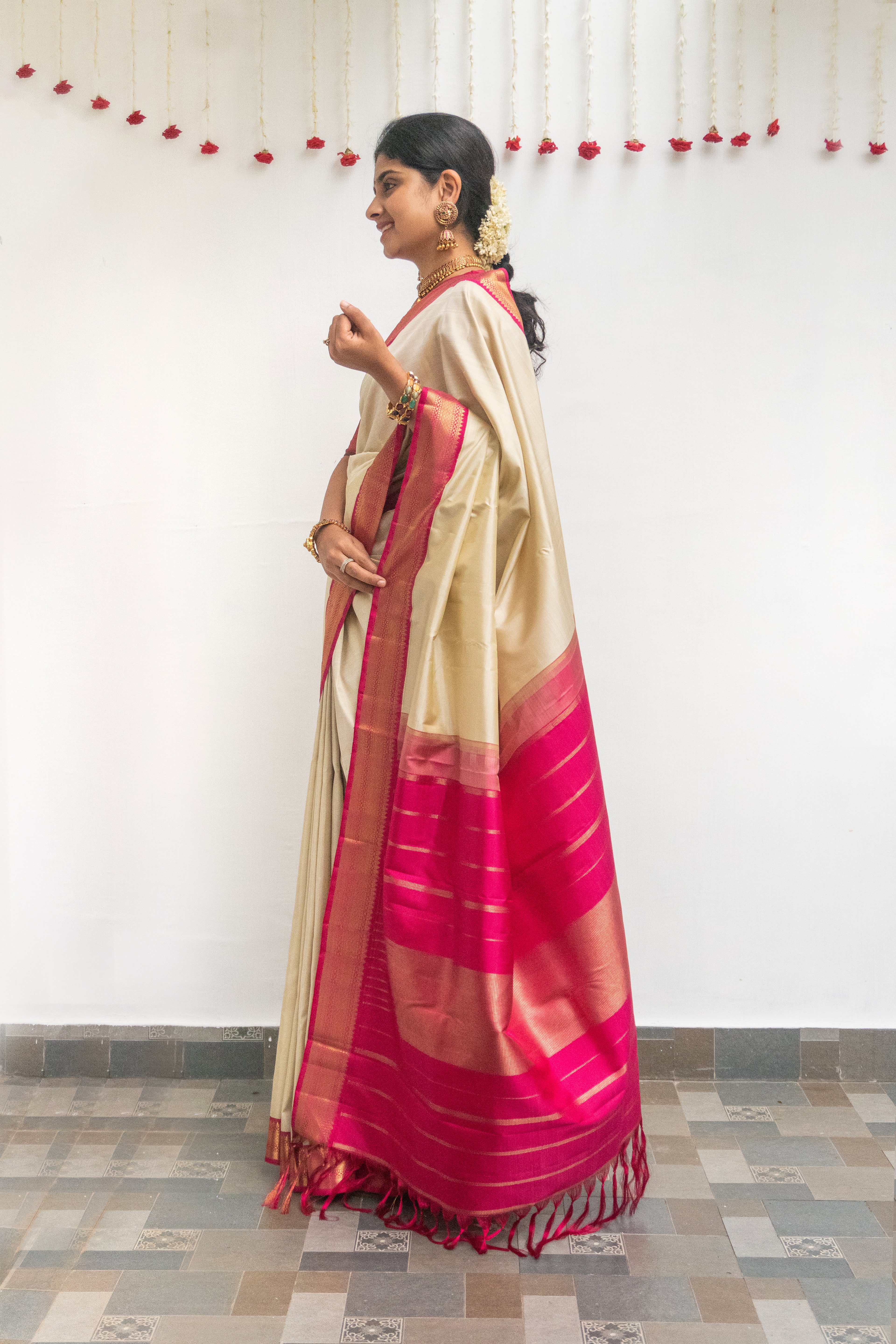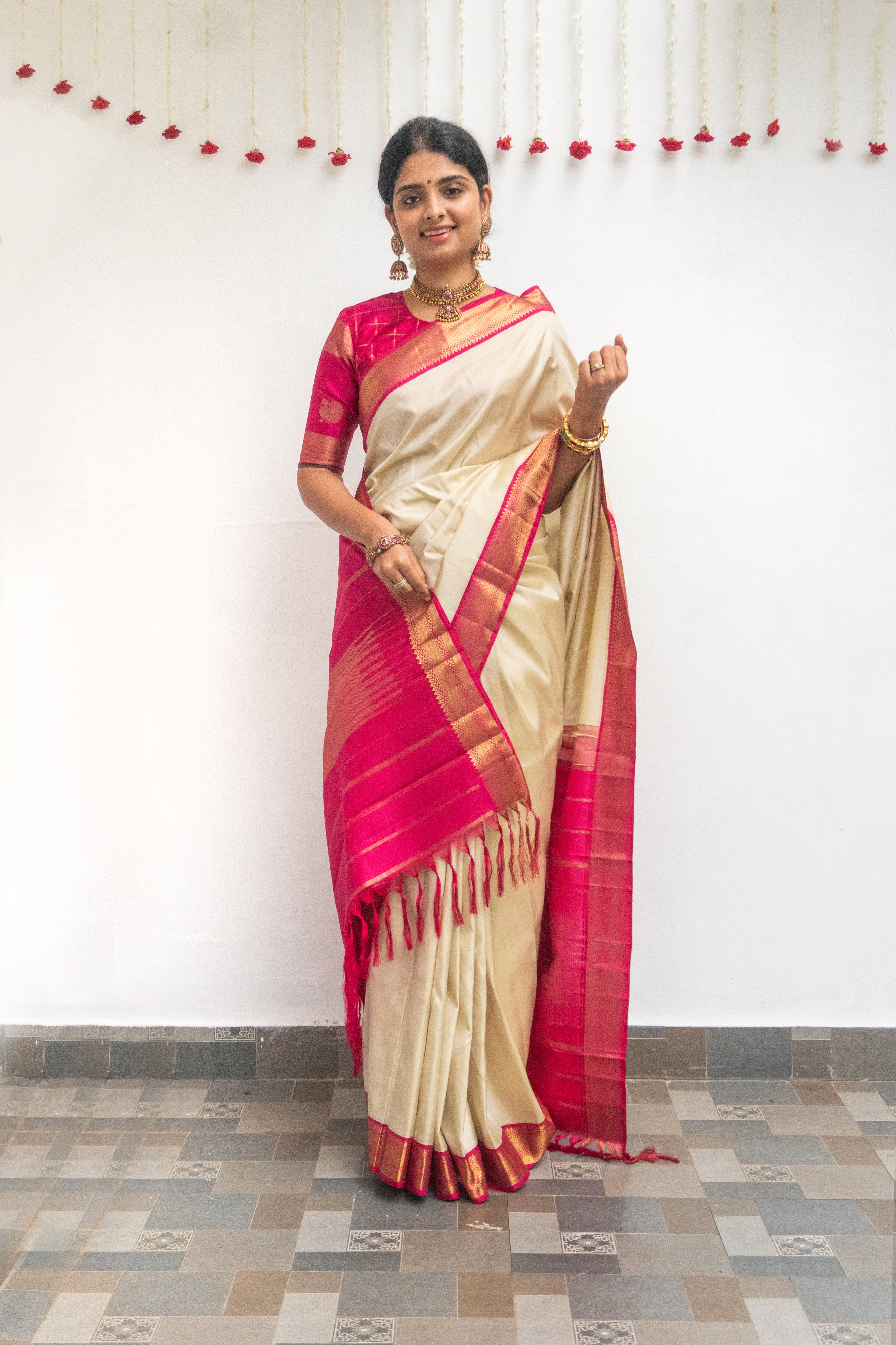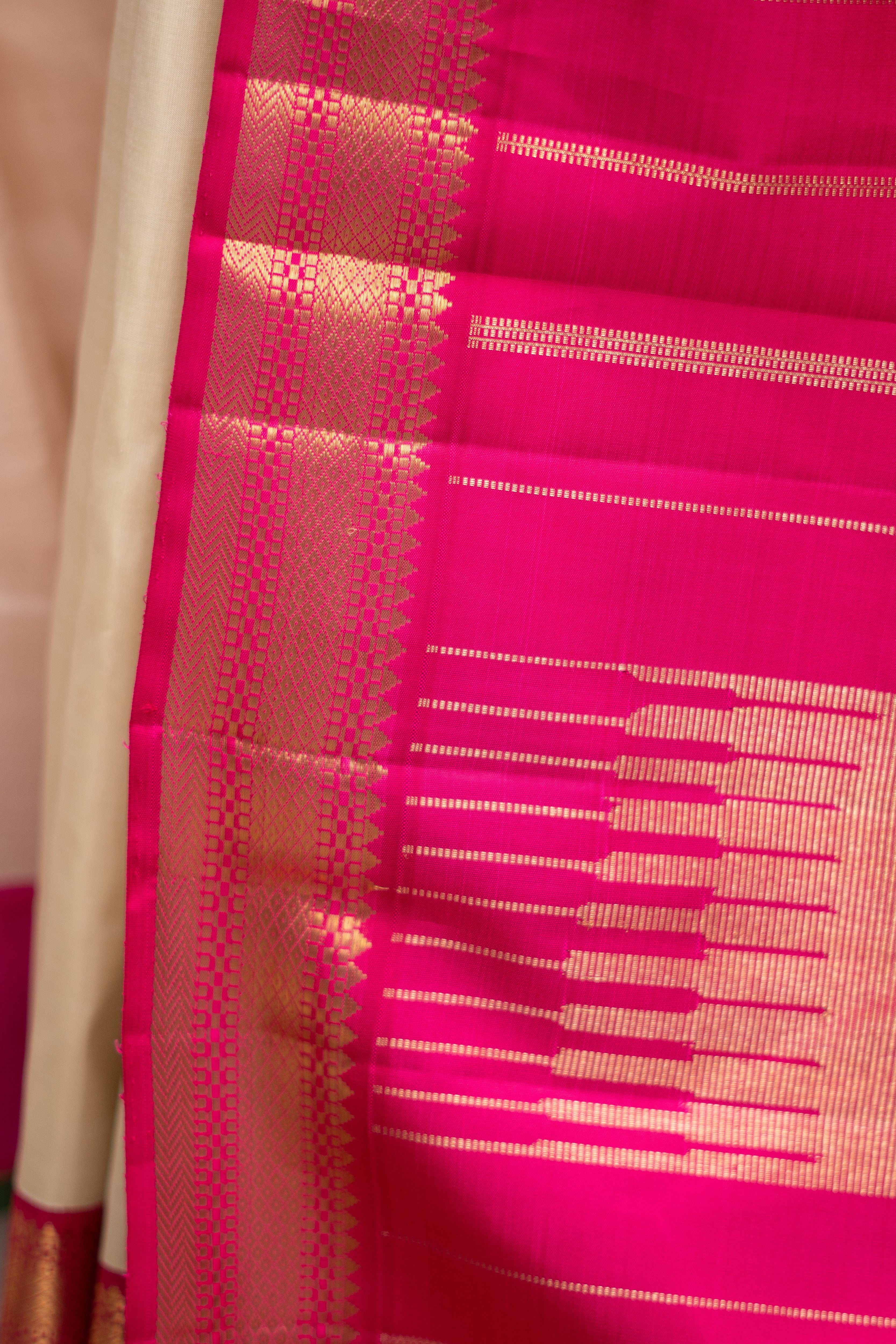 A soft ivory Kanjivaram silk base offers a timeless canvas, beautifully complemented by a rich arakku korvai border. Intricate zari work on the border and pallu elevates the saree’s grandeur, making it a perfect choice for weddings, festive celebrations, and traditional gatherings.