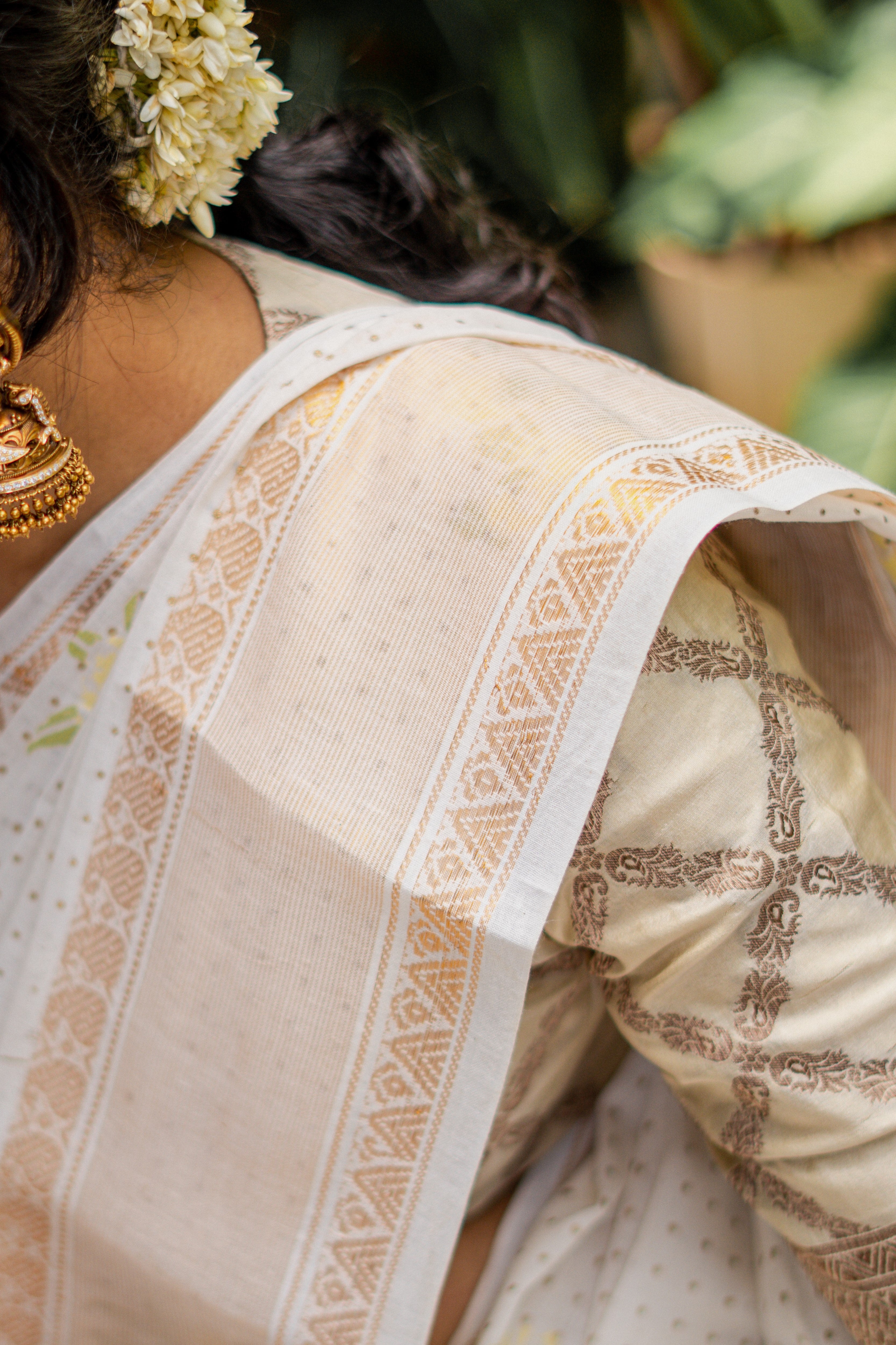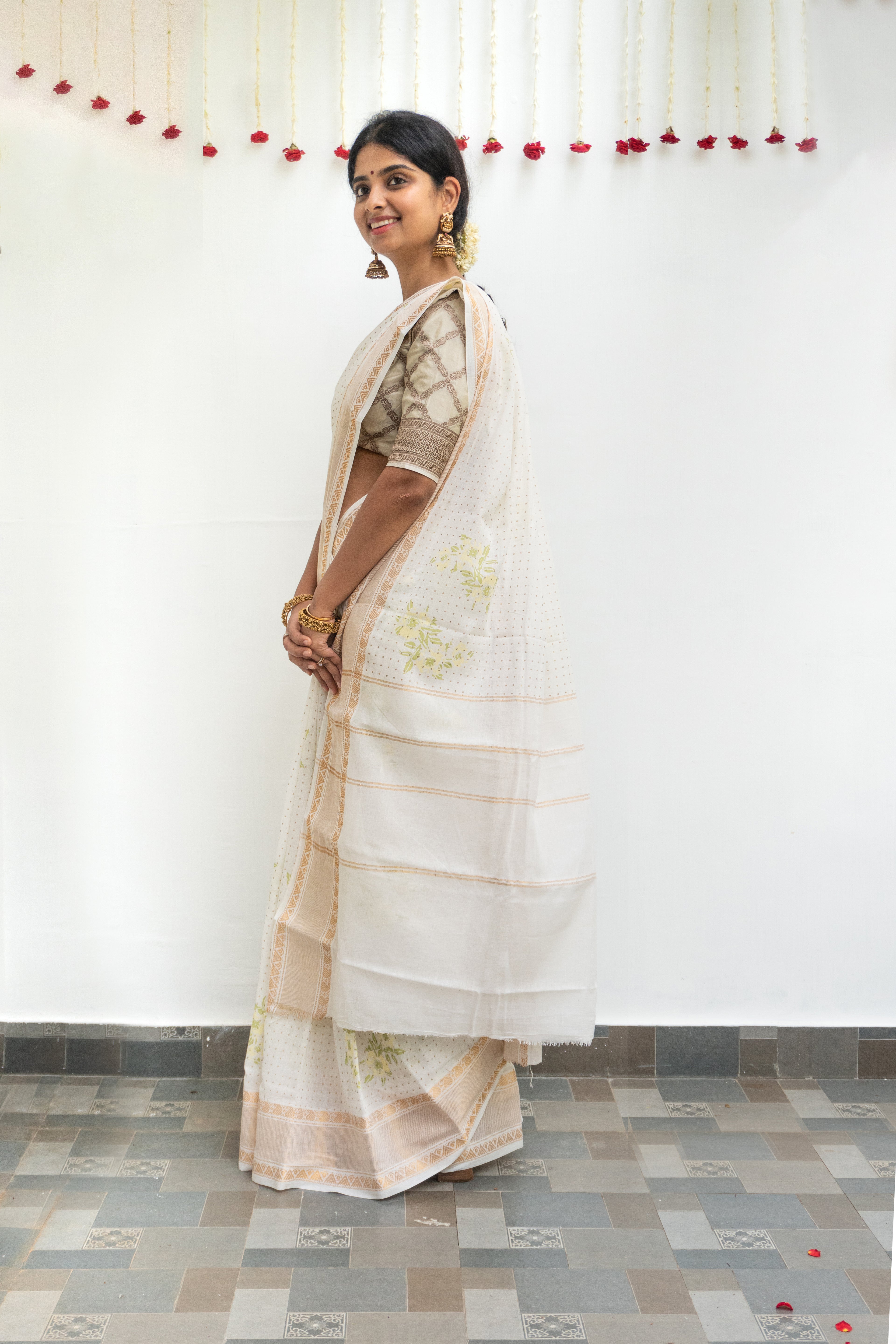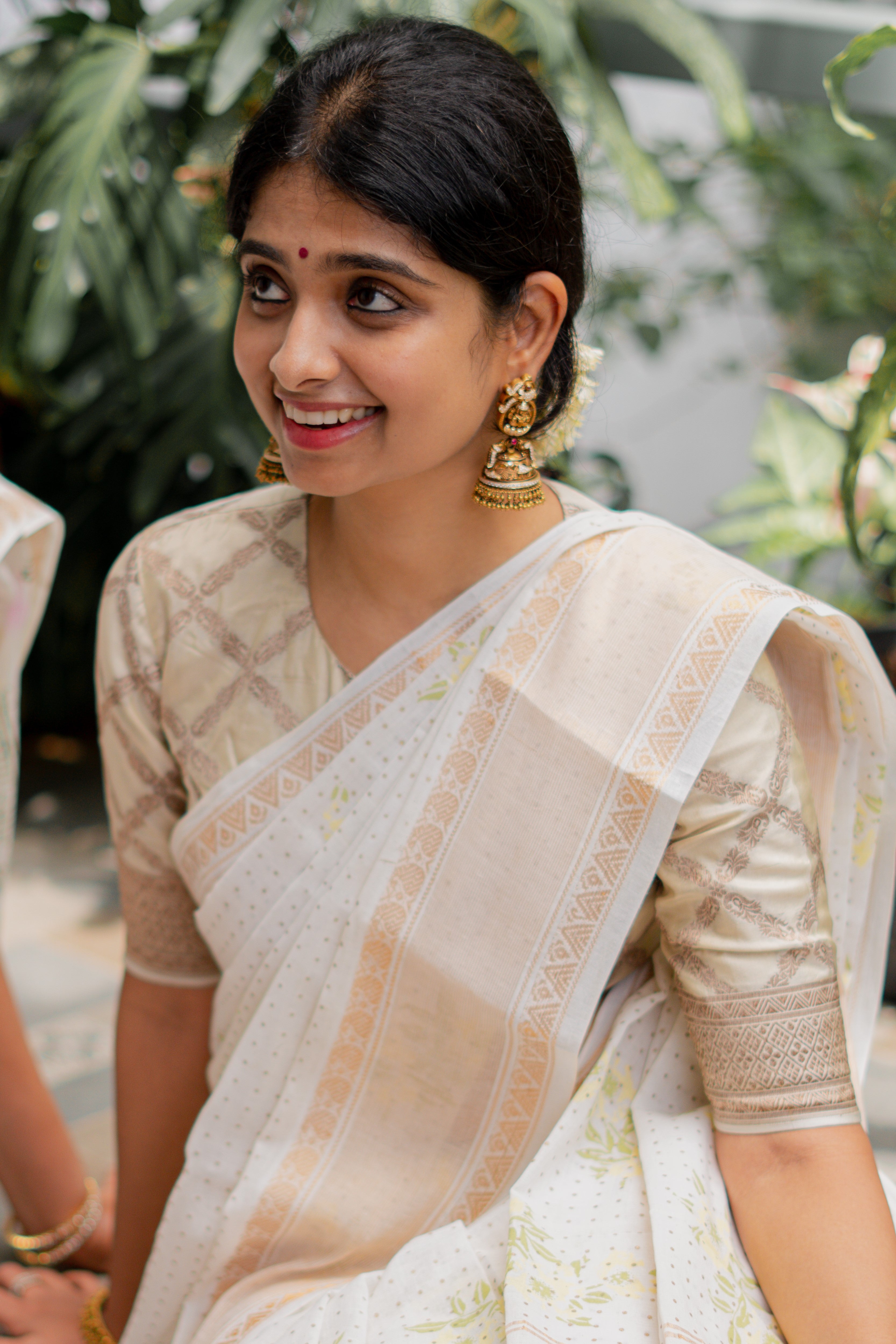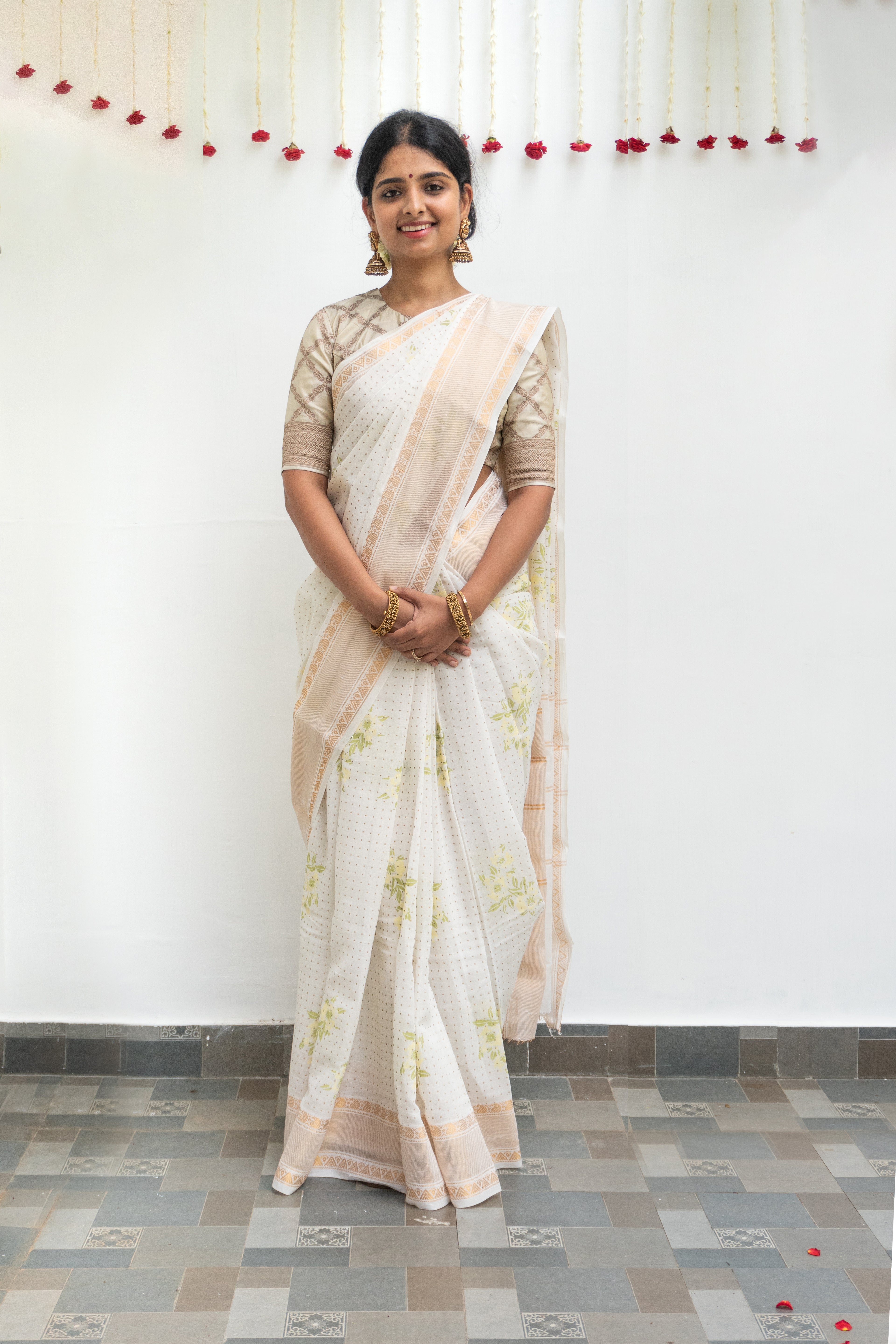 Celebrate in comfort and style with this lightweight, breathable handloom cotton saree. Adorned with delicate hand block printed motifs across the body, this saree offers effortless grace for festive occasions. Its soft cotton drape ensures all-day comfort, making it an ideal choice for celebrations, pujas, or summer weddings.
