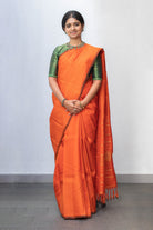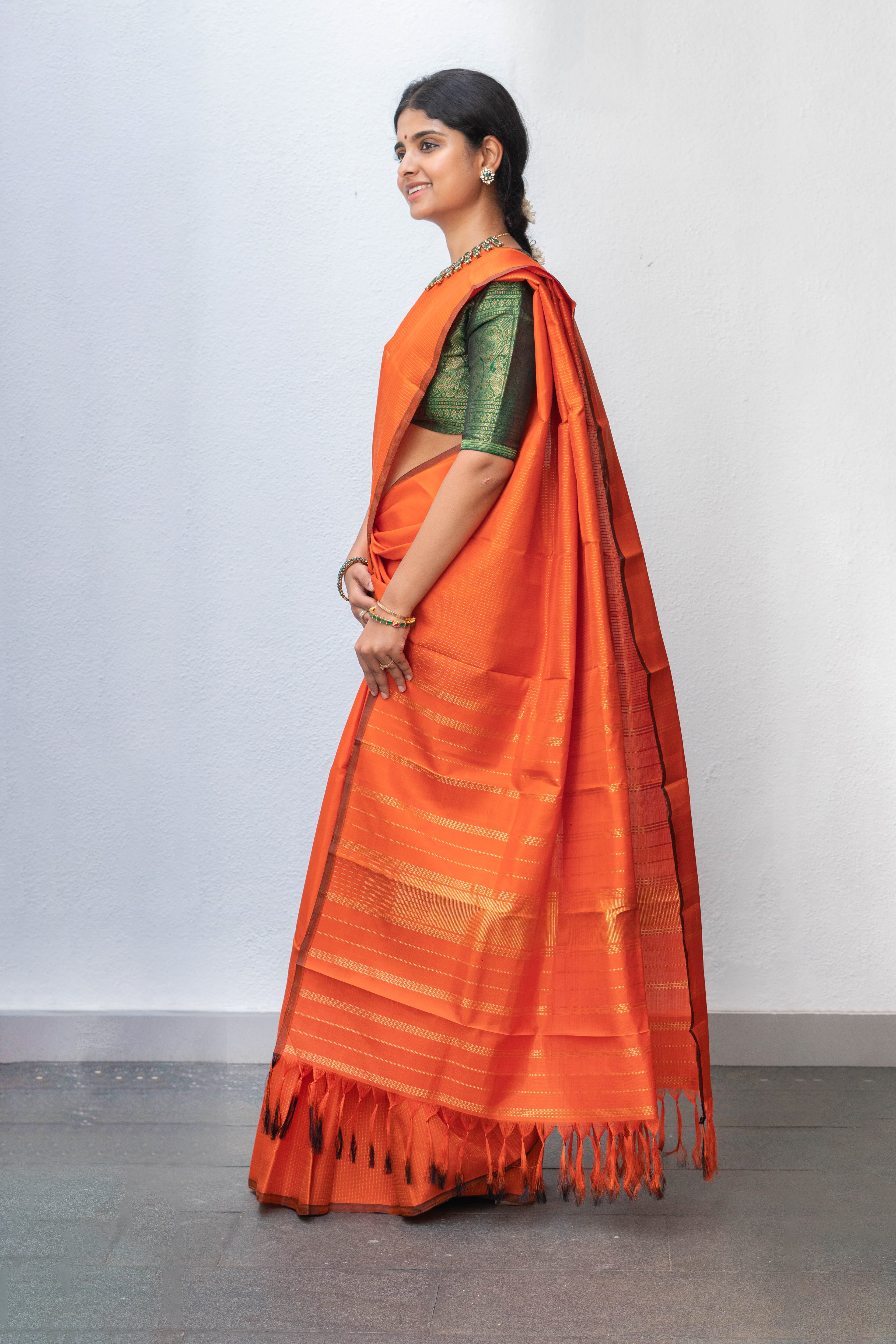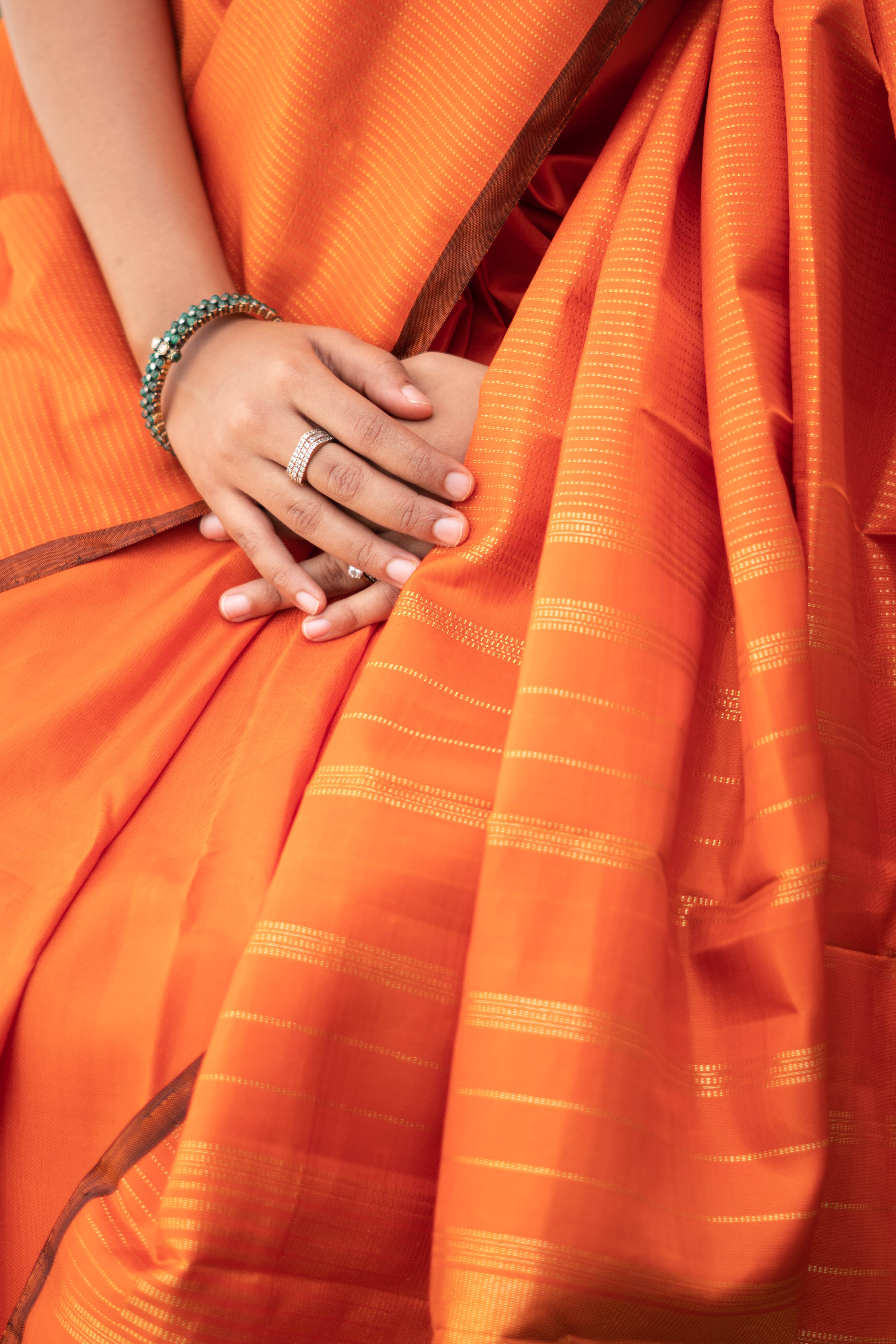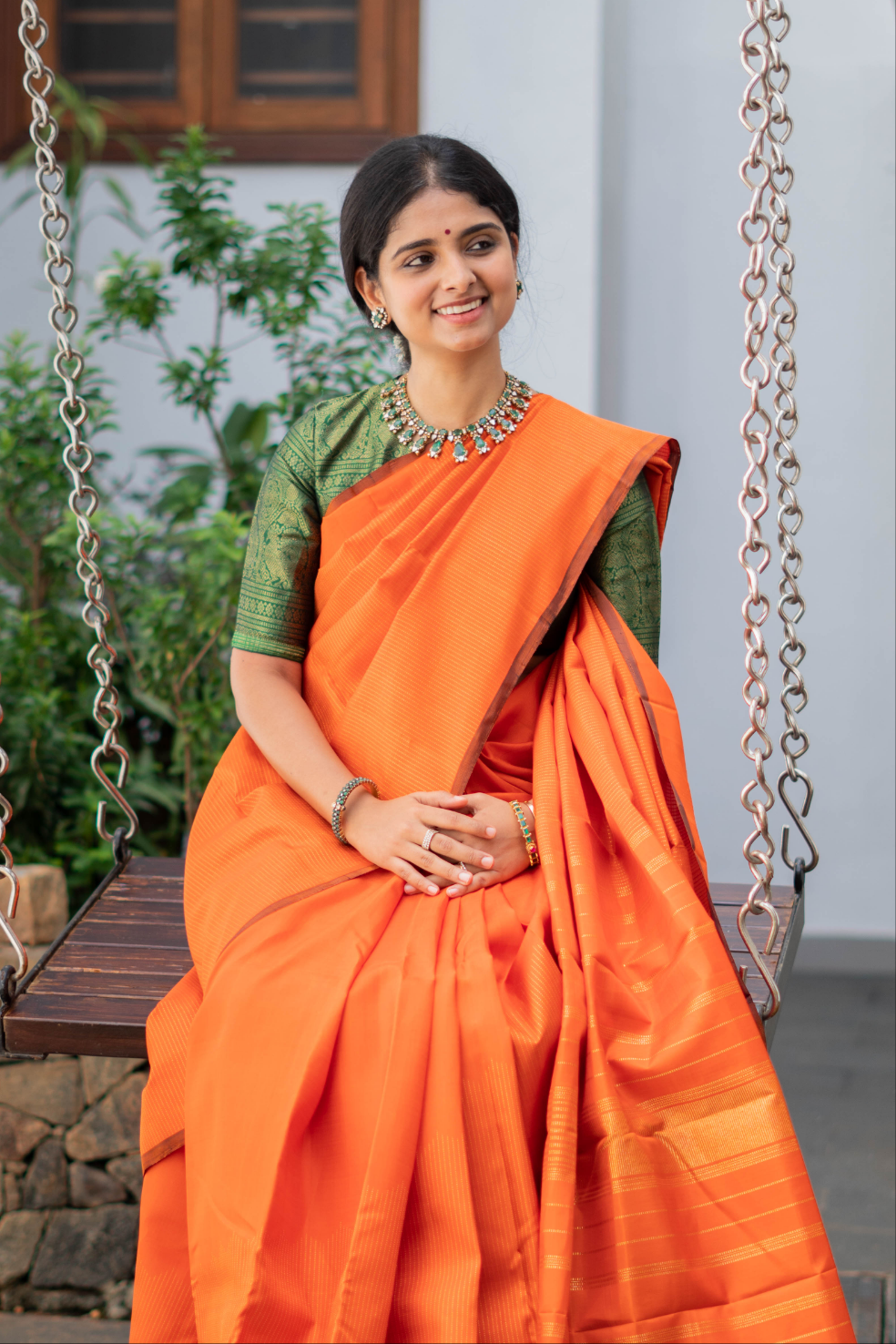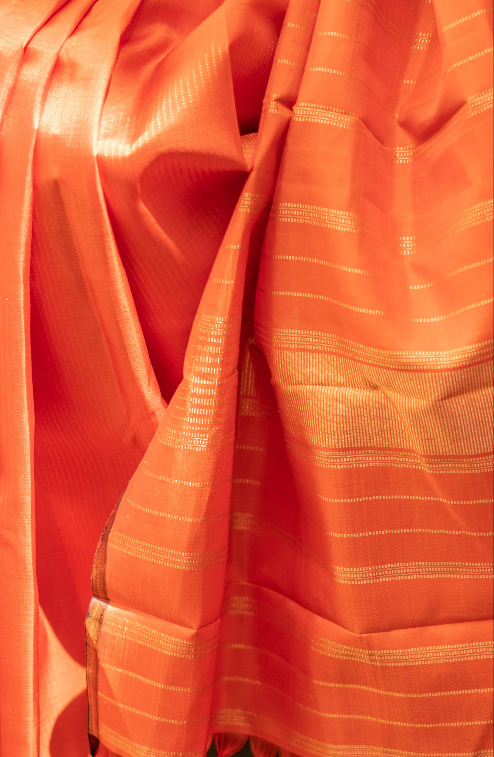 Pure kanjivaram silk saree crafted using the finest of threads. The saree features a vibrant Fanta orange base with rising gold zari lines. The pallu has a traditional “seepreku” design.