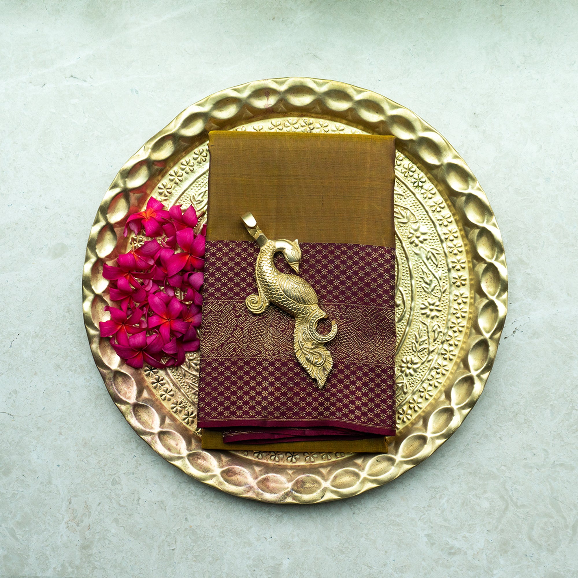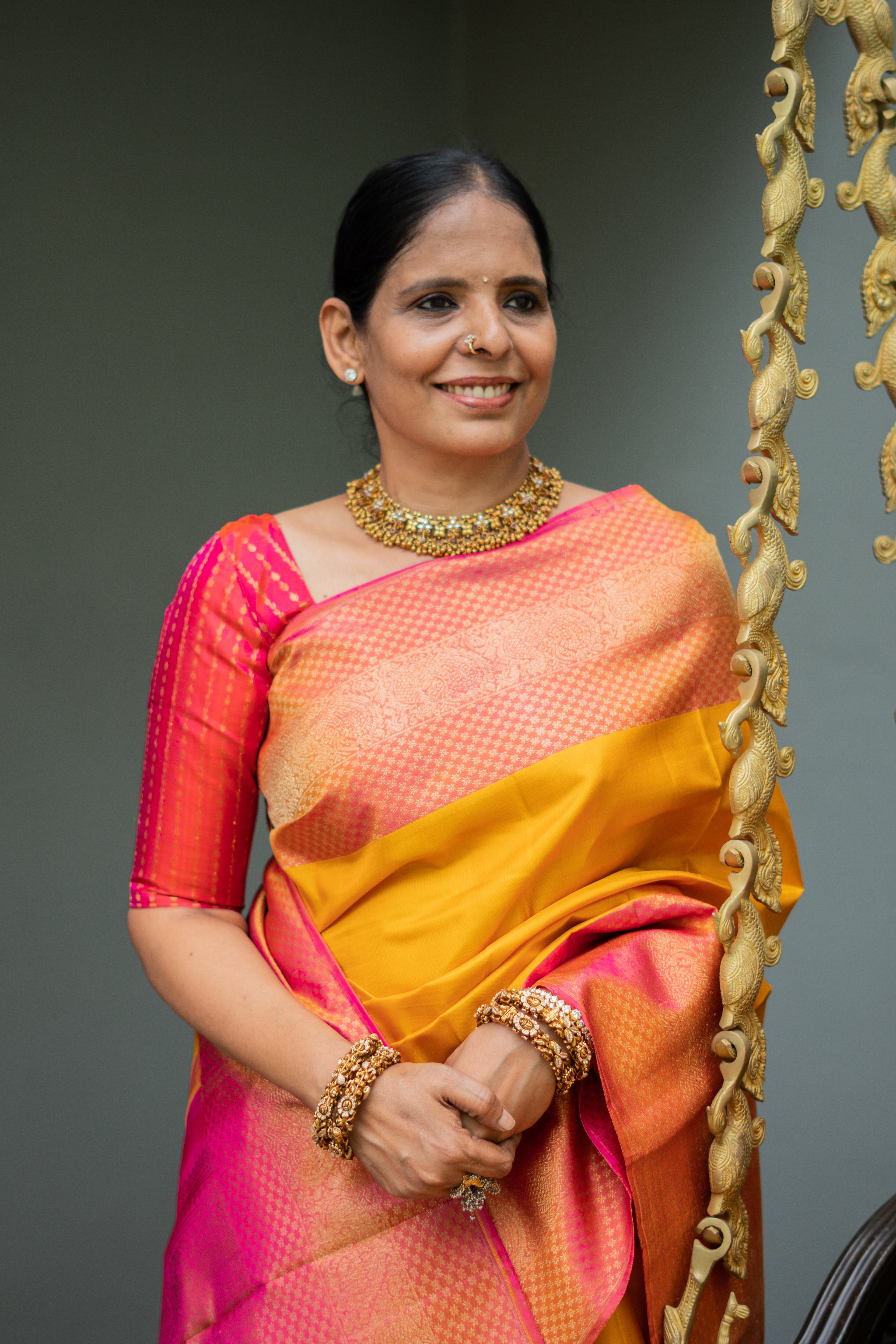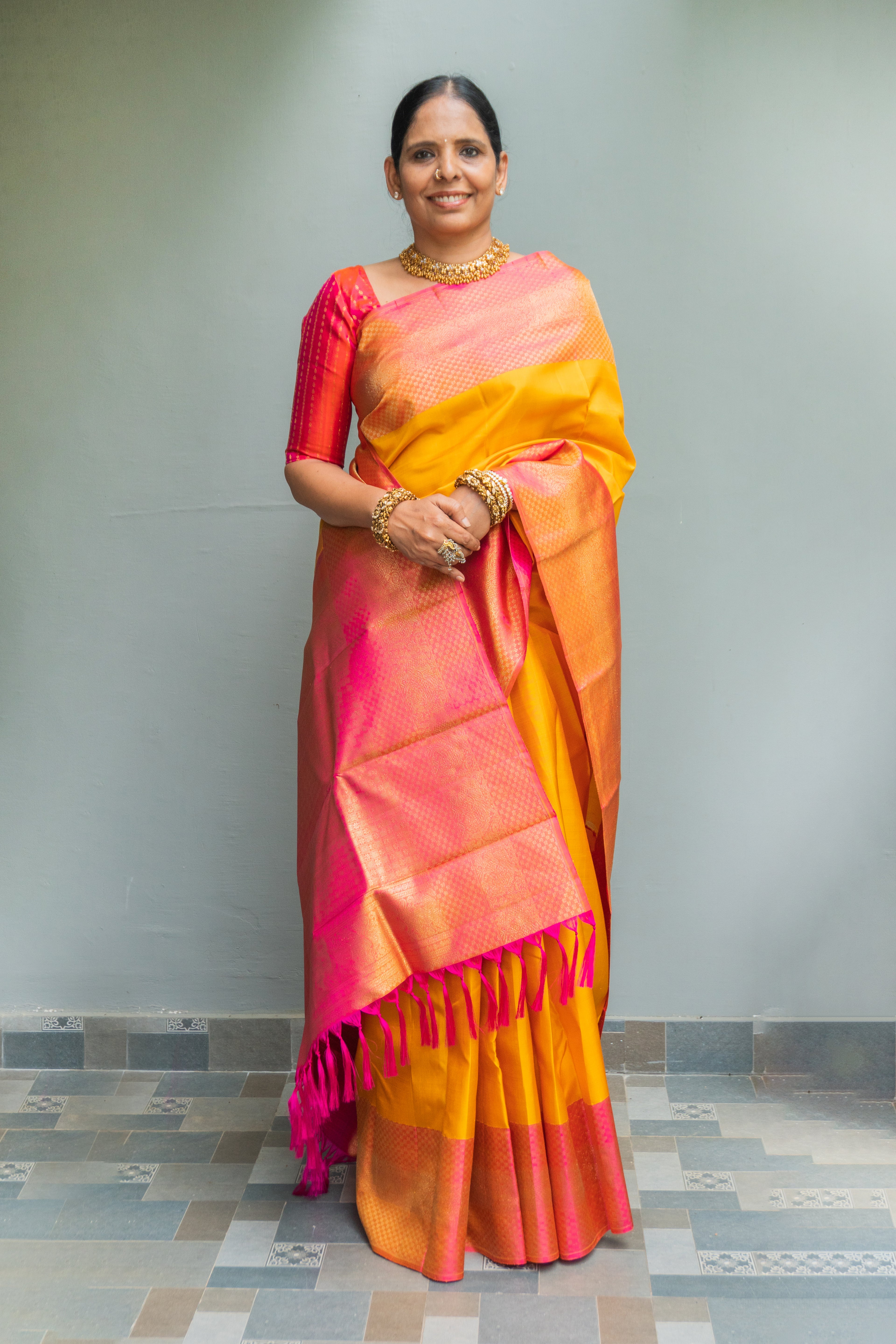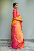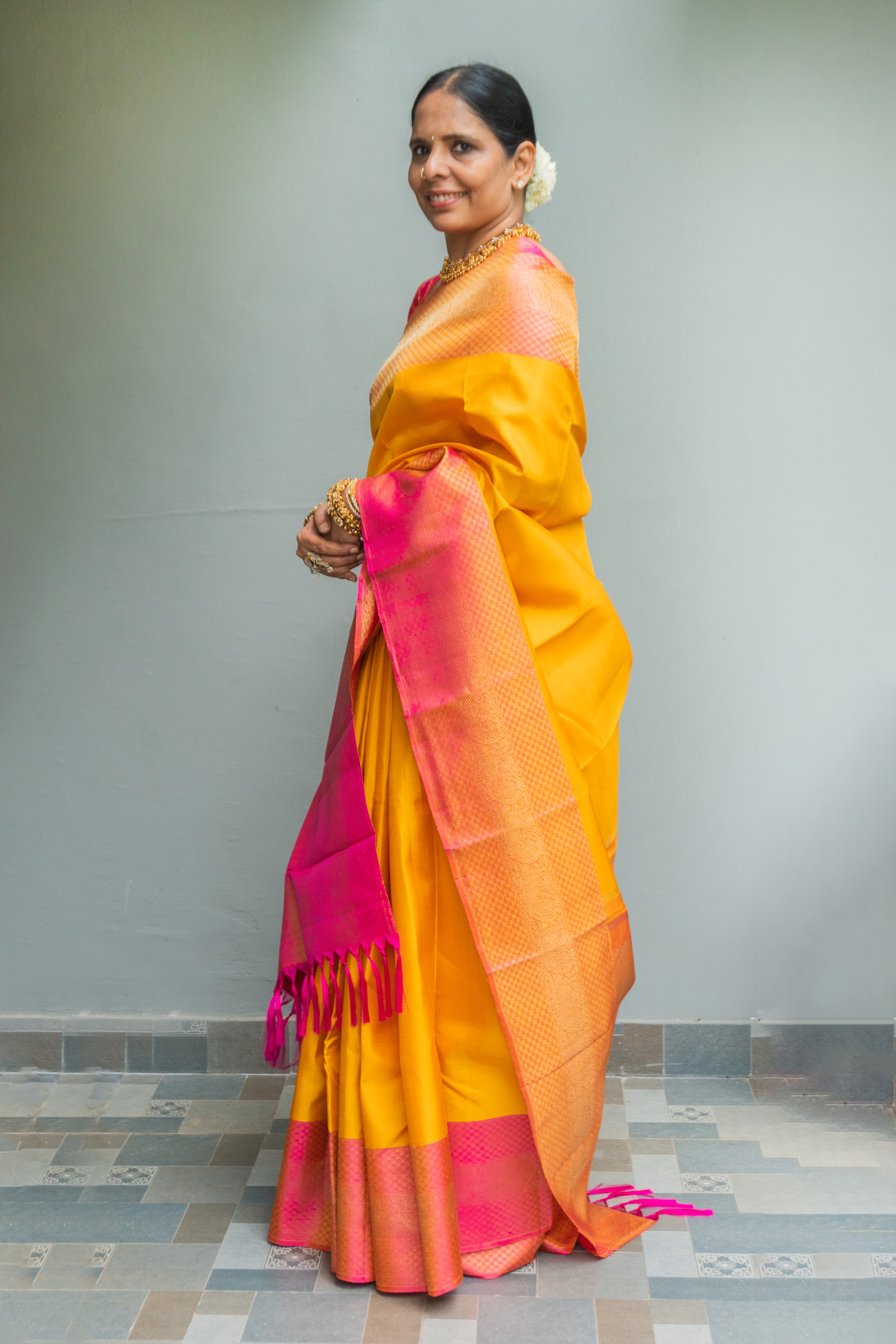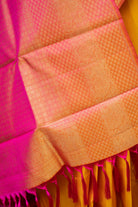 Yellow kanjivaram silk saree is handwoven using the finest of threads. The saree has a peach border which is a combiantion of geometric and peacock figurines. The pallu mirrors the same pattern as the border.