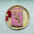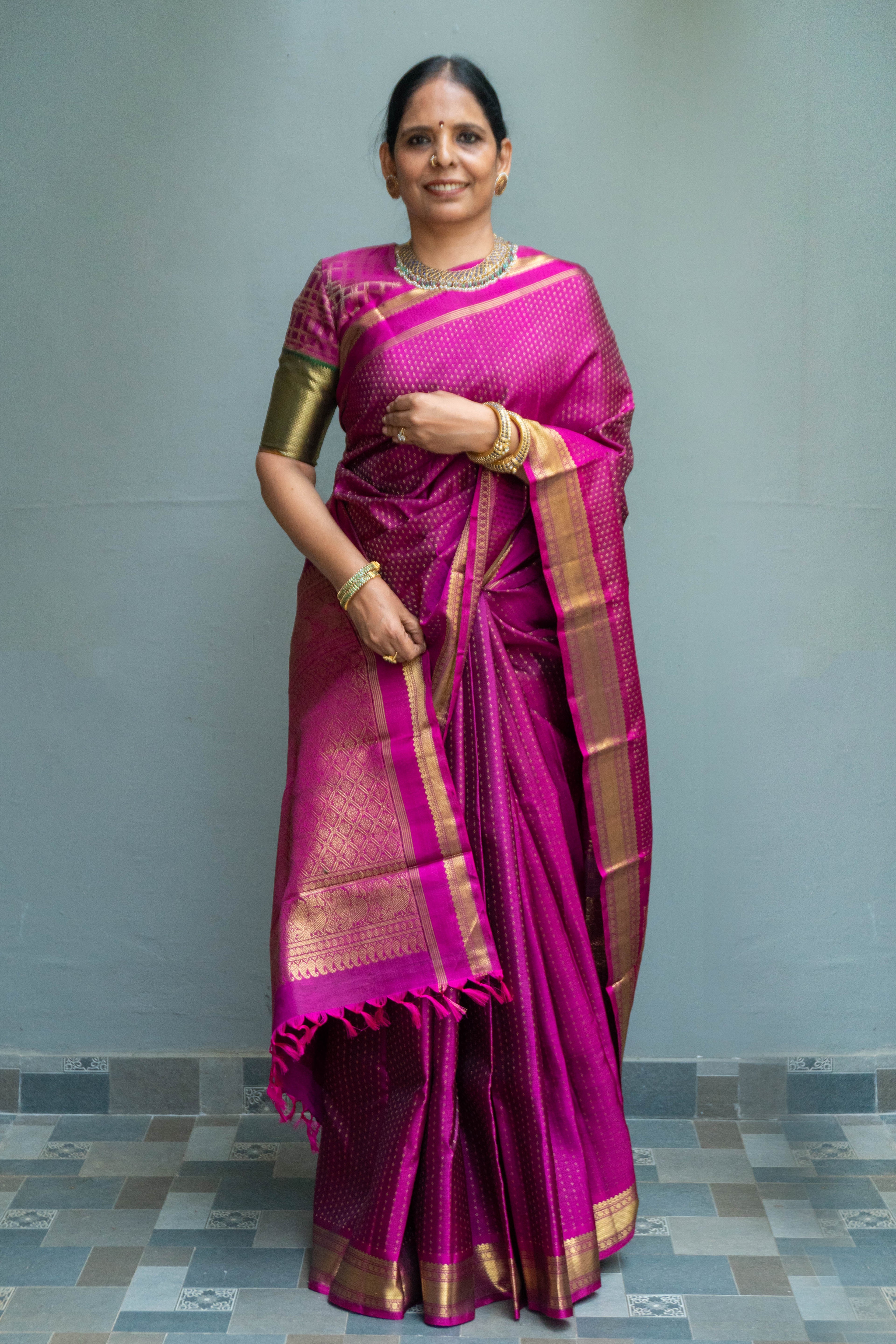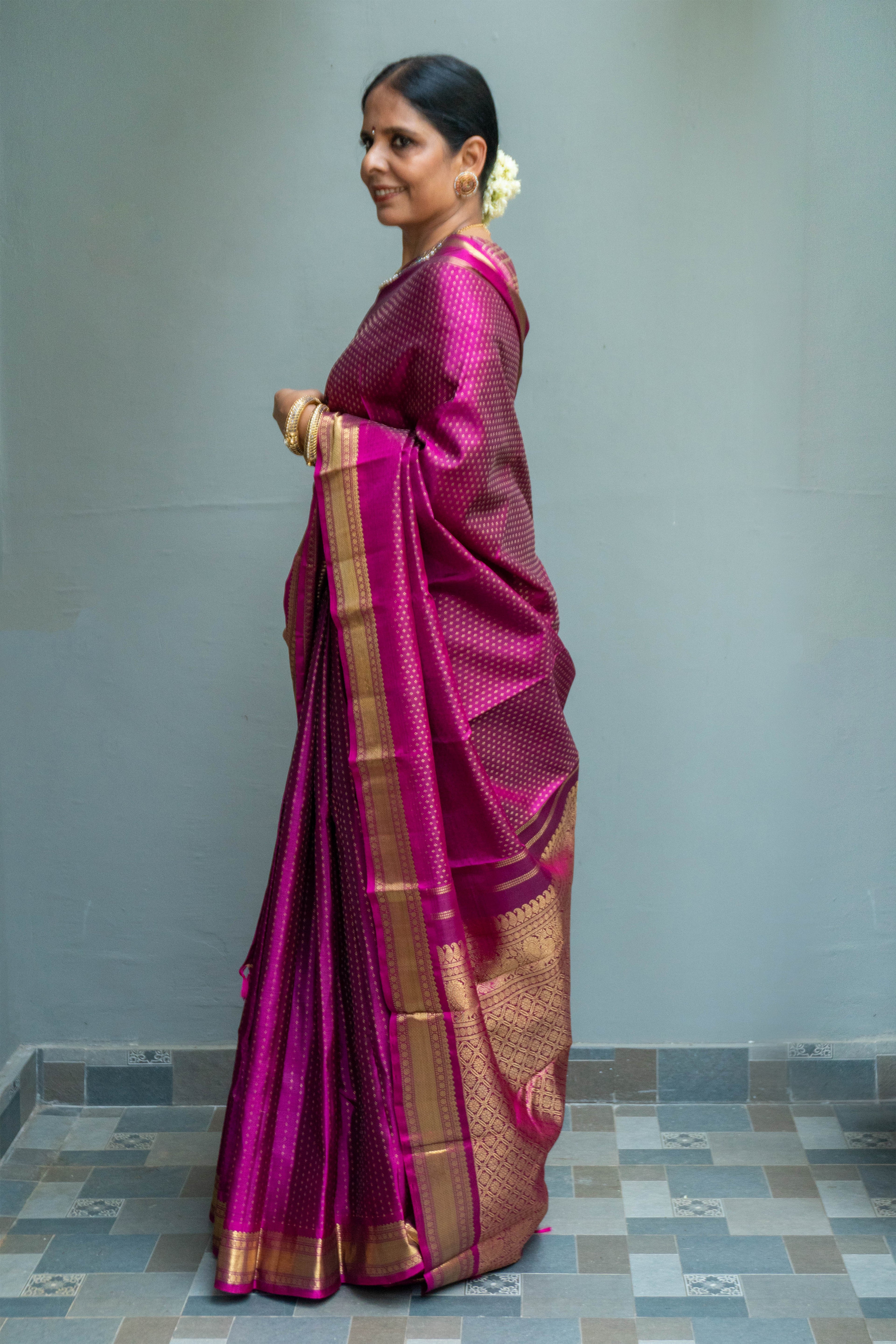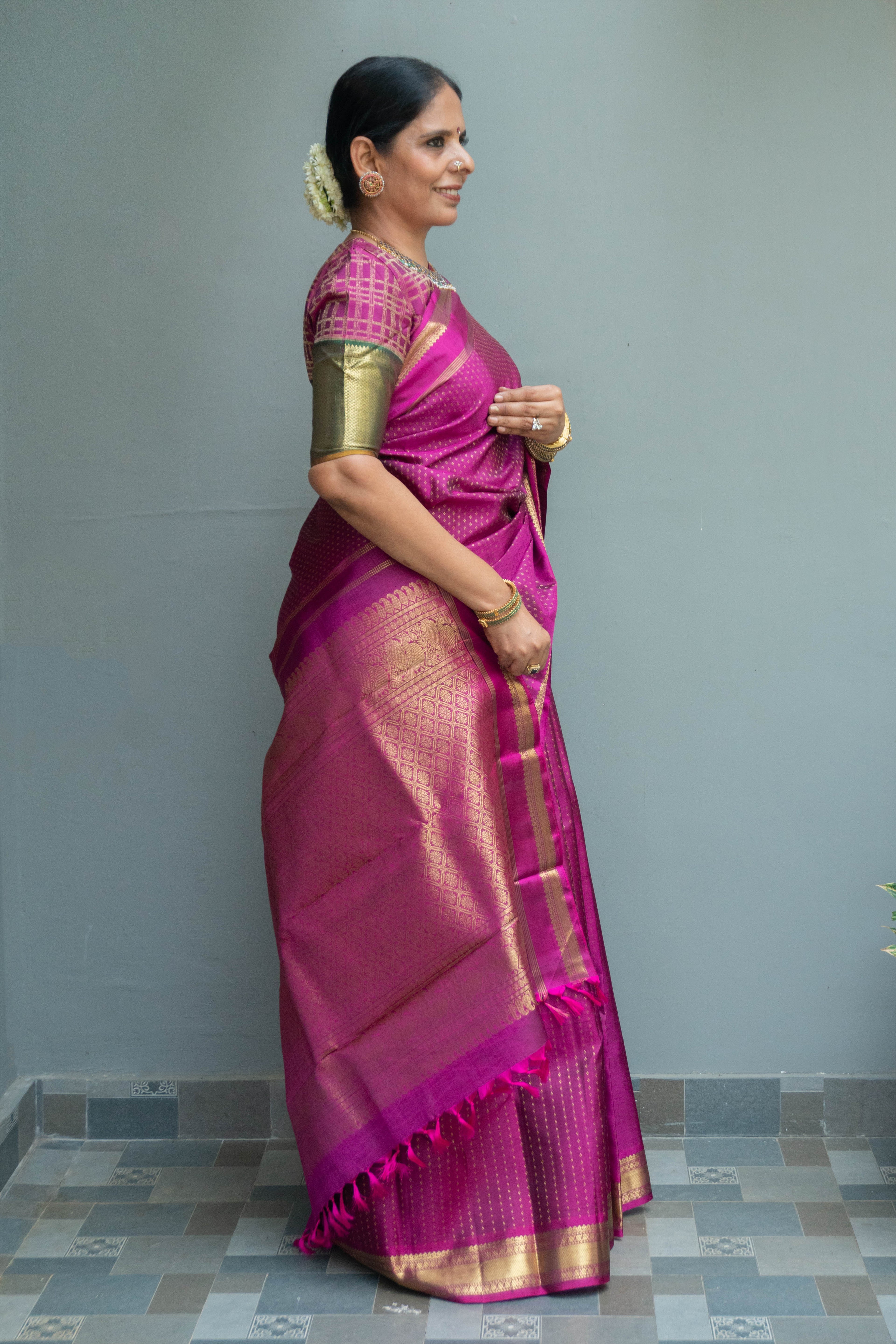Purple Kanjivaram silk saree with “Kuil-kann” motifs in the body. The border is unique, with one side zig-zag zari between Rudrakasham border and on the other side, there is a combination of stripes, zig zag and floral kodi design. The pallu features peacocks, mango and floral motifs enclosed in diamond design. The blouse is plain with border.