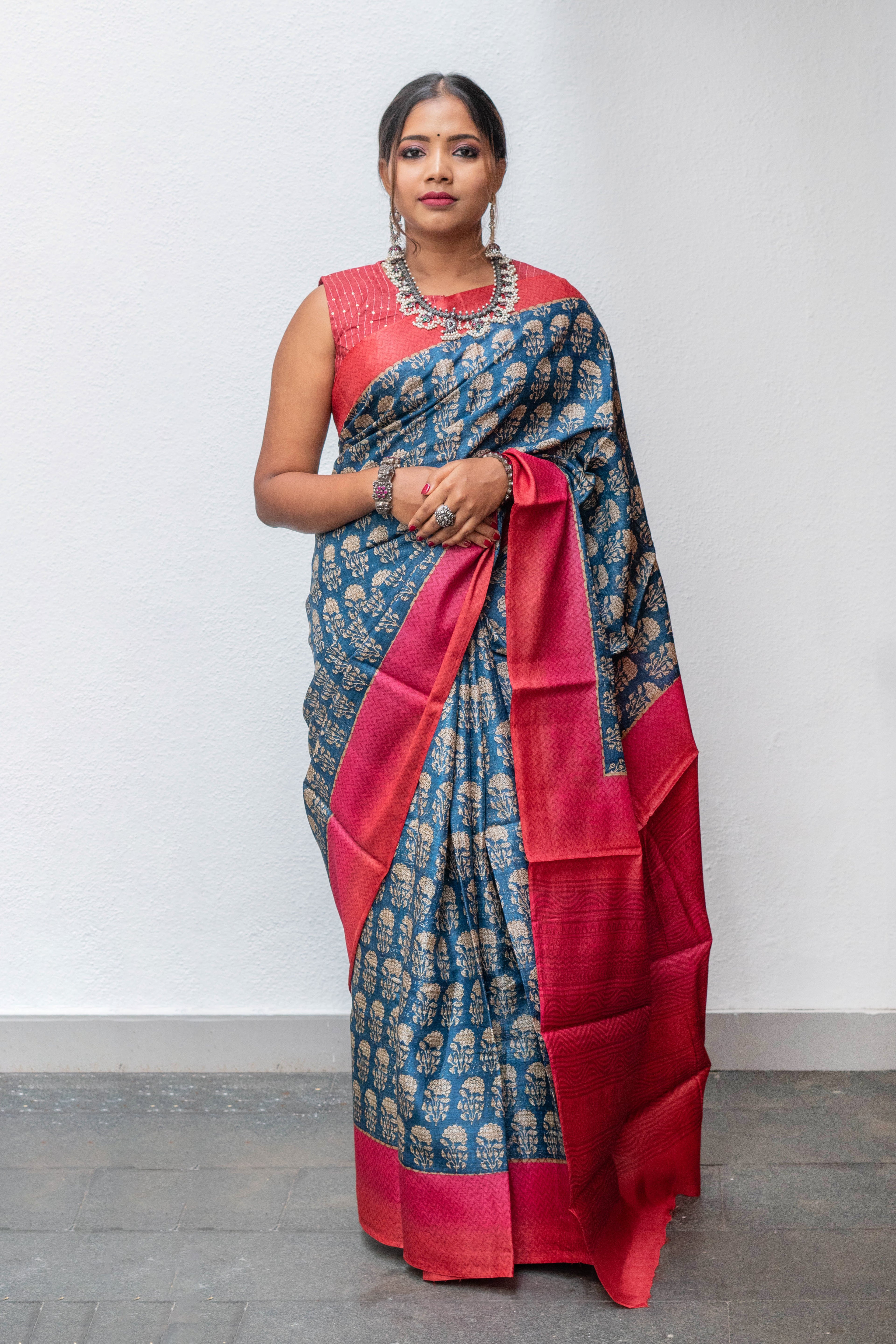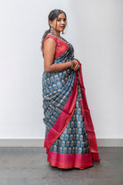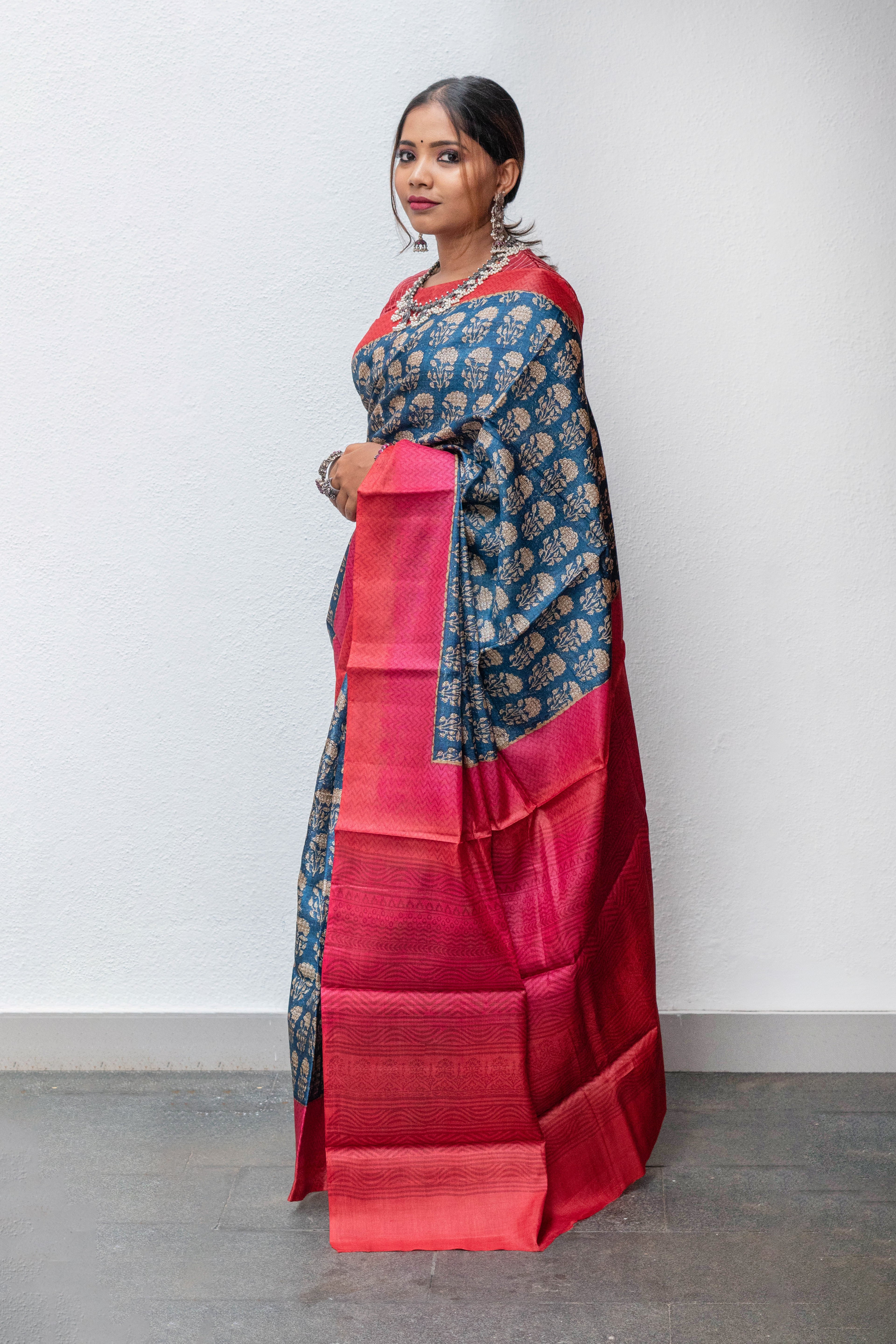 Dark Blue Tussar silk saree with linearly aligned floral motifs in the body, which is complemented by a shaded orange - pink border featuring zig-zag block print. The pallu mirrors the same shade as the border. The blouse is plain.
