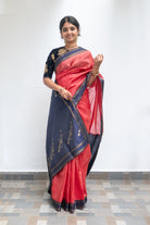 This striking red tussar silk saree is woven with shimmering gold zari checks that lend a festive glow. The natural texture of tussar silk enhances its understated elegance, while the gold detailing elevates it with richness and celebration-ready charm.