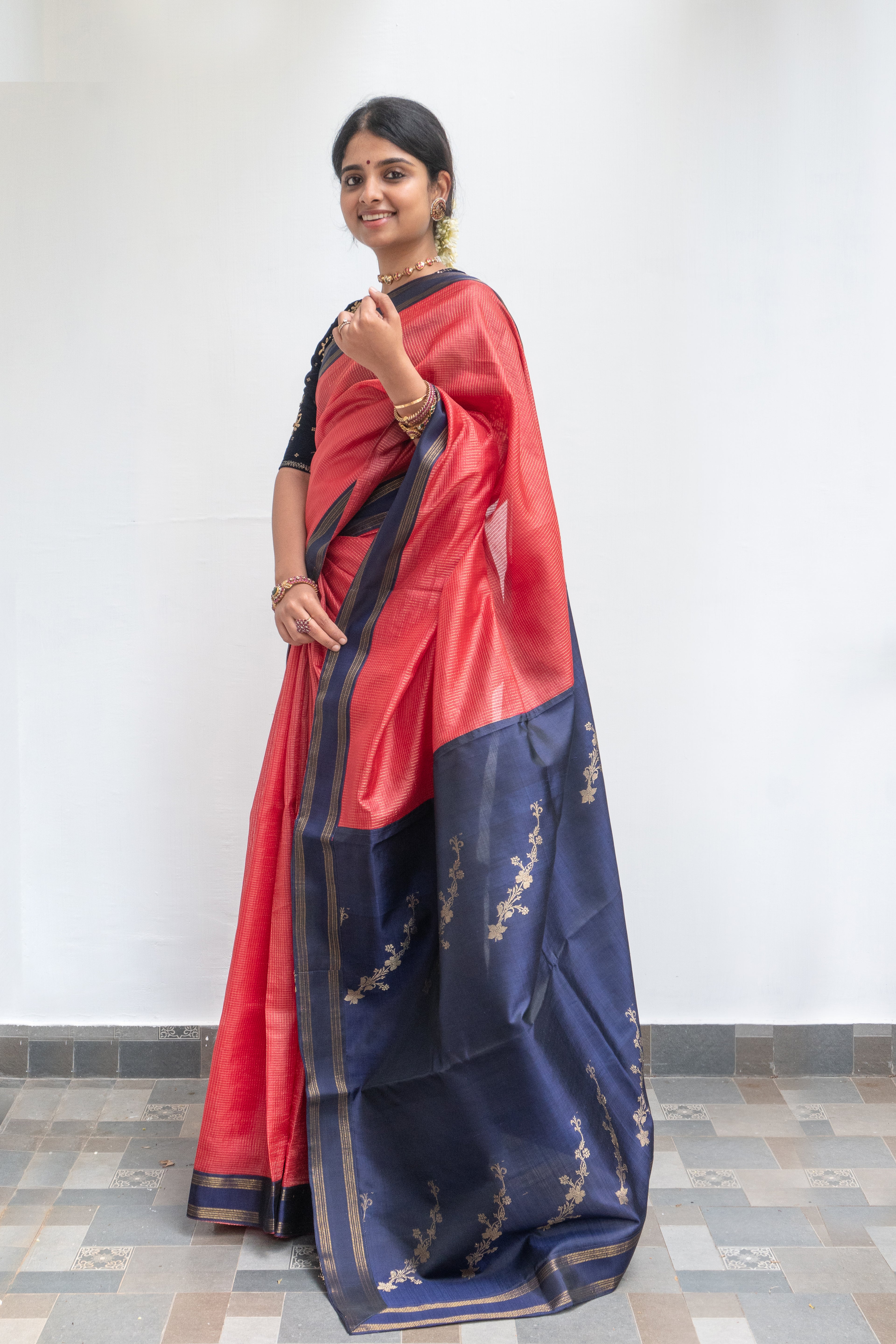 The blouse styled with each saree is from our exclusive in-house collection and may differ from the blouse piece provided with the saree.