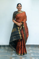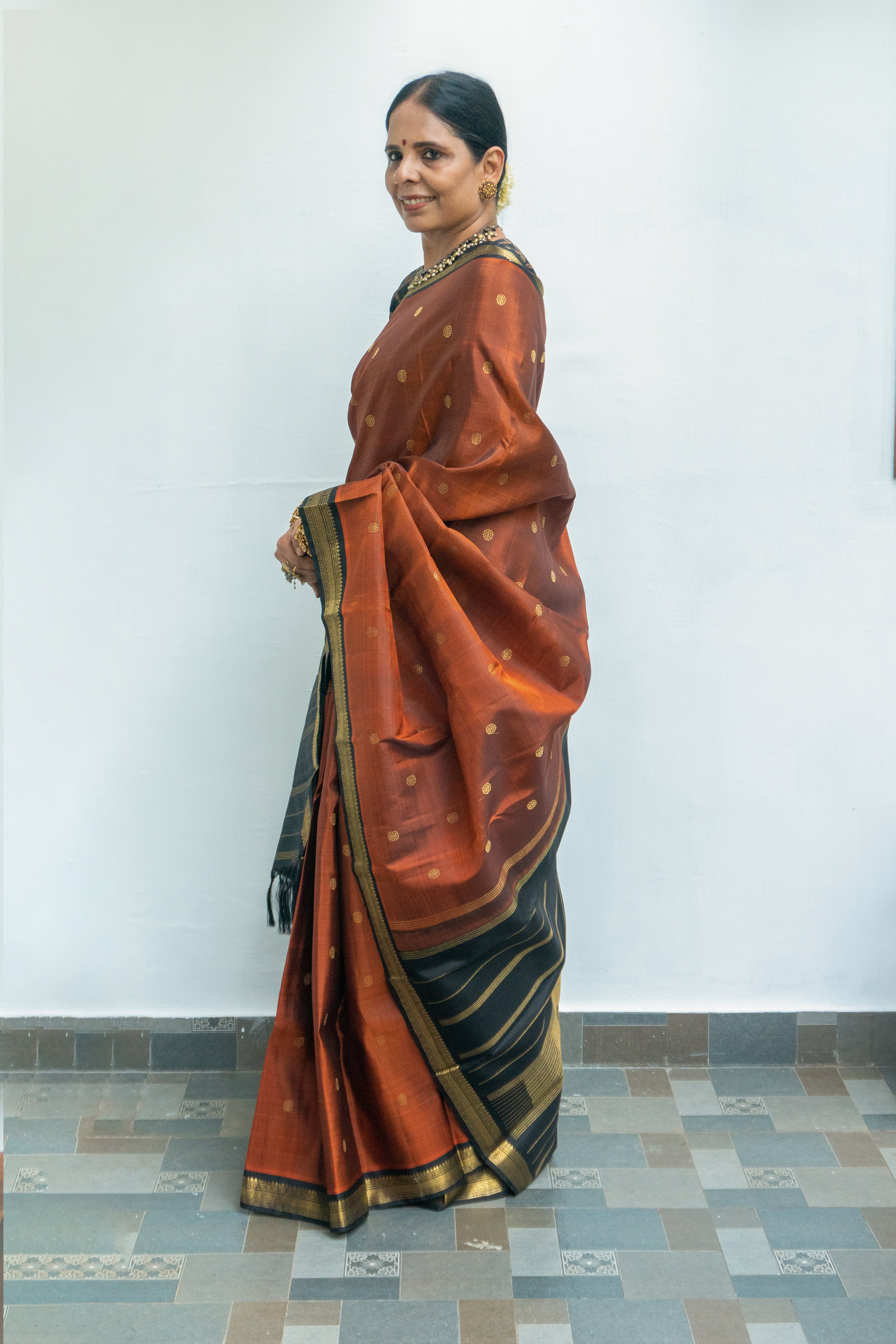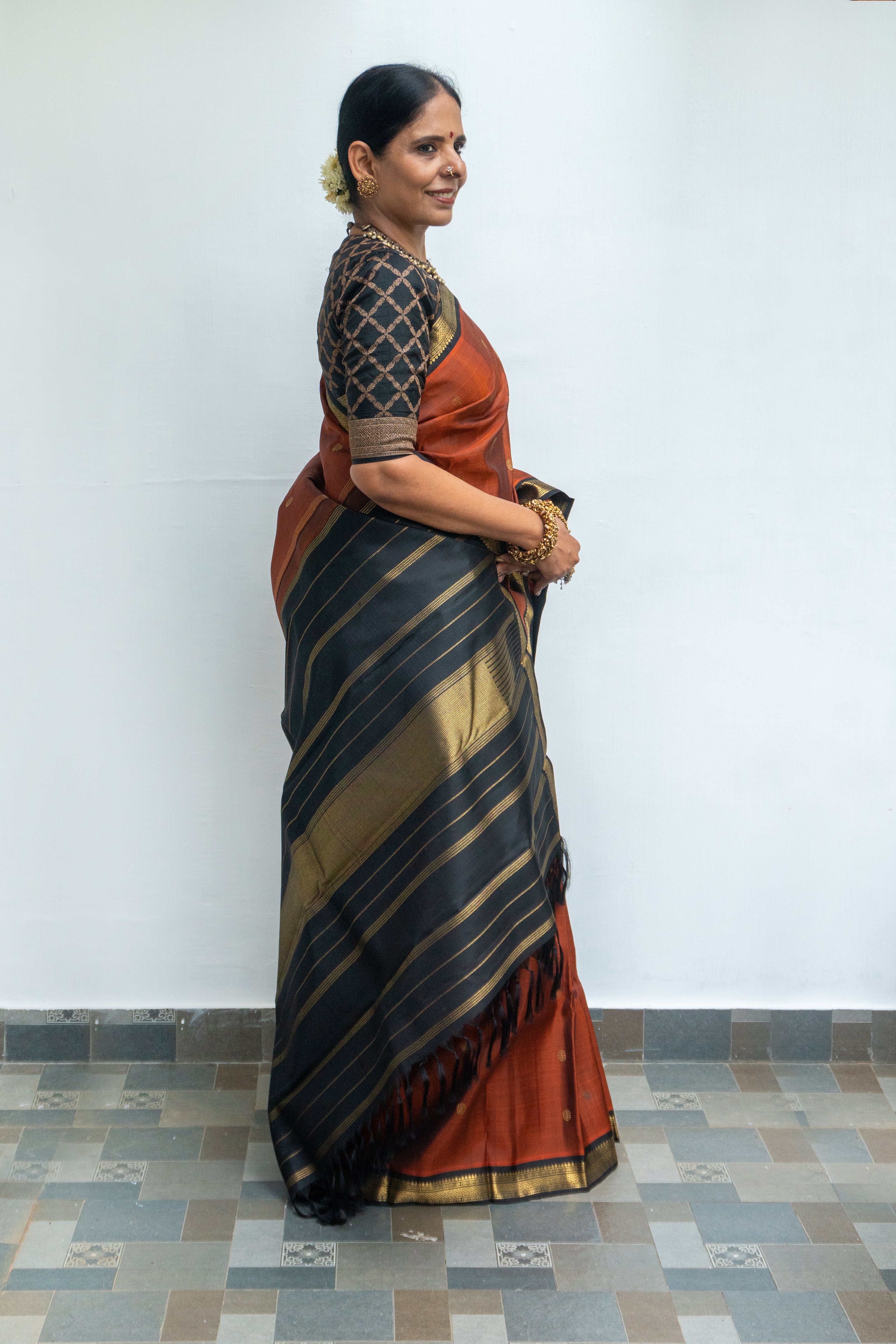 Rust Kanjivaram Silk saree in rust shot with black is handwoven with traditional rudhraksham motifs in pure gold zari in the body. The border is black with gold zari woven with patterns, chakram, geometric patterns and bands. The pallu follows a traditional seeprekku pattern.